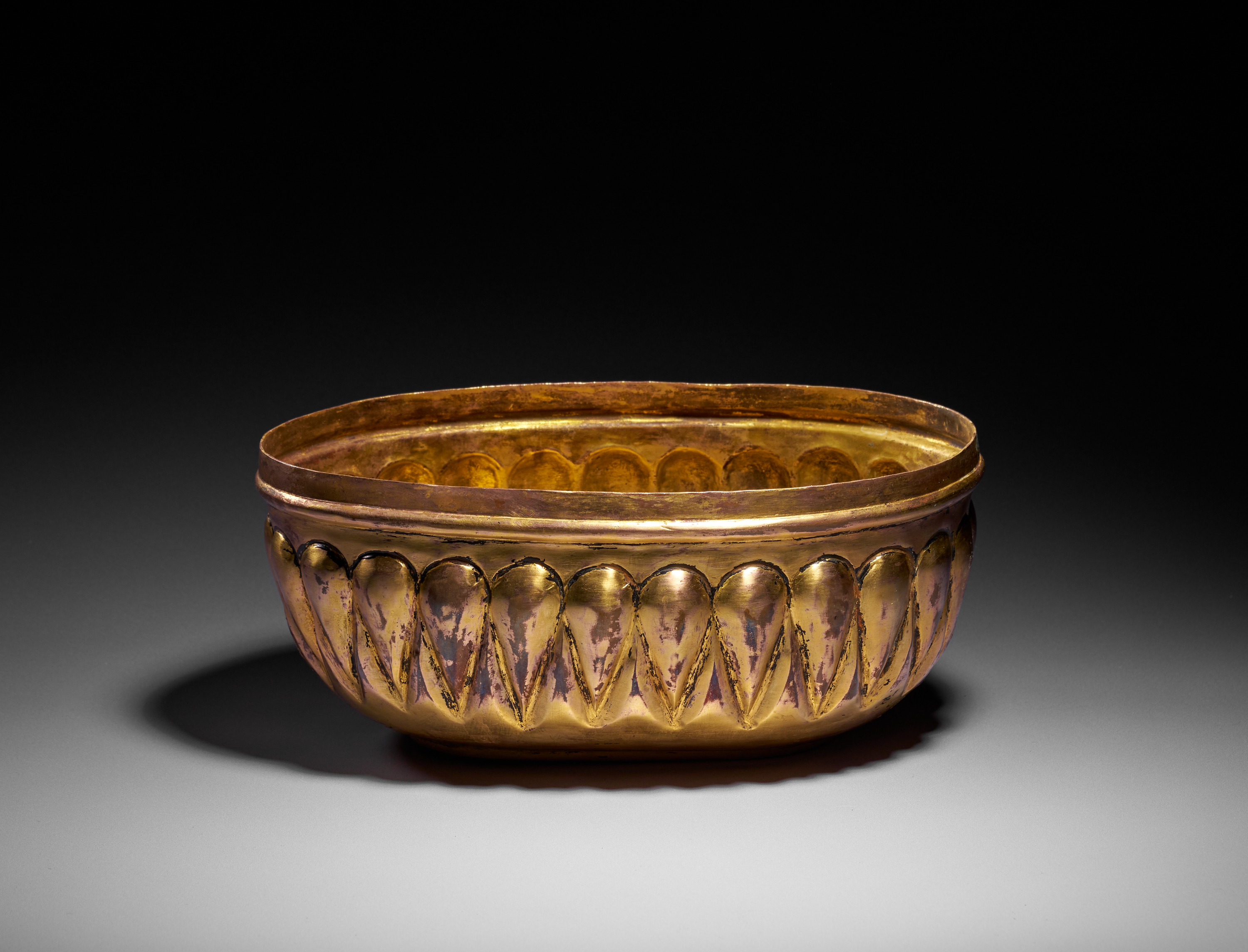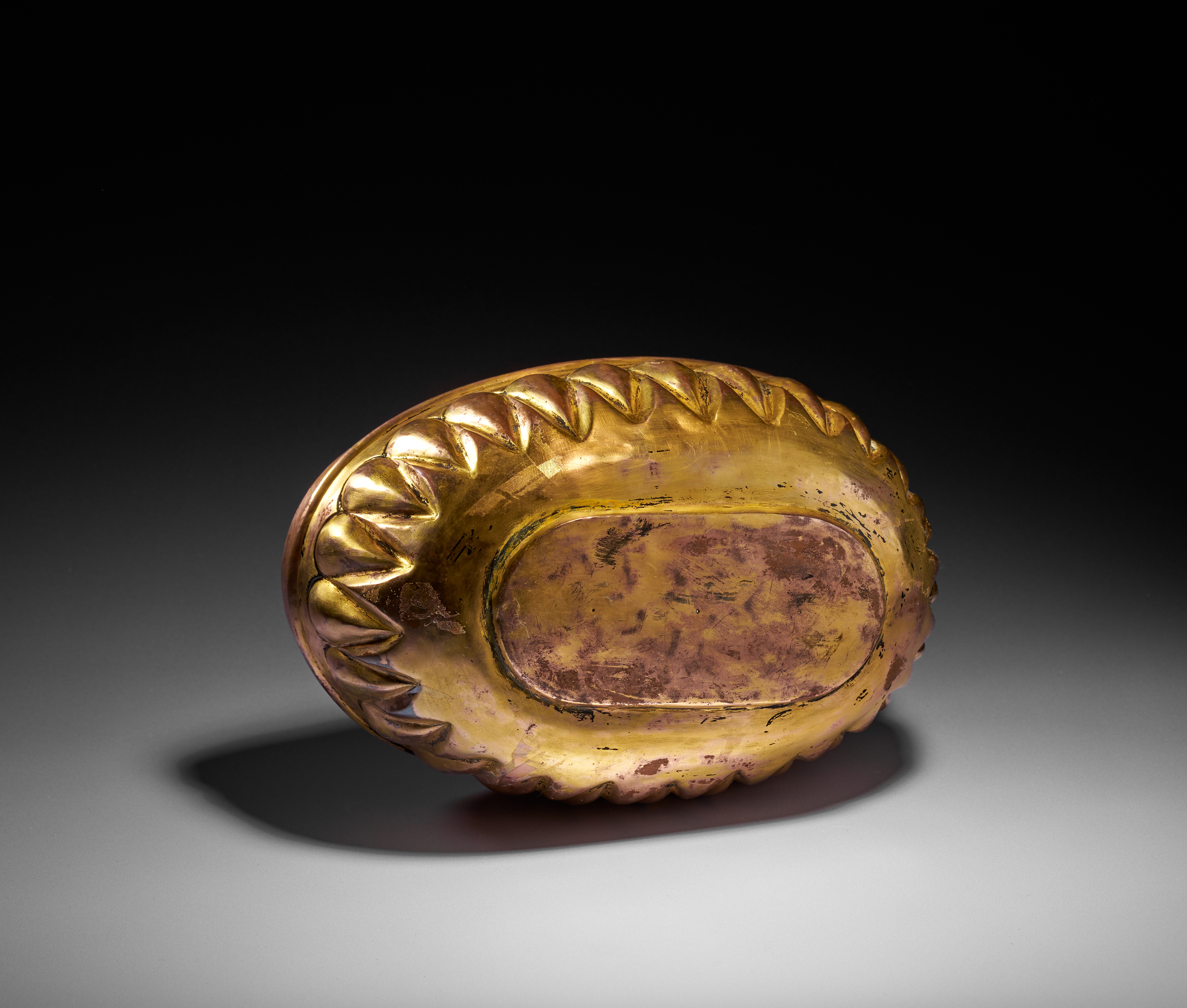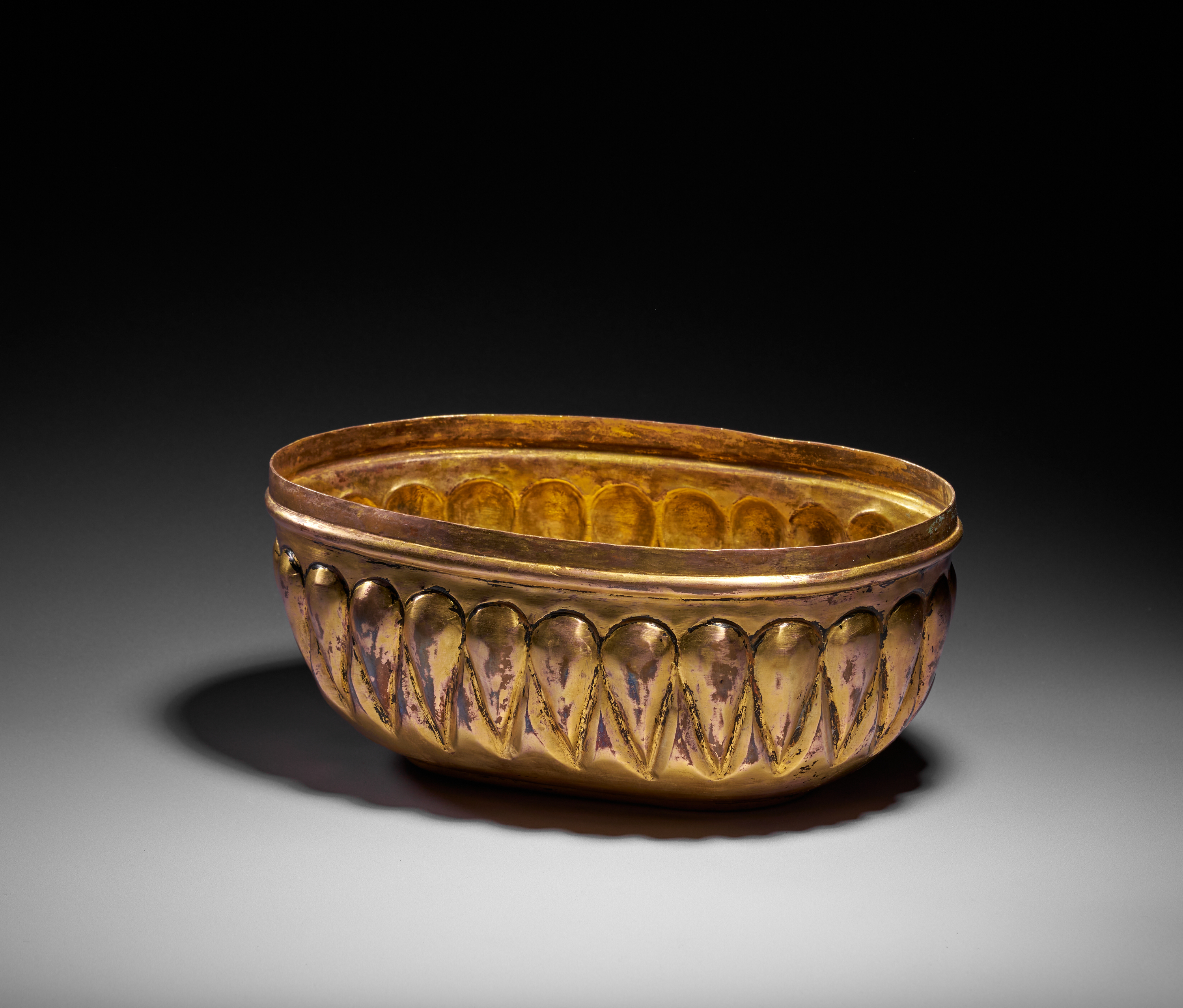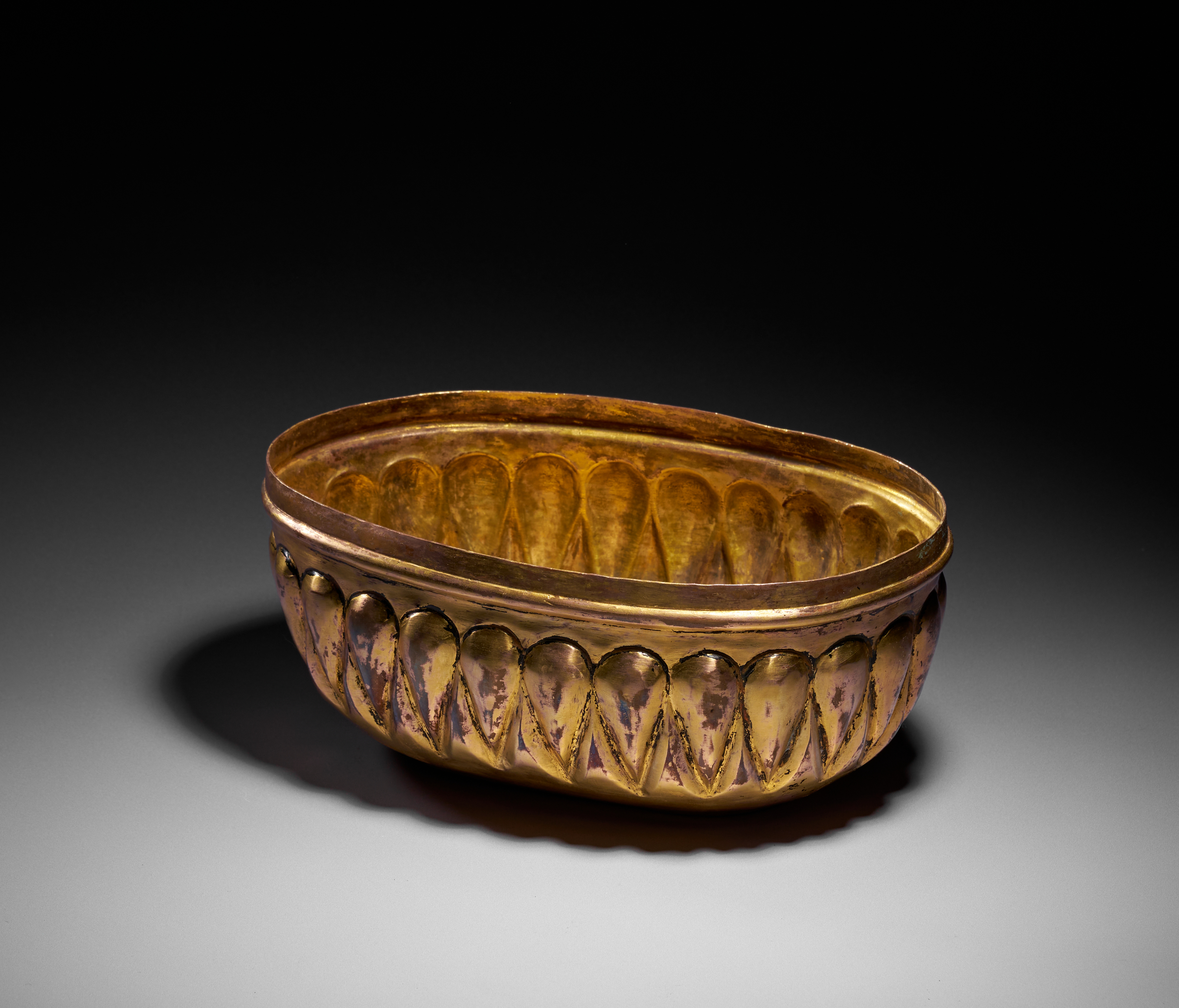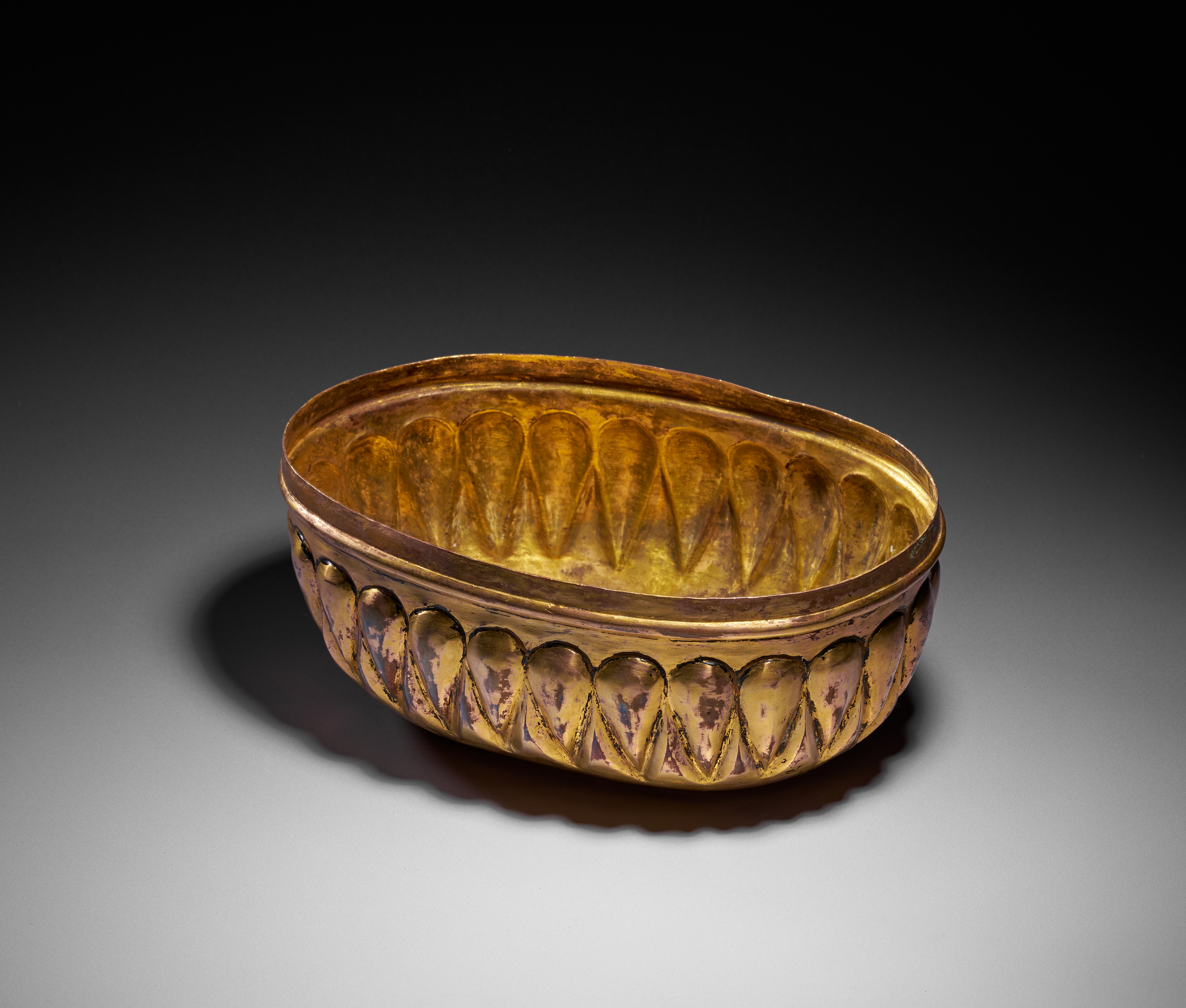 This elegant Ottoman hammam bowl is crafted in tombak, the distinctive gilt-copper alloy prized in the 18th century for its rich golden lustre and smooth, warm surface. Of elongated oval form, the bowl is decorated with a continuous band of lobed, almond-shaped motifs in high relief encircling both the exterior and interior, creating a visually rhythmic, almost sculptural effect.
