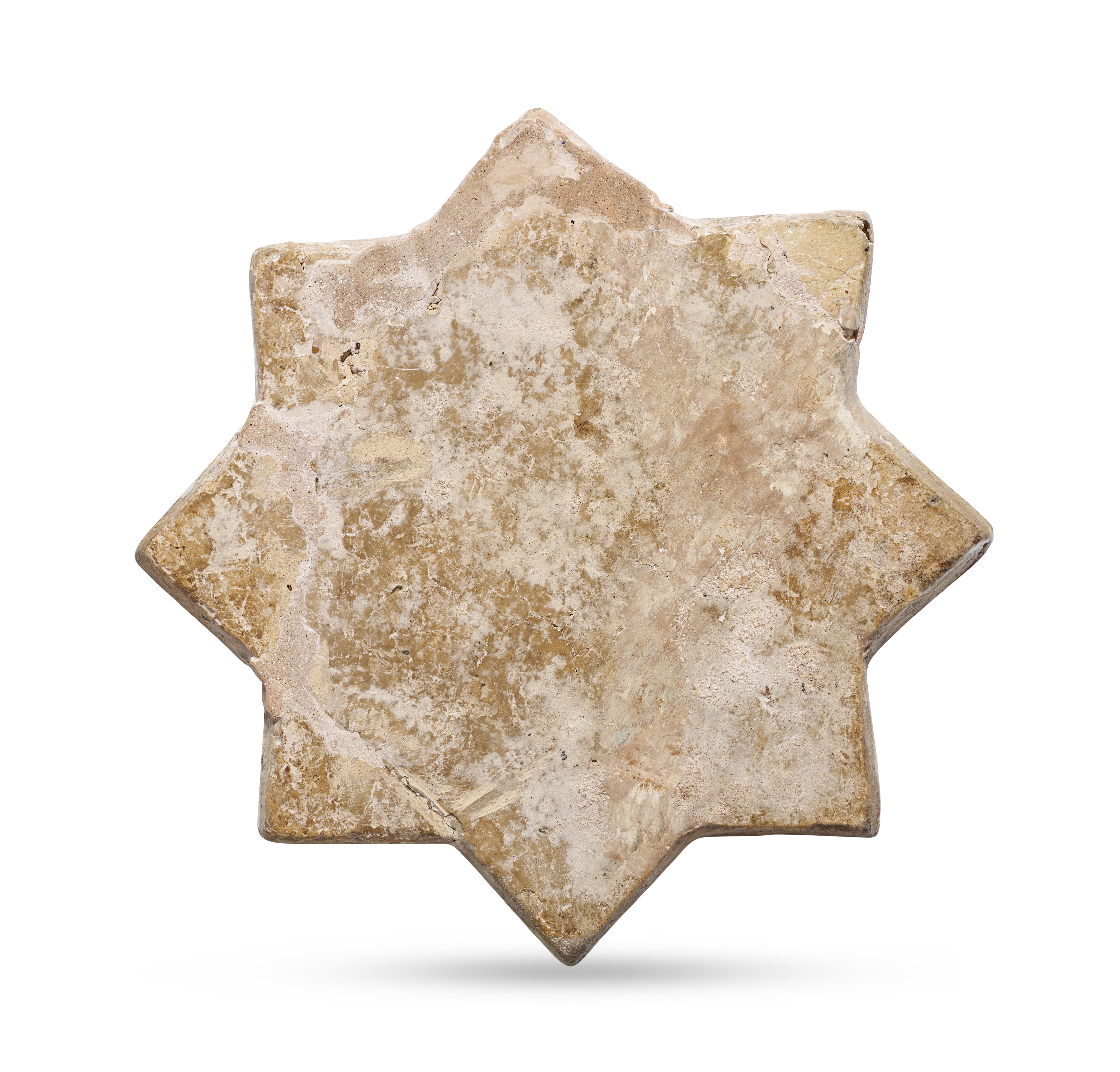 A fine and rare Persian lustre pottery star-shaped tile, dating to the Ilkhanid period (13th–14th century). The eight-pointed tile is decorated in a delicate golden-brown lustre on an opaque white ground, depicting two elegantly robed figures seated amidst floral motifs, possibly within a courtly or poetic scene. The composition is enclosed by a cobalt-blue border inscribed with stylized pseudo-calligraphy, typical of Kashan tilework of the period.