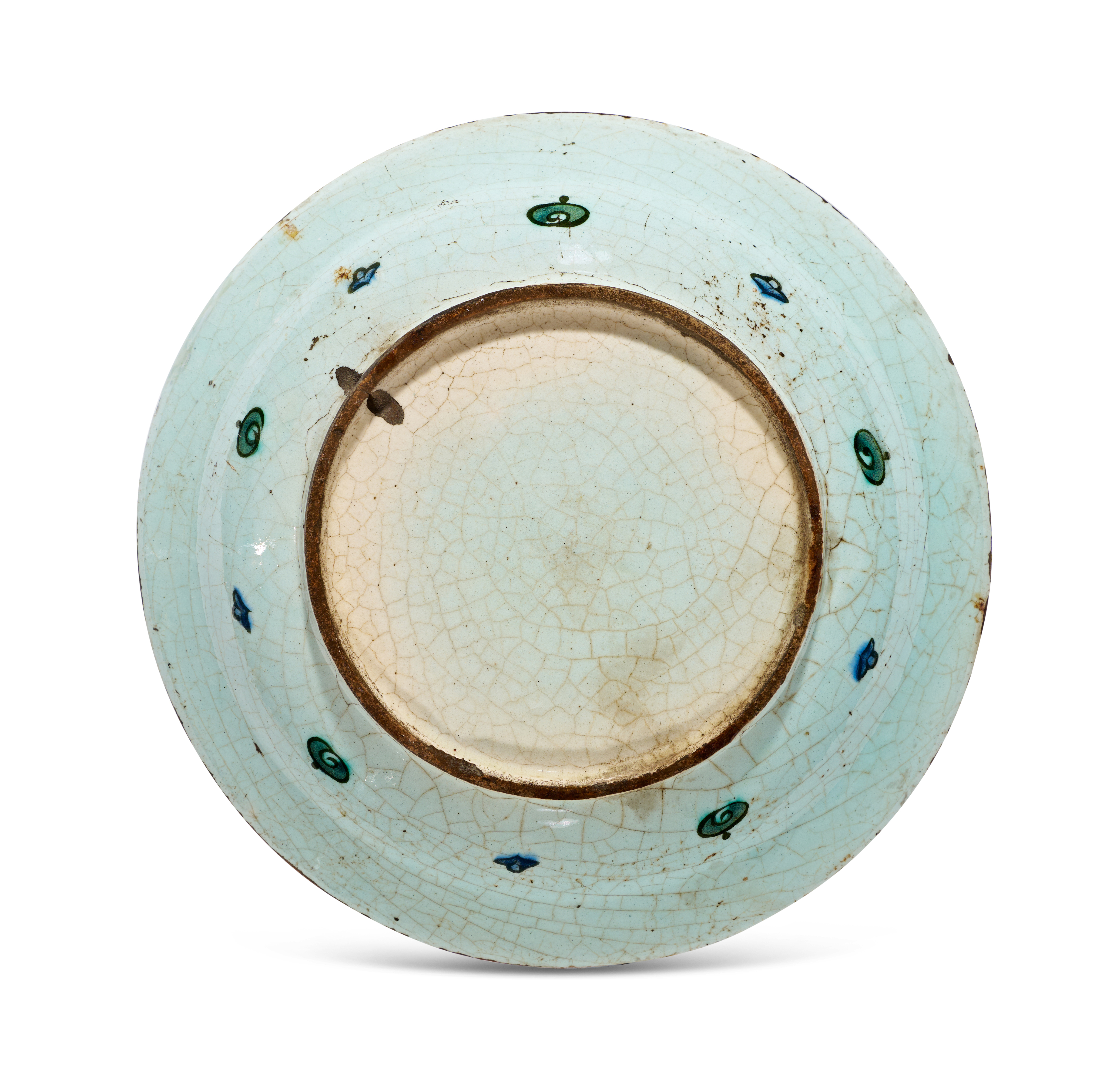A beautifully painted Iznik pottery dish from Ottoman Turkey, dating to the late 16th century. The shallow dish is decorated in a palette of cobalt blue, turquoise, green, and bole red under a clear glaze, centered with a lively composition of flowering stems bearing tulips, carnations, and rosettes—classic motifs of the Ottoman imperial style. The floral sprays rise from a leafy base, set against a milky white ground, enclosed by a border of rhythmic spirals in olive-green.