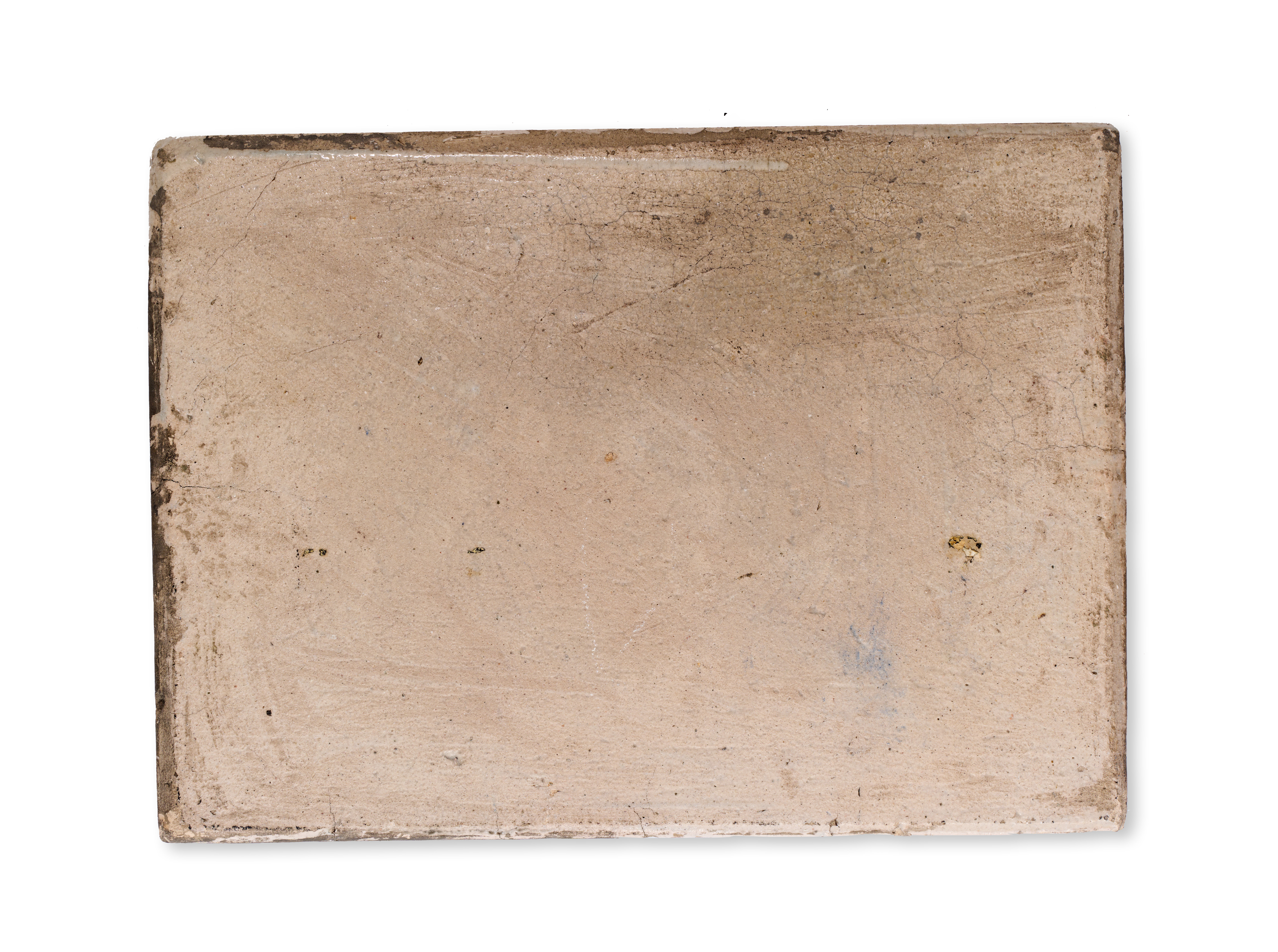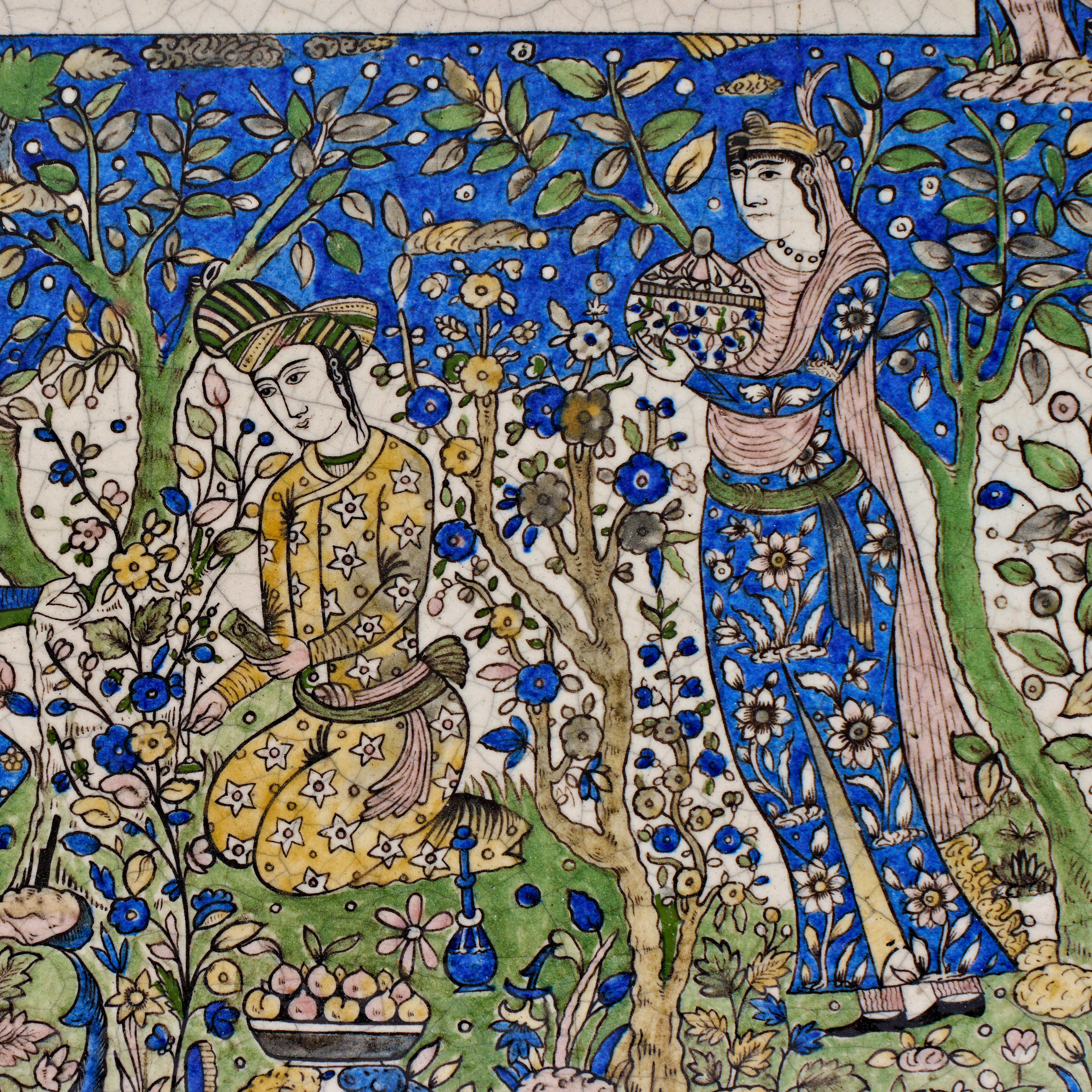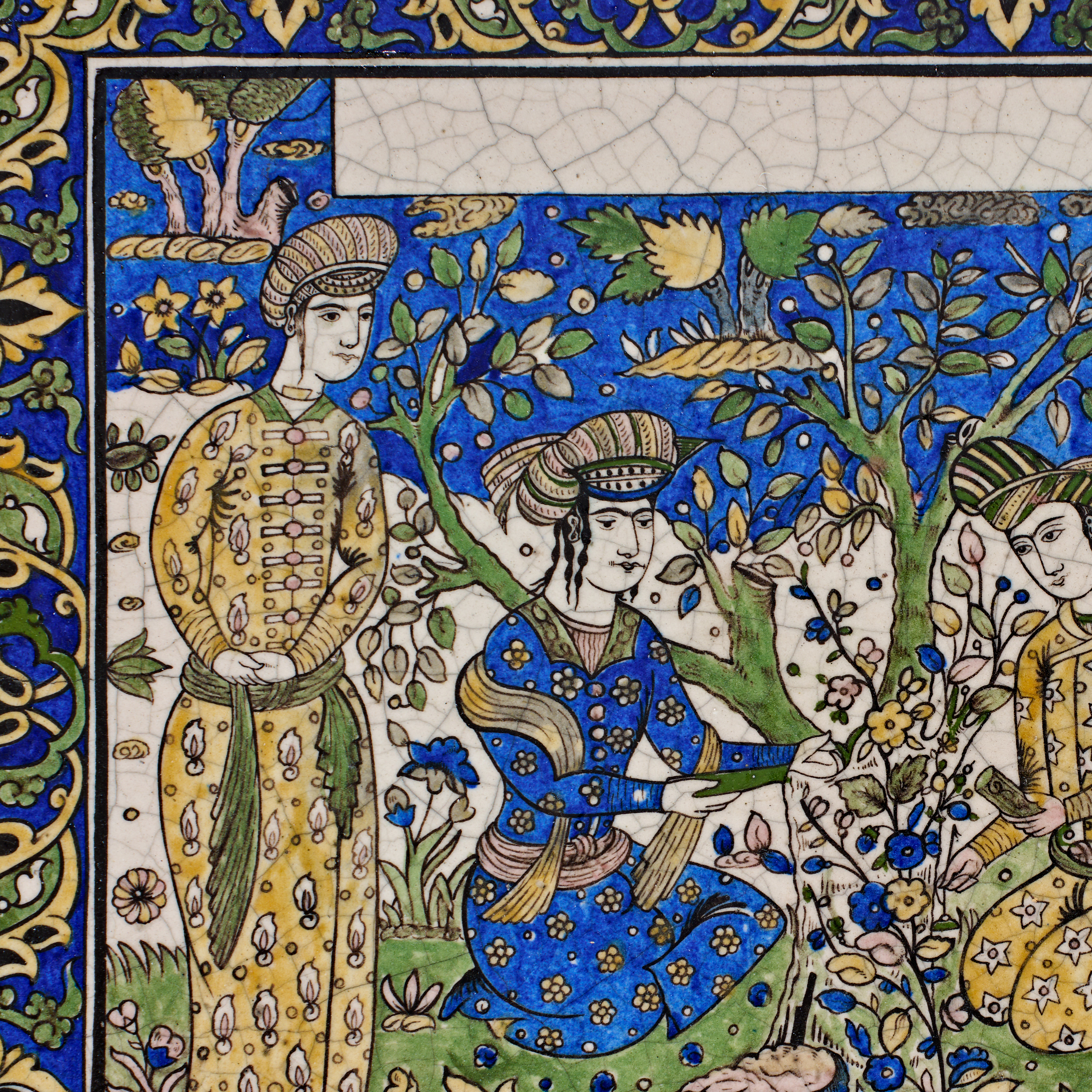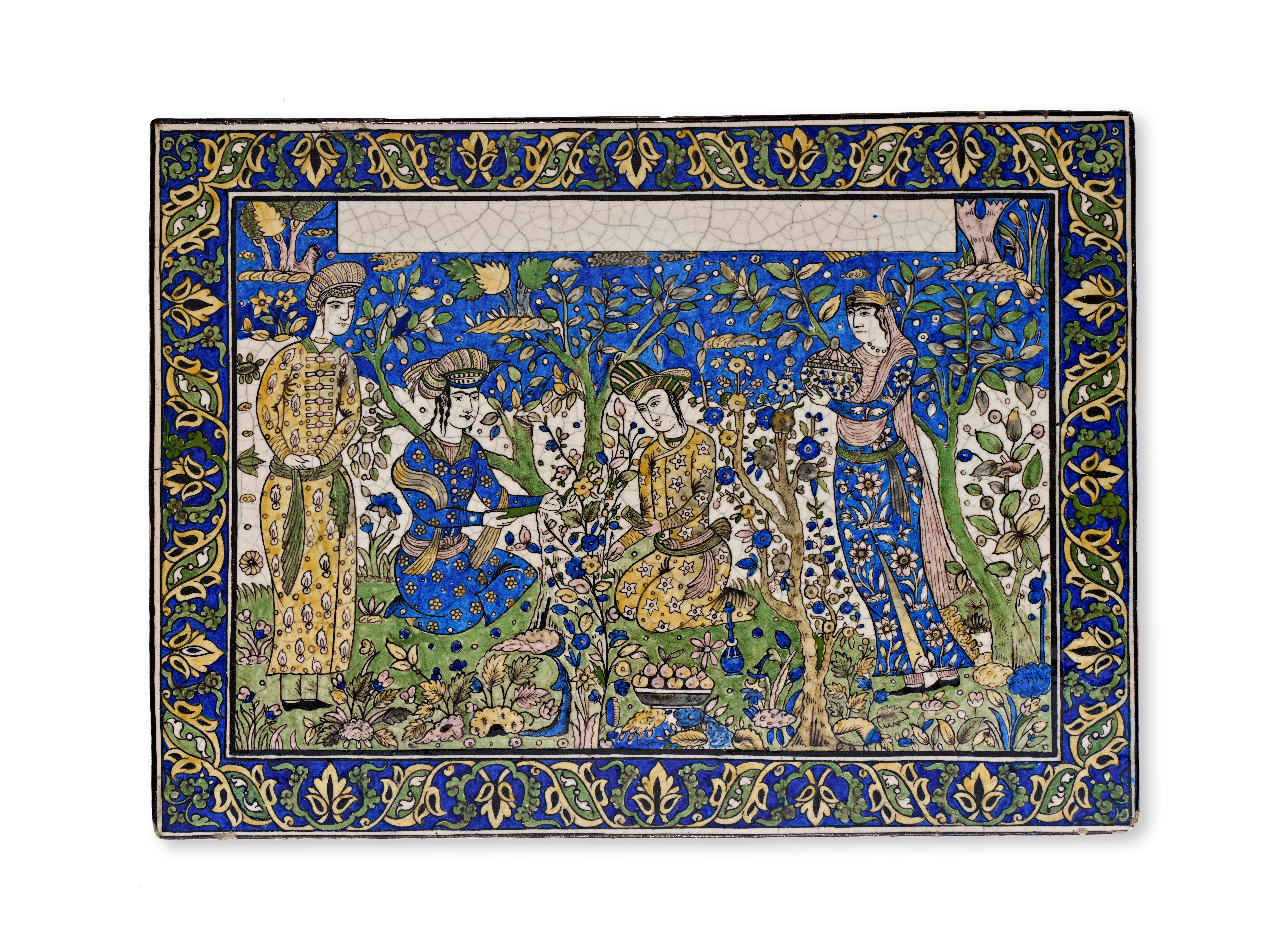 A Qajar polychrome pottery tile, Persia, 19th century. This rectangular glazed earthenware tile features a central figurative scene set within a garden. A group of four figures in traditional Persian attire, including patterned robes and turbans, are depicted amidst blossoming fruit trees and floral sprays, with a bowl of fruit resting on the ground. The scene is rendered in a palette of cobalt blue, yellow, turquoise, and green, accented by an un-inscribed white rectangular cartouche at the top. A decorative border of scrolling vines and palmettes in yellow and green against a blue ground frames the central composition. The reverse reveals the buff earthenware body.