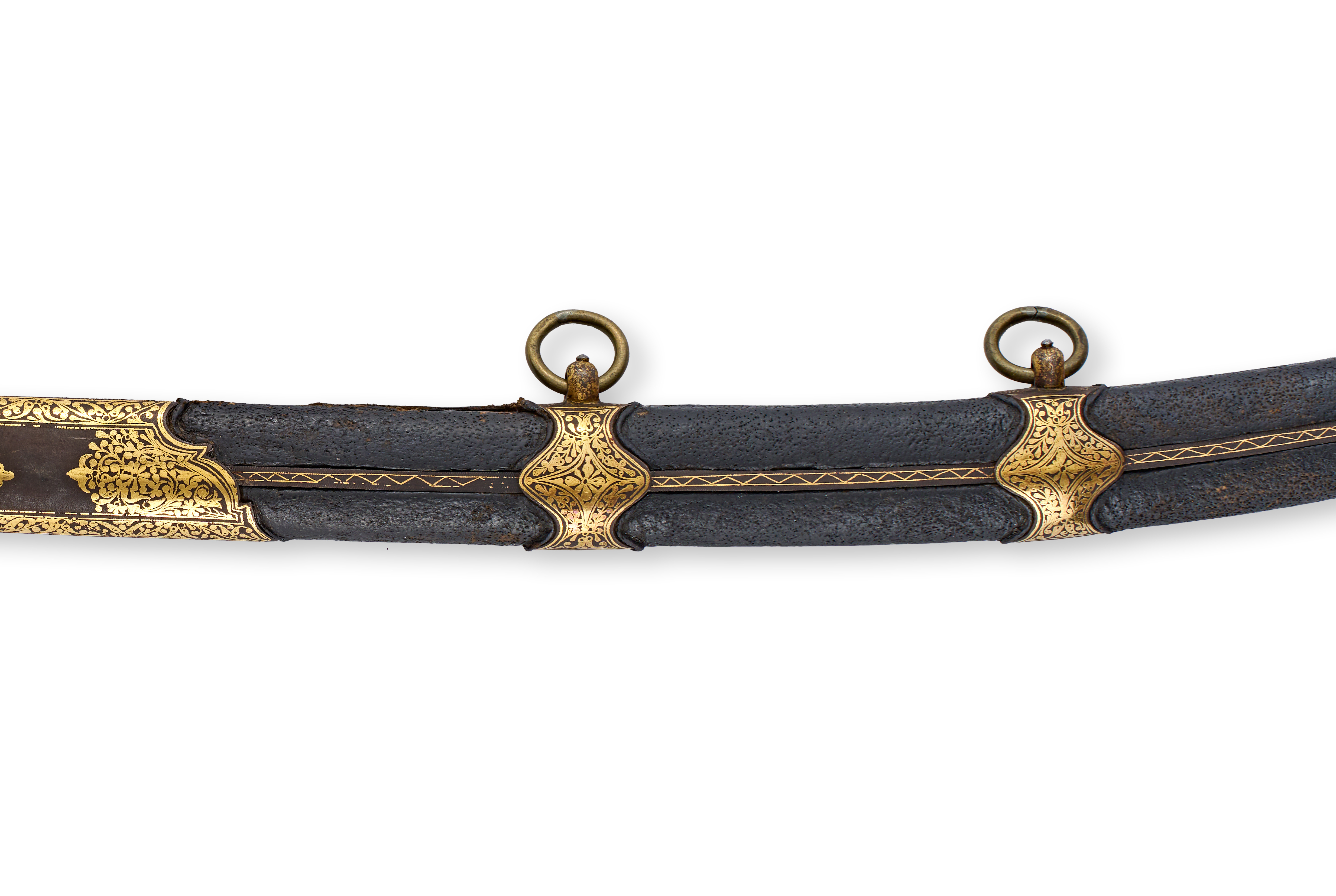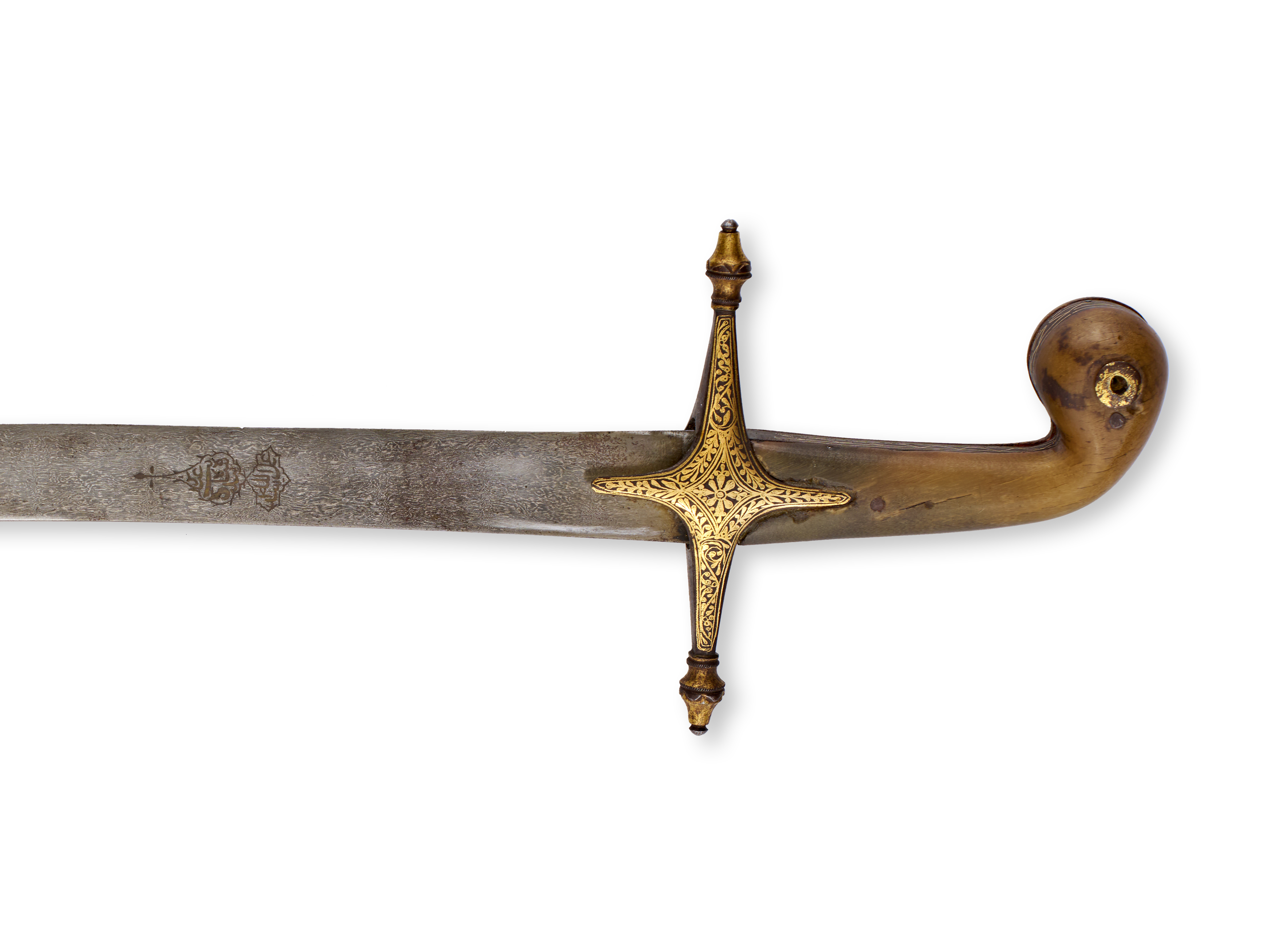This Persian Safavid shamshir features a deeply curved, single-edged blade of watered wootz steel. The blade is signed with a gold-inlaid cartouche containing Arabic calligraphy near the forte, attributed to the maker Asad Allah. The hilt consists of a pistol-grip pommel made of horn or bone and a steel crossguard. The crossguard is decorated with gold-inlaid koftgari floral and scrollwork designs. The matching wood-frame scabbard is covered in dark, pebbled leather and features gold-inlaid steel fittings. These fittings include two locket mounts with suspension rings and a matching chape, all displaying consistent floral ornamentation.