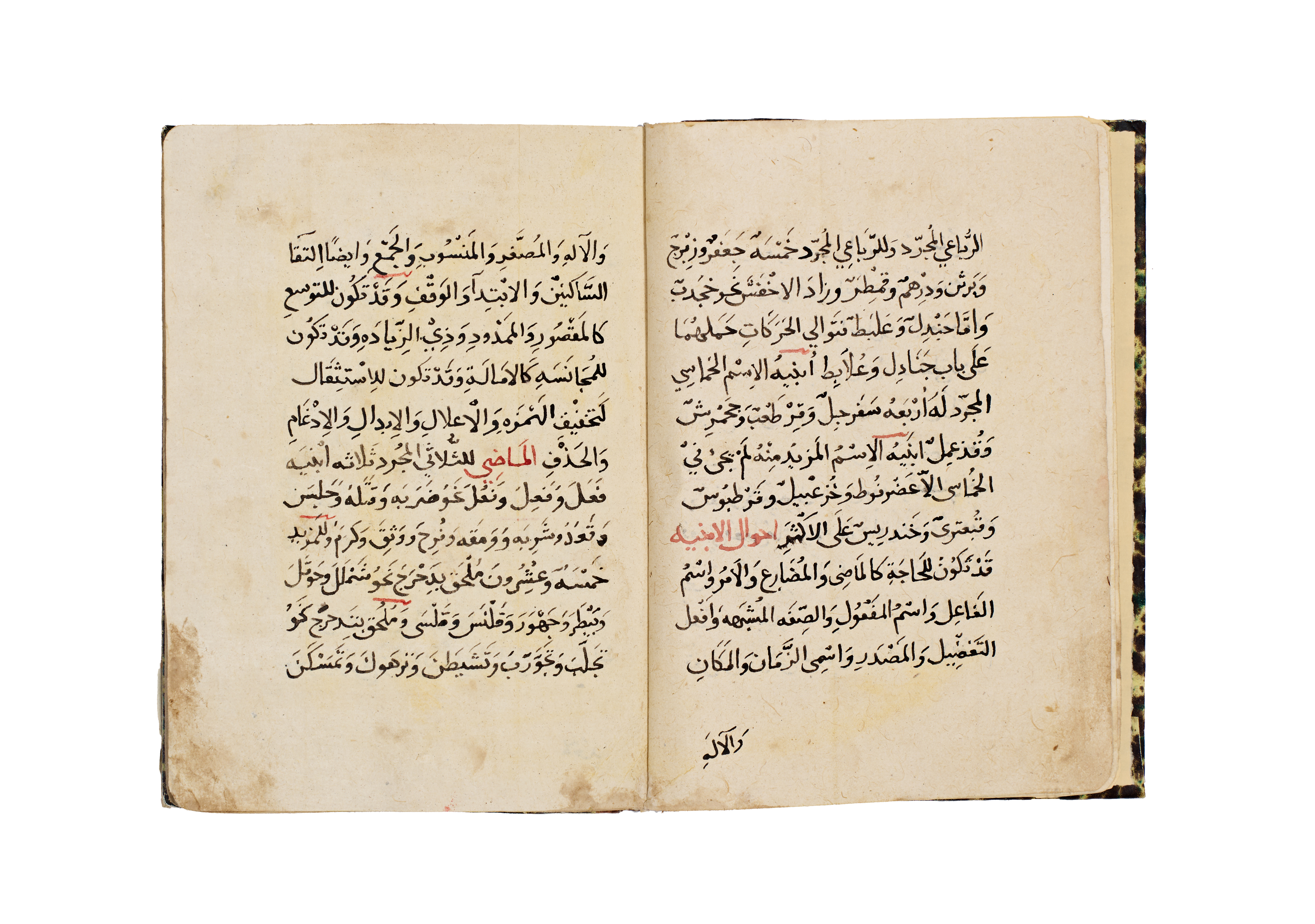 Arabic manuscript is titled Kitab al-Shafiyah fi ‘Ilm al-Lughah wa al-Sarf and authored by Ibn al-Hajib. The volume is bound in marbled paper boards with a leather spine. The interior features hand-written naskh calligraphy in black ink with red ink used for headings and key terms on aged paper. A colophon indicates that the work was transcribed by Muhammad bin Muhammad bin Radwan al-Ba’li al-Mawsili in the month of Safar, 646 AH, which corresponds to approximately 1248 CE.