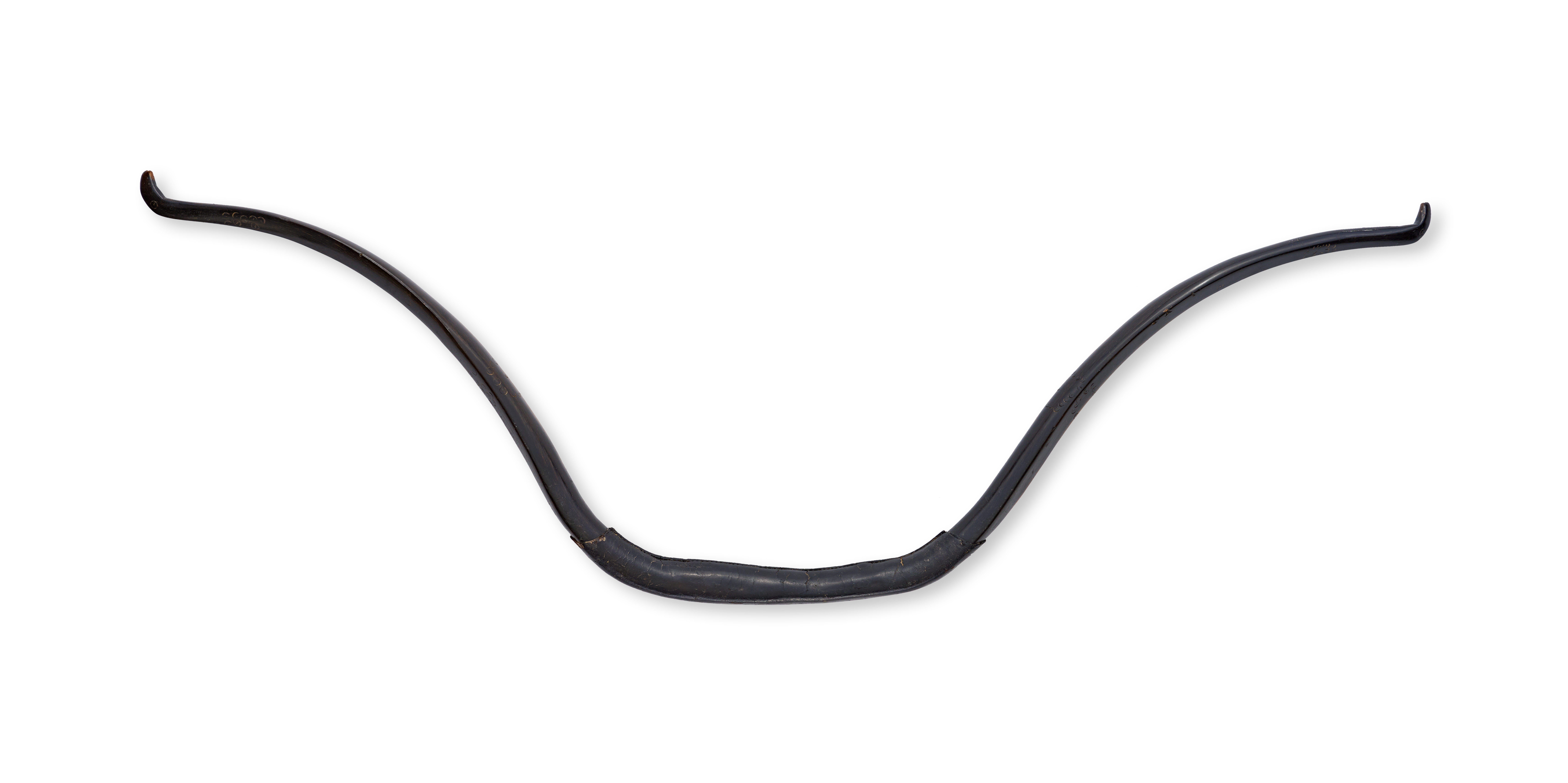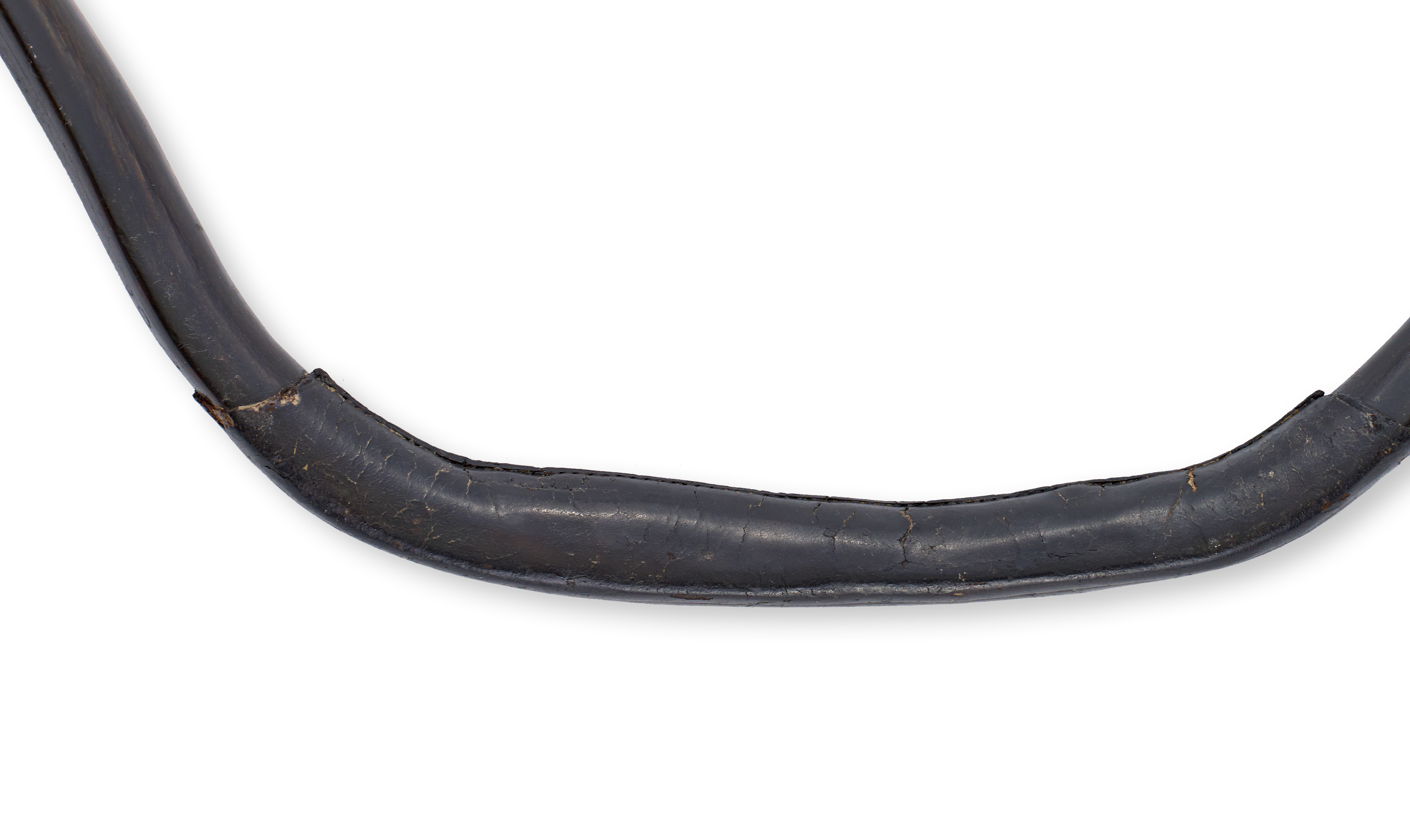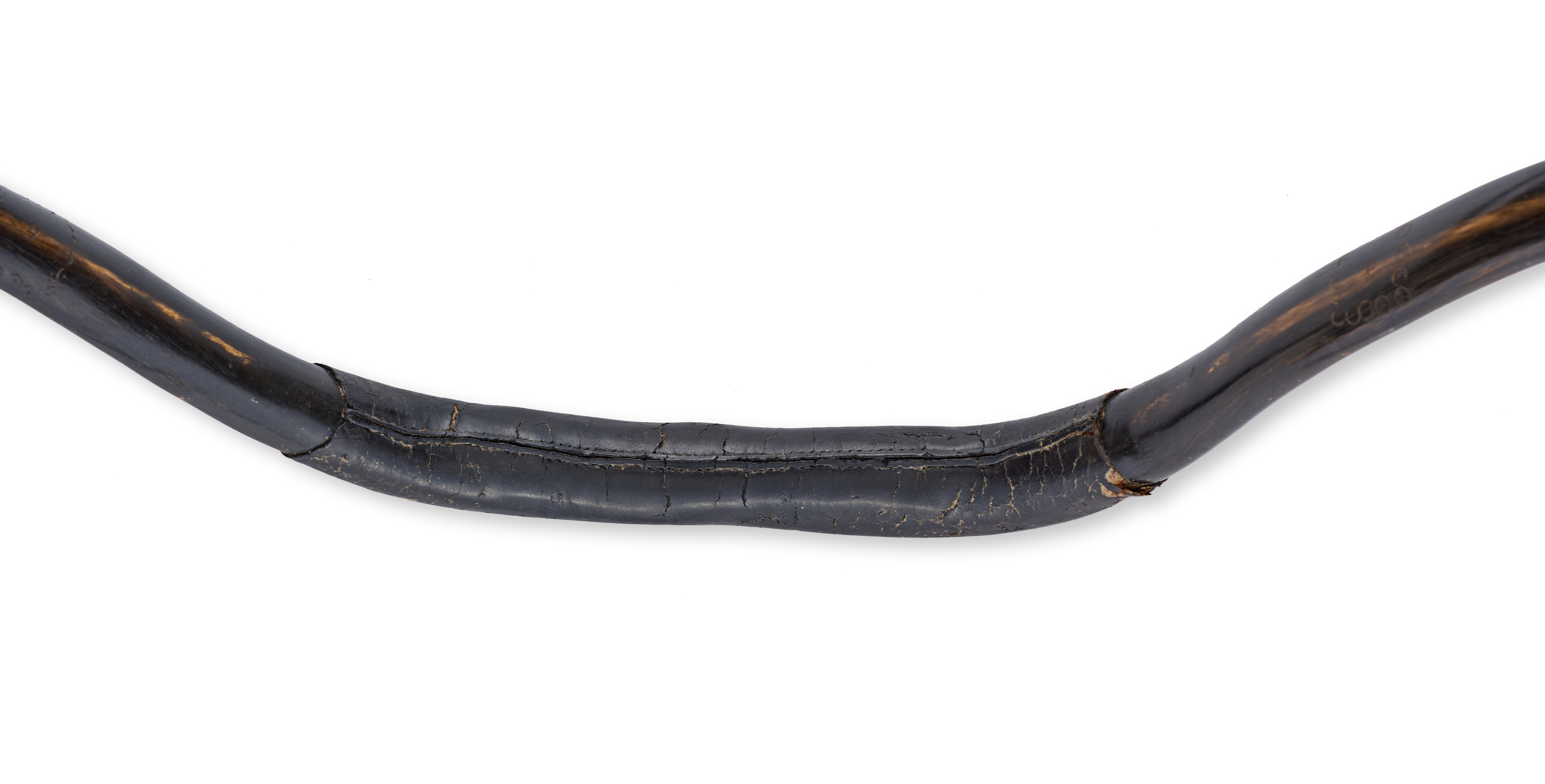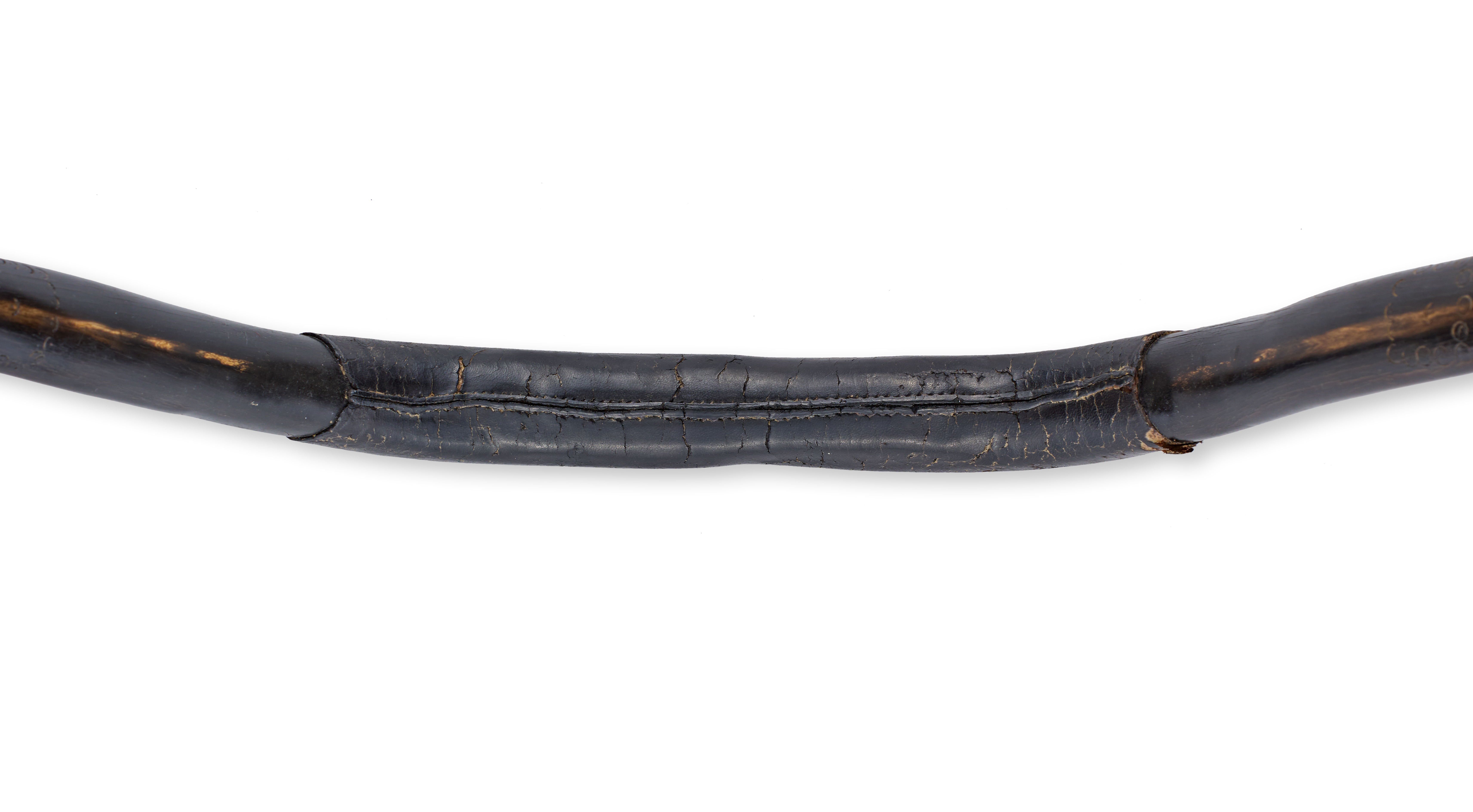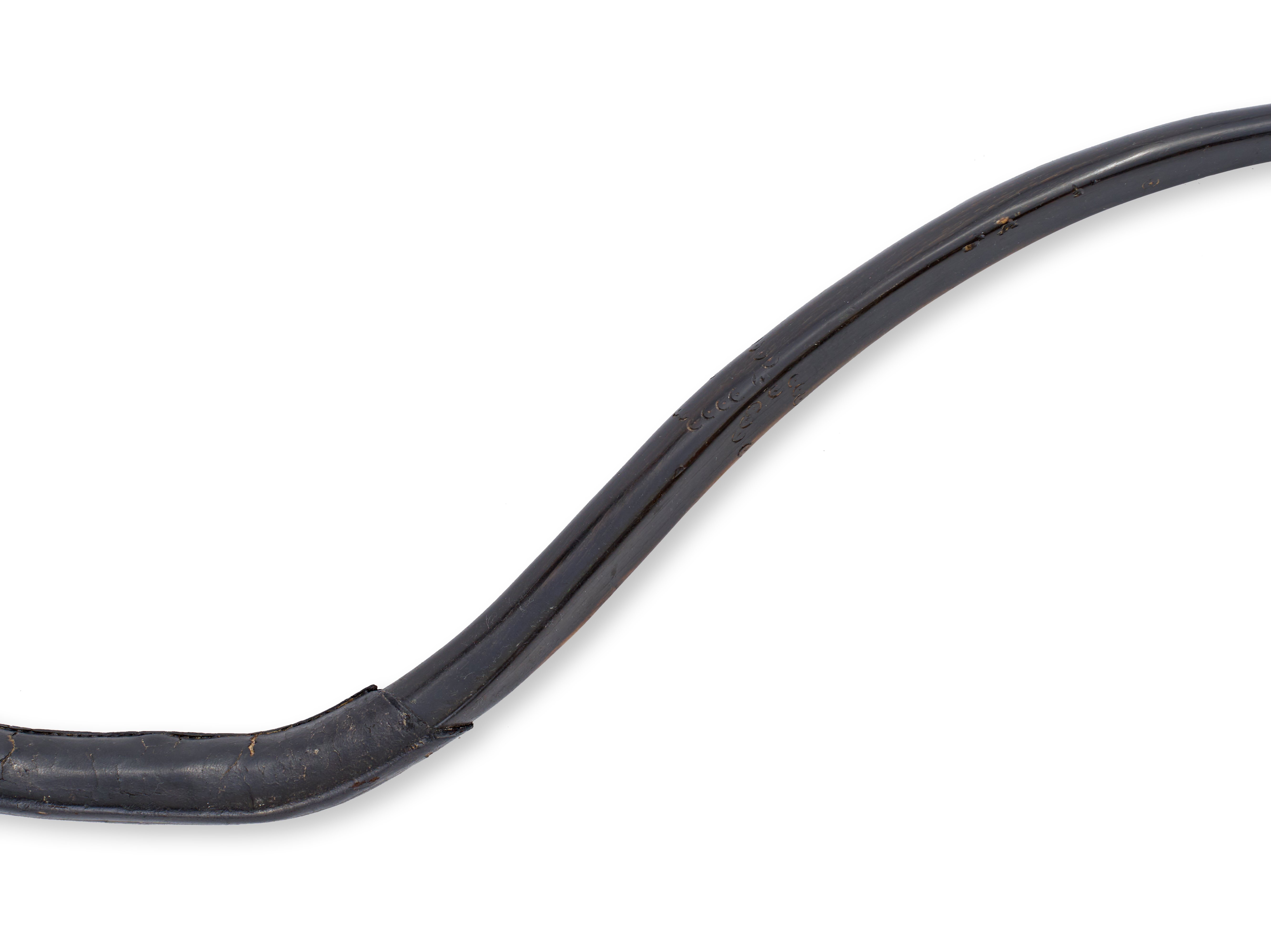 This recurve bow is of composite construction, featuring a dark lacquered finish over wood, horn, and sinew. The design includes pronounced recurved tips and a central grip section wrapped in stitched, dark leather. The item is presented in an unstrung state. Faint, possibly impressed alphanumeric characters are visible on the interior of one limb, and a small white numerical marking is present on the exterior.