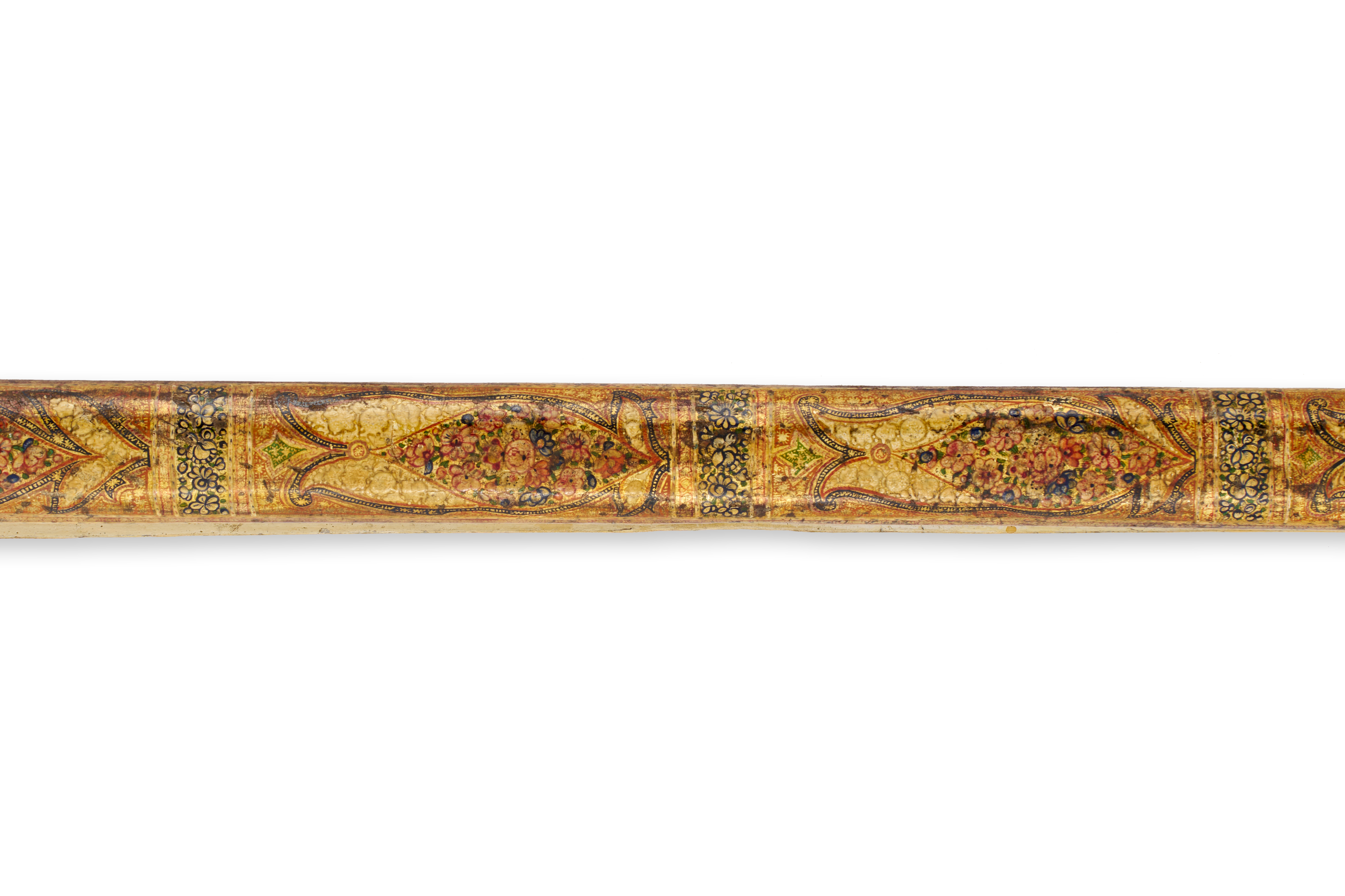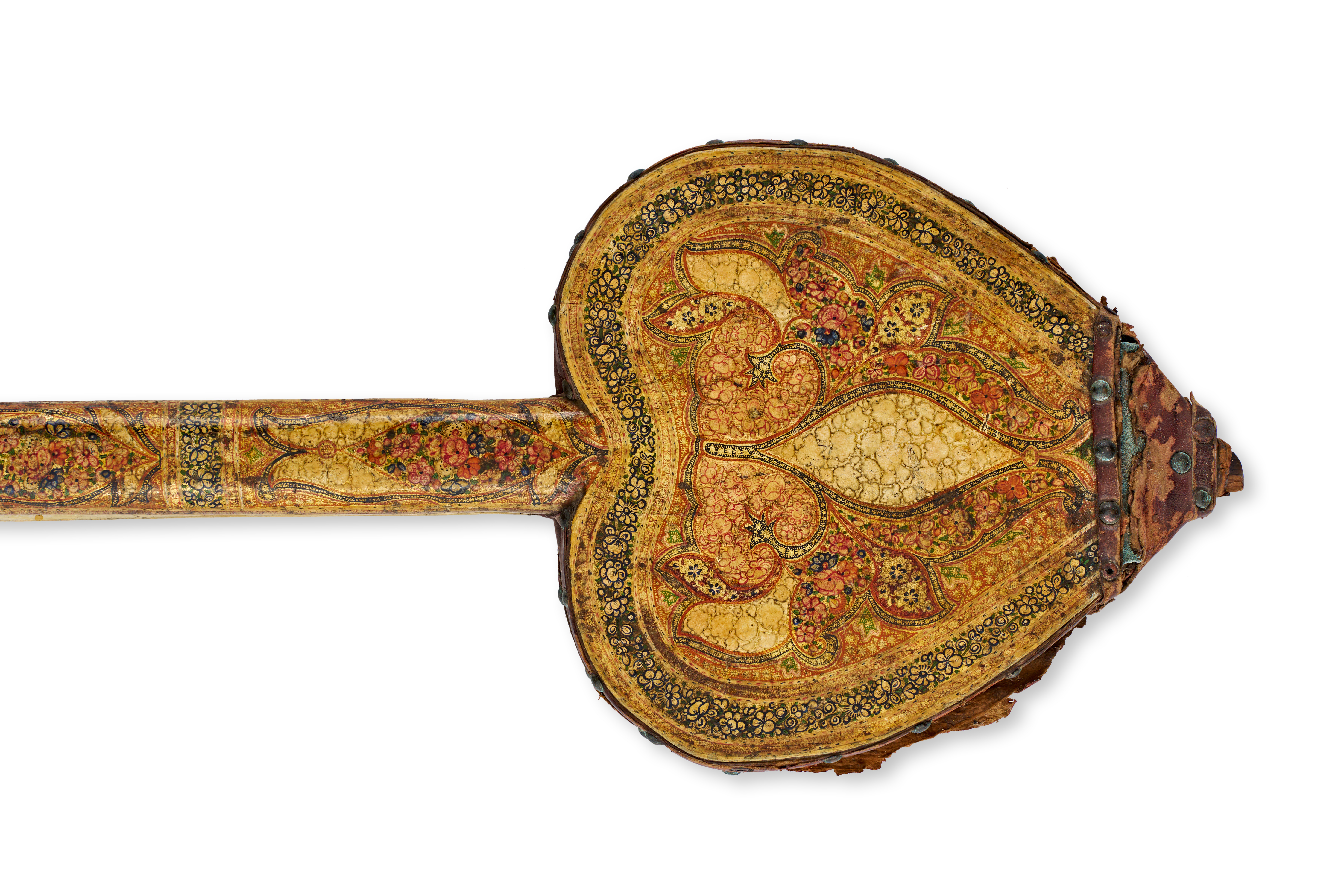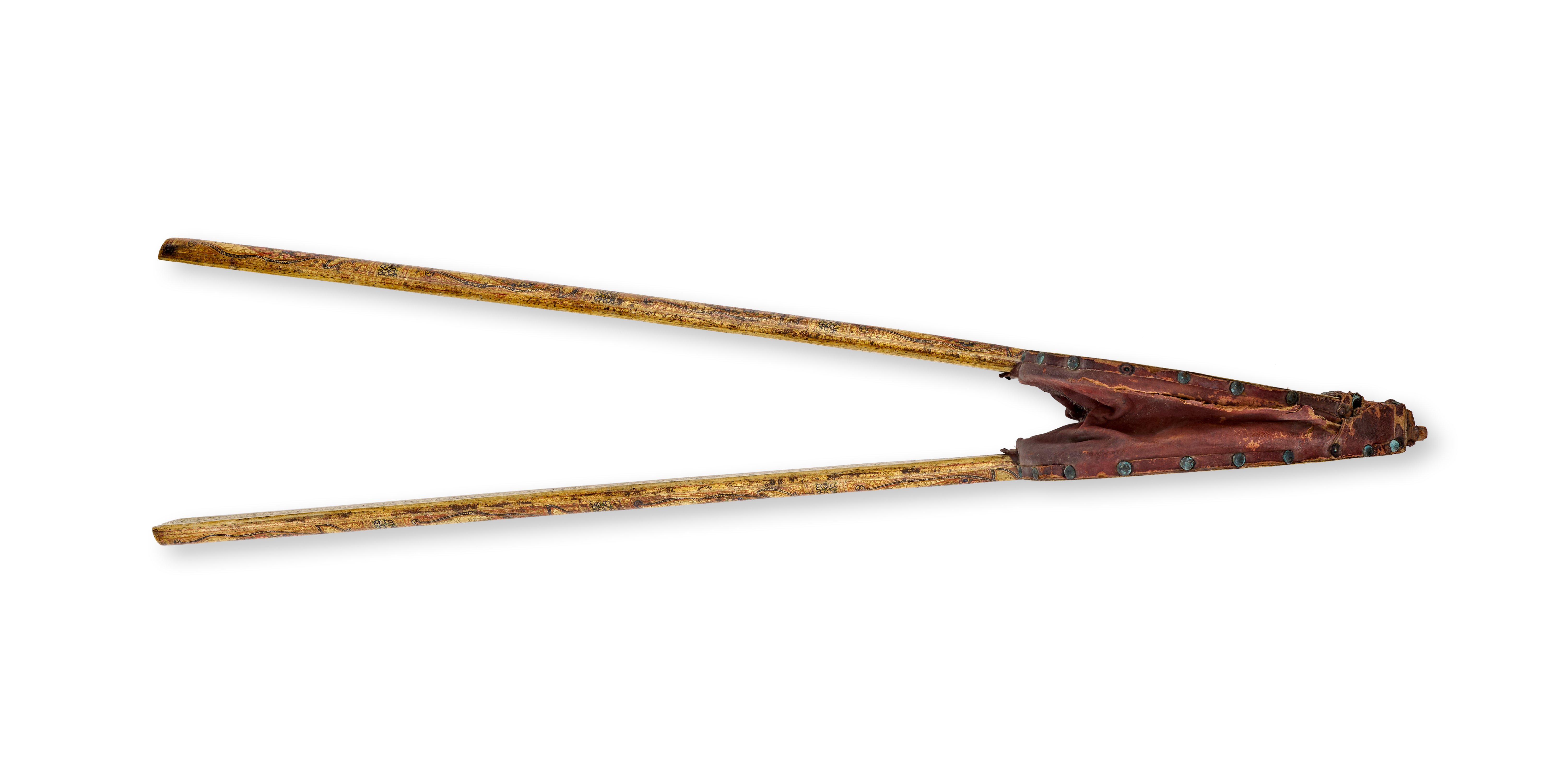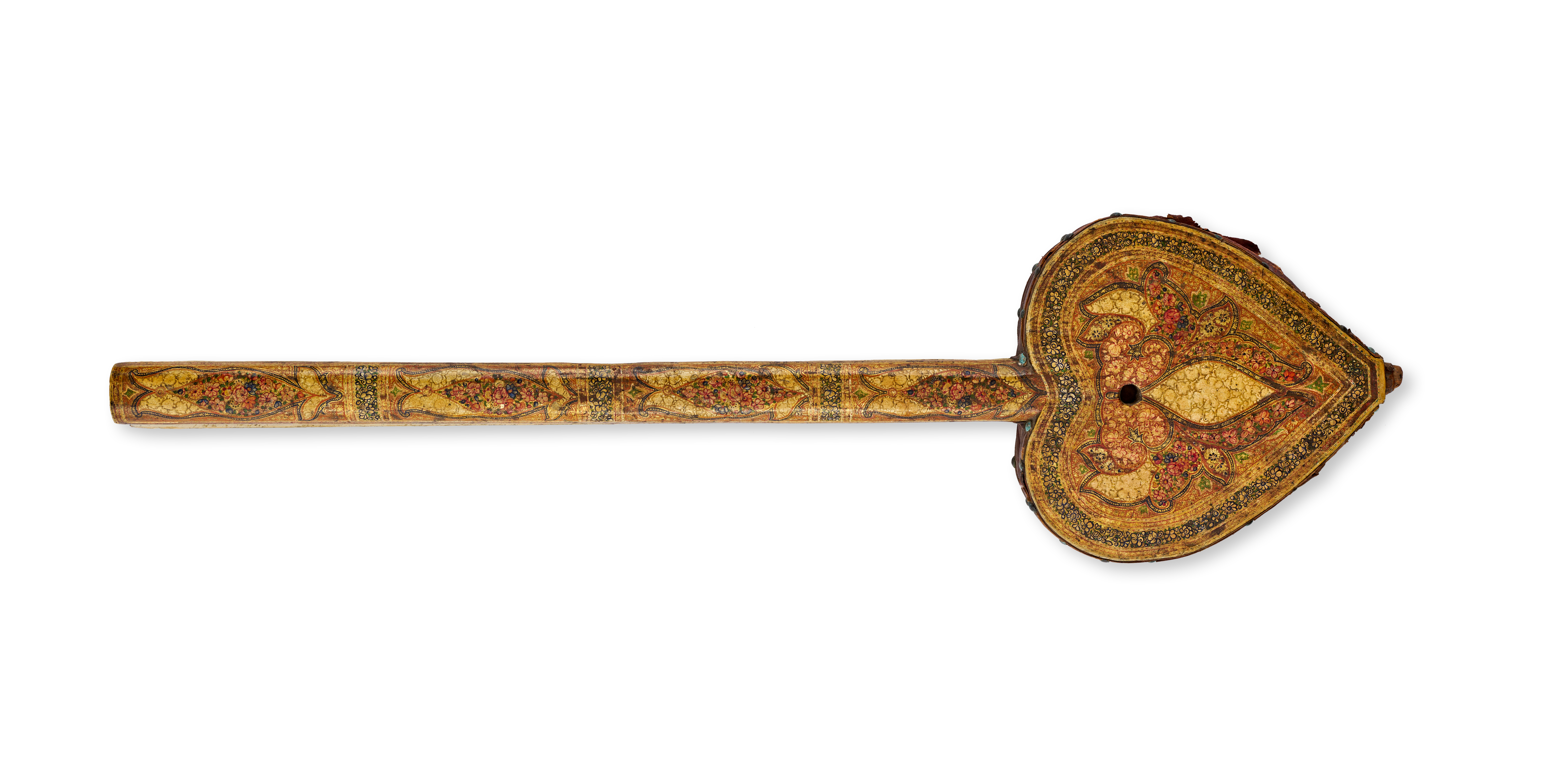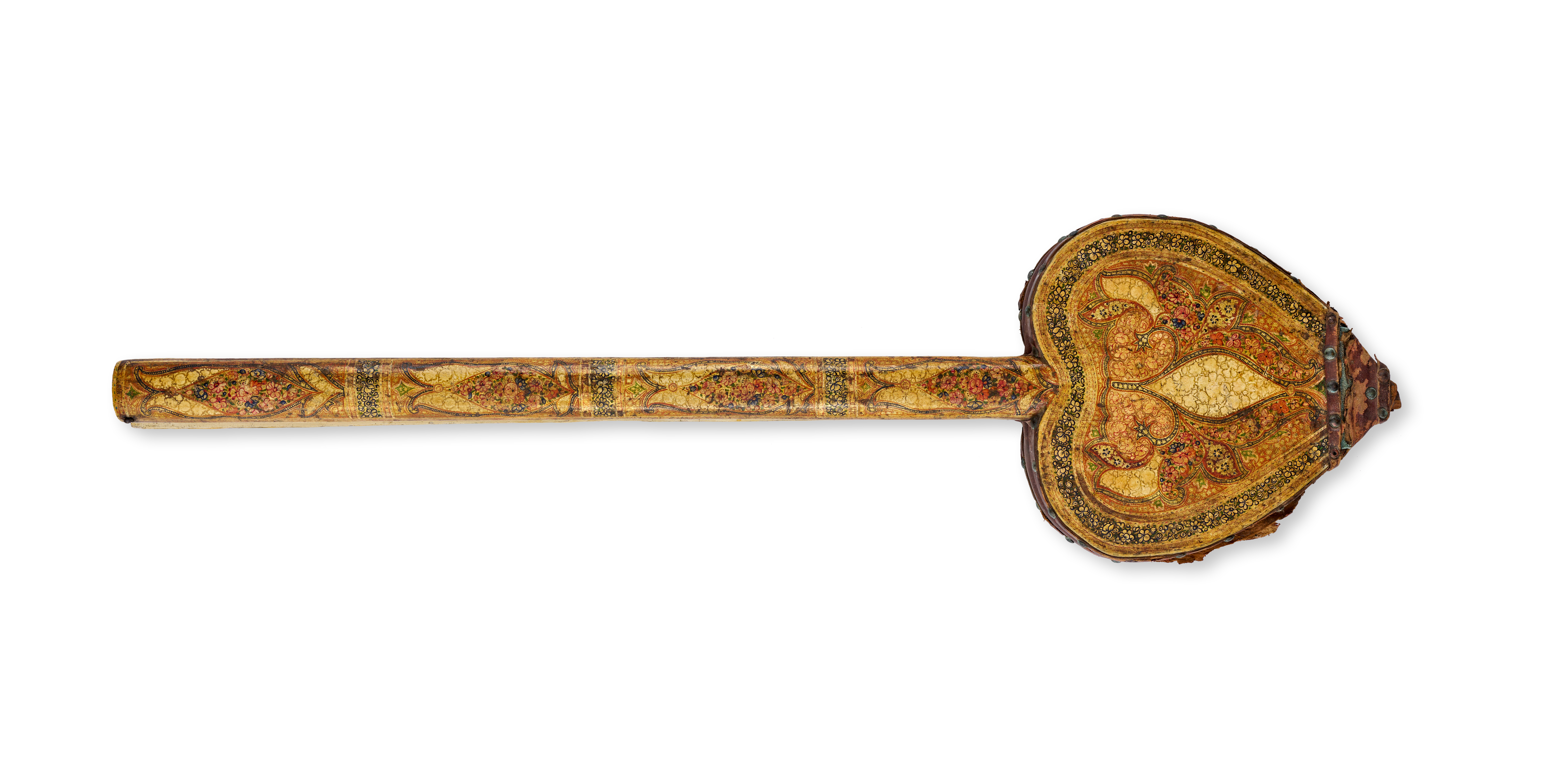 This pair of 19th-century lacquer bellows is constructed with heart-shaped wooden plates and long, tapered handles. The exterior surfaces are decorated in the Kashmir style with polychrome floral patterns and scrollwork on a cream-toned ground. The motifs are rendered in reds, greens, and blues with gilt highlights. A dark reddish-brown leather section is attached to the wooden plates using small decorative metal studs. A circular vent hole is located in the center of one plate. The interior of the handles features a black scroll pattern on a light ground.