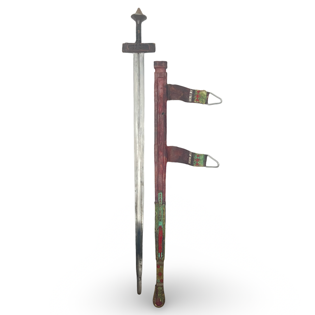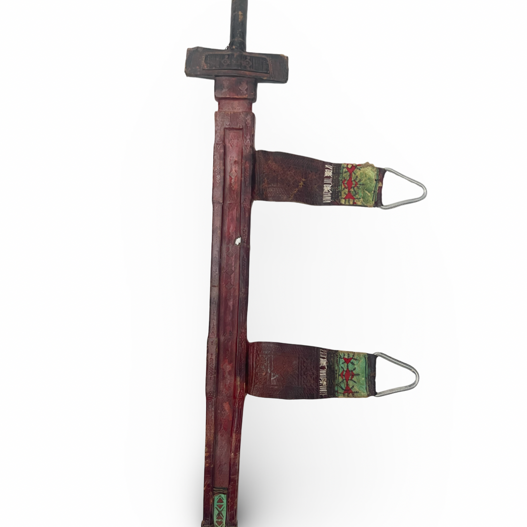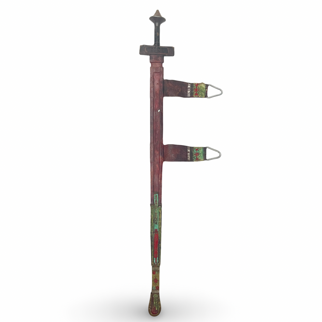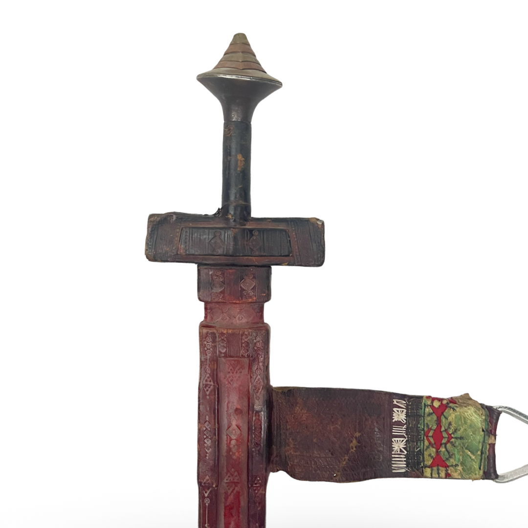 This Tuareg Takouba sword features a straight, double-edged steel blade with multiple longitudinal fullers. The hilt is constructed with a wide, leather-wrapped cross-guard and a tiered, conical metal pommel. The accompanying scabbard is made of reddish-brown leather, decorated with tooled geometric patterns and featuring green and red ornamental leatherwork. Two leather suspension loops are fitted with triangular metal rings for attachment.
