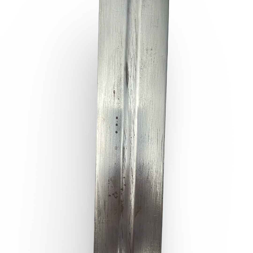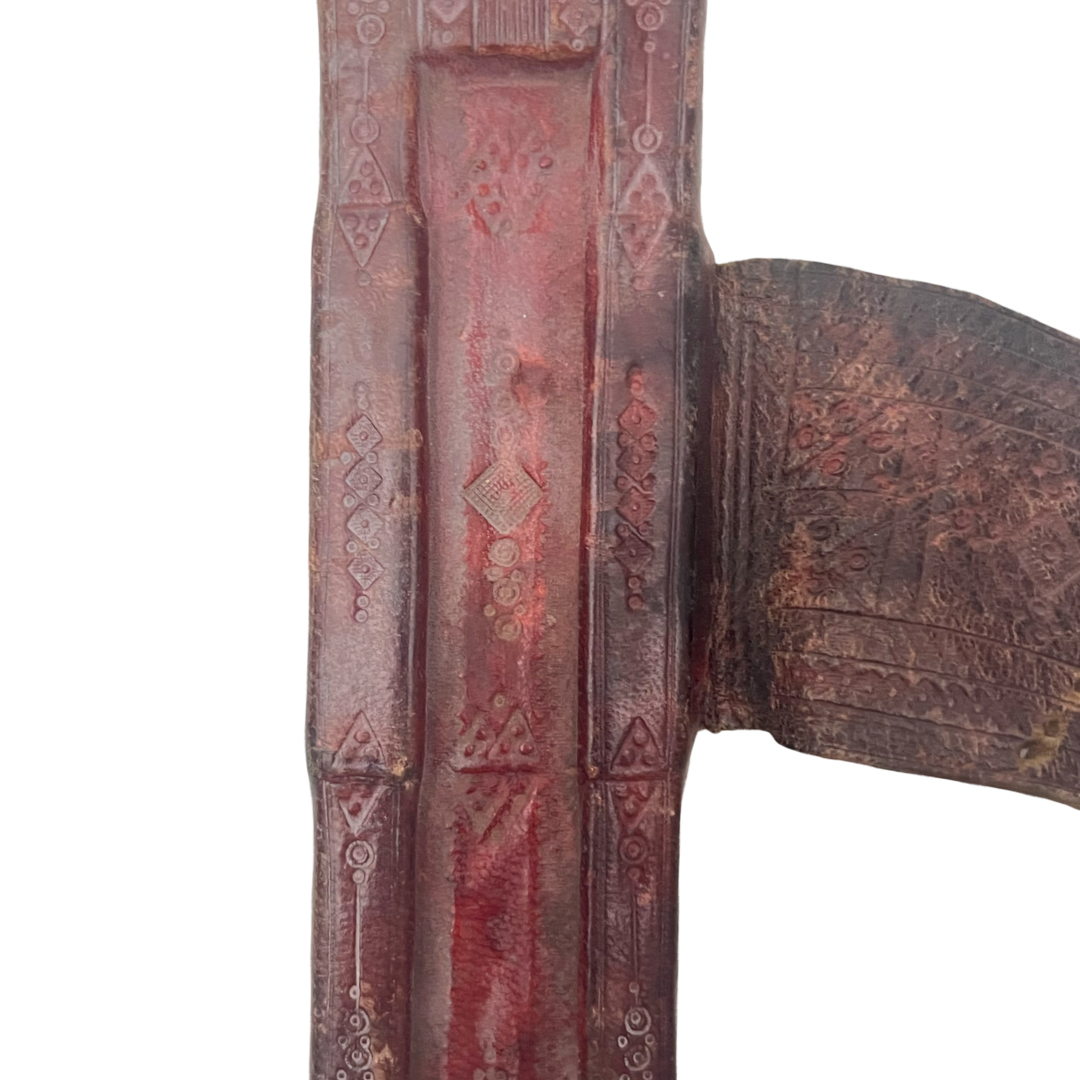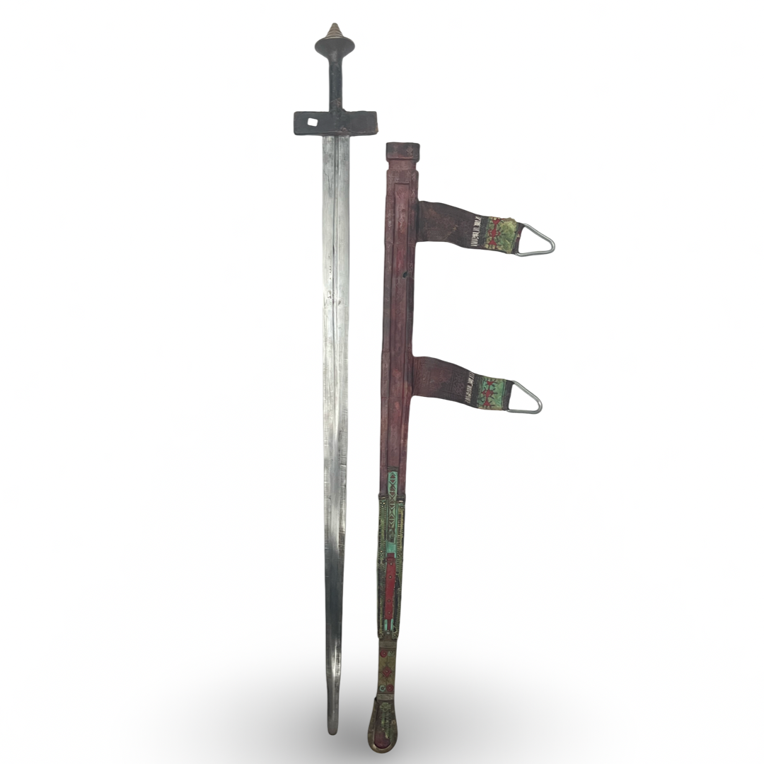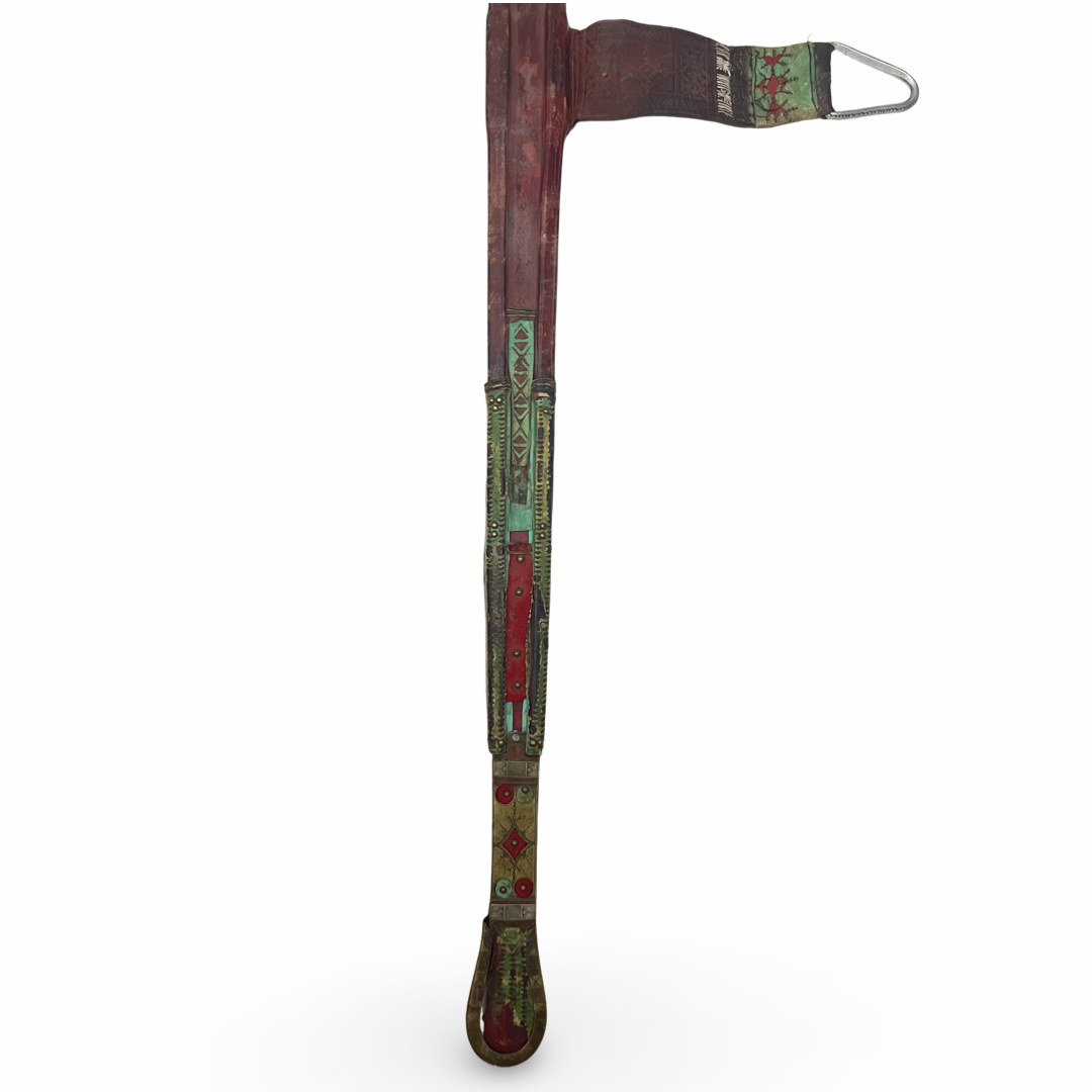 This Tuareg Takouba sword features a straight, double-edged steel blade with multiple longitudinal fullers. The hilt is constructed with a wide, leather-wrapped cross-guard and a tiered, conical metal pommel. The accompanying scabbard is made of reddish-brown leather, decorated with tooled geometric patterns and featuring green and red ornamental leatherwork. Two leather suspension loops are fitted with triangular metal rings for attachment.
