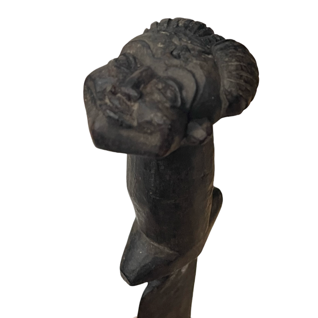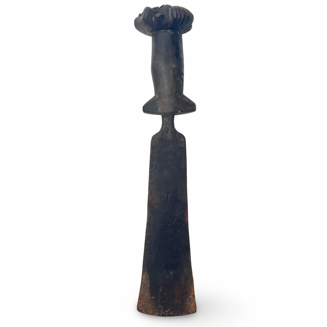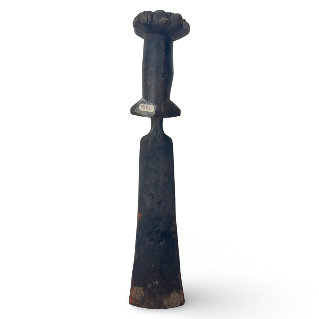 This ethnographic implement, identified as a Kuba style prestige knife, features a hand-forged iron blade and a dark, carved wooden hilt. The hilt is sculpted into a figurative human head characterized by stylized facial features and a ridged coiffure. The blade is long and rectangular with a slightly flared, blunt end, typical of ceremonial weaponry from the Democratic Republic of the Congo. The hilt retains a small paper inventory sticker marked 1993. Faint, indeterminate markings are present on the face of the blade.