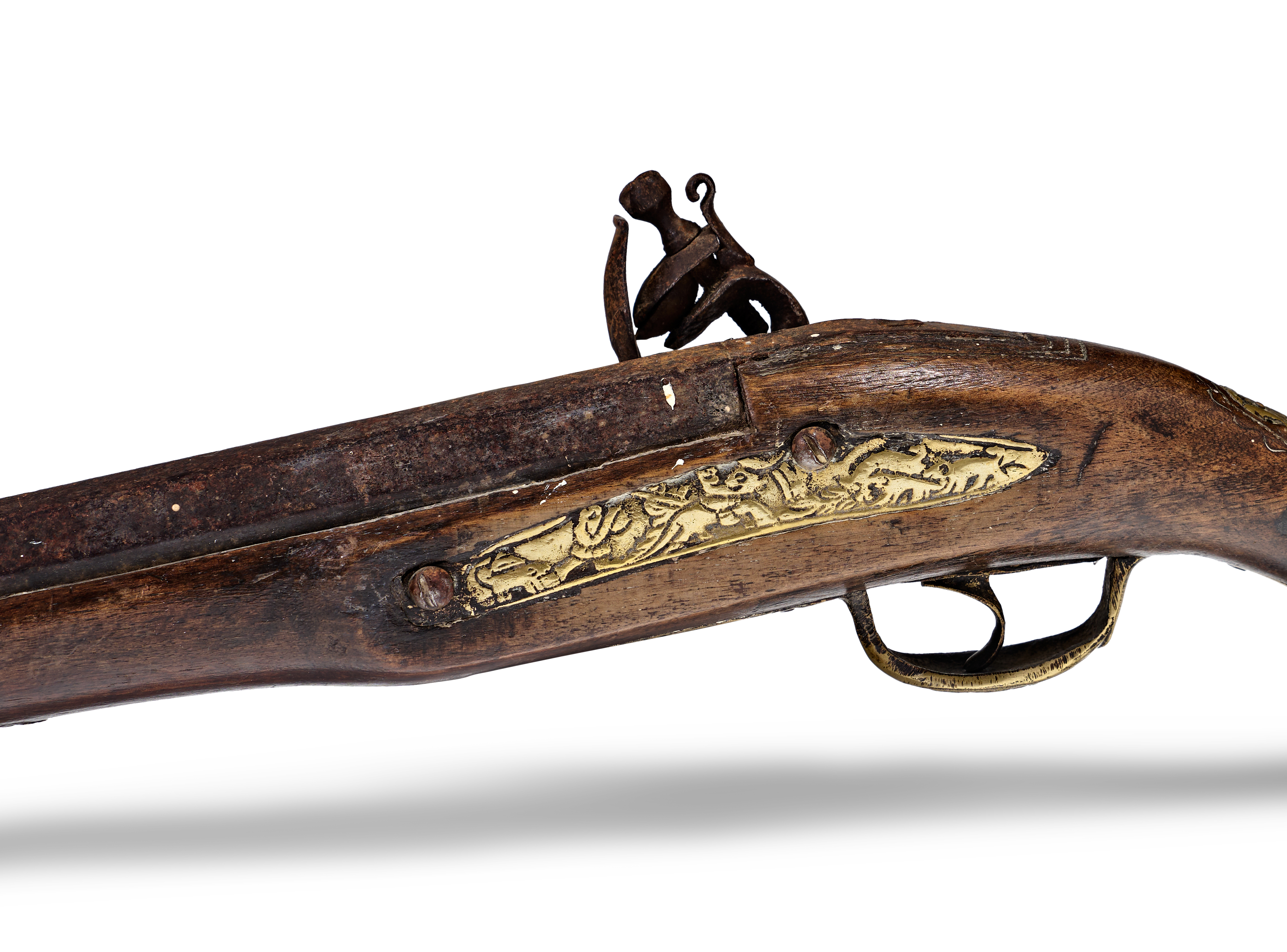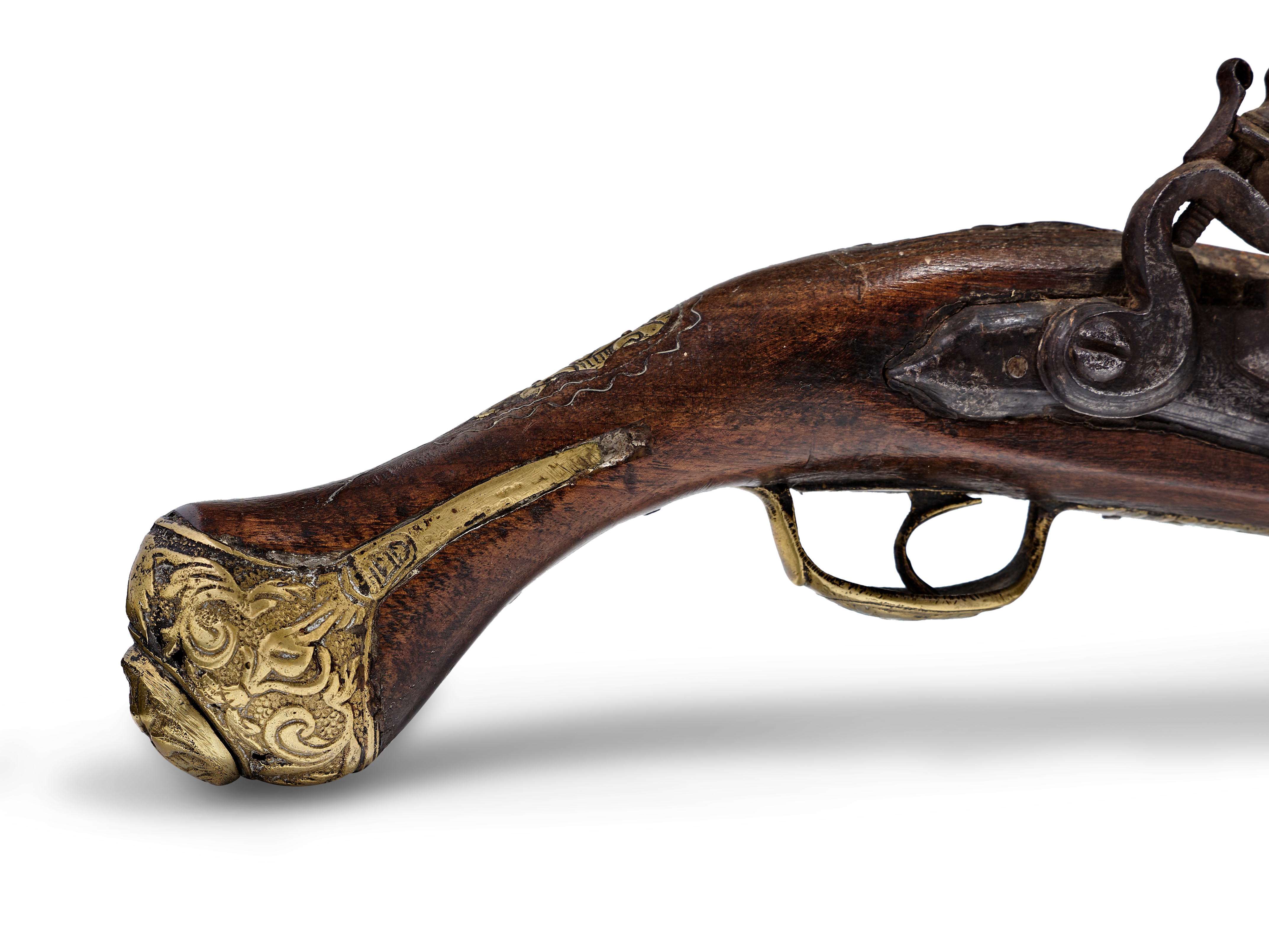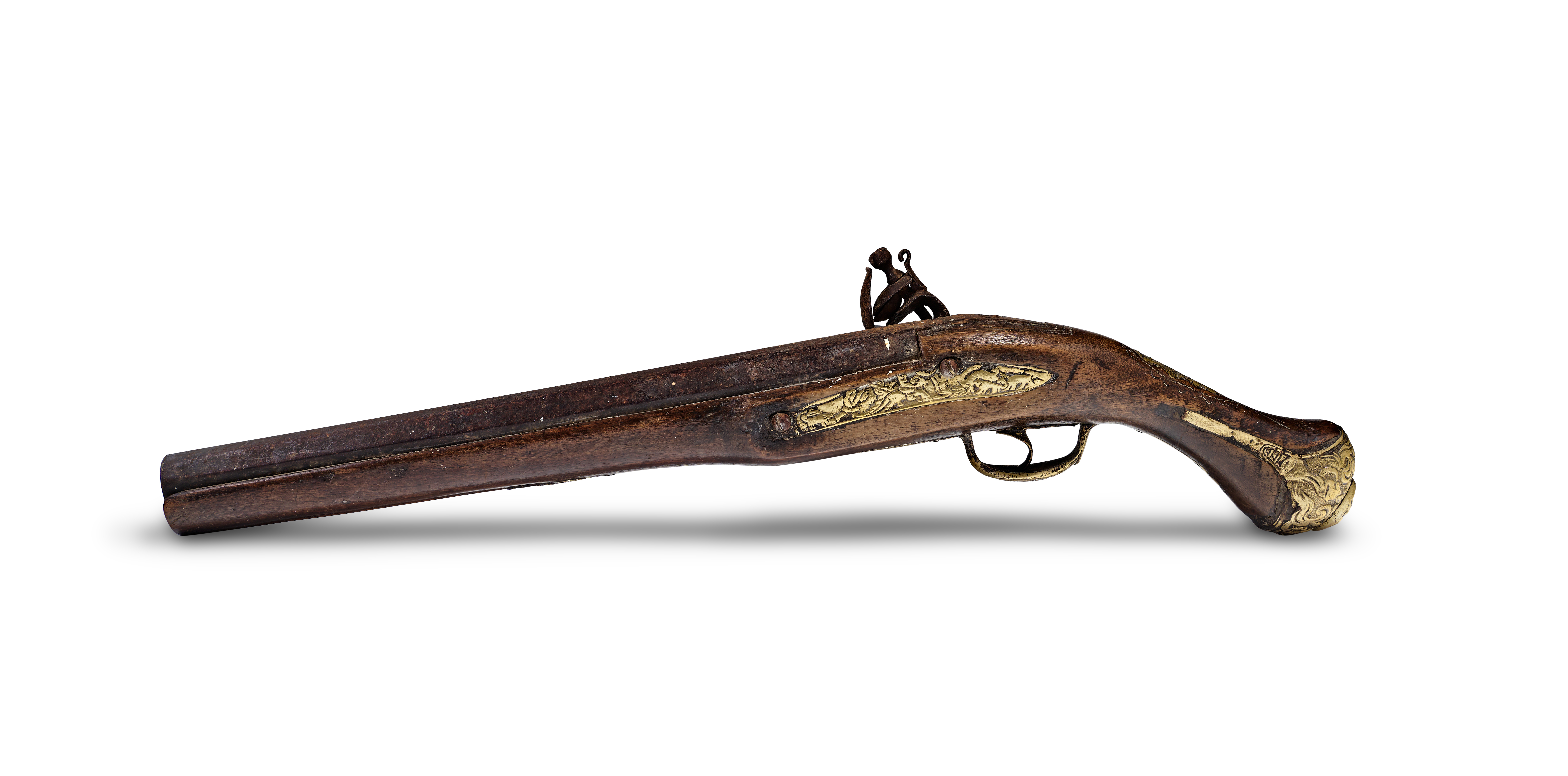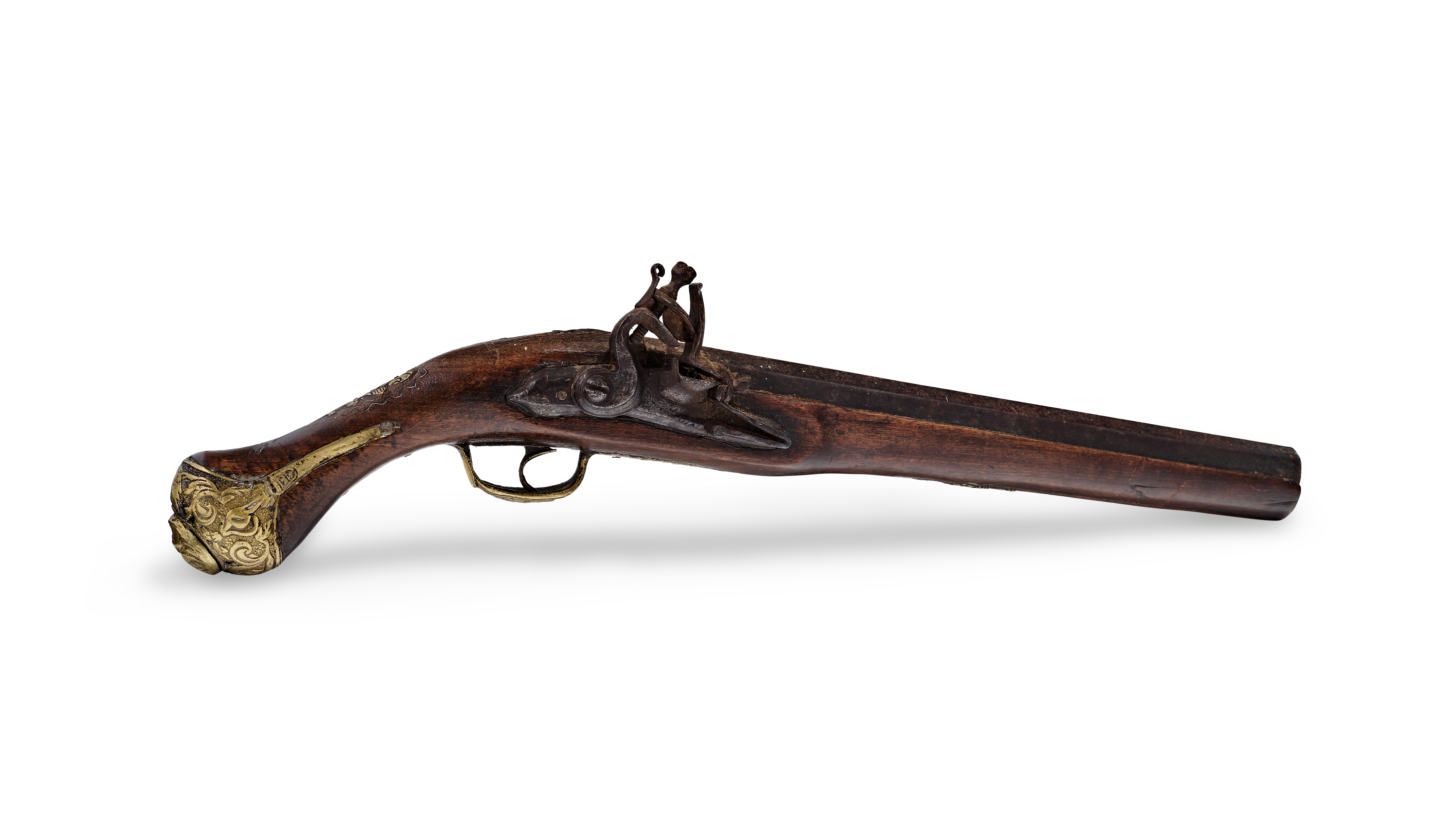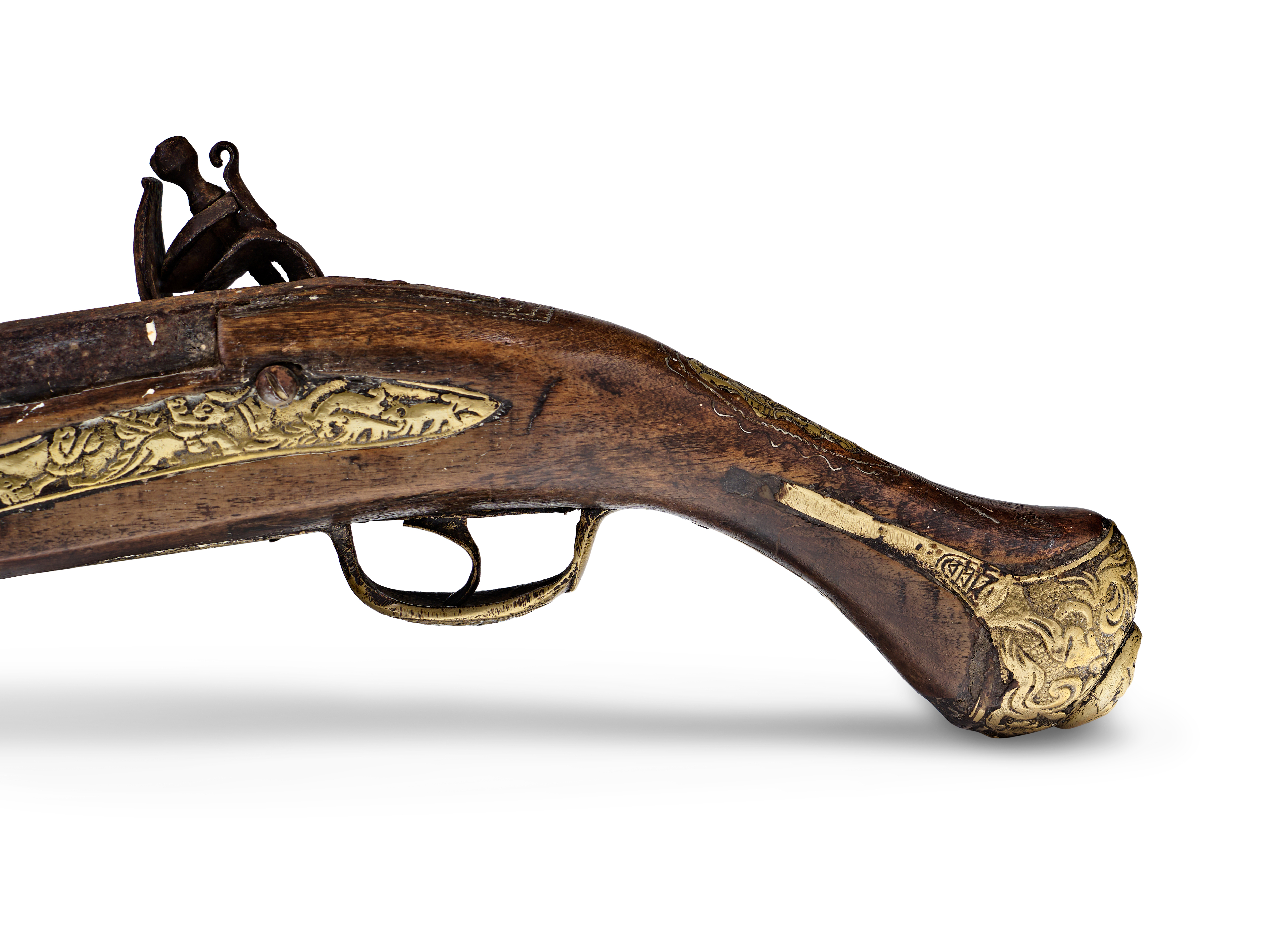 This Ottoman flintlock pistol features a dark wood stock with ornate brass furniture. The iron barrel is octagonal at the breech and transitions toward the muzzle. The flintlock mechanism is constructed from iron and mounted to the right side of the stock. The brass side plate is decorated with a hunting scene depicting animals in relief. The brass butt cap features deep-relief scrollwork and a decorative finial. The pistol is equipped with a brass trigger guard and a single trigger. The wood stock includes integrated brass components and shows a dark finish throughout.
