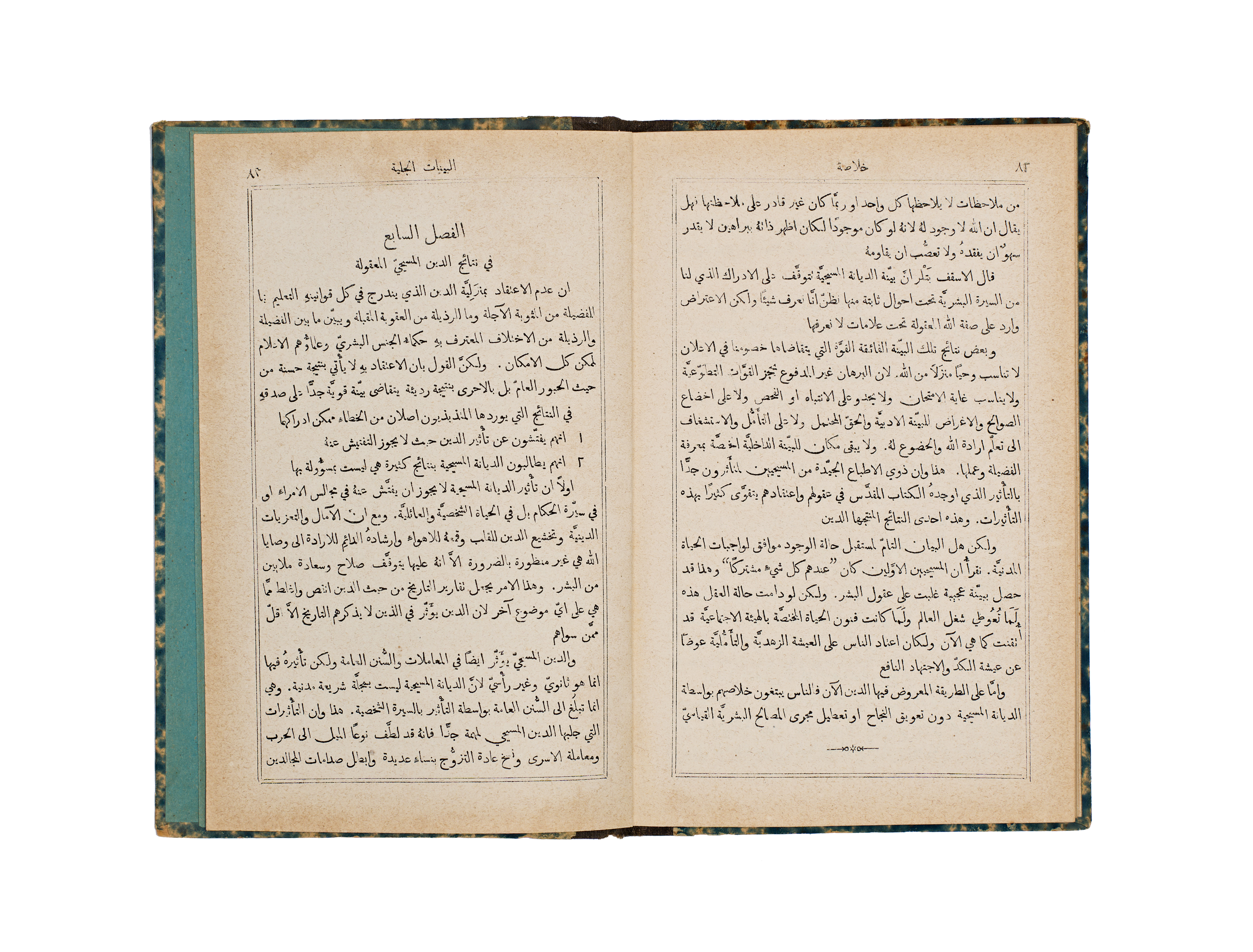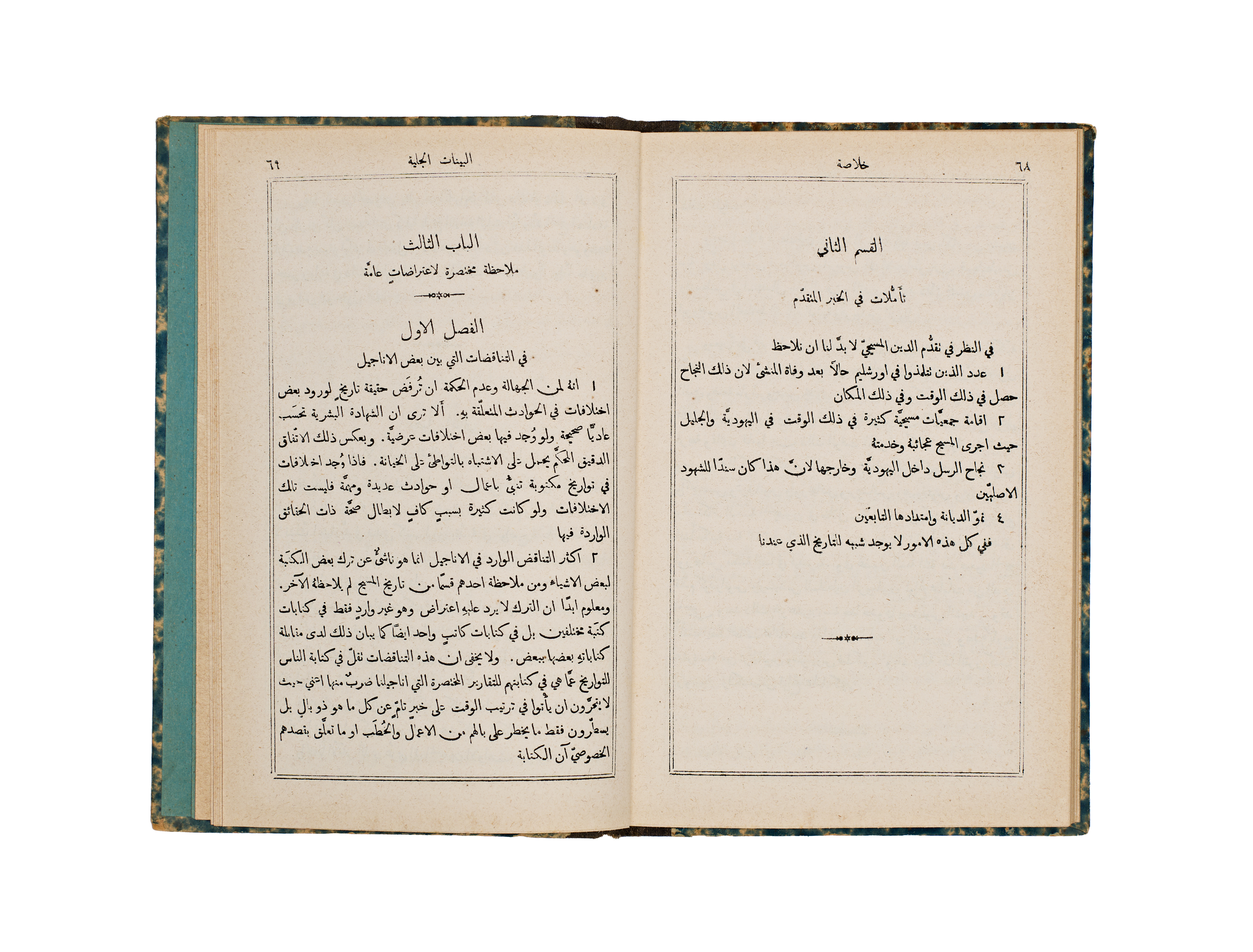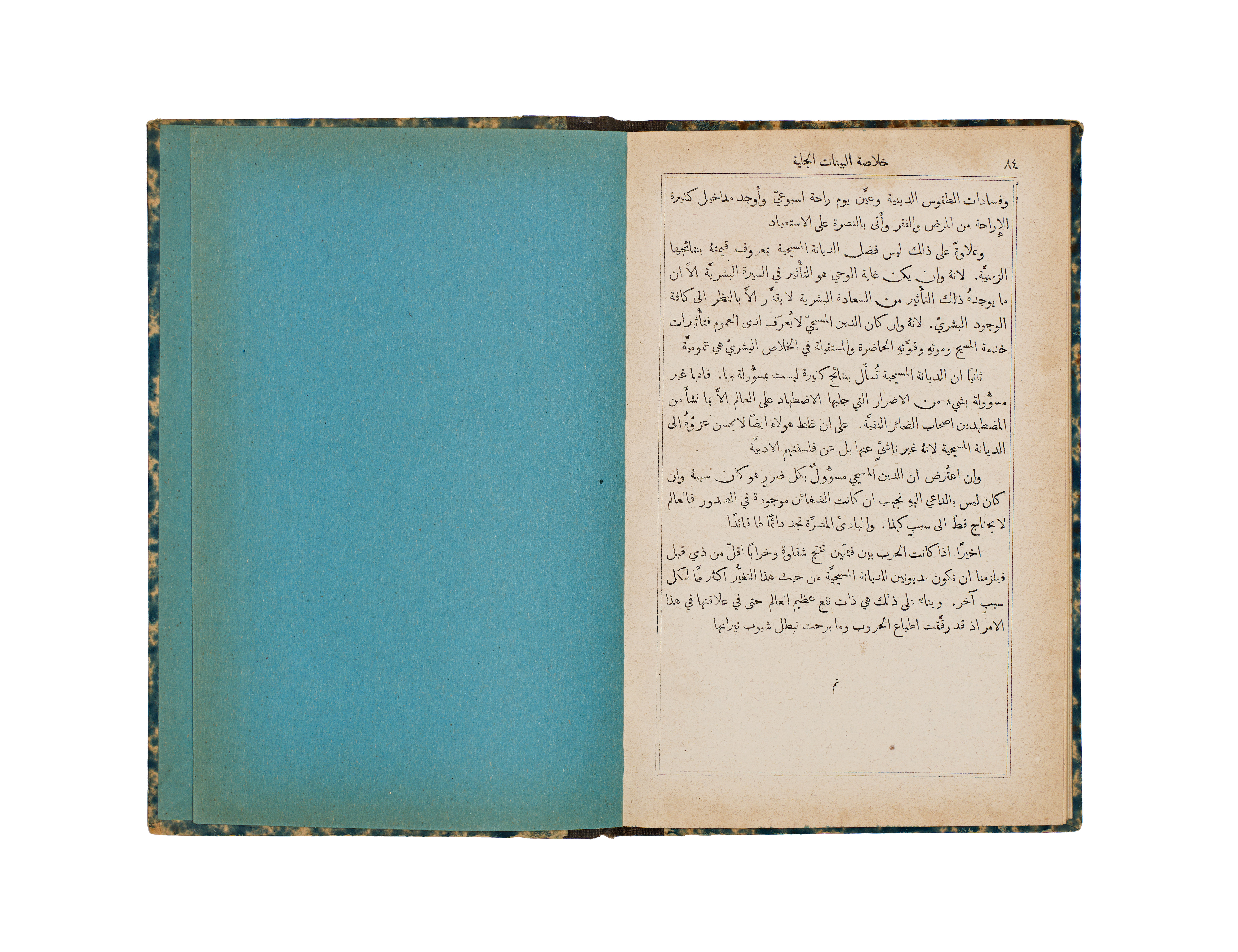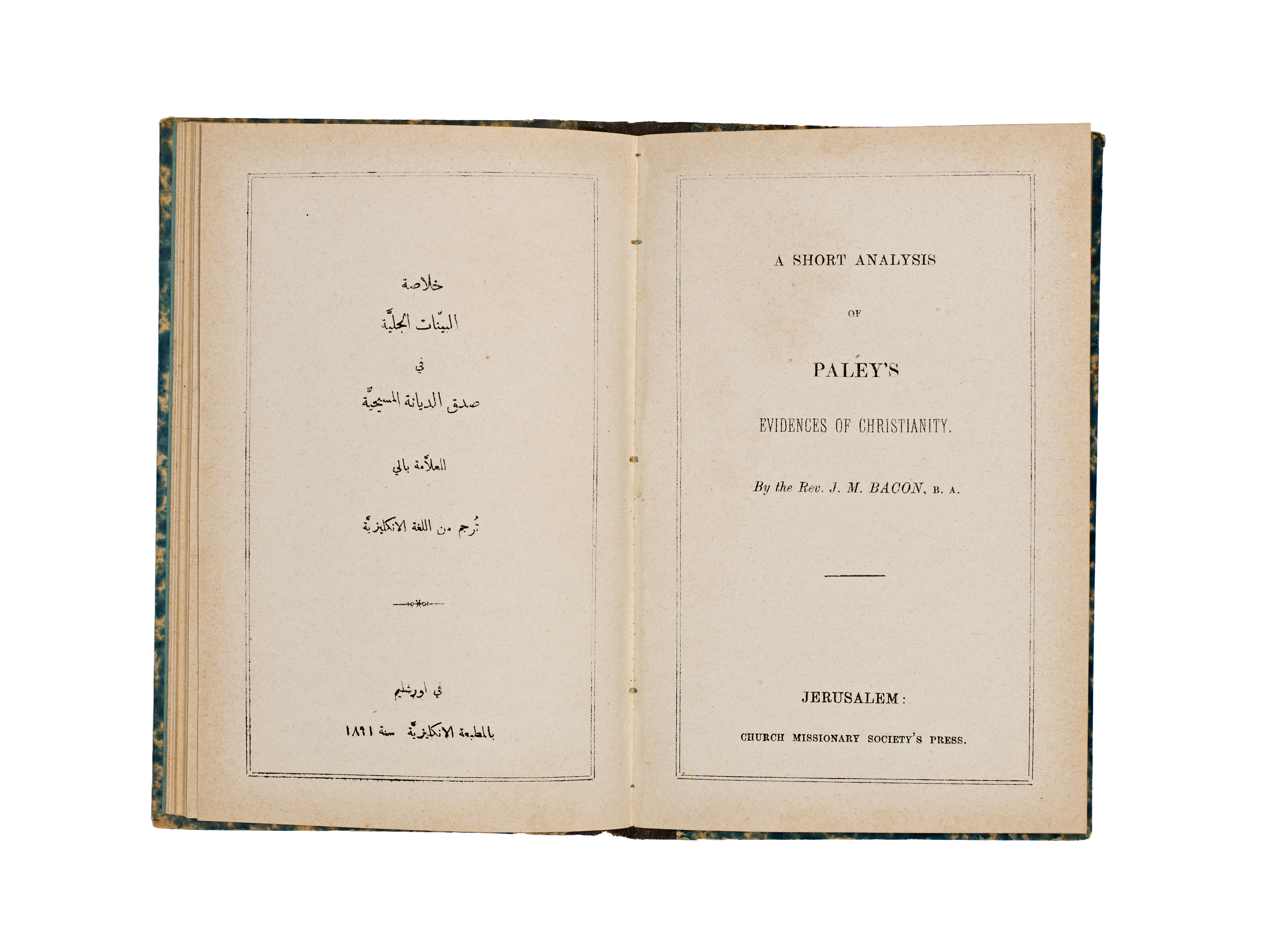 This 1891 publication, titled A Short Analysis of Paley’s Evidences of Christianity, was authored by the Rev. J. M. Bacon and printed by the Church Missionary Society’s Press in Jerusalem. The volume features a bilingual English and Arabic title page, with the subsequent text presented in Arabic. It is bound in blue and white marbled paper boards with a contrasting black cloth spine.