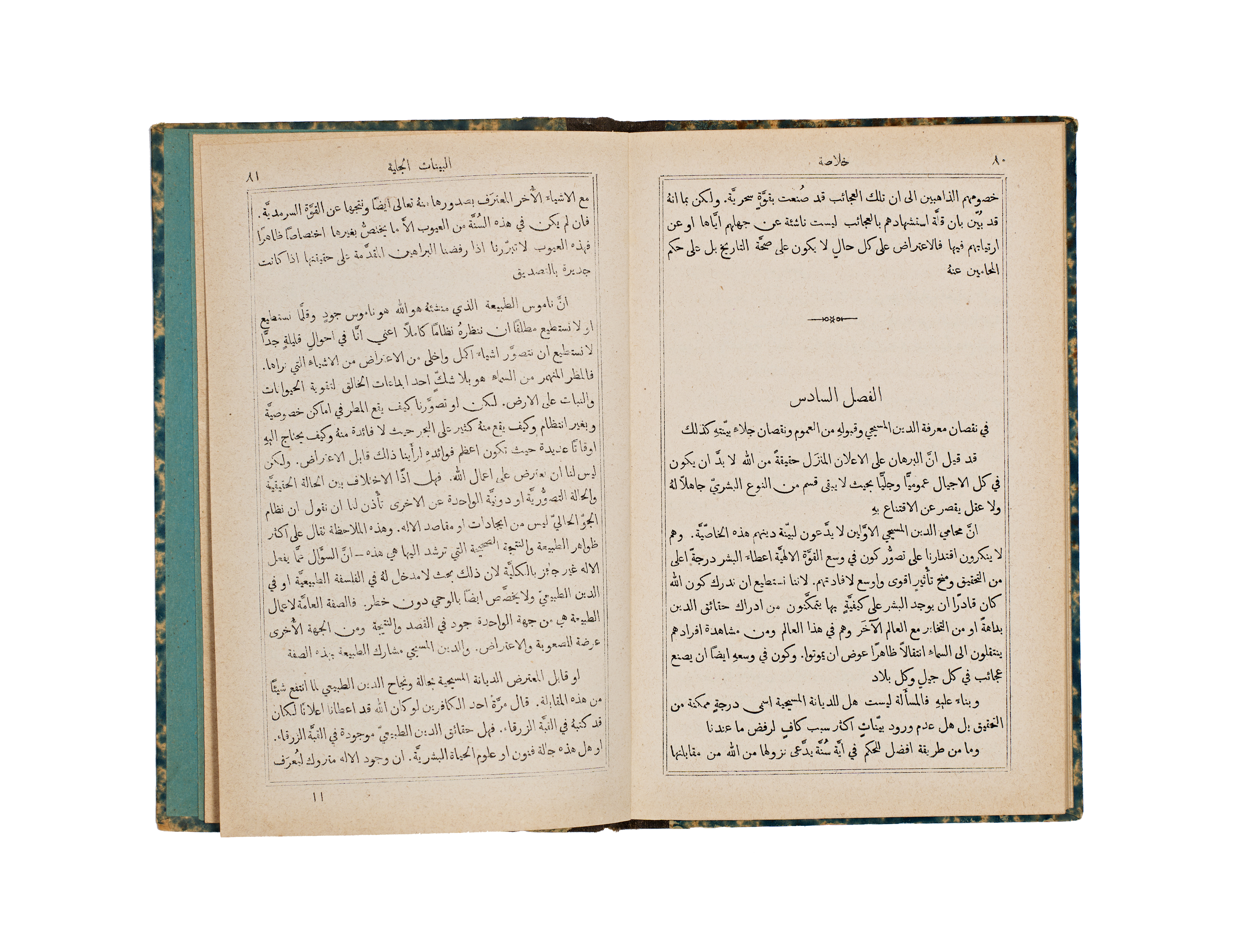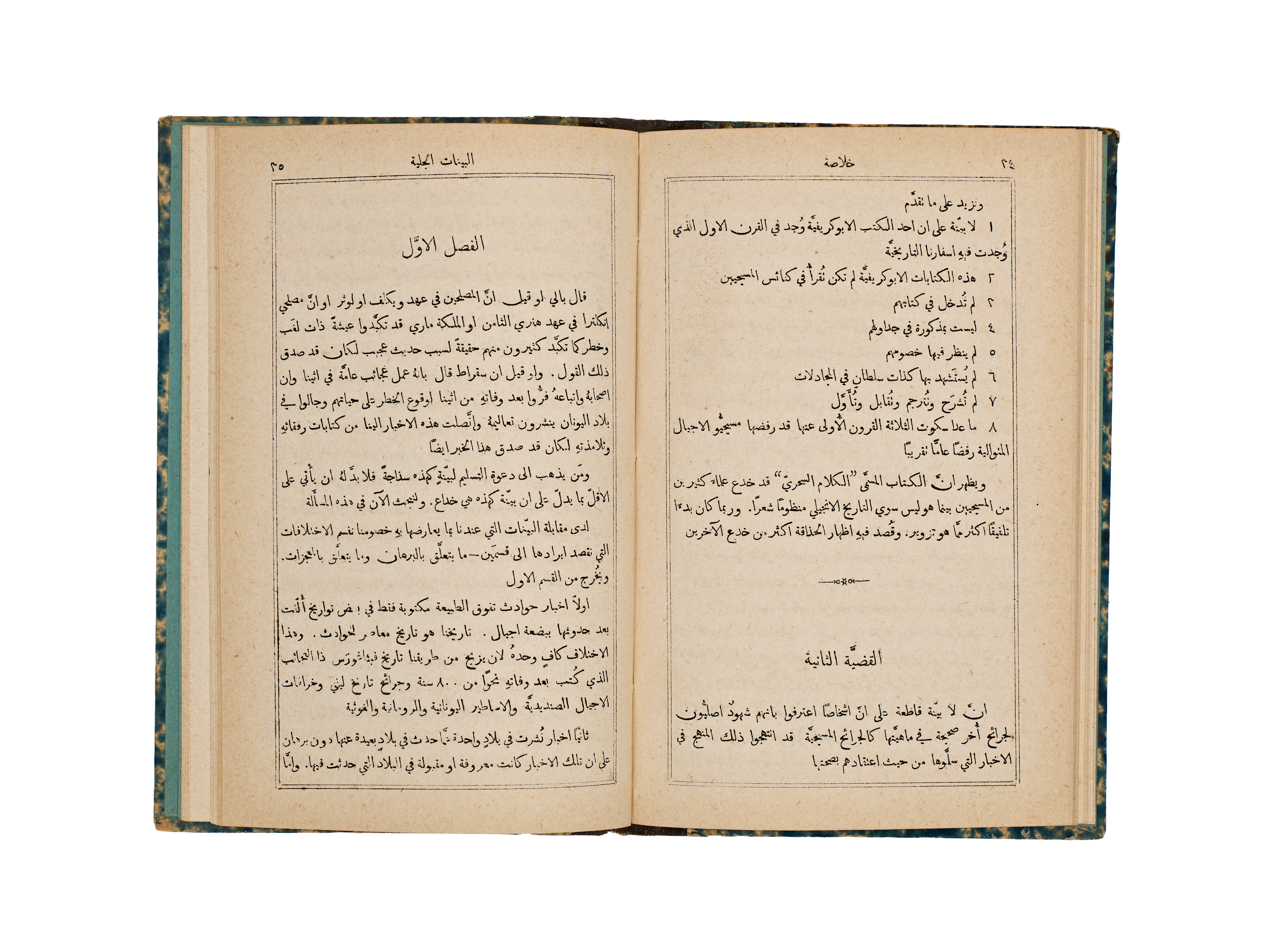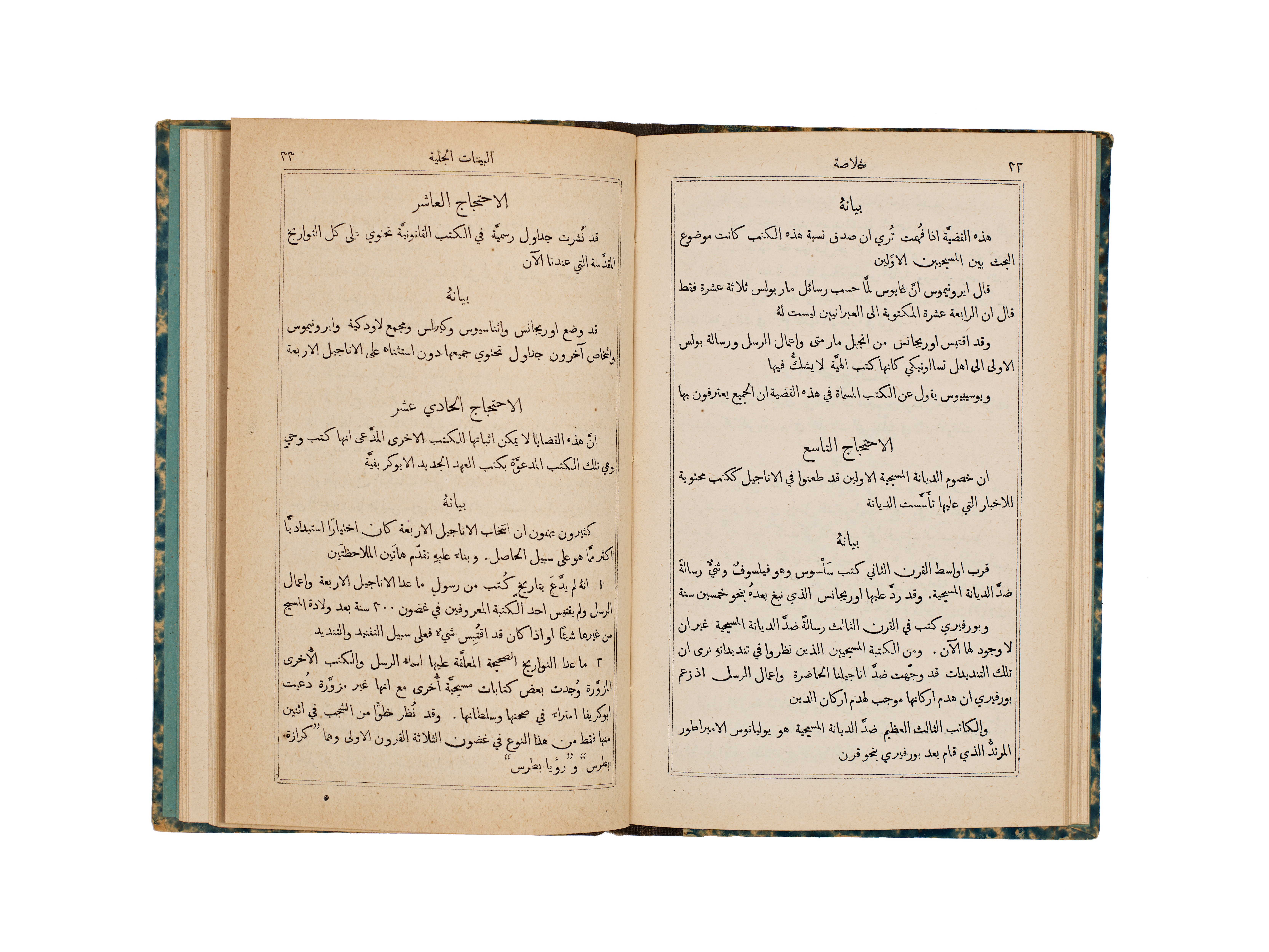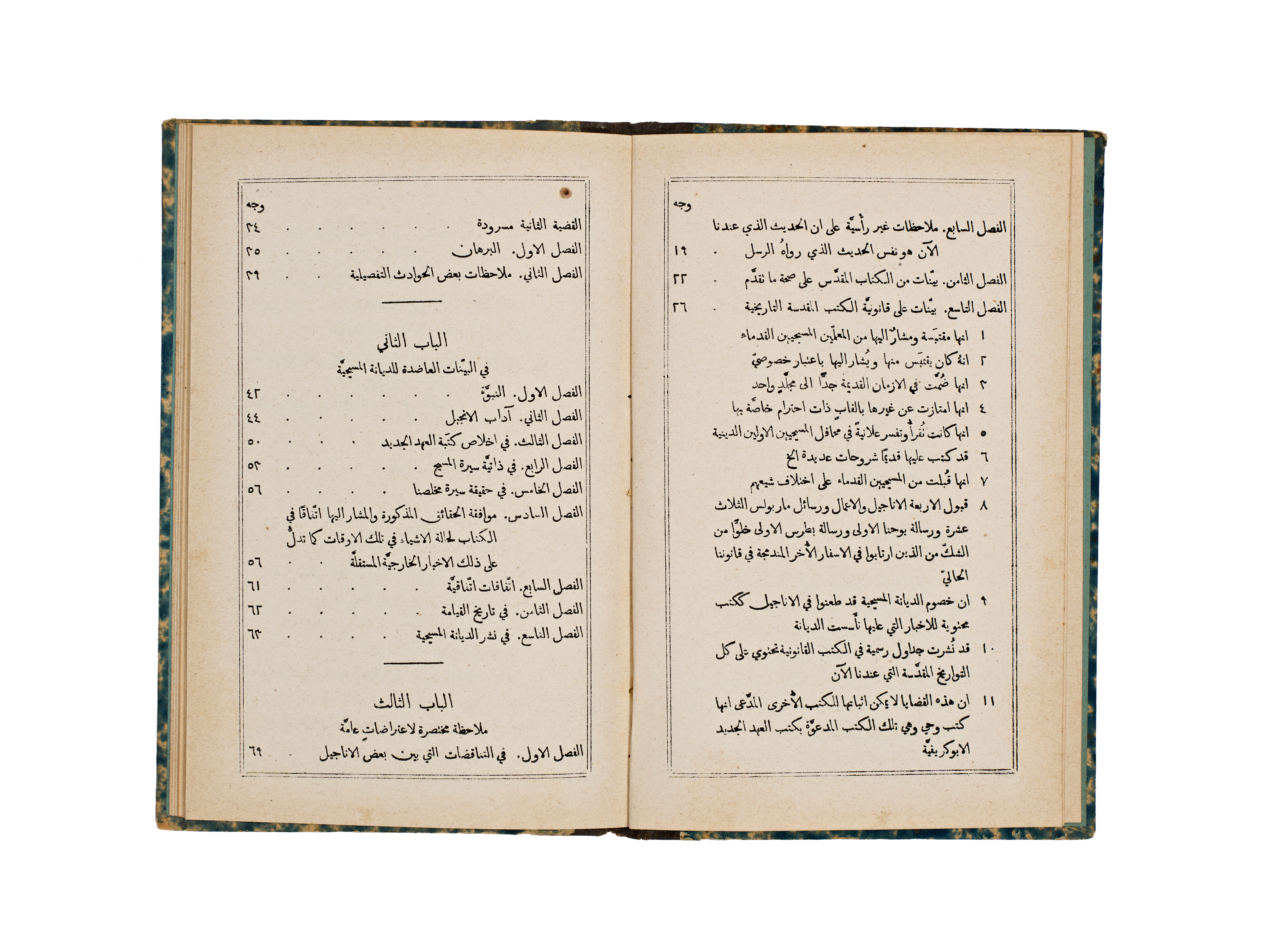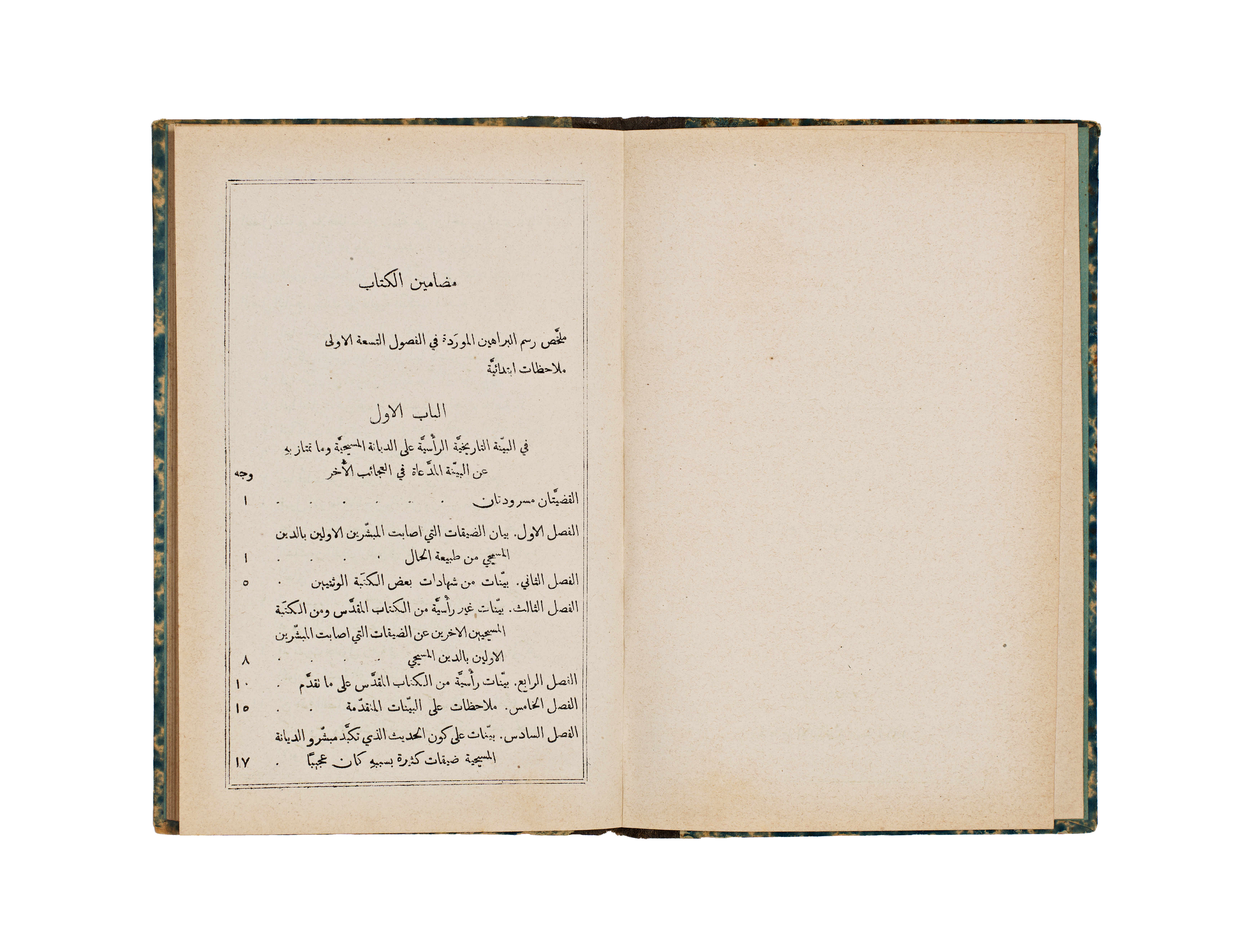 This 1891 publication, titled A Short Analysis of Paley’s Evidences of Christianity, was authored by the Rev. J. M. Bacon and printed by the Church Missionary Society’s Press in Jerusalem. The volume features a bilingual English and Arabic title page, with the subsequent text presented in Arabic. It is bound in blue and white marbled paper boards with a contrasting black cloth spine.