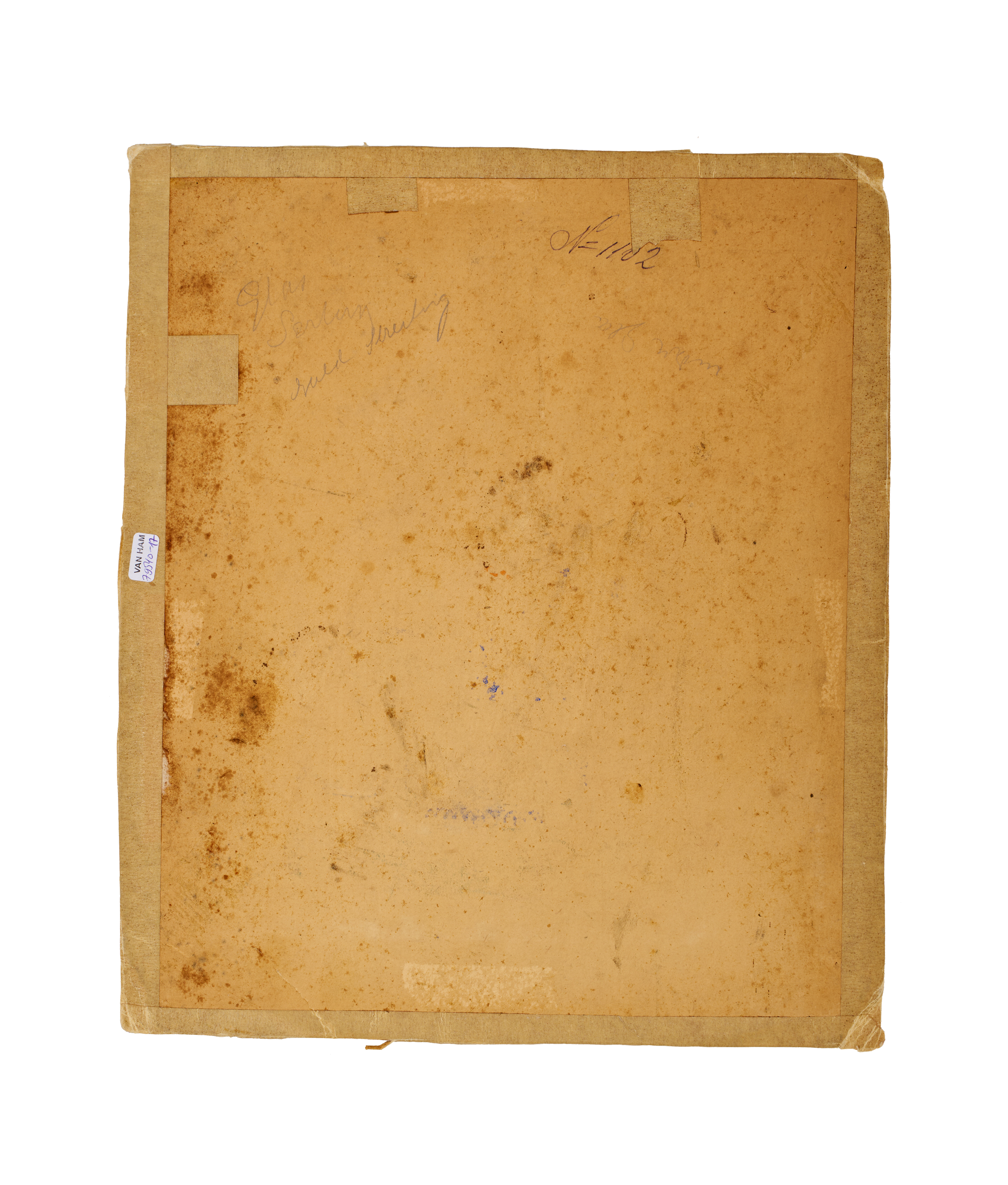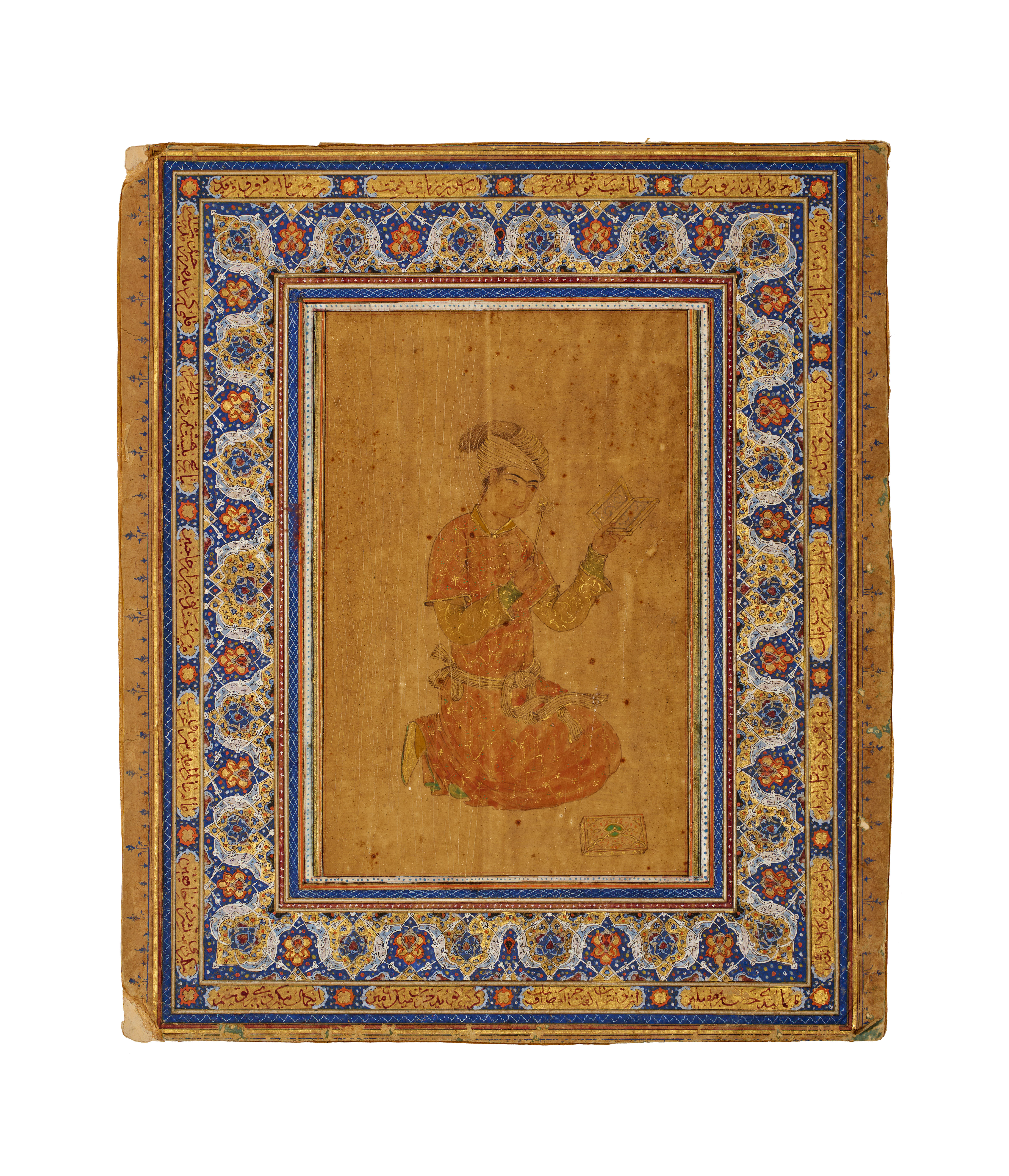This Persian miniature painting is executed in the style of Reza-i ‘Abbasi and dates to the Safavid period. The central composition depicts a kneeling male figure in a turban and a patterned orange robe holding an open book against a neutral ground. The work is enclosed within multiple decorative borders. The inner border features scrolling floral motifs in blue, white, and gold, while the wide outer border contains calligraphic panels in Nasta’liq script. These calligraphic cartouches are set against a ground of fine gold and red floral patterns. The painting is created using gouache and gold highlights on paper. The reverse of the sheet contains handwritten pencil notations, tape remnants, and a small inventory label.