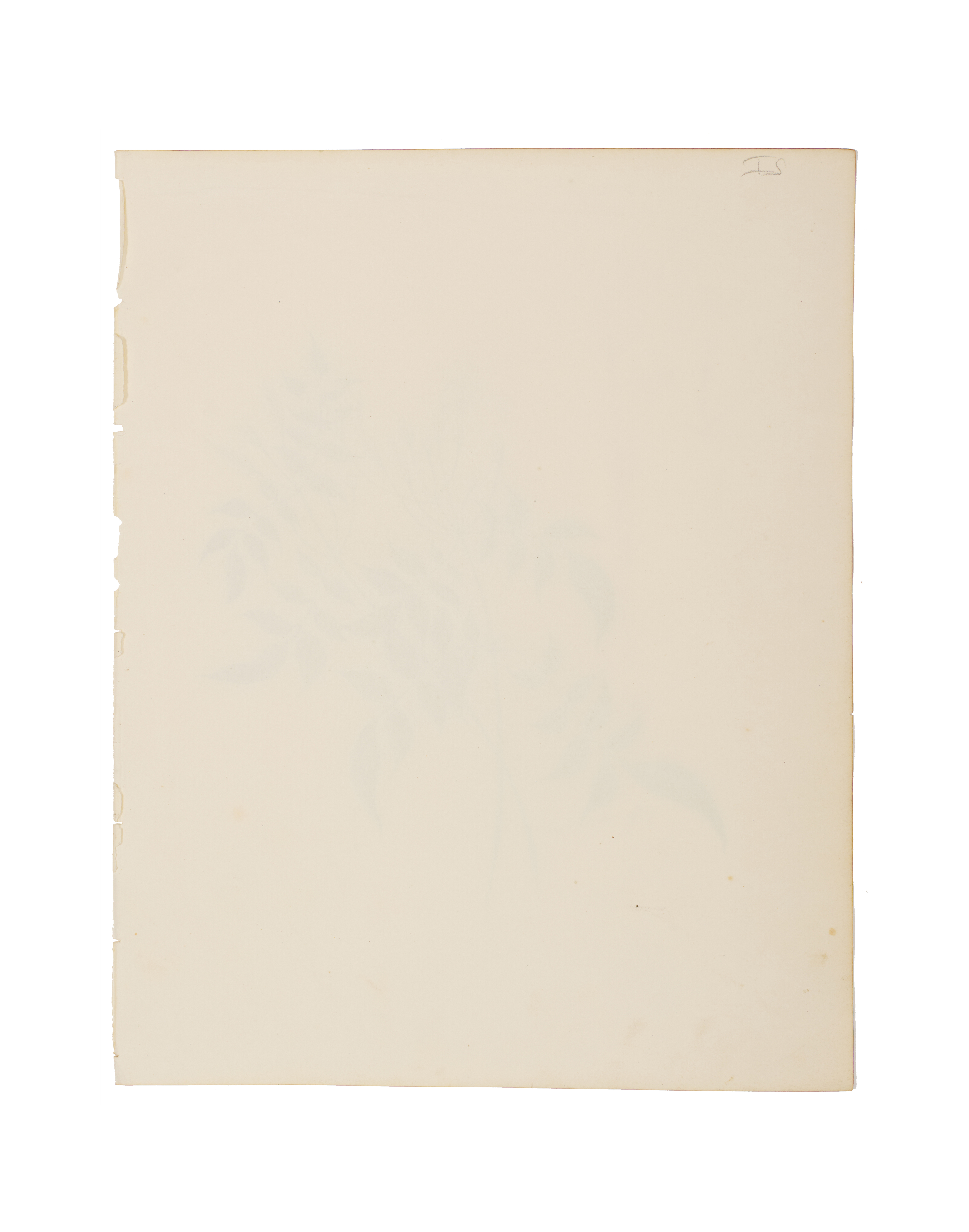 This hand-colored botanical print depicts a jasmine branch with white blossoms, elongated buds, and green pinnate leaves. Executed in a 19th-century scientific style, the work is rendered on cream-colored paper. The reverse of the sheet features a faint pencil notation reading IS in the upper right corner. The irregular left margin indicates the sheet was previously part of a bound volume.
