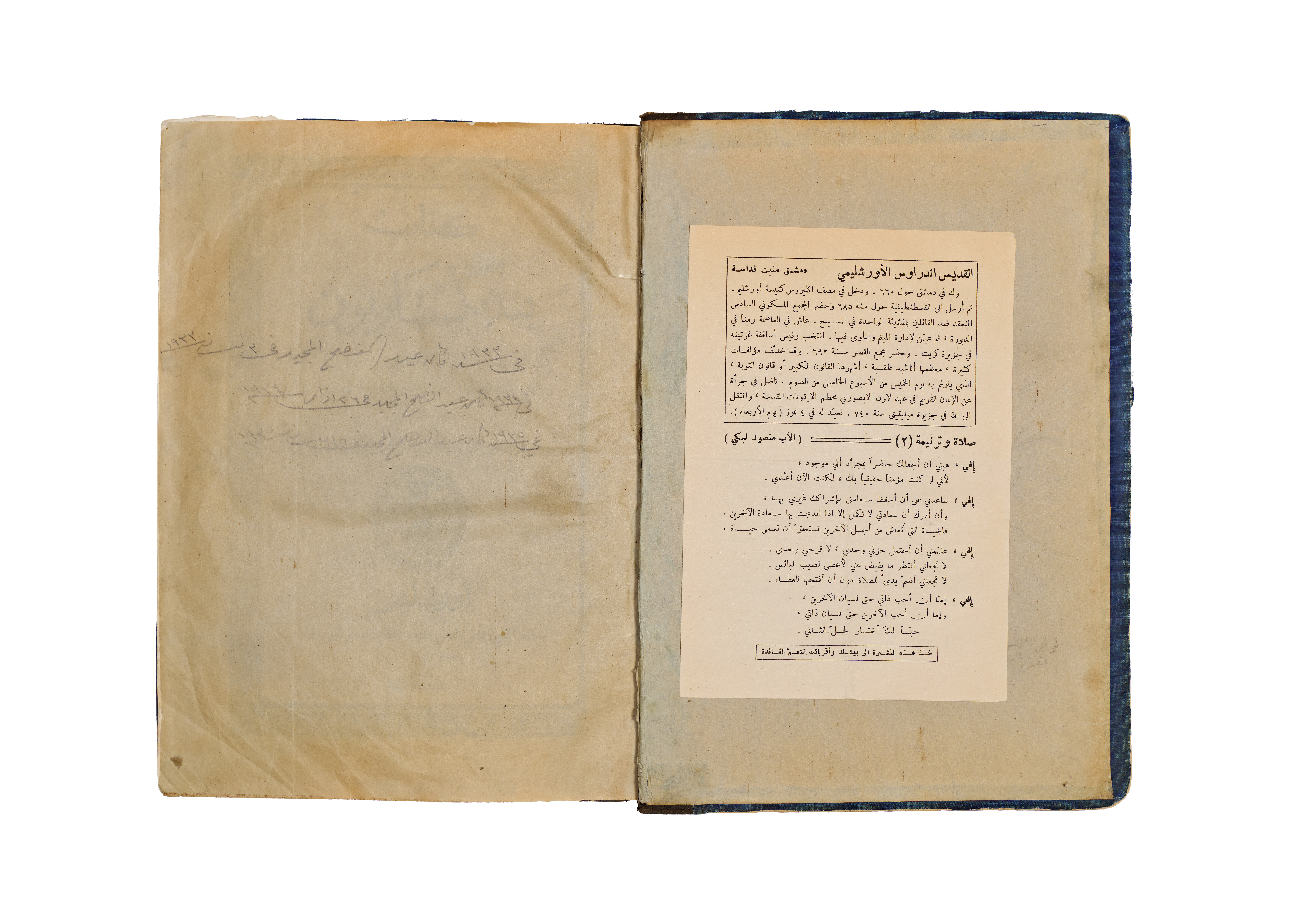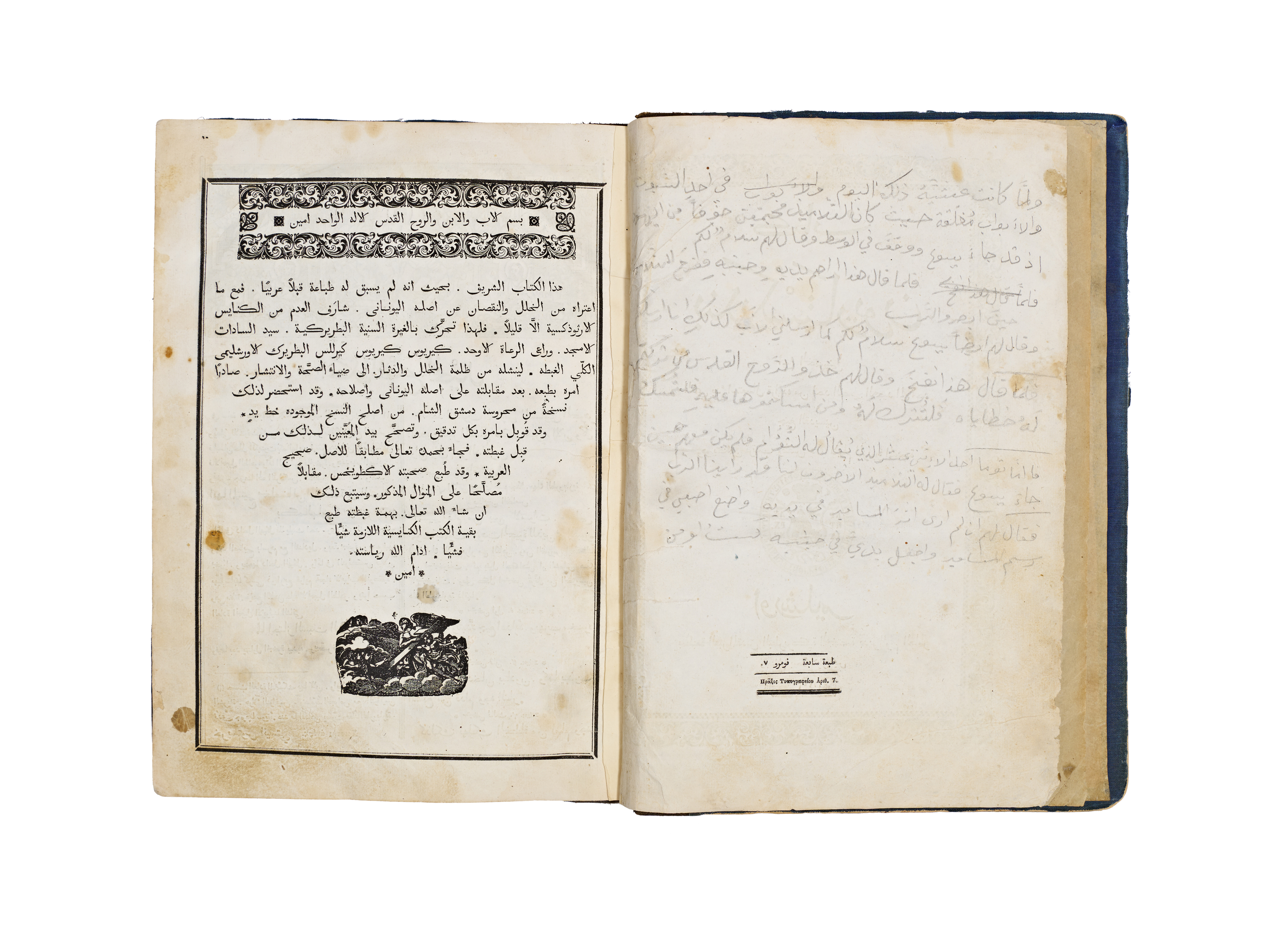 This 1852 edition of the Kitab Pentekostarion or Book of Pentekostarion is a religious liturgical text printed in Arabic at the Greek Orthodox Patriarchate press in Jerusalem. The volume is half-bound in dark leather over paper-covered boards. The interior features printed Arabic text organized for daily services between Easter and Pentecost. Decorative elements include headers and a woodcut illustration depicting the Resurrection. Several pages contain contemporary handwritten annotations in ink. A printed biographical slip concerning Saint Andrew of Jerusalem is tipped into the rear endpaper. The title page includes a decorative border and the press insignia.
