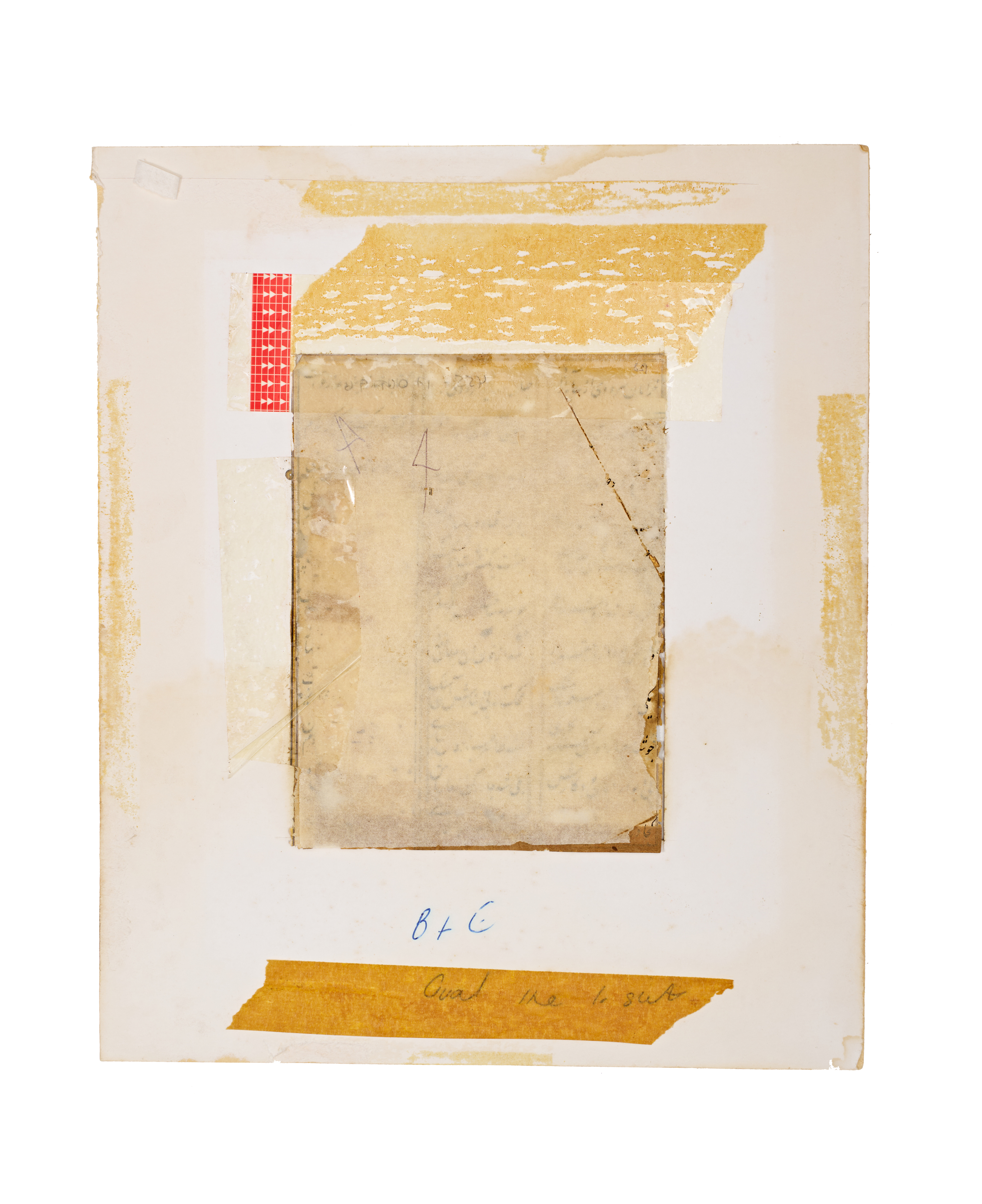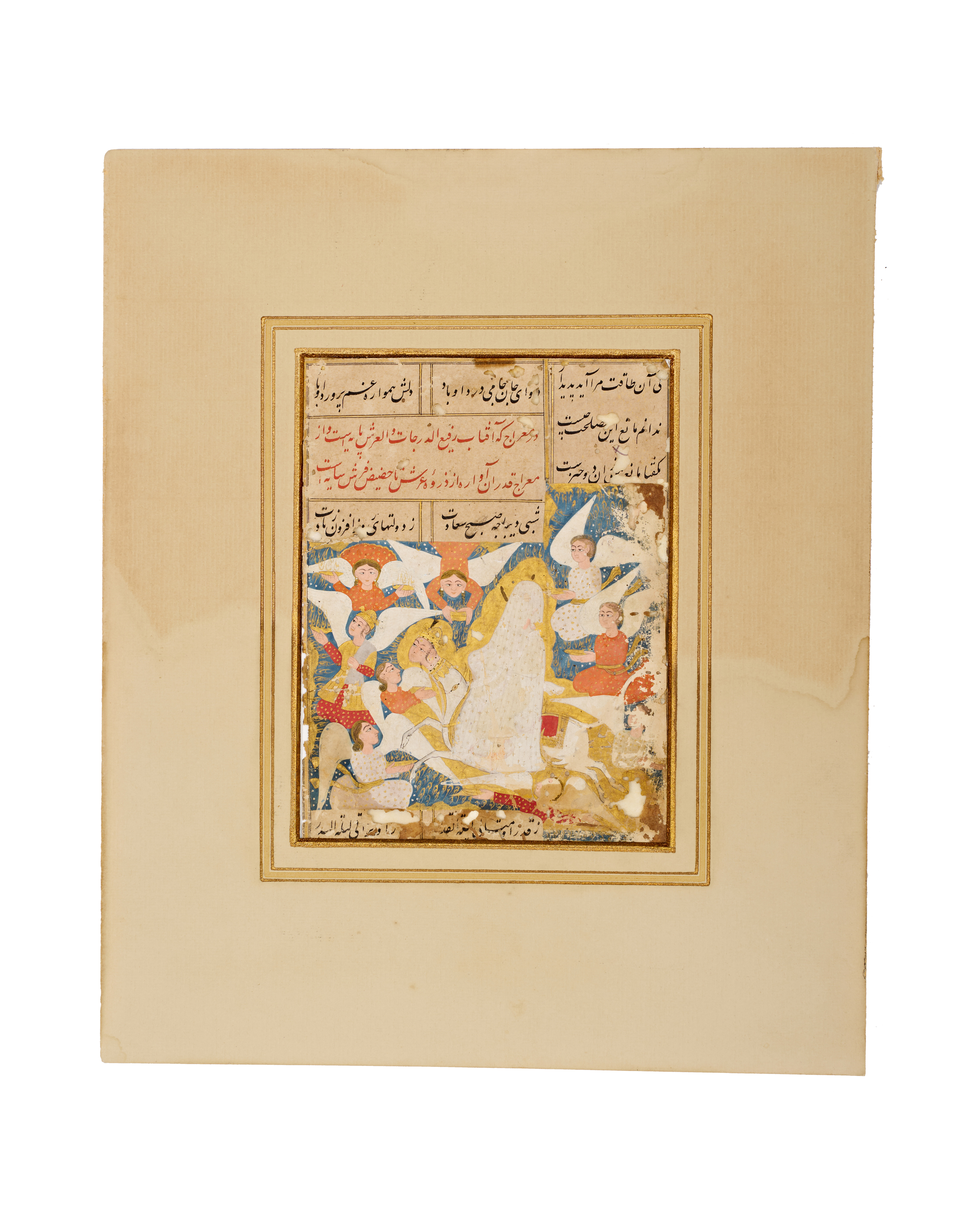 This Indian miniature painting, an illuminated manuscript leaf, depicts the Mi’raj, or the Night Journey of the Prophet Muhammad. The central figure is depicted veiled and riding the mythical steed Buraq, accompanied by several angels against a celestial background. The composition includes four columns of Persian Nasta’liq script positioned above the illustration and a single line of script below, executed in black and red ink with gold highlighting. The work is rendered in gouache and gold on paper and is mounted within a larger buff-colored card border. The reverse of the leaf is visible through a translucent backing, showing additional script, adhesive tape repairs, residue, and modern handwritten notations.