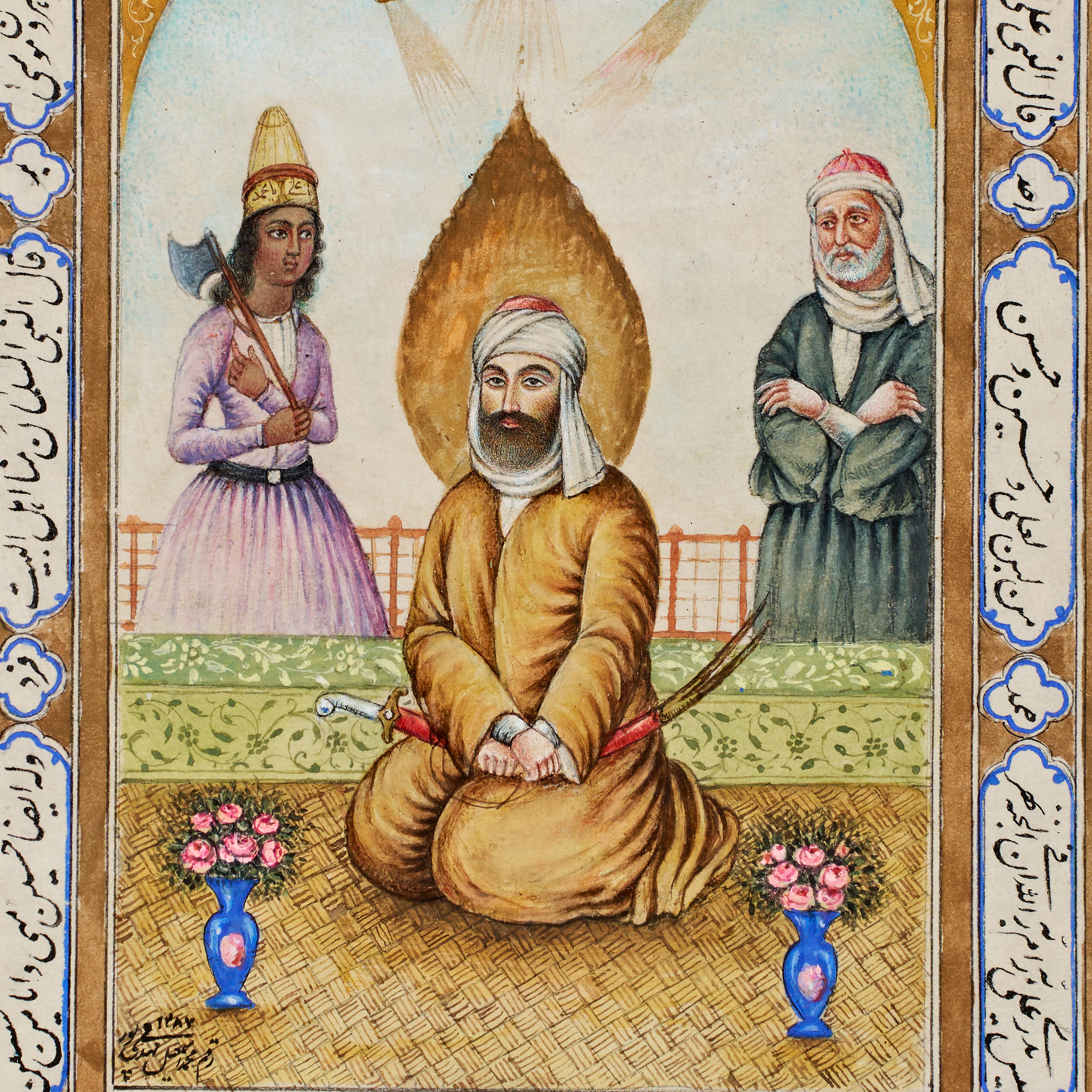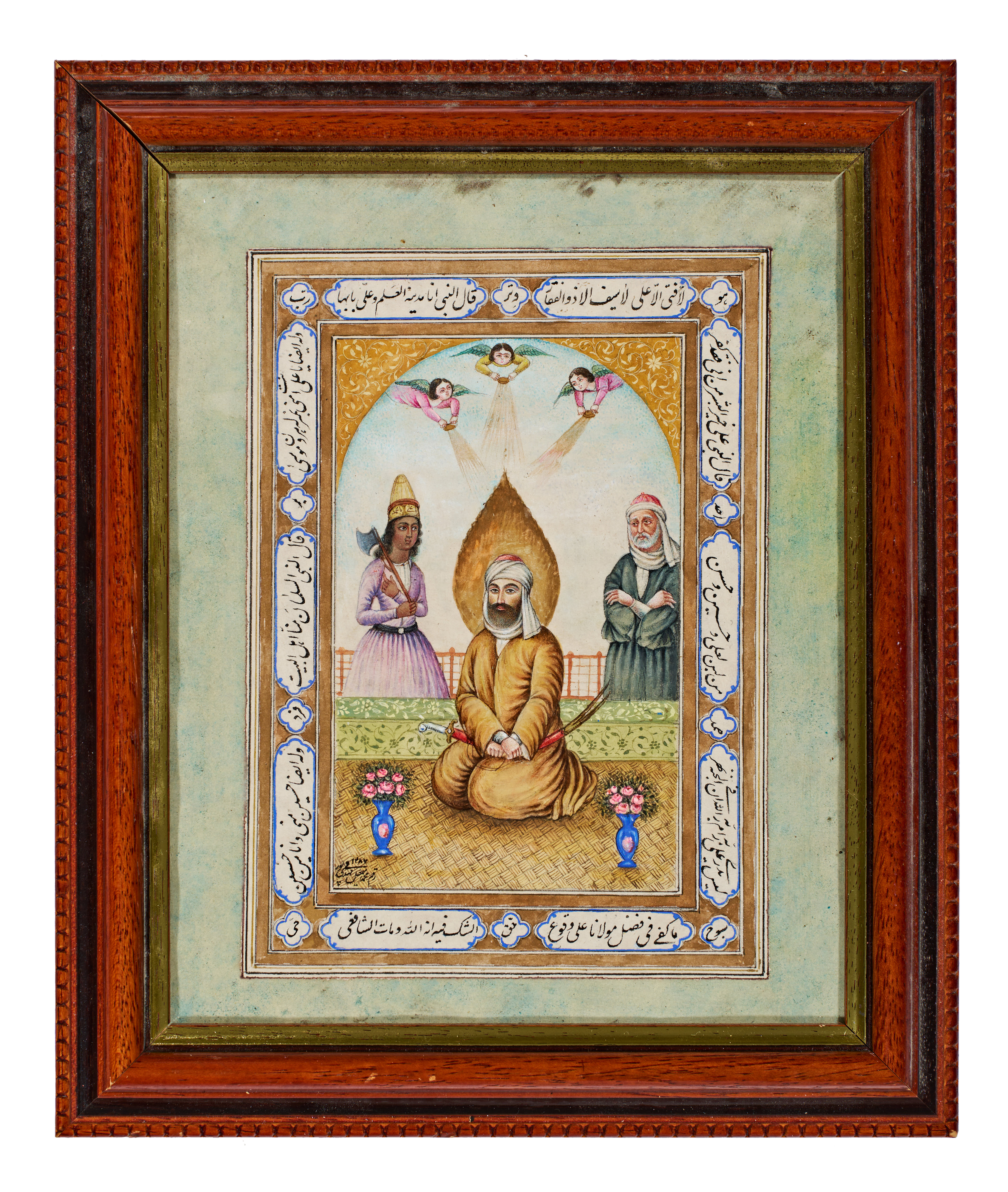 This Qajar-period Persian miniature painting, dated 1282 AH (circa 1865 AD), depicts a central figure, identified as Imam Ali, seated in a devotional posture with a golden mandorla. The central figure is flanked by a dervish wearing a tall hat and holding a ceremonial battle-axe known as a tabarzin, and an elderly bearded man in traditional robes. Three angels are positioned in the upper section of the painting. The foreground includes two blue vases with pink floral arrangements. The composition is bordered by calligraphic panels containing religious inscriptions in Naskh script, including the phrase La fata illa Ali. The work is signed and dated in the lower-left corner of the inner frame. The painting is housed in a multi-tiered wooden frame with a light green mat.