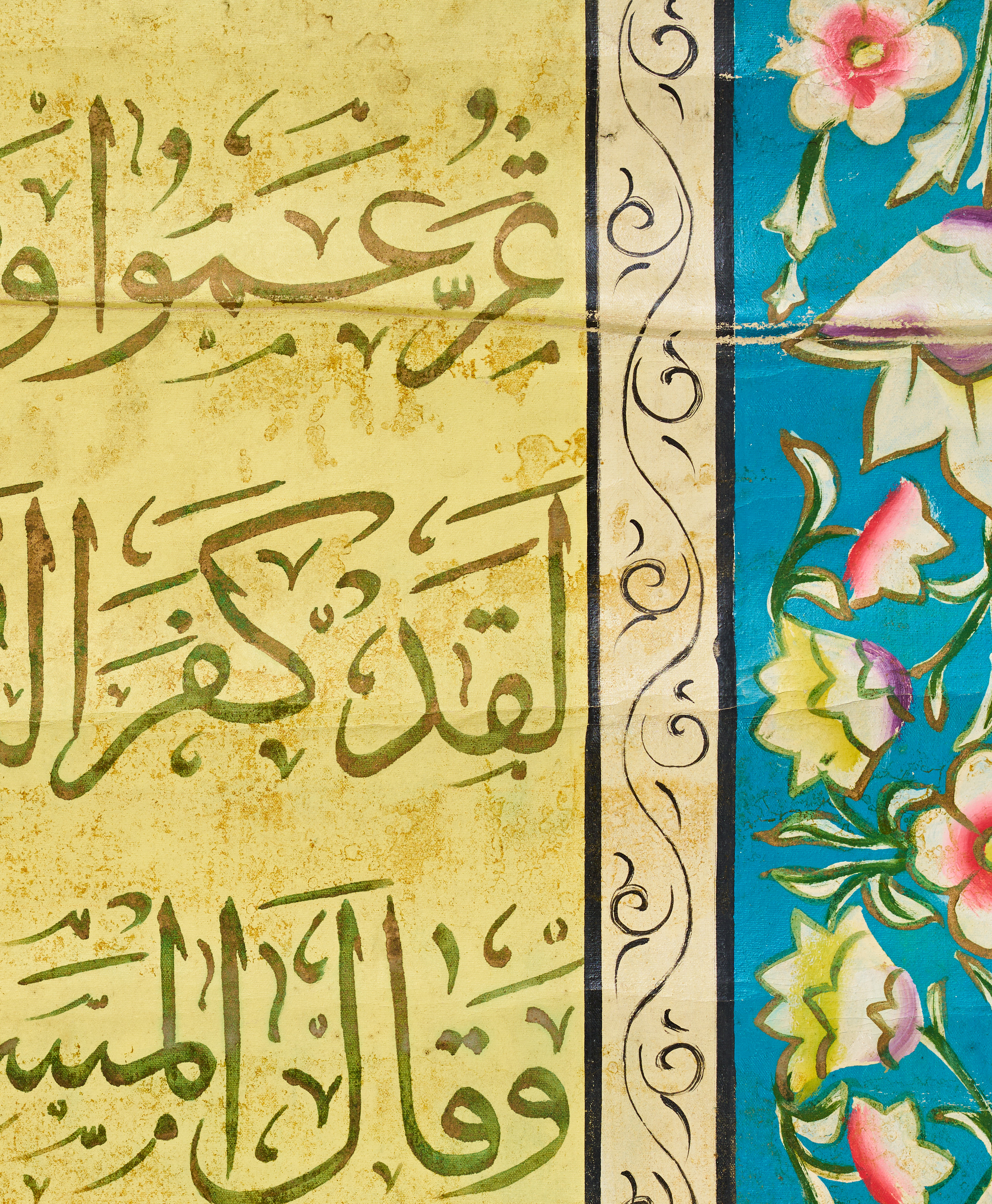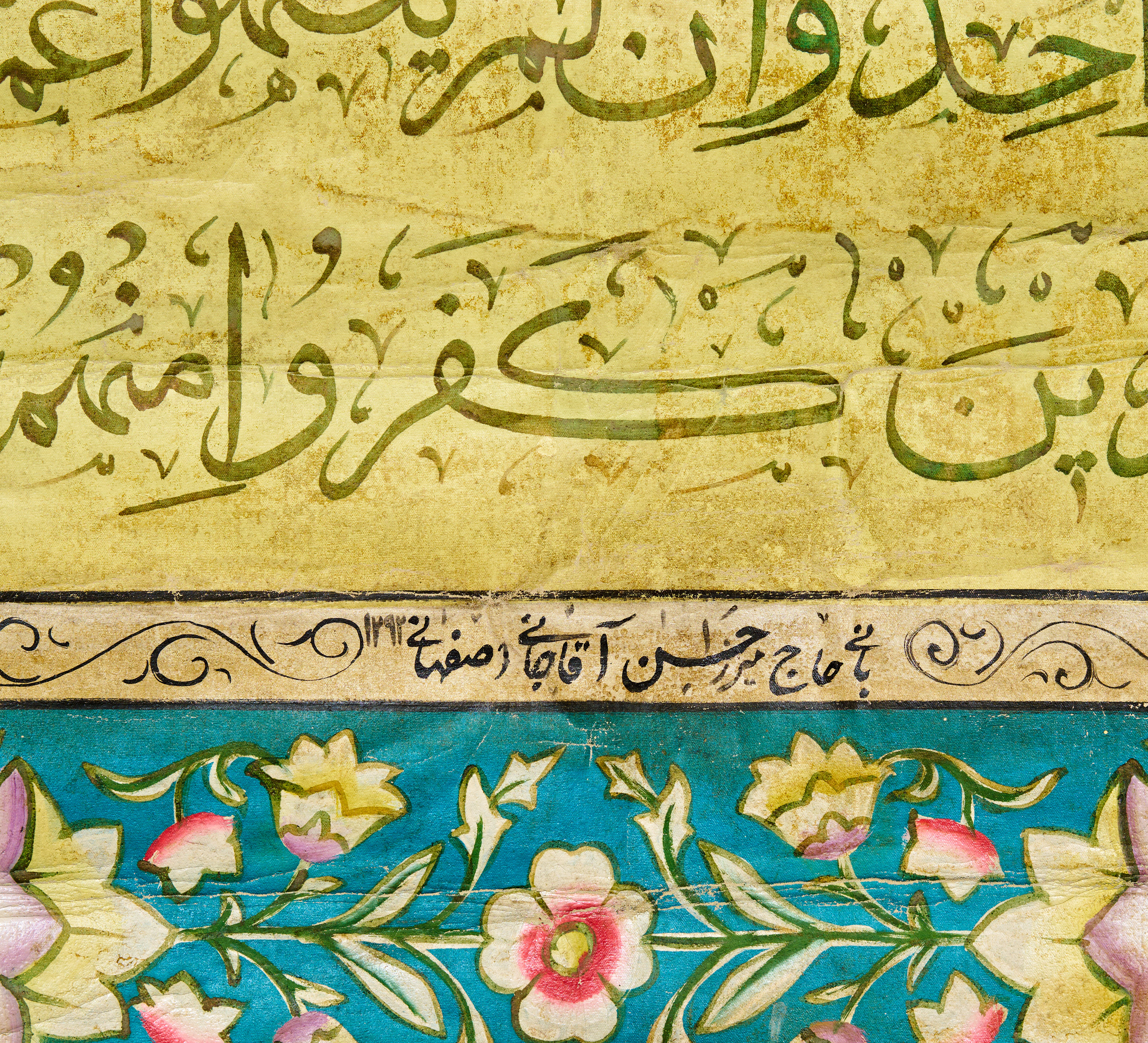 Richly illuminated with floral borders and bold script, commissioned by Haj Hassan Agha Khan.