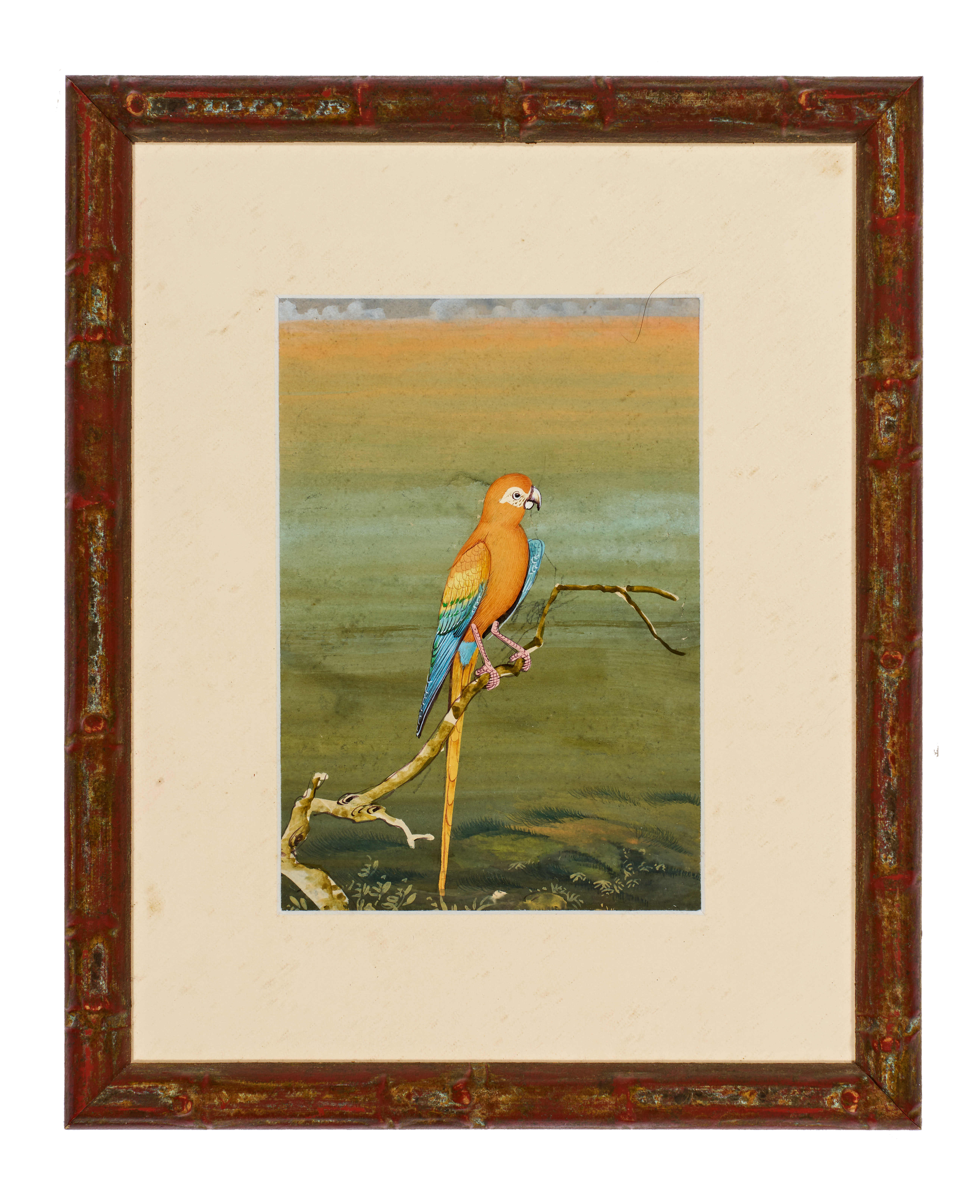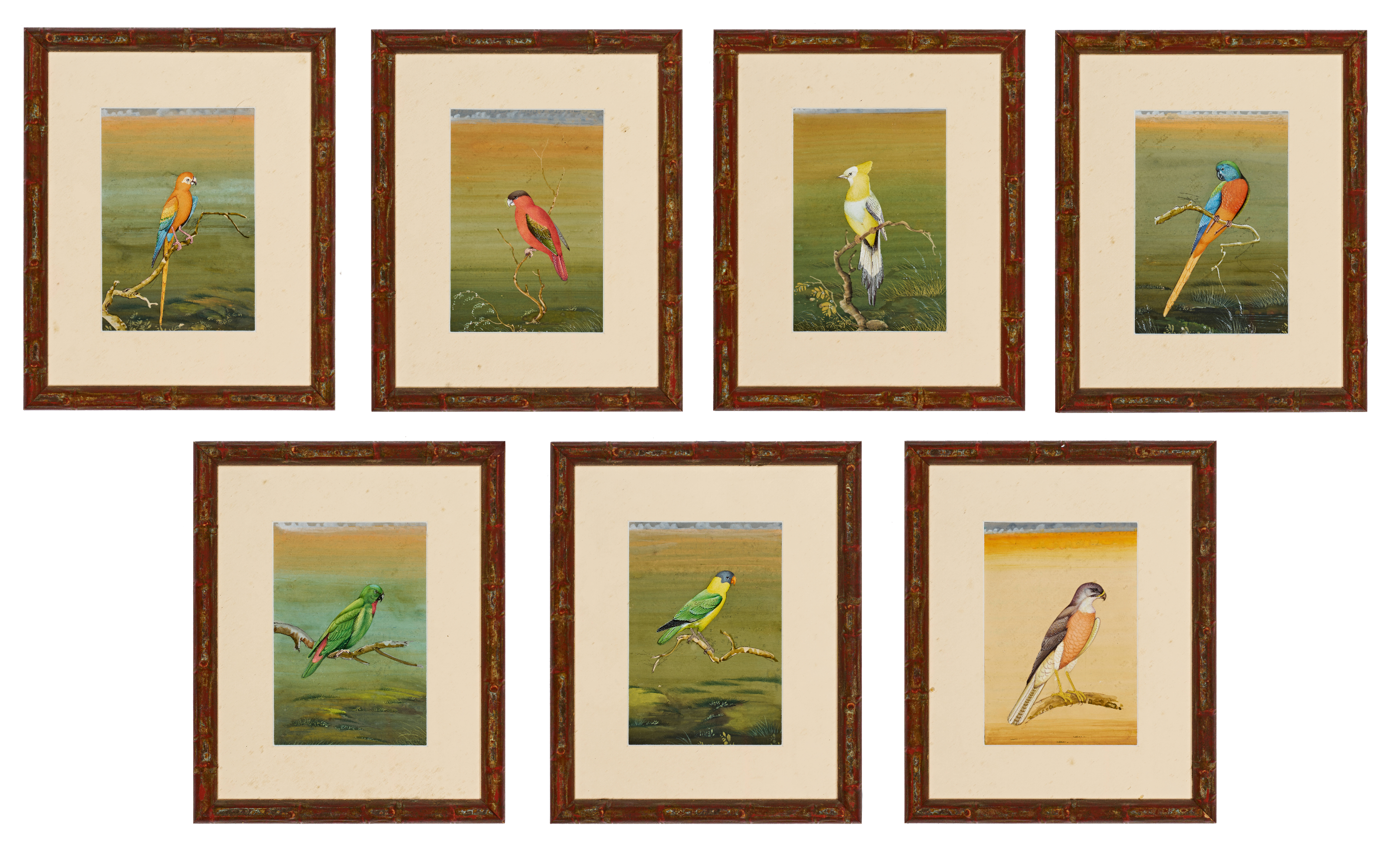 A collection of framed natural history bird illustrations executed in gouache or watercolor on paper. The works depict various avian species, including multiple parrots, a crested songbird, and a bird of prey, each perched upon stylized branches. The illustrations are rendered in a detailed, naturalistic style consistent with 19th-century ornithological studies. Each piece is uniformly housed in a reddish-brown faux-bamboo frame with an off-white mat.
