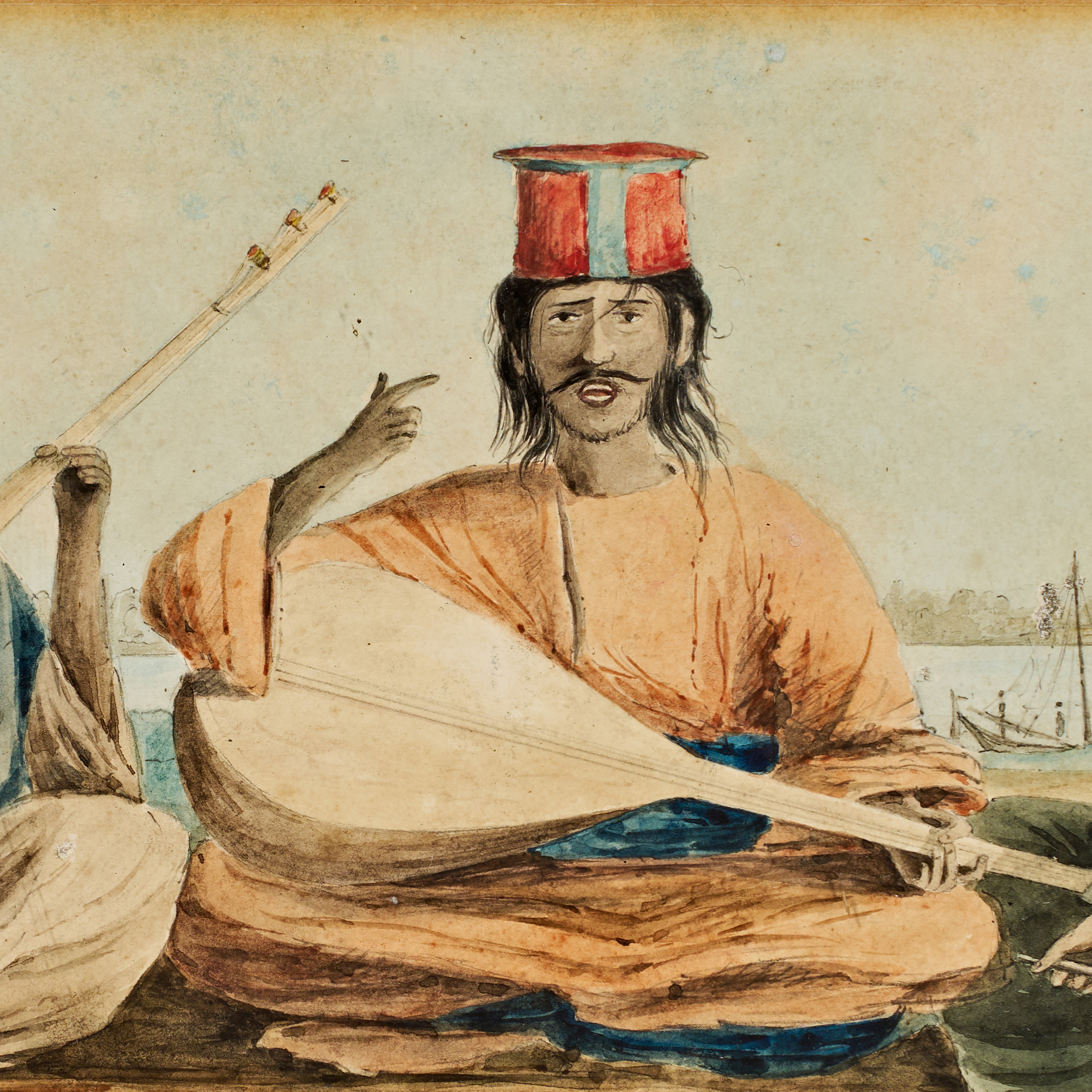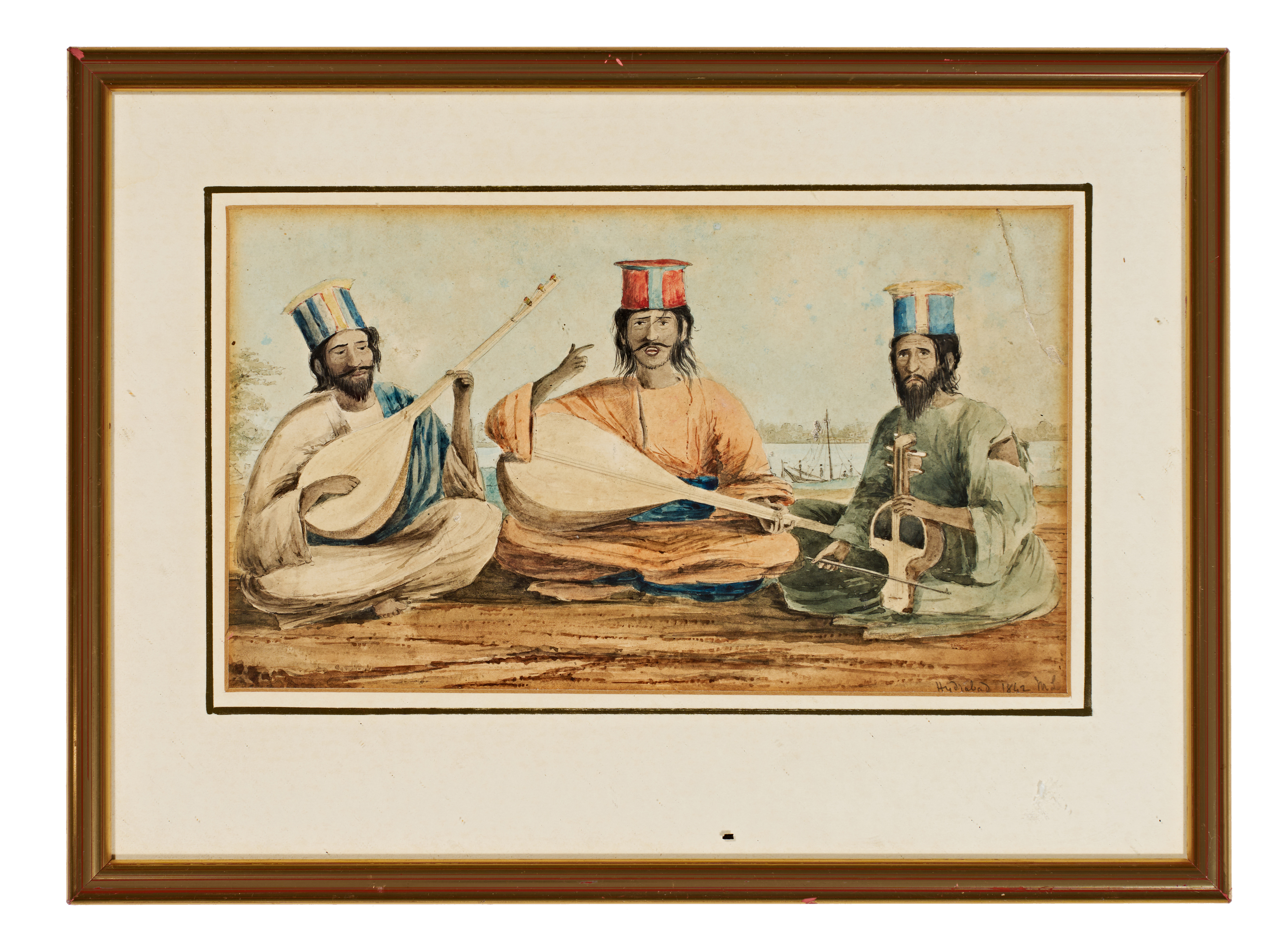 This framed watercolor on paper depicts a trio of musicians seated outdoors. The figures are dressed in traditional regional attire, including long tunics and distinctive tall, striped, cylindrical hats. Two of the musicians are shown playing long-necked stringed instruments, while the third figure holds a bowed instrument. The background features a body of water with a small sailing vessel. The work is executed in a style characteristic of 19th-century South Asian painting. The lower right corner bears the inscription Hyderabad and the date 1842. The piece is housed in a modern gilt-edged frame with a multi-layered mat.