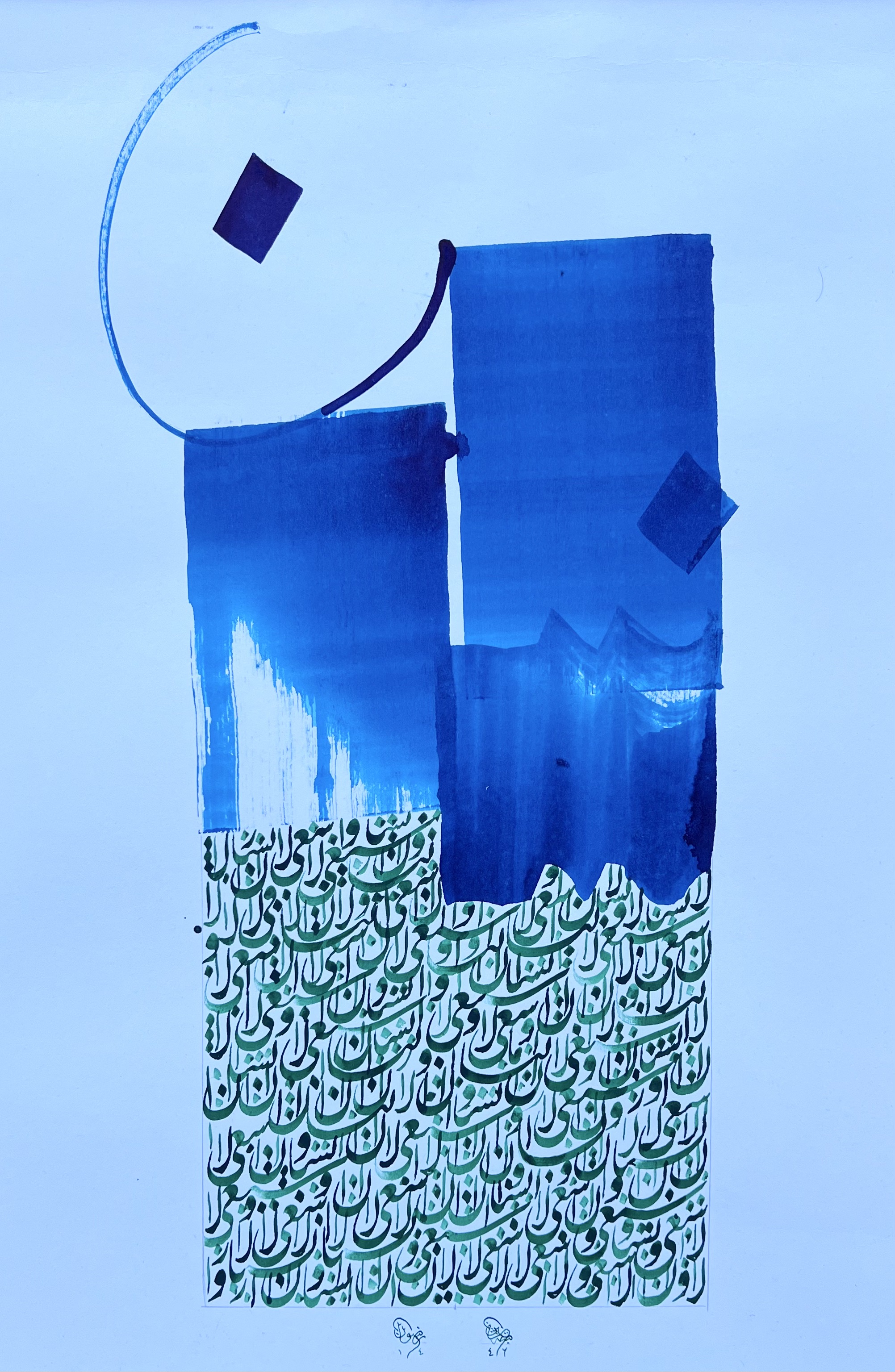 The style of calligraphy uses movement to represent the fast-flowing nature of the struggle humans go through. The inks are made from crushing Lapis Lazuli to make the blue ink and Emeralds to produce the green ink.