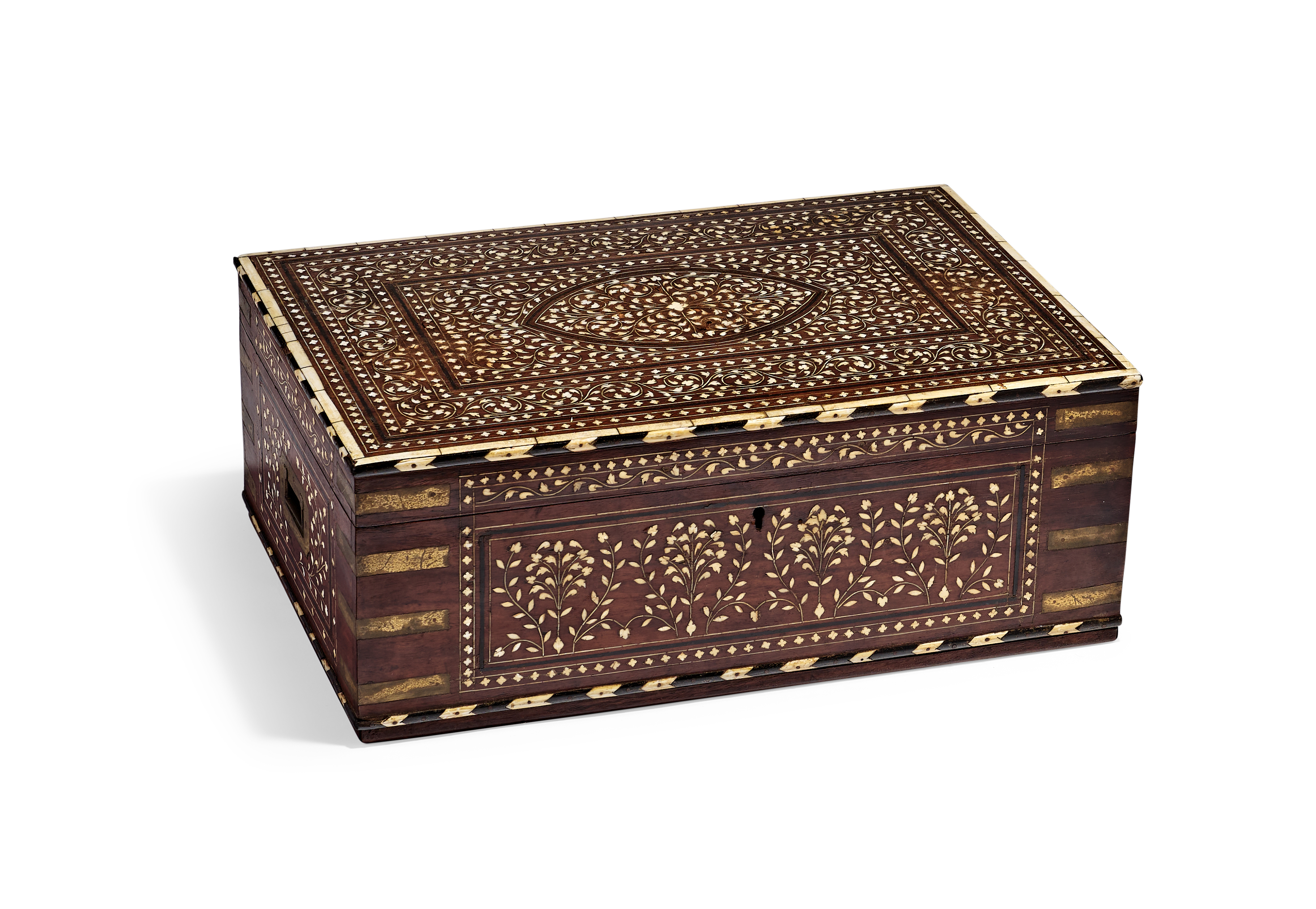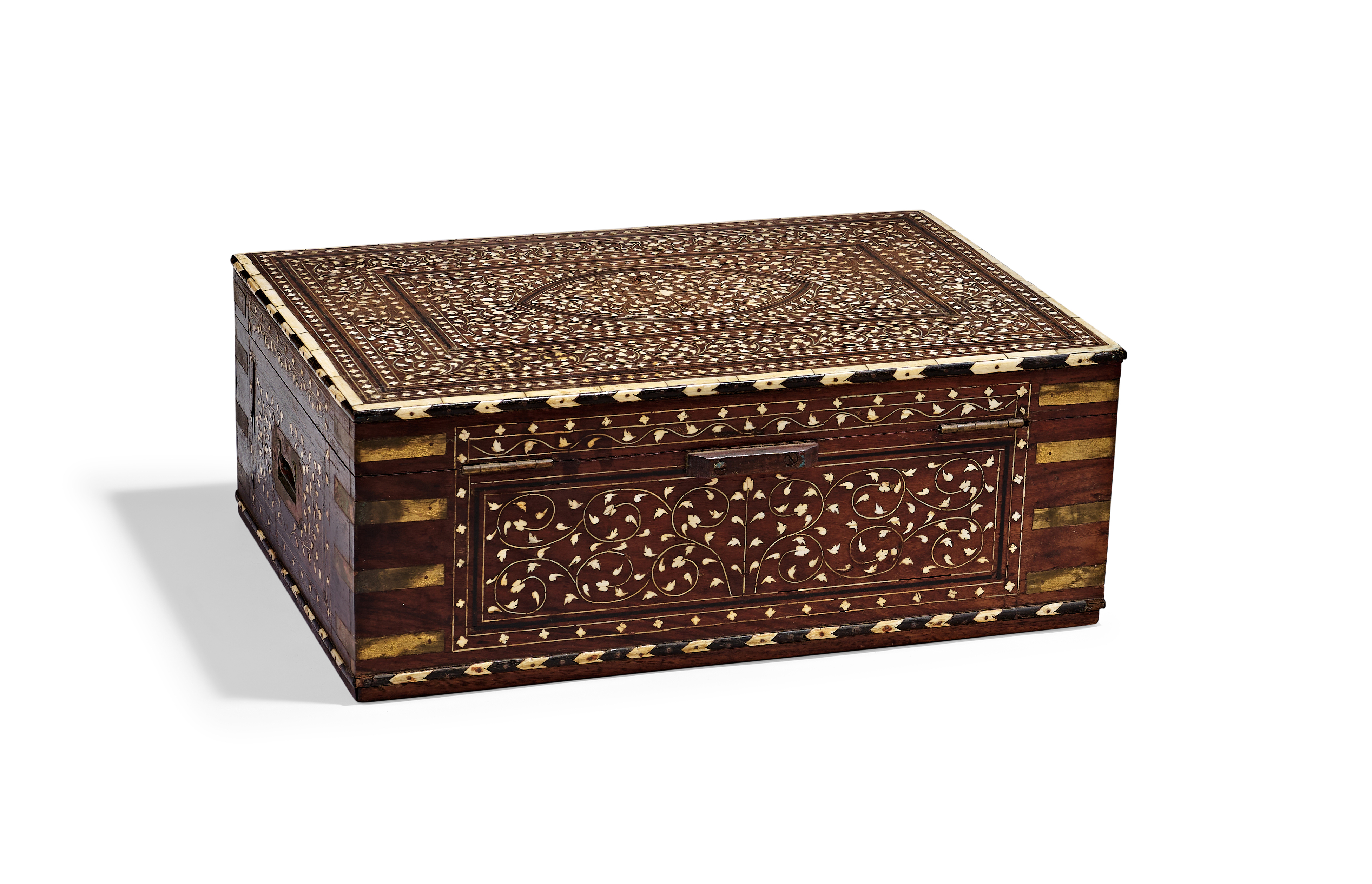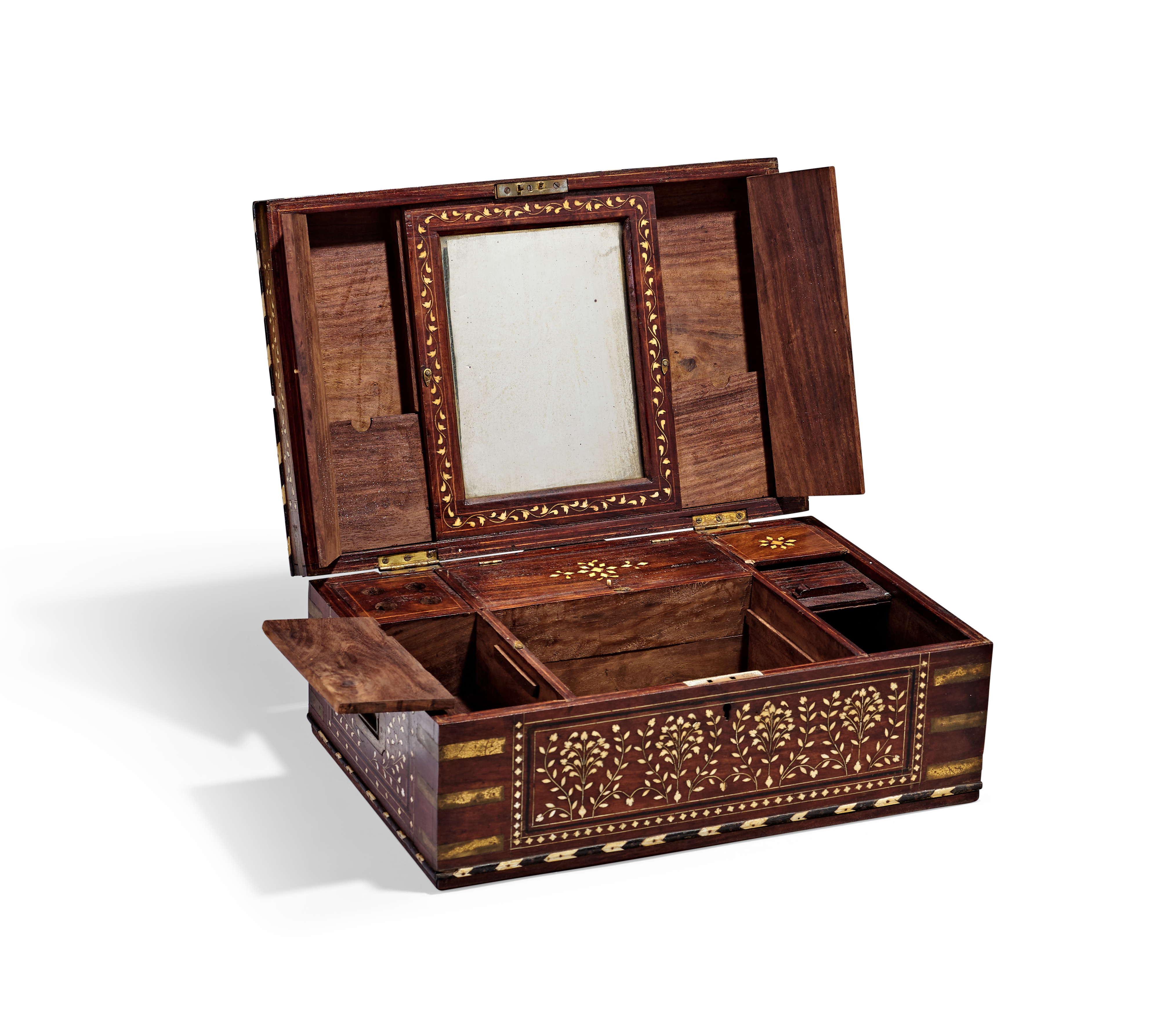 AN ANGLO-INDIAN BRASS-BOUND IVORY-INLAID HARDWOOD DRESSING BOX, 19TH CENTURY