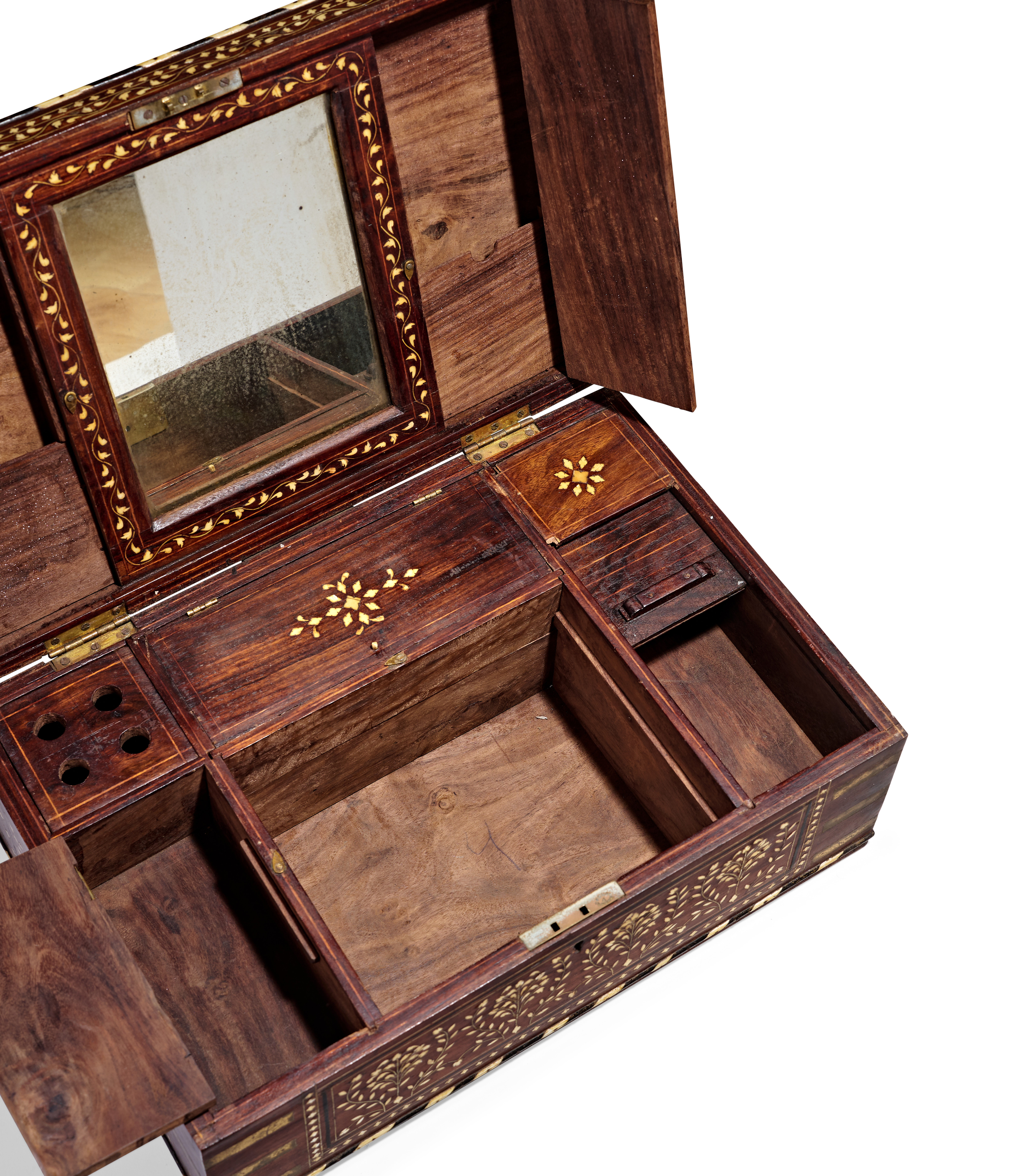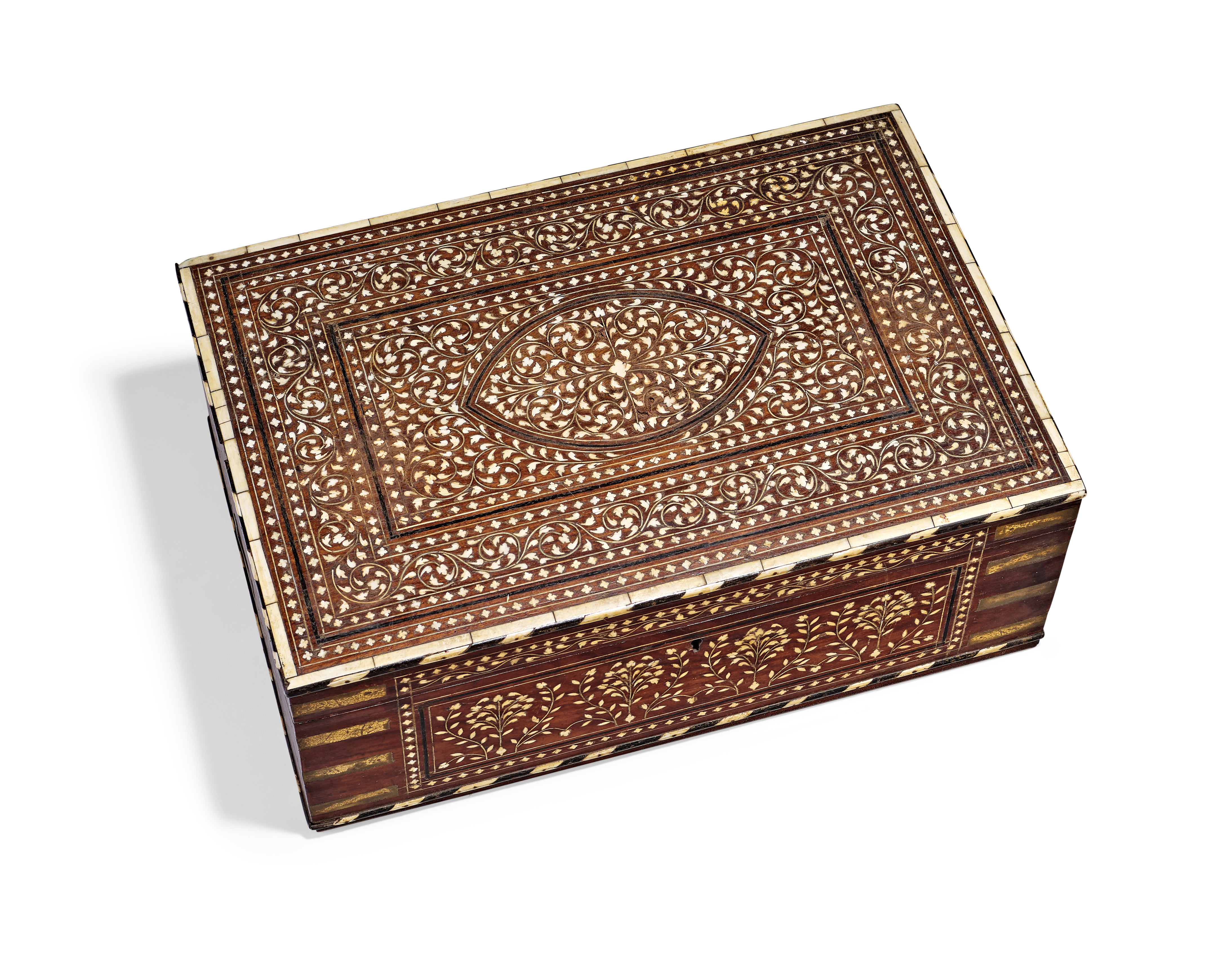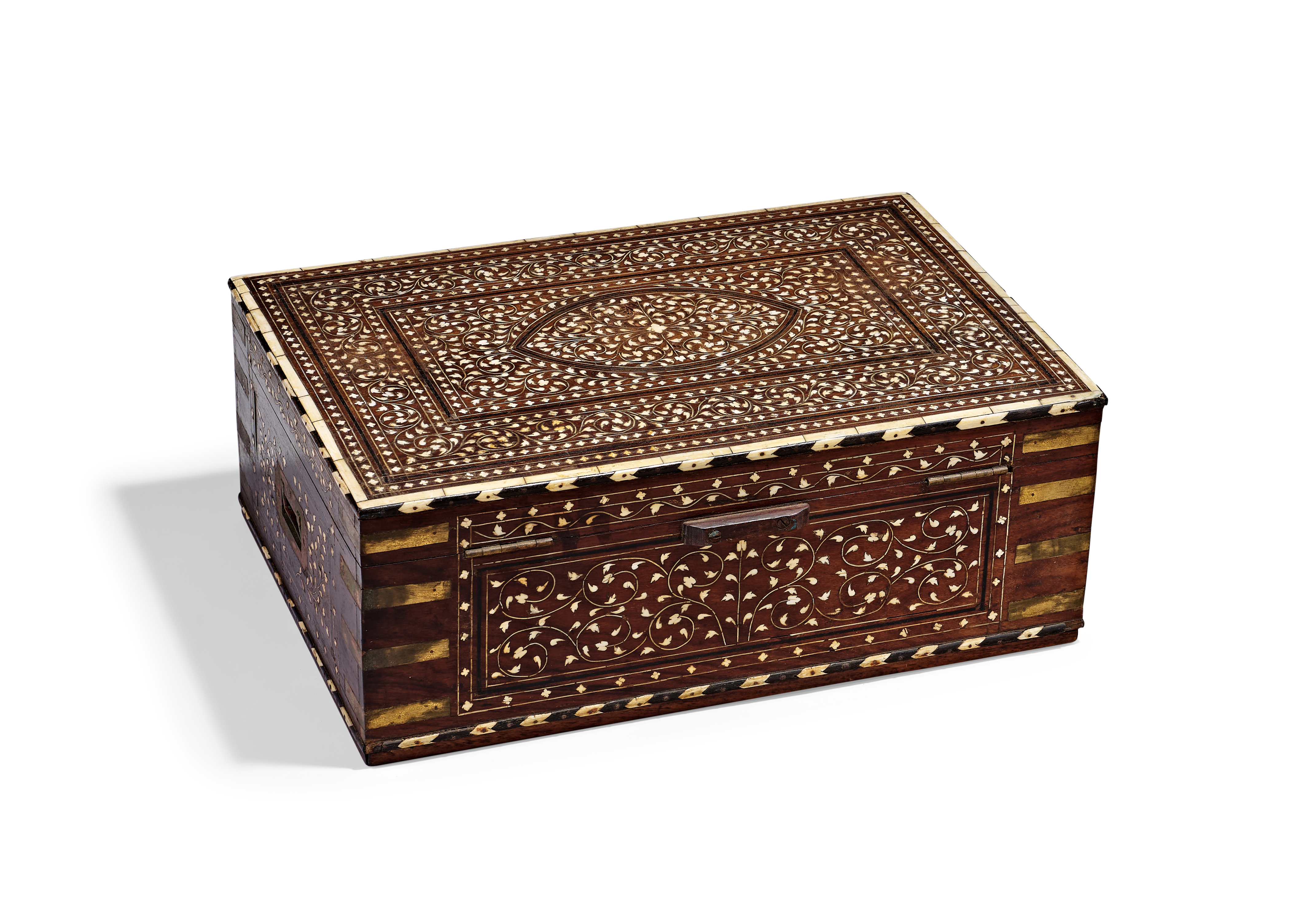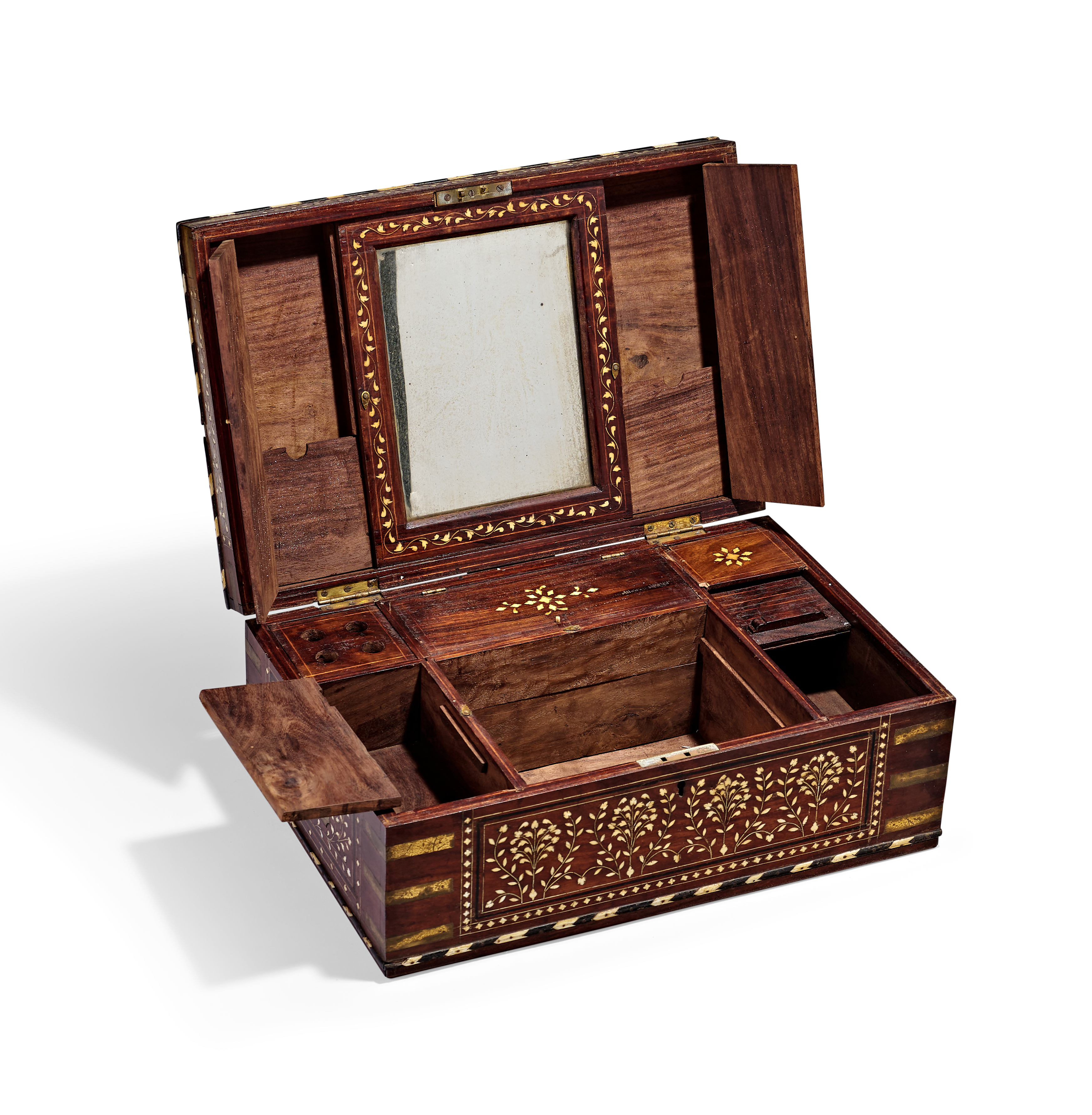 AN ANGLO-INDIAN BRASS-BOUND IVORY-INLAID HARDWOOD DRESSING BOX, 19TH CENTURY