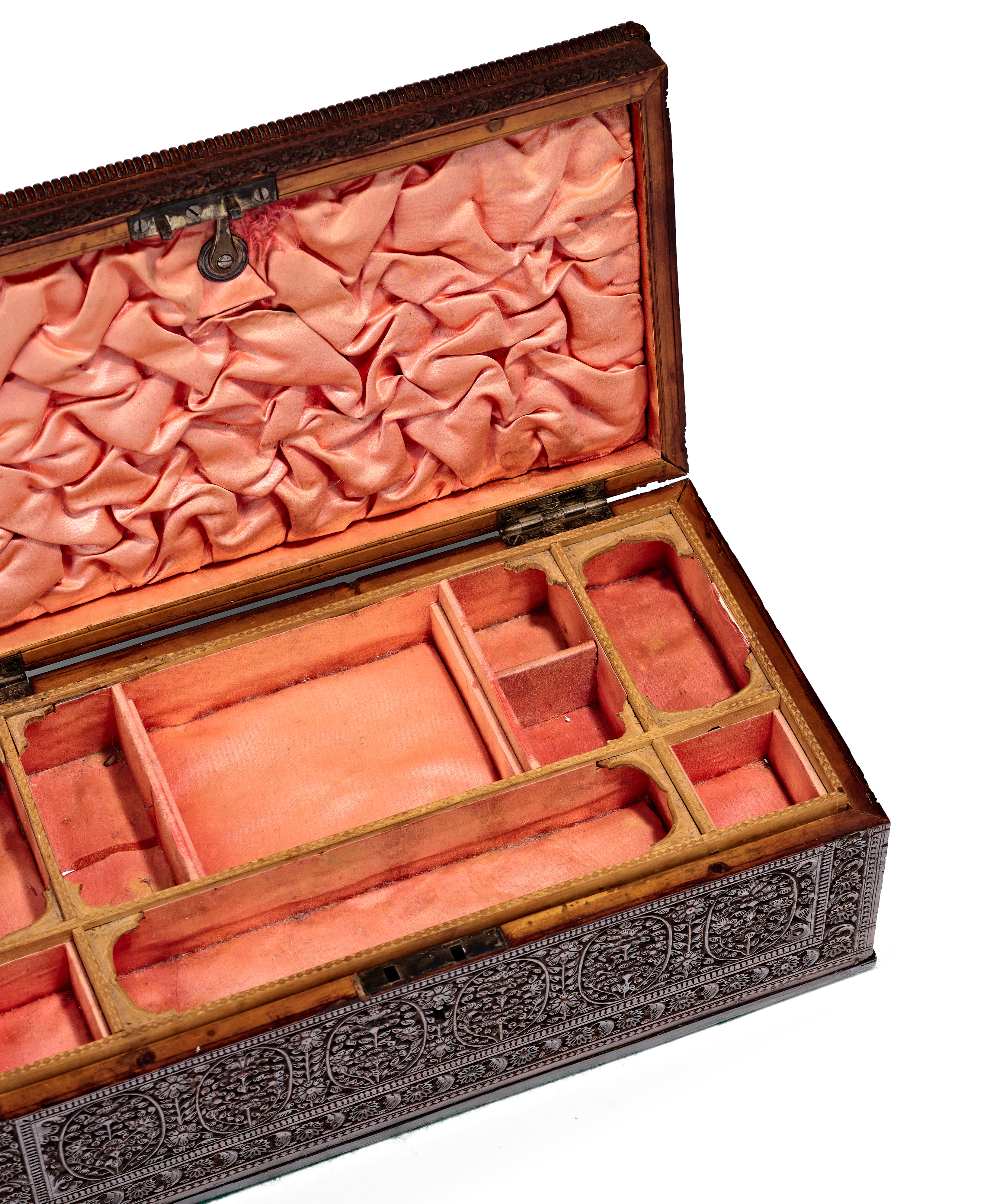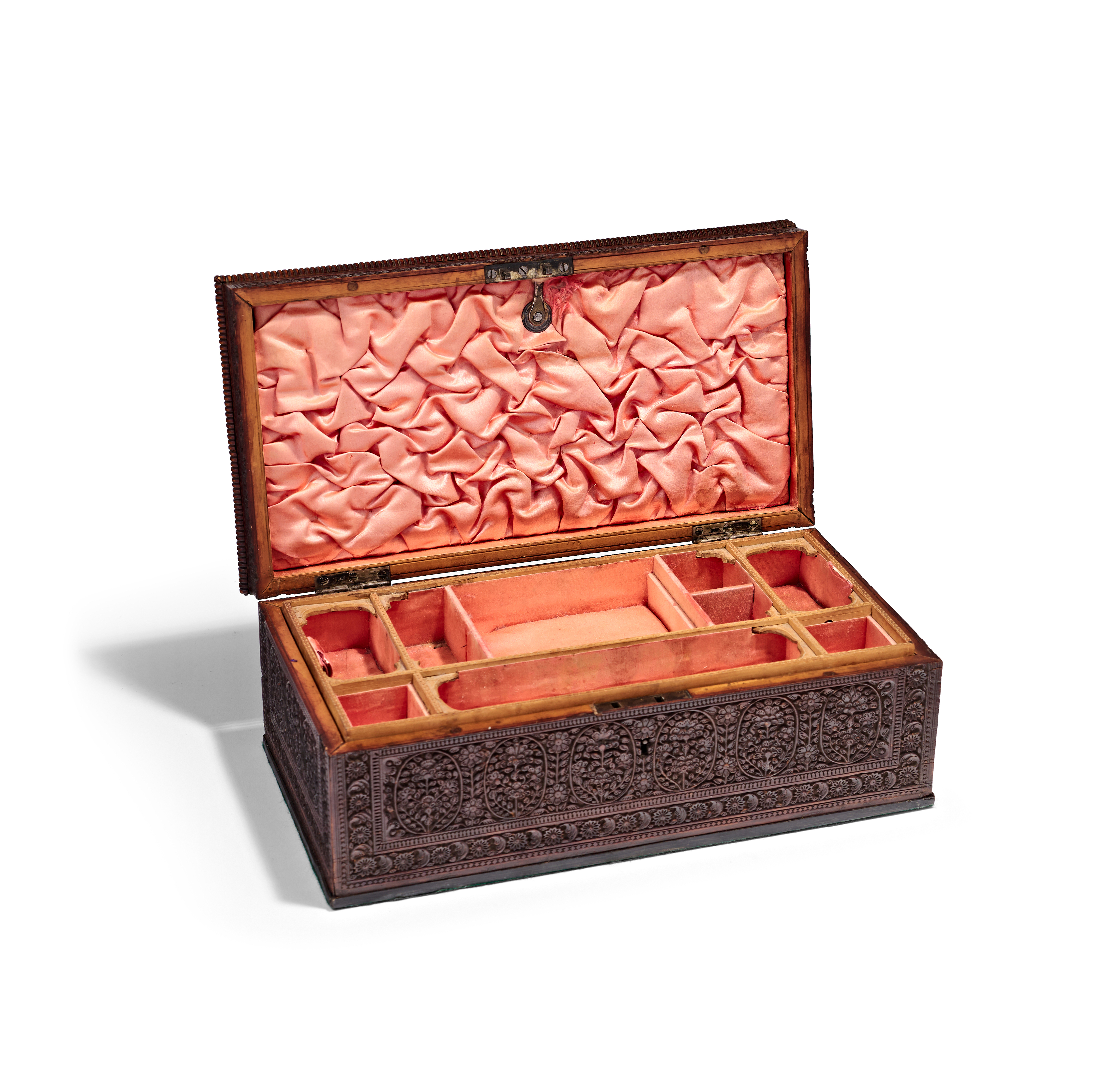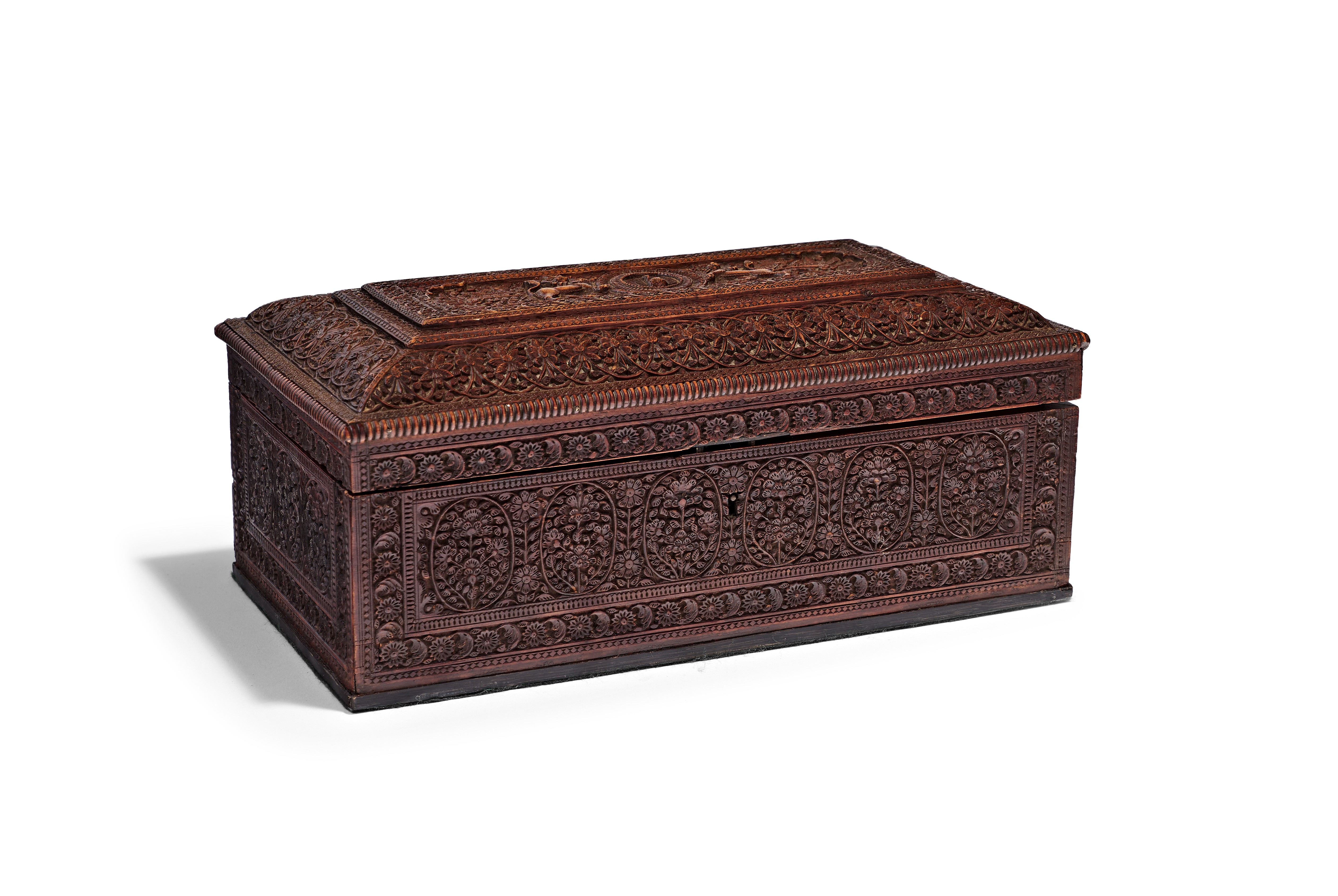 AN ANGLO-INDIAN CARVED SANDALWOOD JEWELLERY BOX, PROBABLY MYSORE, 19TH CENTURY