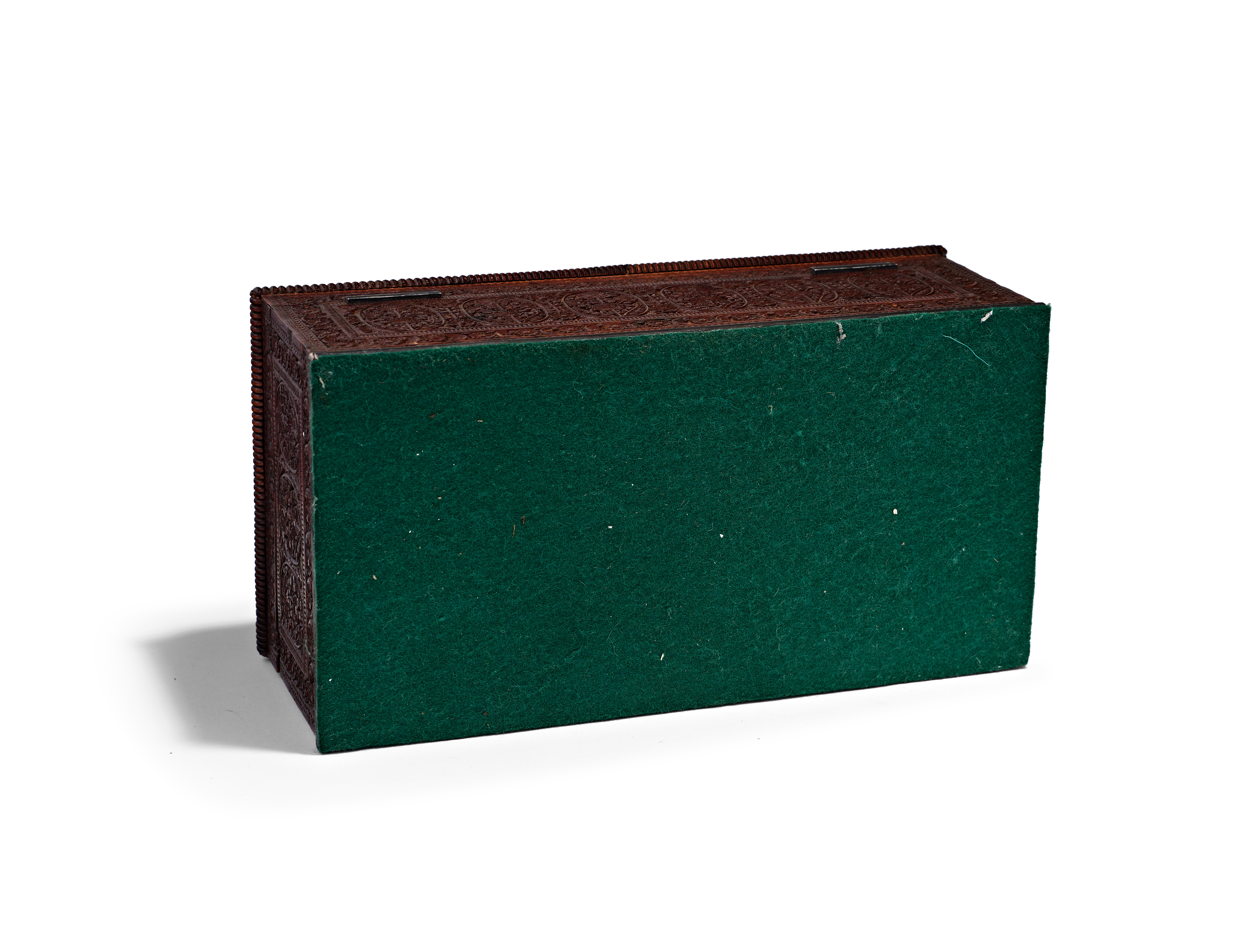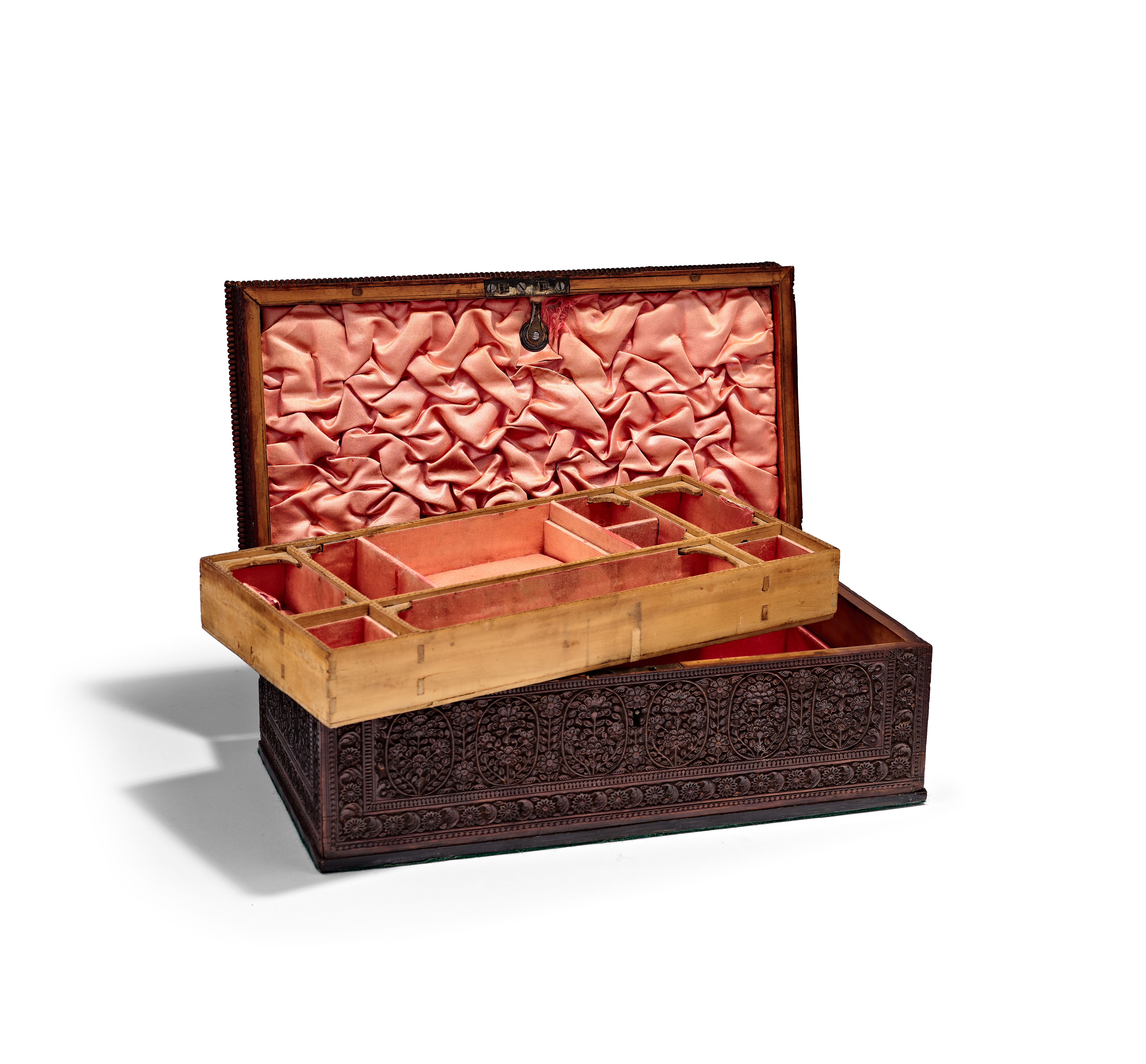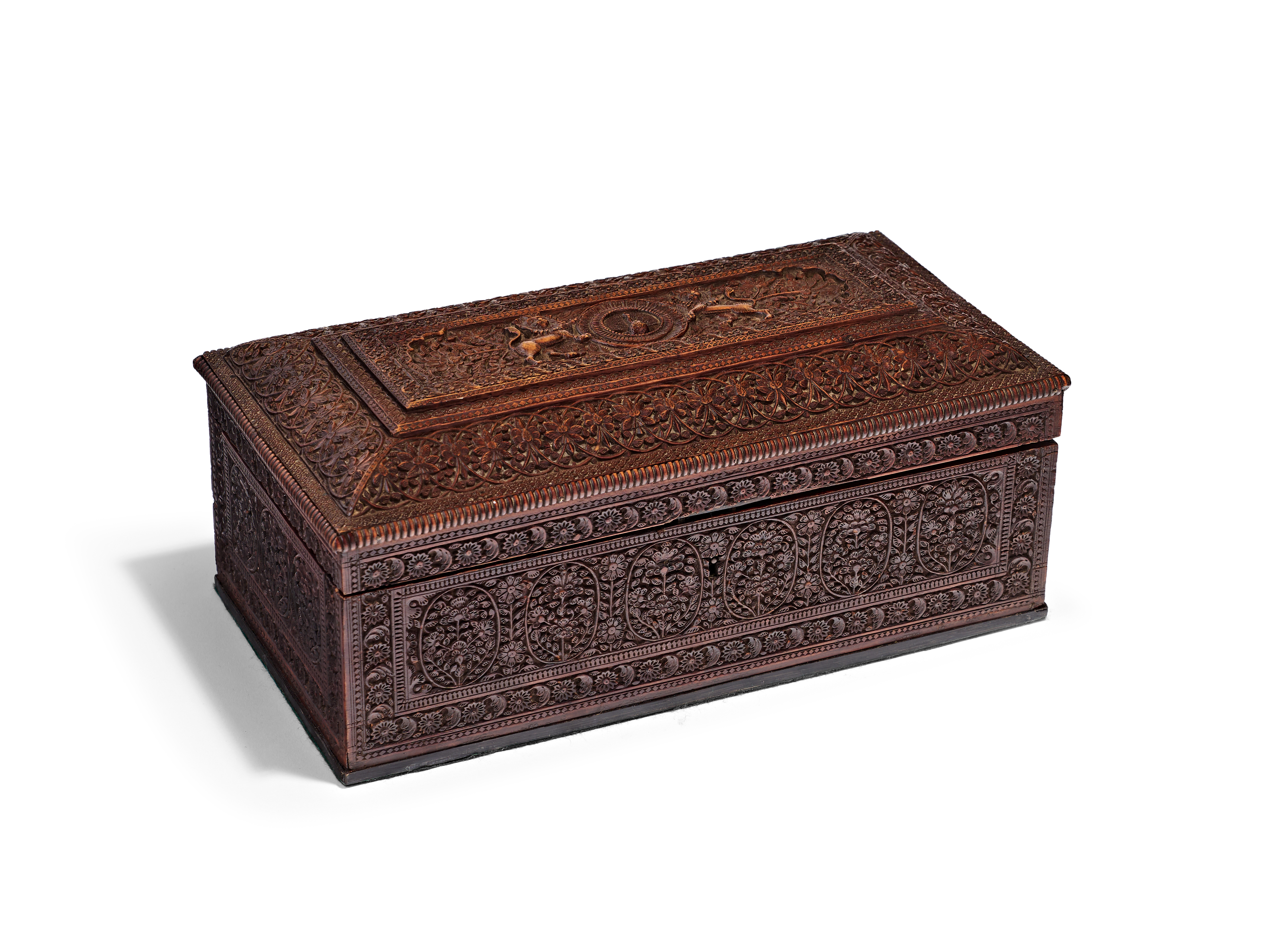 AN ANGLO-INDIAN CARVED SANDALWOOD JEWELLERY BOX, PROBABLY MYSORE, 19TH CENTURY