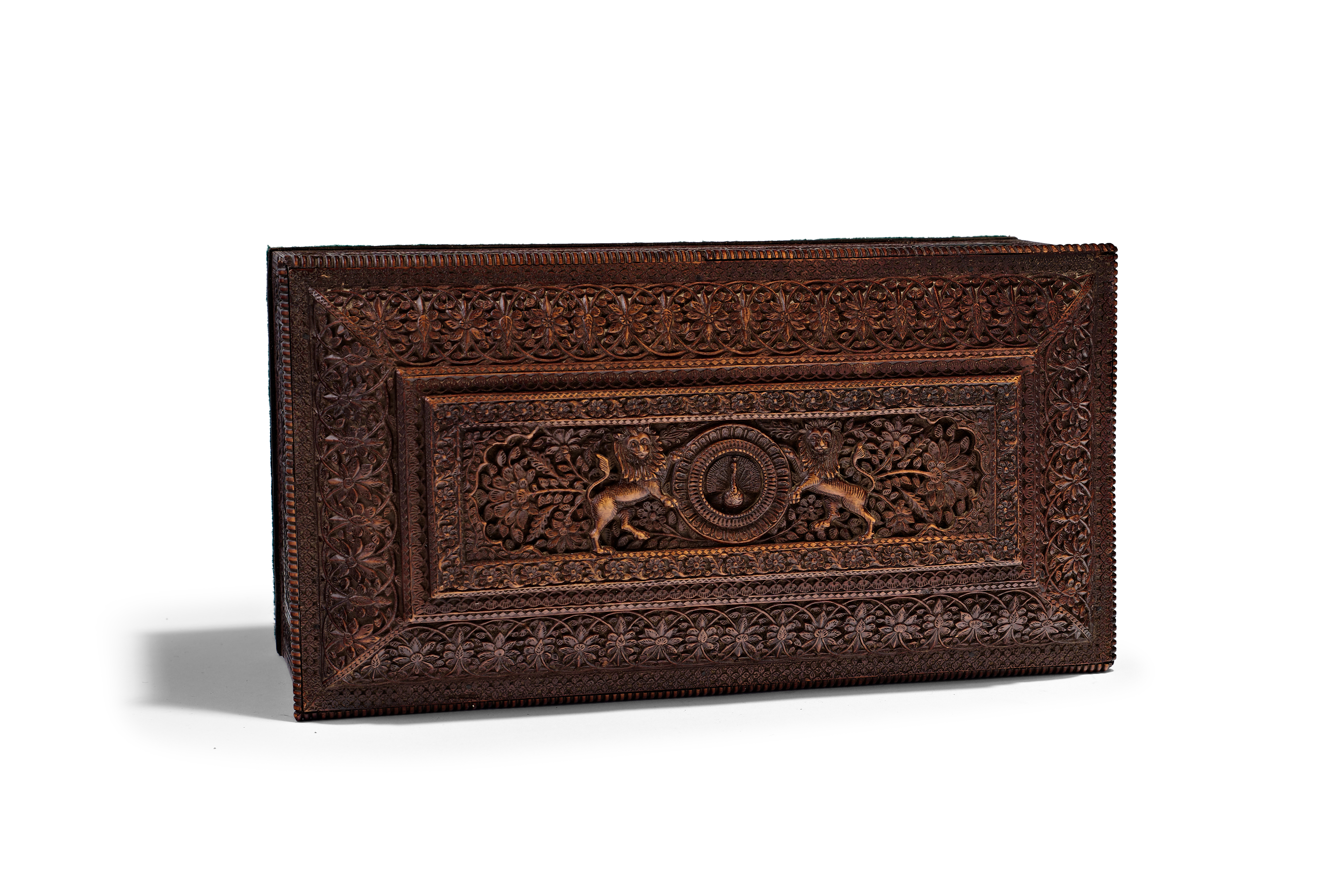 An Anglo-Indian carved sandalwood jewelry box dating to the late 19th or early 20th century. The exterior is intricately decorated with dense, high-relief floral and foliate motifs across the lid and all four sides. The hinged lid features a central rectangular panel depicting two rampant lions flanking a circular medallion containing a peacock. The interior is lined with salmon-colored tufted satin and includes a removable wooden tray with various compartments, also lined in matching fabric. The box is equipped with metal hinges and a front lock mechanism. The base is finished with green felt.