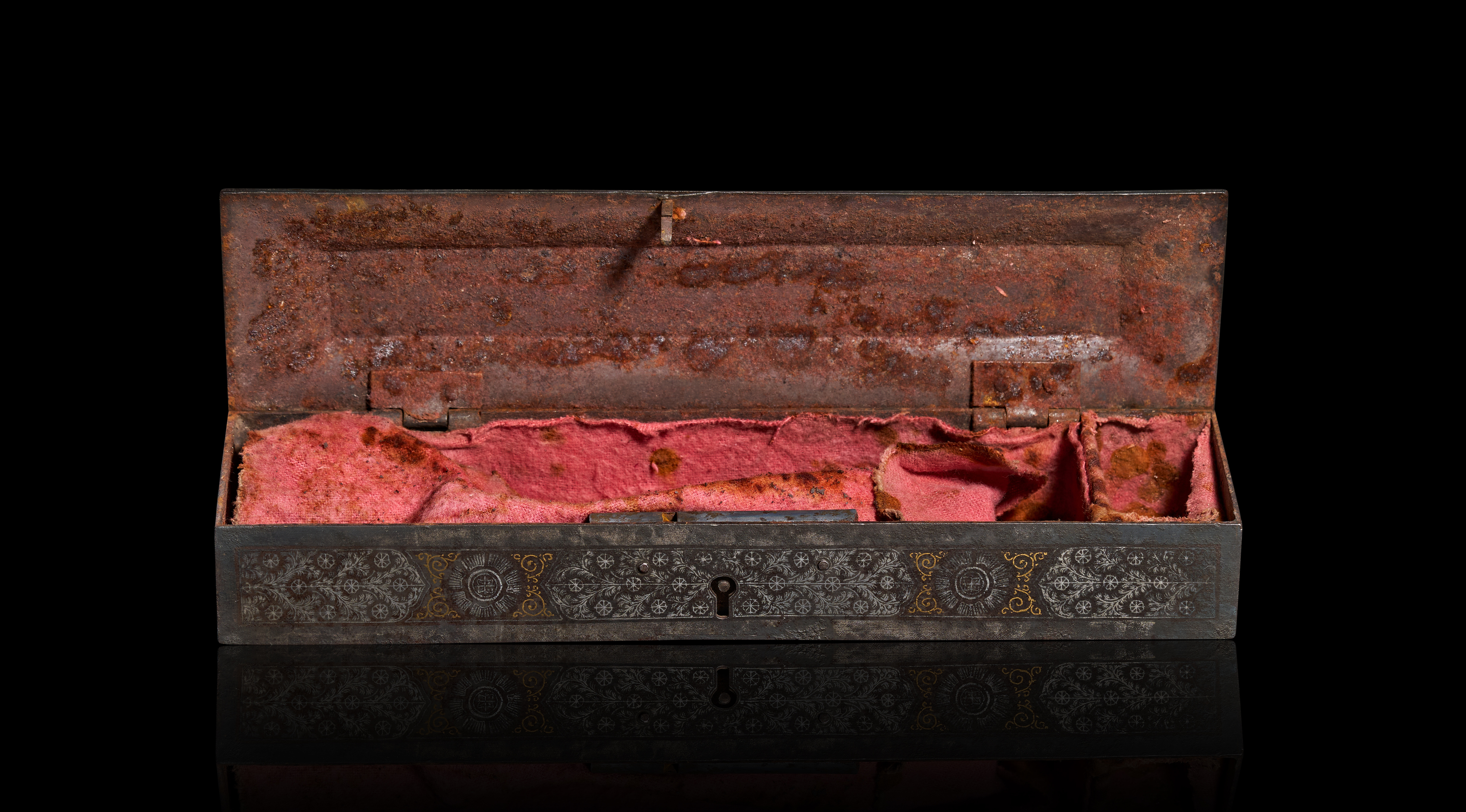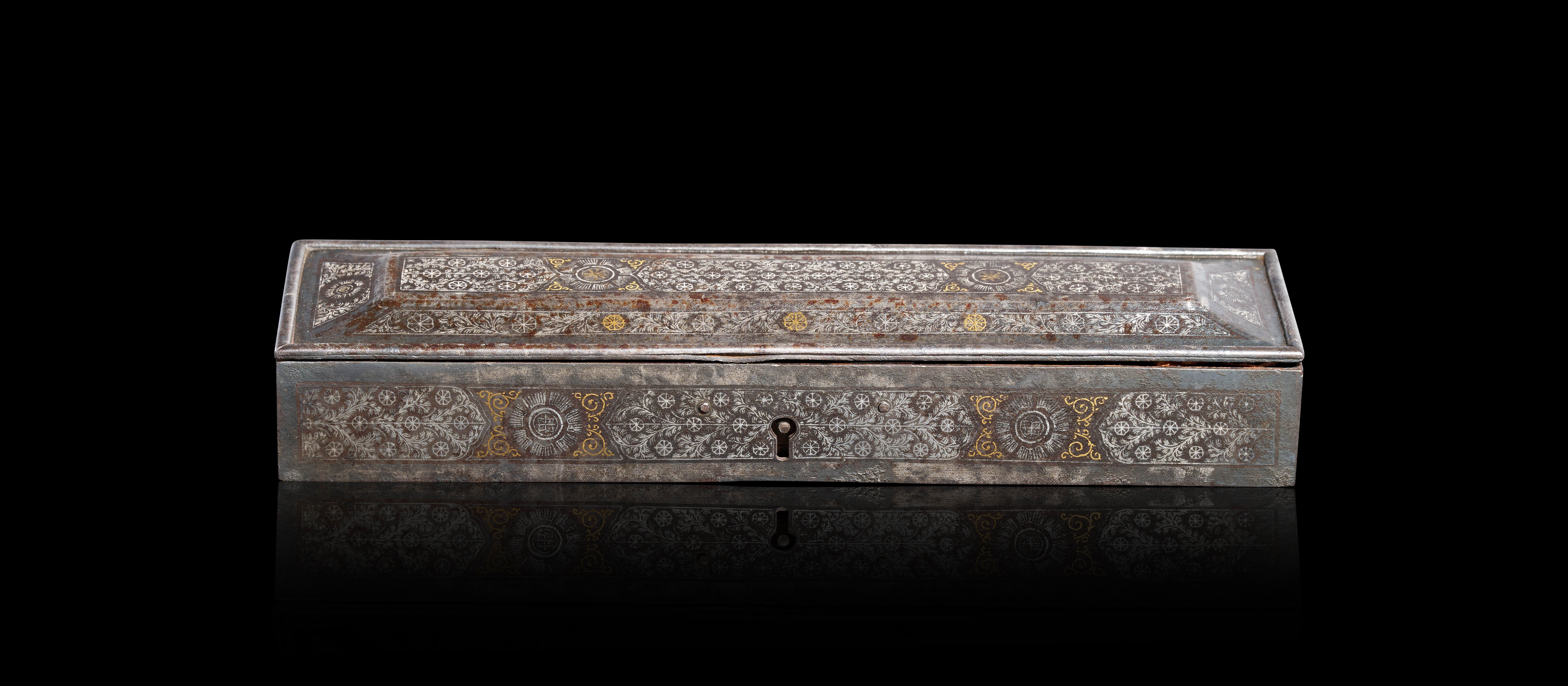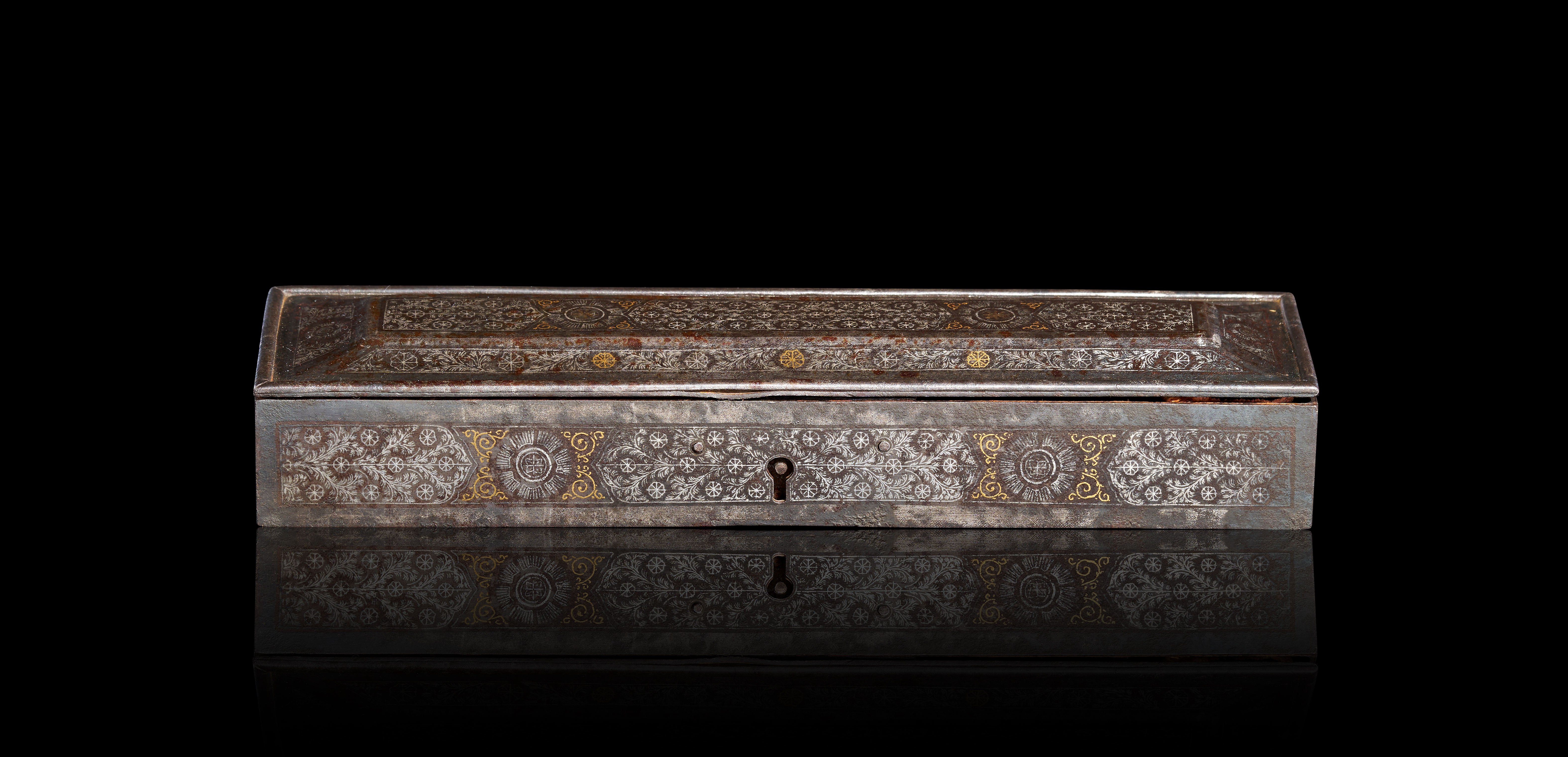 This rectangular steel pen box, known as a qalamdan, features damascened silver and gold inlaid decoration in the Indo-Persian style. The exterior is decorated with floral scrolls, rosettes, and circular medallions across the beveled lid and sides. A centrally located keyhole is positioned on the front face. The interior is lined with red velvet and includes a small partitioned compartment at one end. The construction utilizes iron or steel with precious metal inlay.