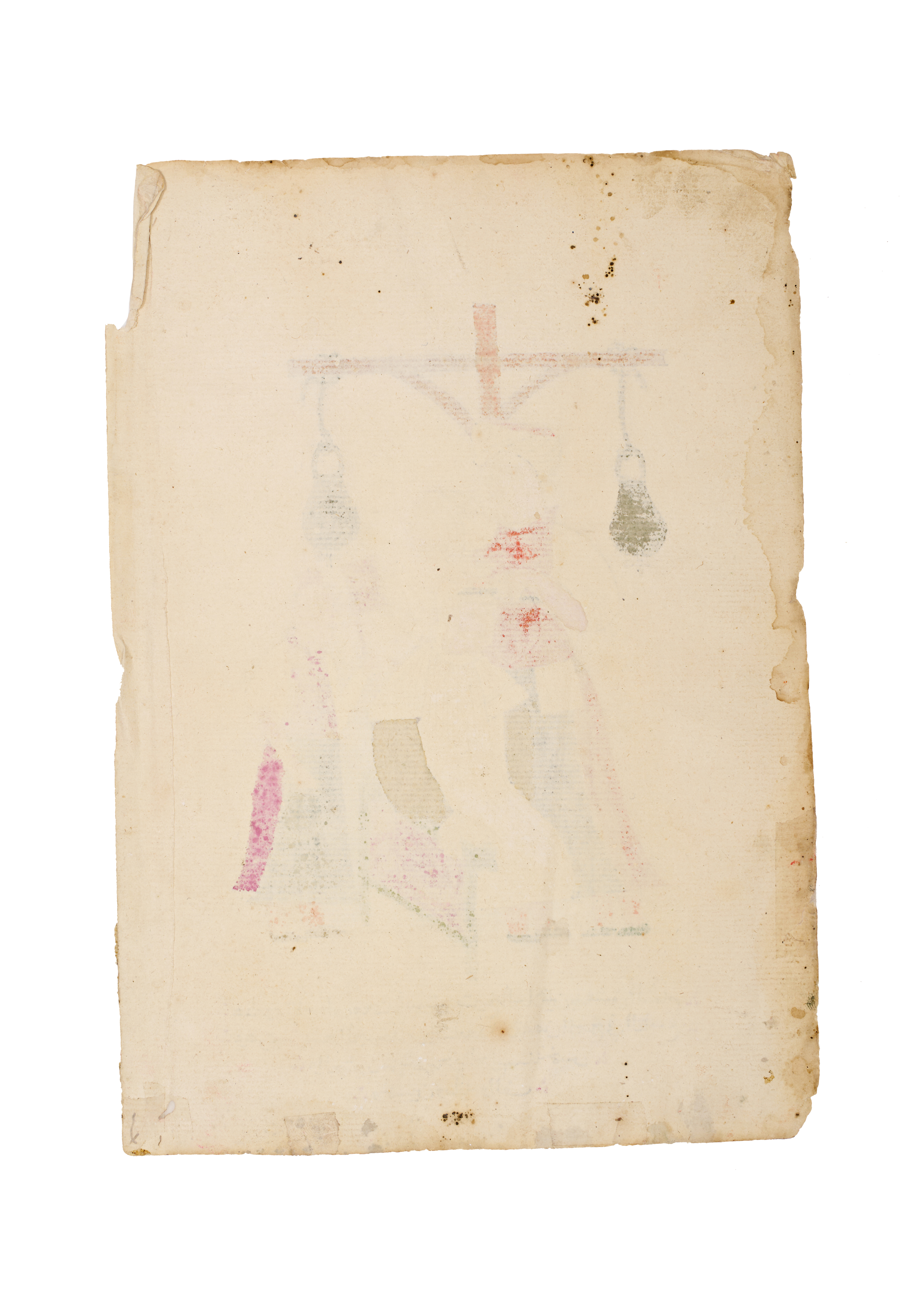 This Ottoman illustrated manuscript leaf, executed in ink and opaque pigments on paper, depicts a Levant barber scene set beneath a wooden structure from which two weighted vessels are suspended. The central composition features a barber in a red vest and white turban shaving the head of a seated man, while an attendant stands to the right holding a fan. Several lines of Arabic script at the base identify the figures as Usta Muhammad al-Bushi, the head of the barbers in Damascus, and Jawkhadar Pasha. The inscription notes the event occurred upon the latter’s return from Hajj in Muharram 1155 AH, which corresponds to circa 1742 CE. The work is characteristic of the Turkish miniature tradition of the mid-18th century.