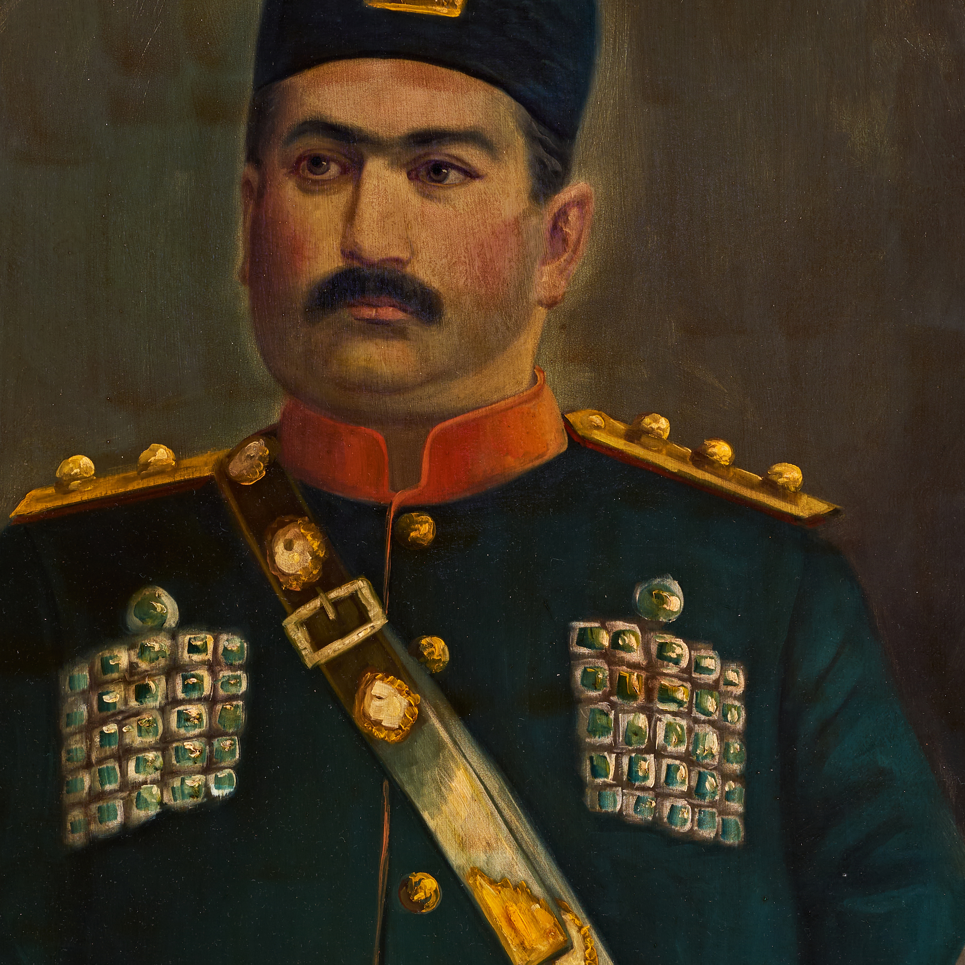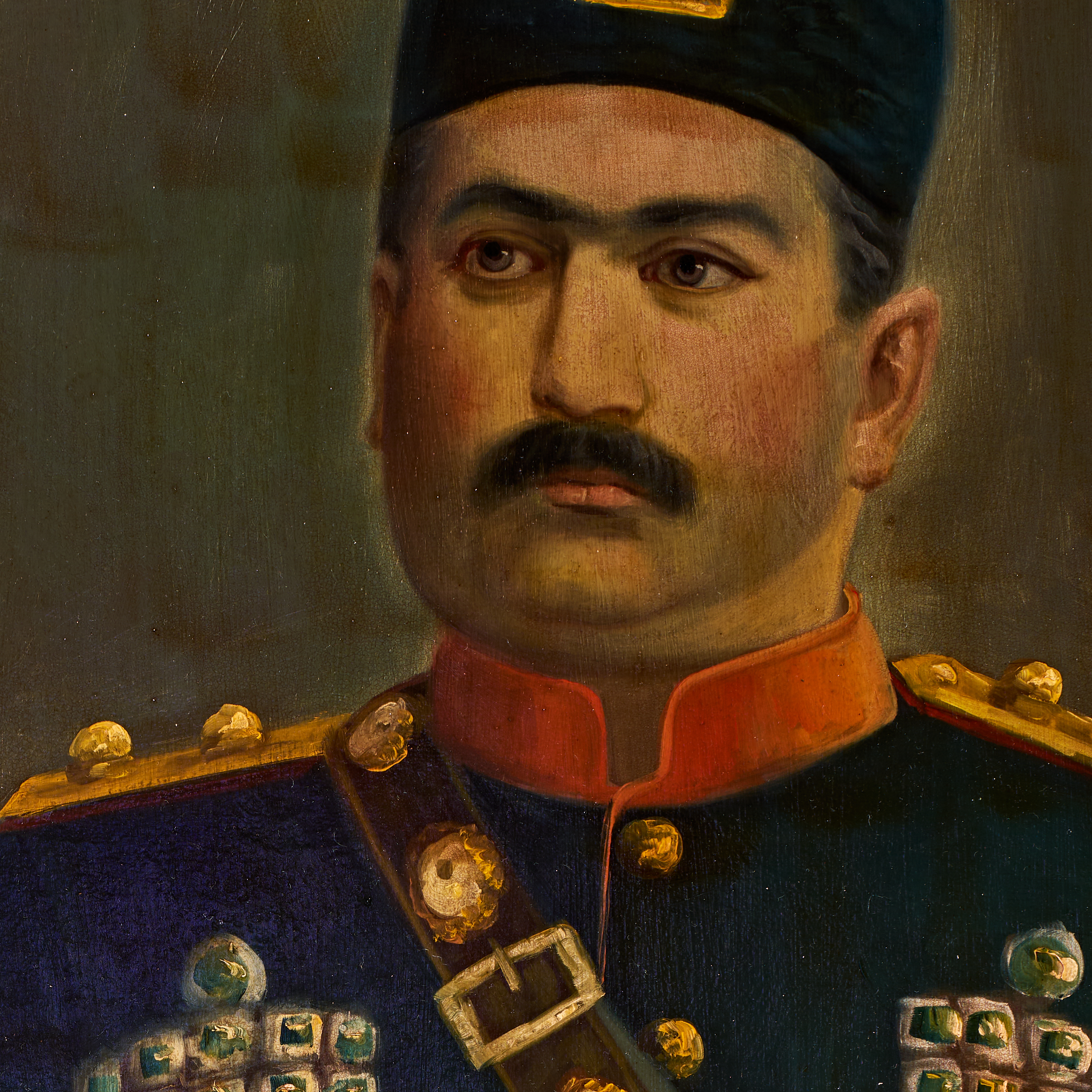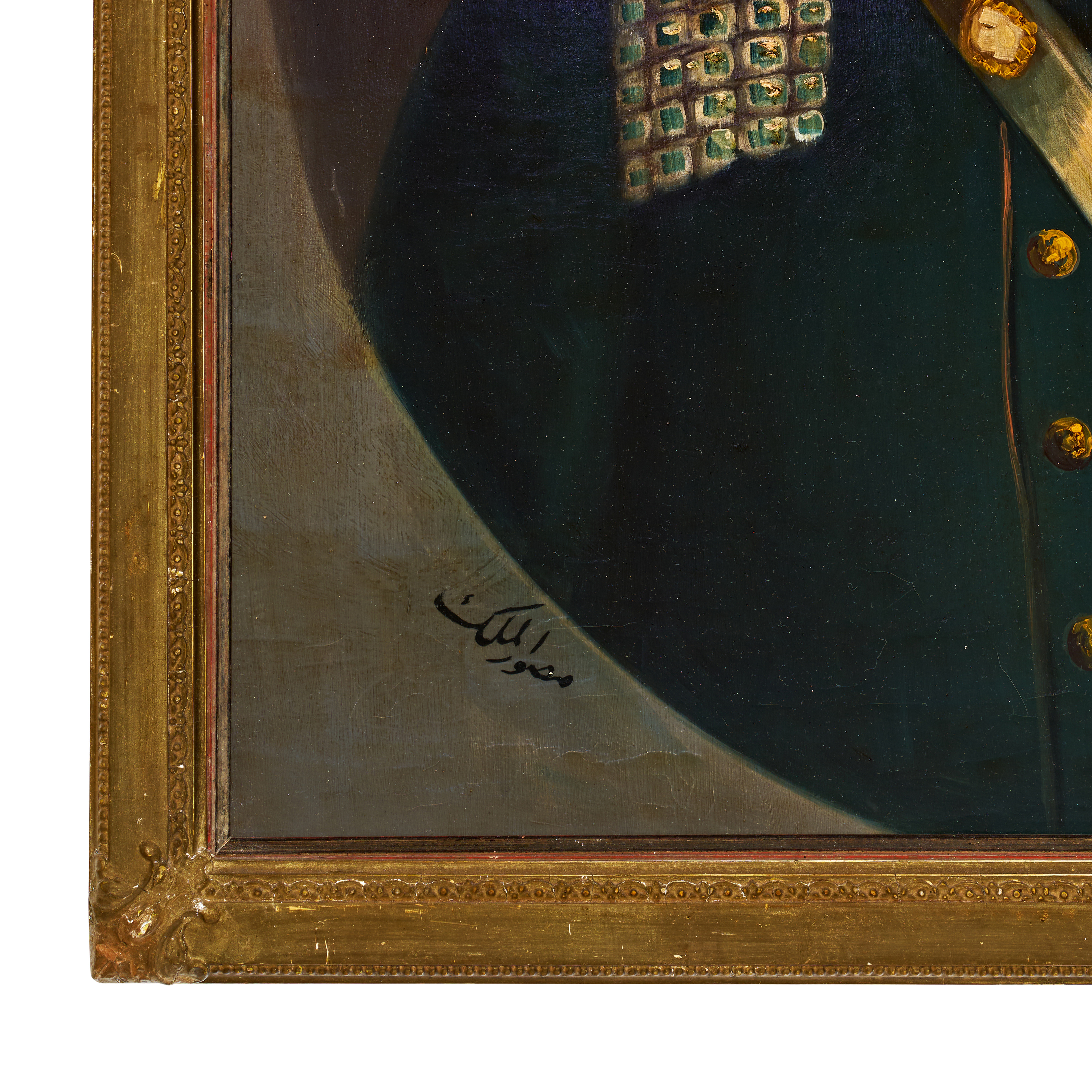 AN OIL ON CANVAS DEPICTS A PORTRAIT OF MOHAMMAD ALI SHAH QAJAR, SIGNED MUSAVVIR AL MULK, 19TH – 20TH CENTURY