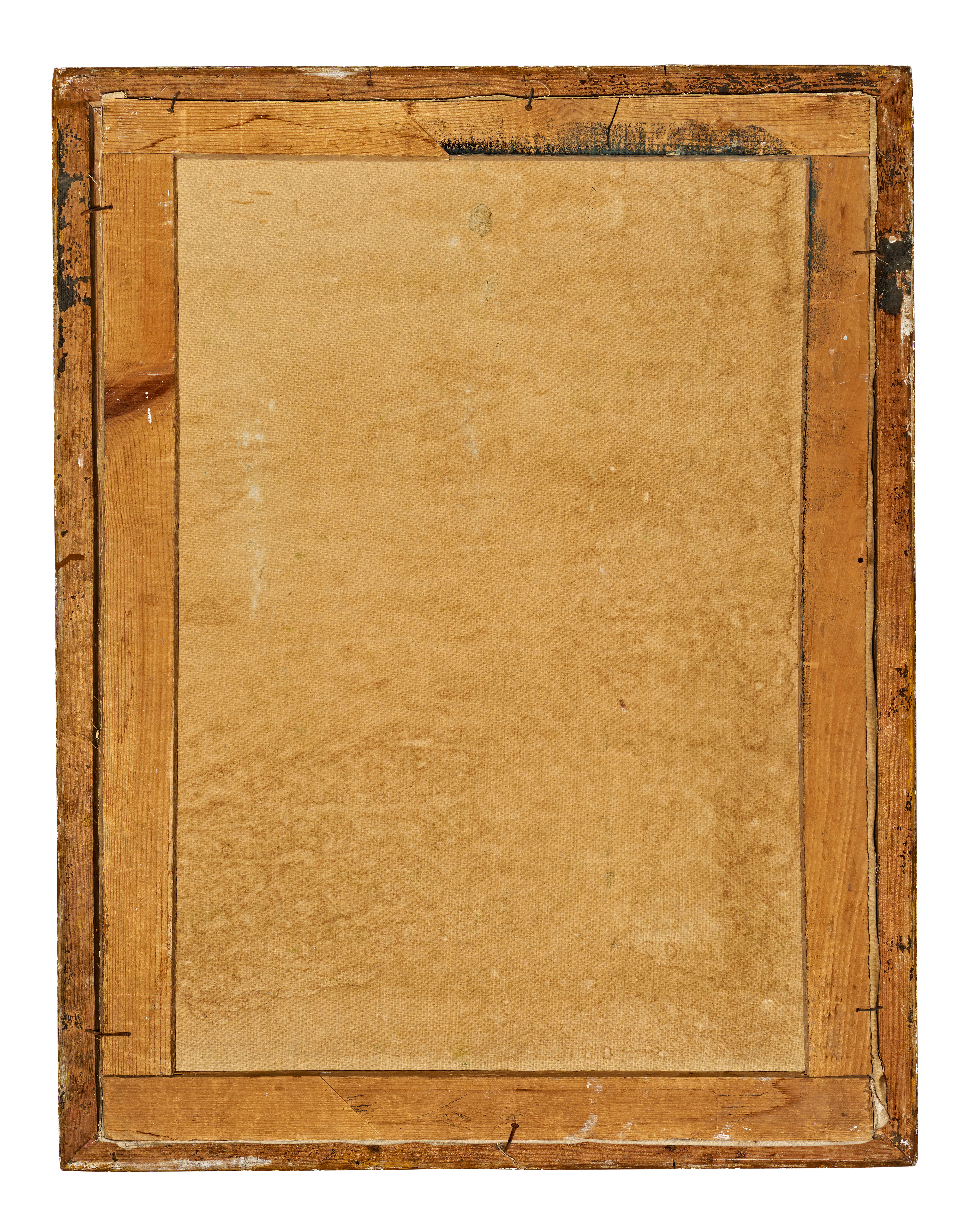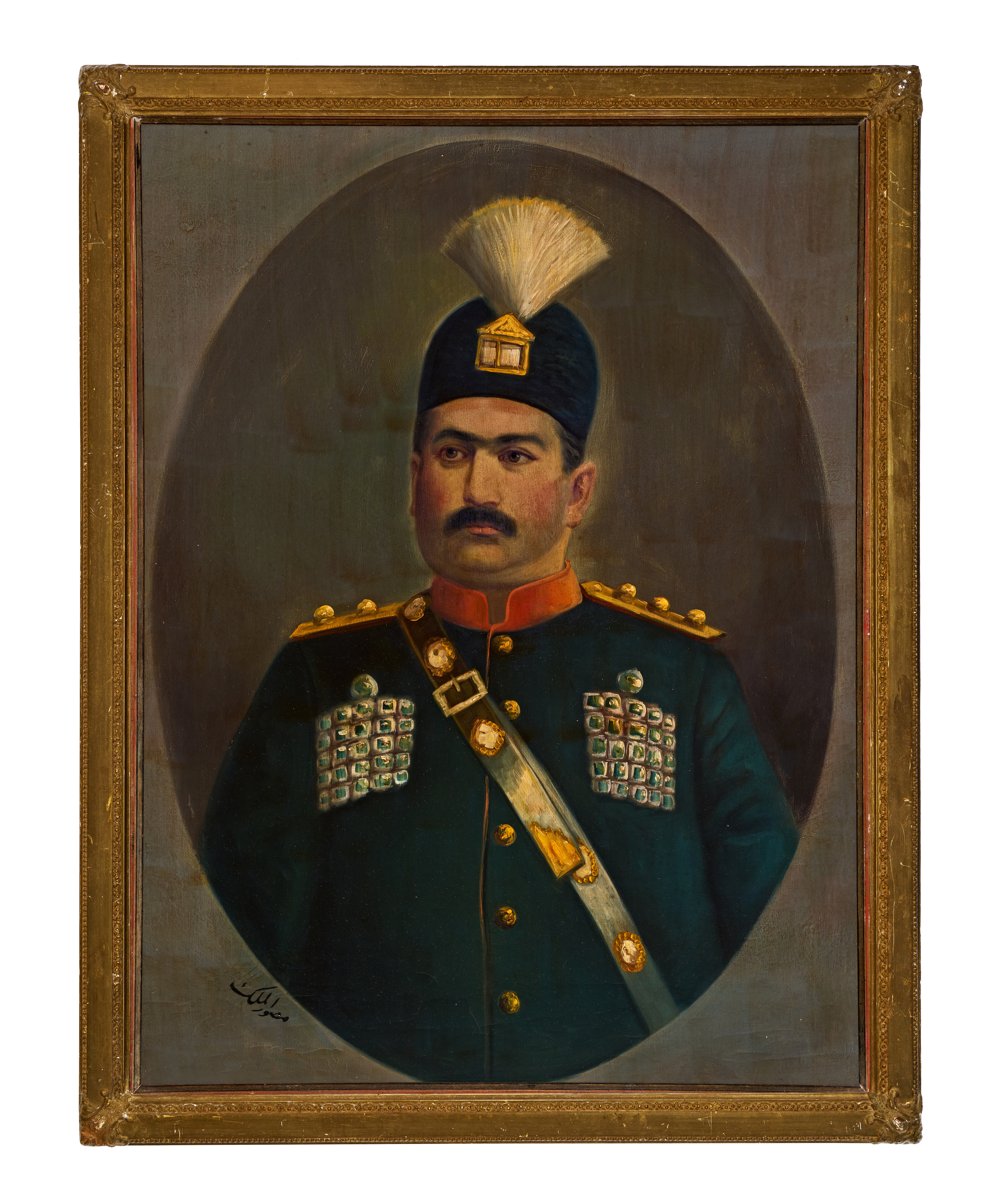 This oil on canvas portrait depicts Mohammad Ali Shah Qajar and is signed in Persian script in the lower left corner, reading Musavvir al-Mulk. The subject is rendered from the chest up in a realist style, wearing a dark blue uniform featuring a red stand-up collar, epaulettes, a leather cross-belt, and two large breast ornaments set with rows of green and white stones. He is shown with a mustache and wears a traditional black tall hat, or kula, adorned with a white aigrette and a central architectural ornament. The portrait is composed within an oval vignette against a dark, neutral background. The painting is housed in a rectangular gilt wood frame with molded decorative borders. The reverse reveals a stained canvas secured to a wooden stretcher.