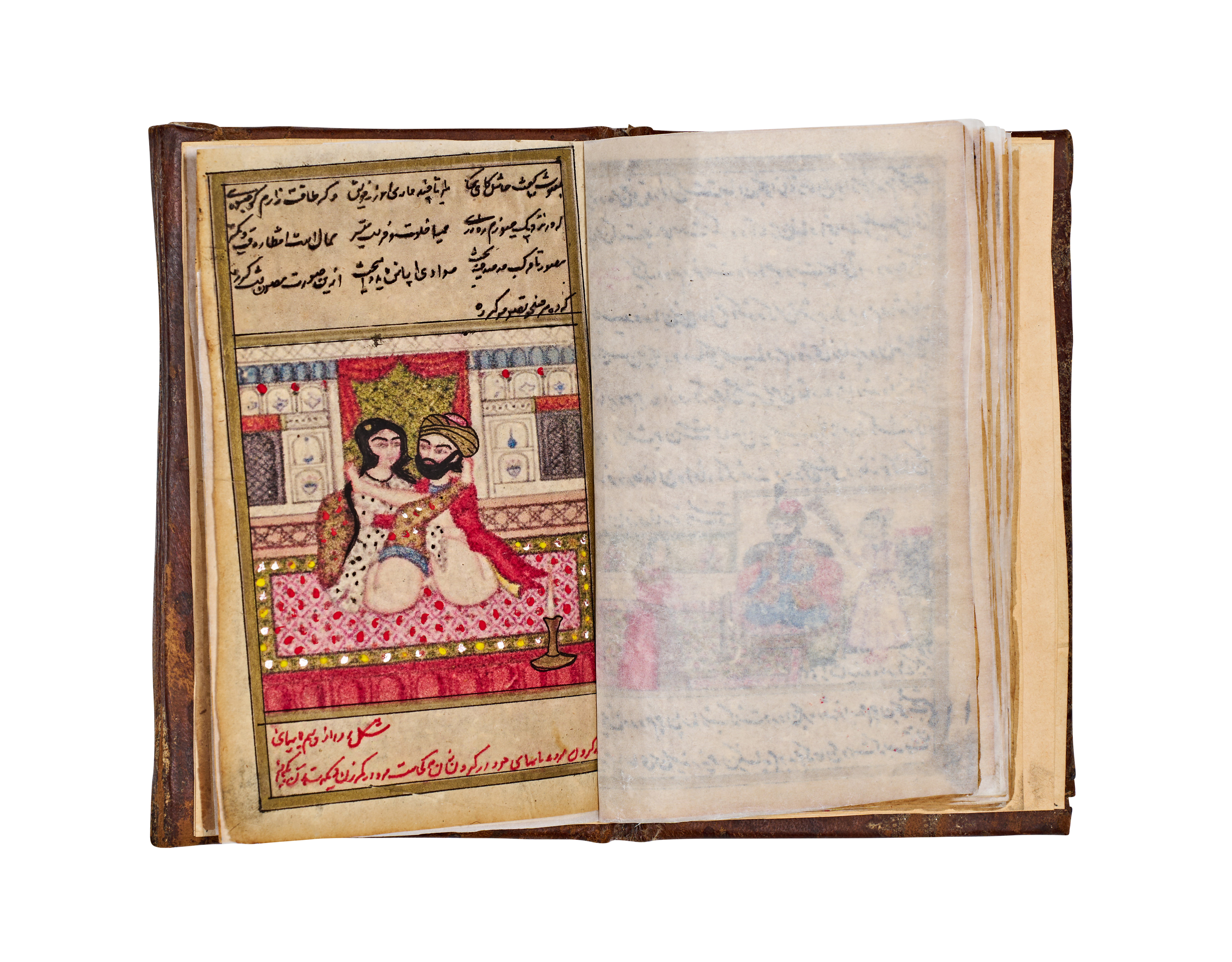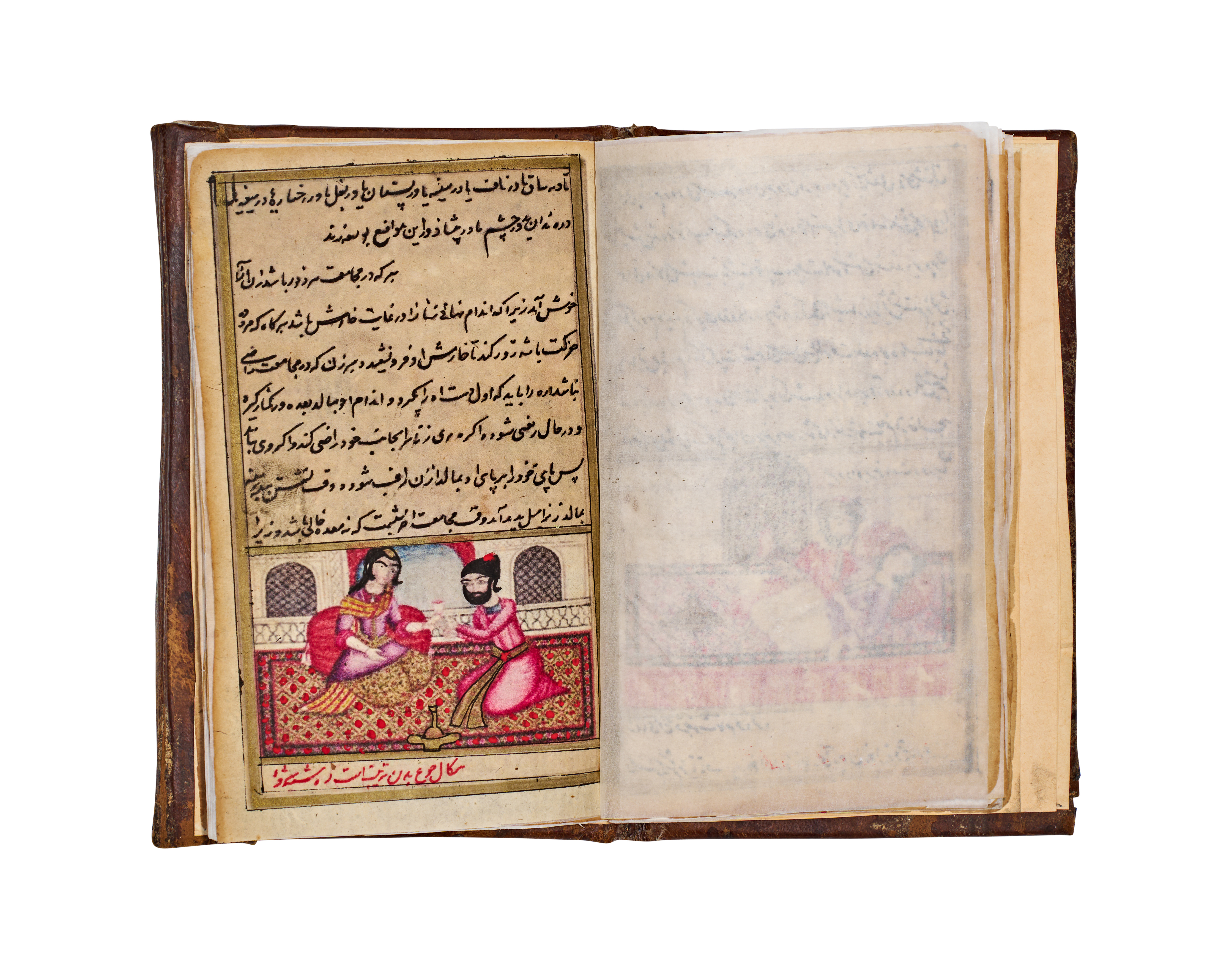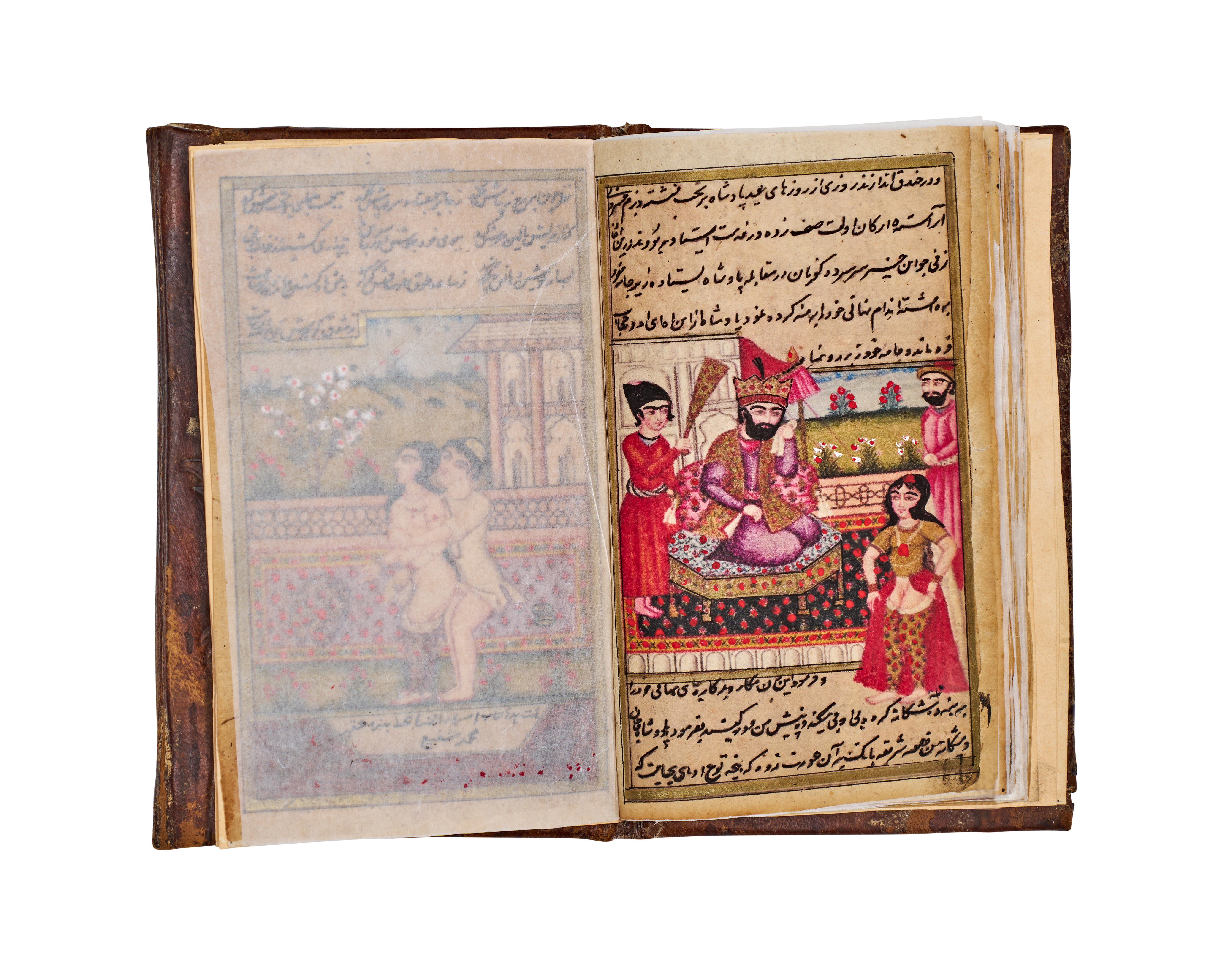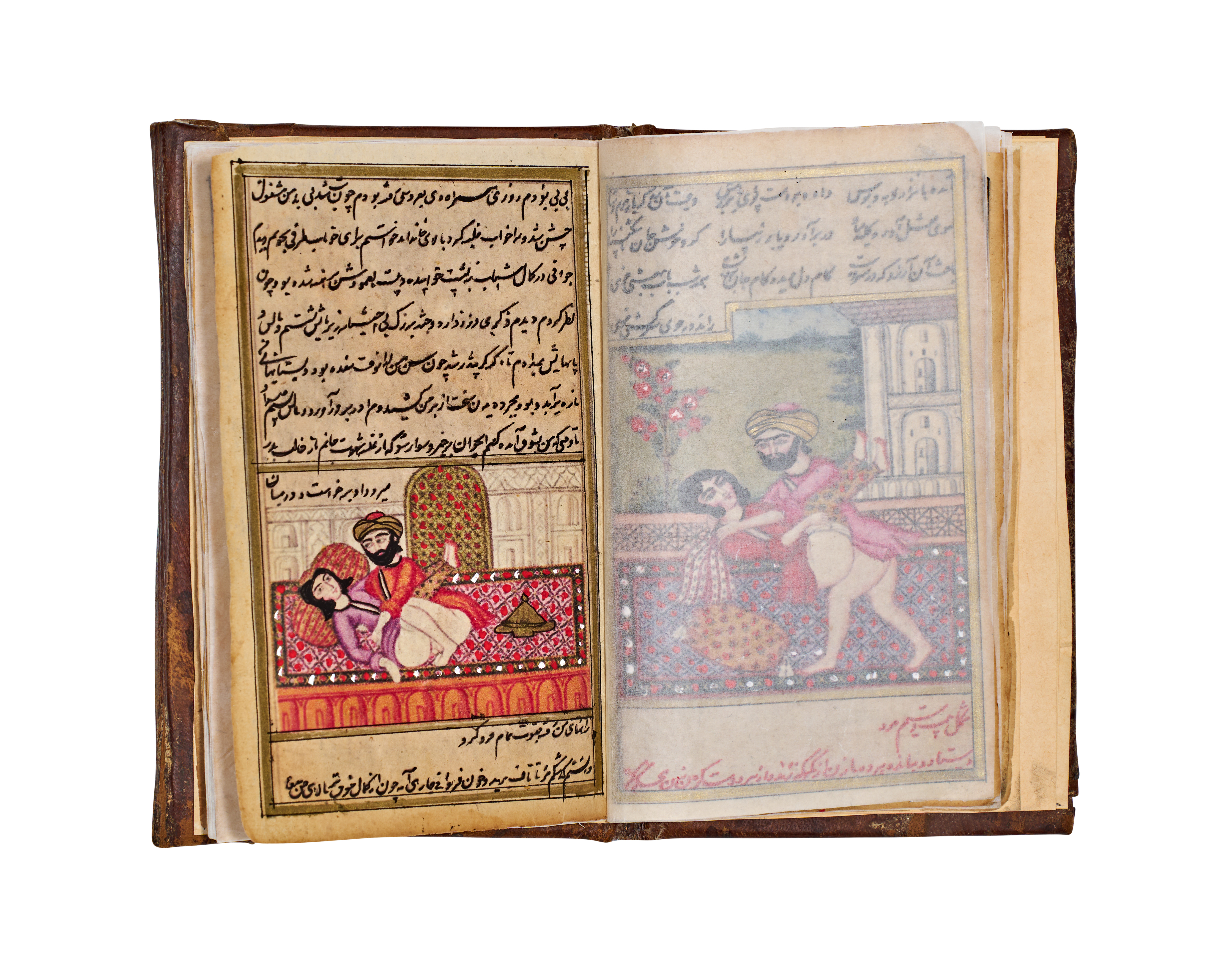 This 19th-century Persian manuscript from the Qajar period is an illuminated volume featuring numerous hand-painted miniatures. The illustrations are executed in opaque pigments and depict various courtly, romantic, and intimate scenes with fine detailing. The text consists of extensive sections of Persian calligraphy written in black and red ink. The work includes decorative unwan headpieces with floral motifs. The manuscript is housed in a brown leather binding featuring blind-stamped borders and a central foliate motif. Protective tissue inserts are present between several pages to shield the illustrations.