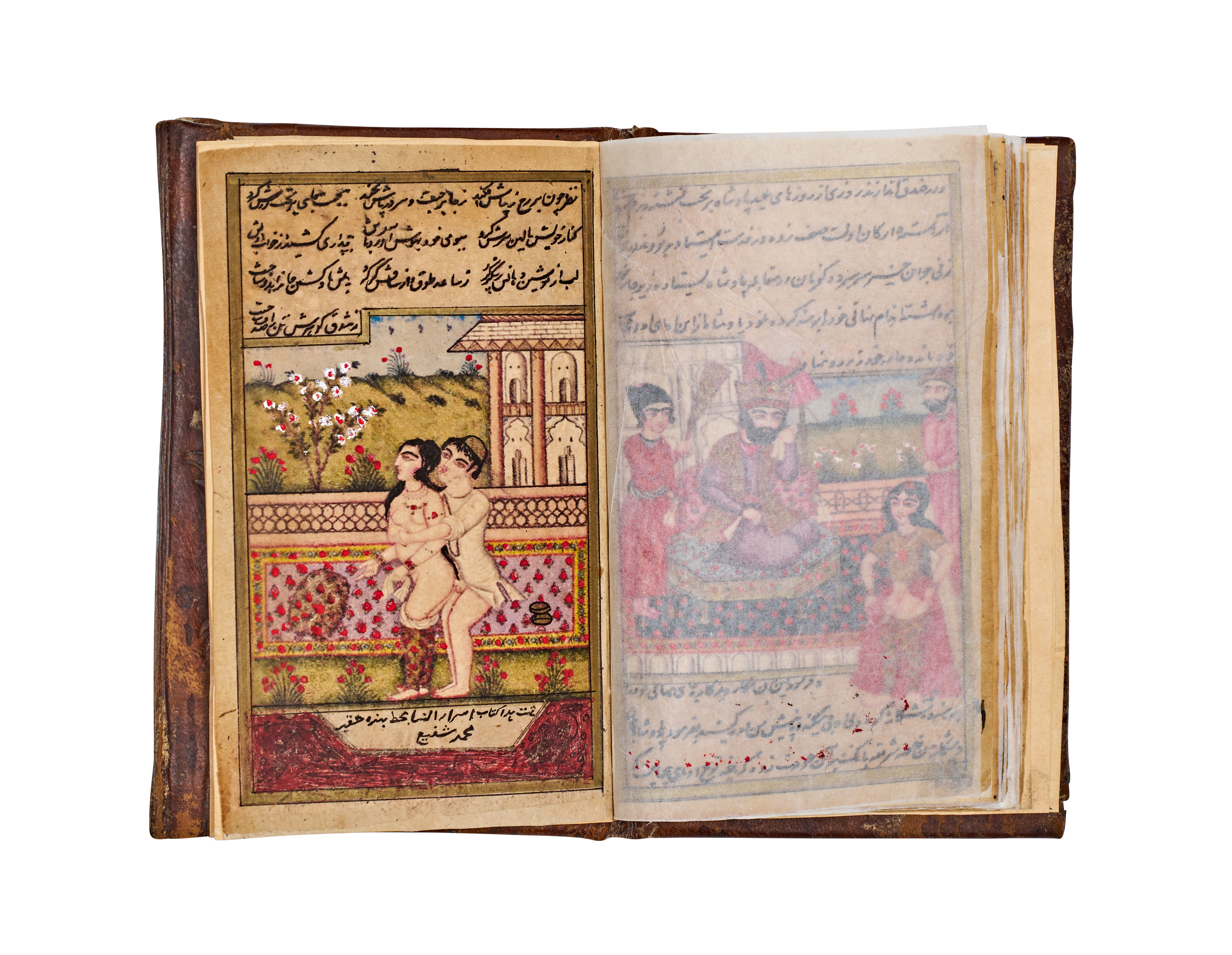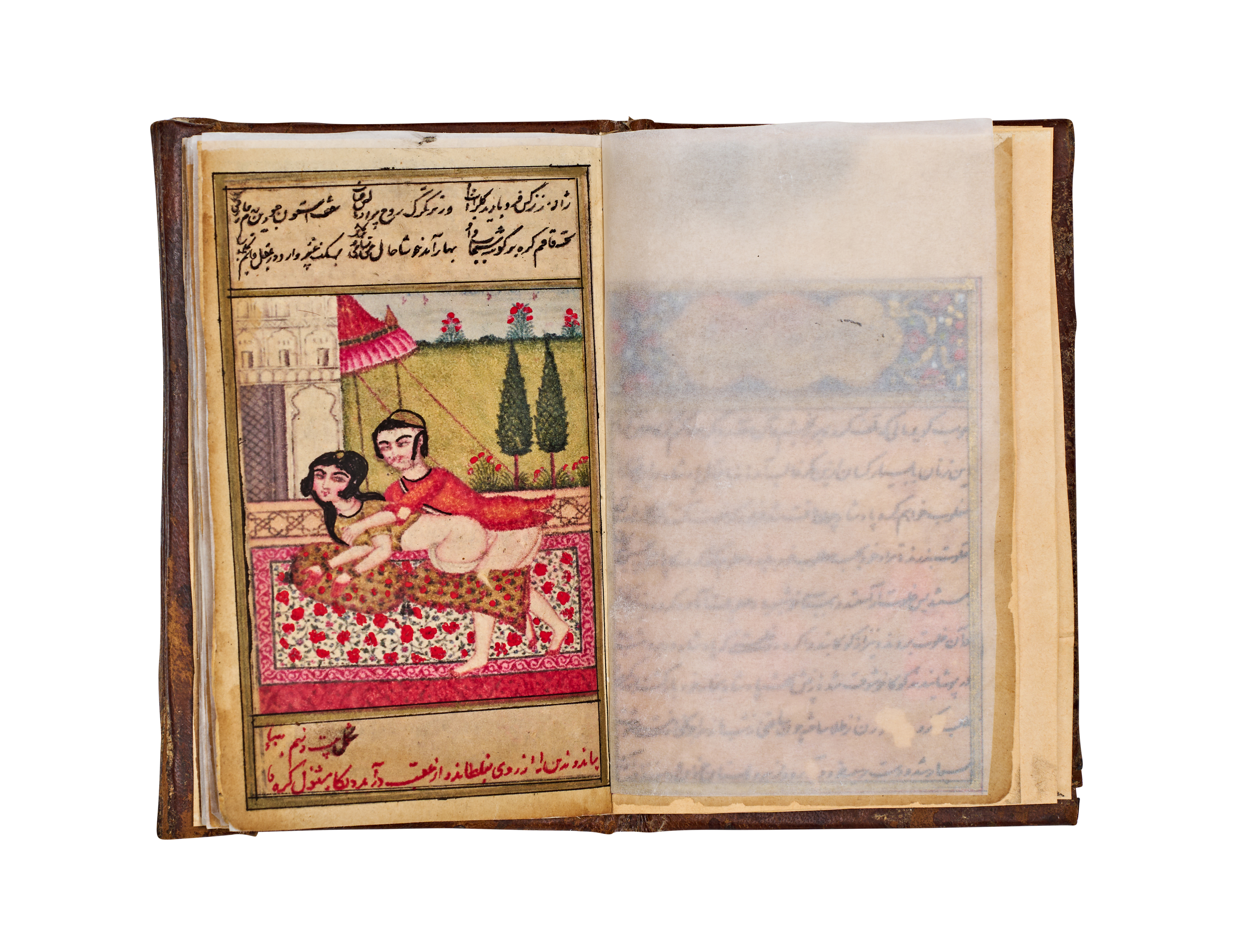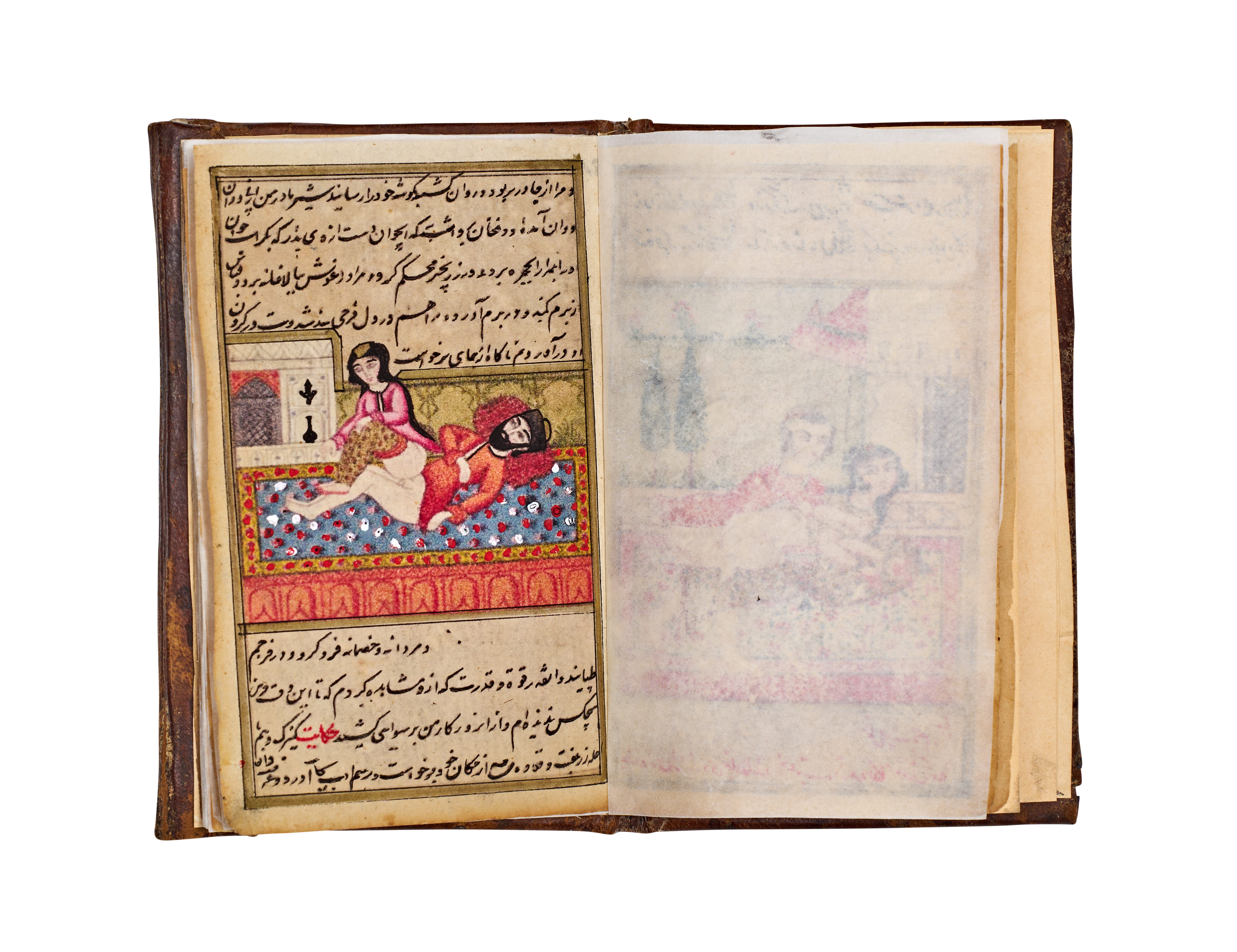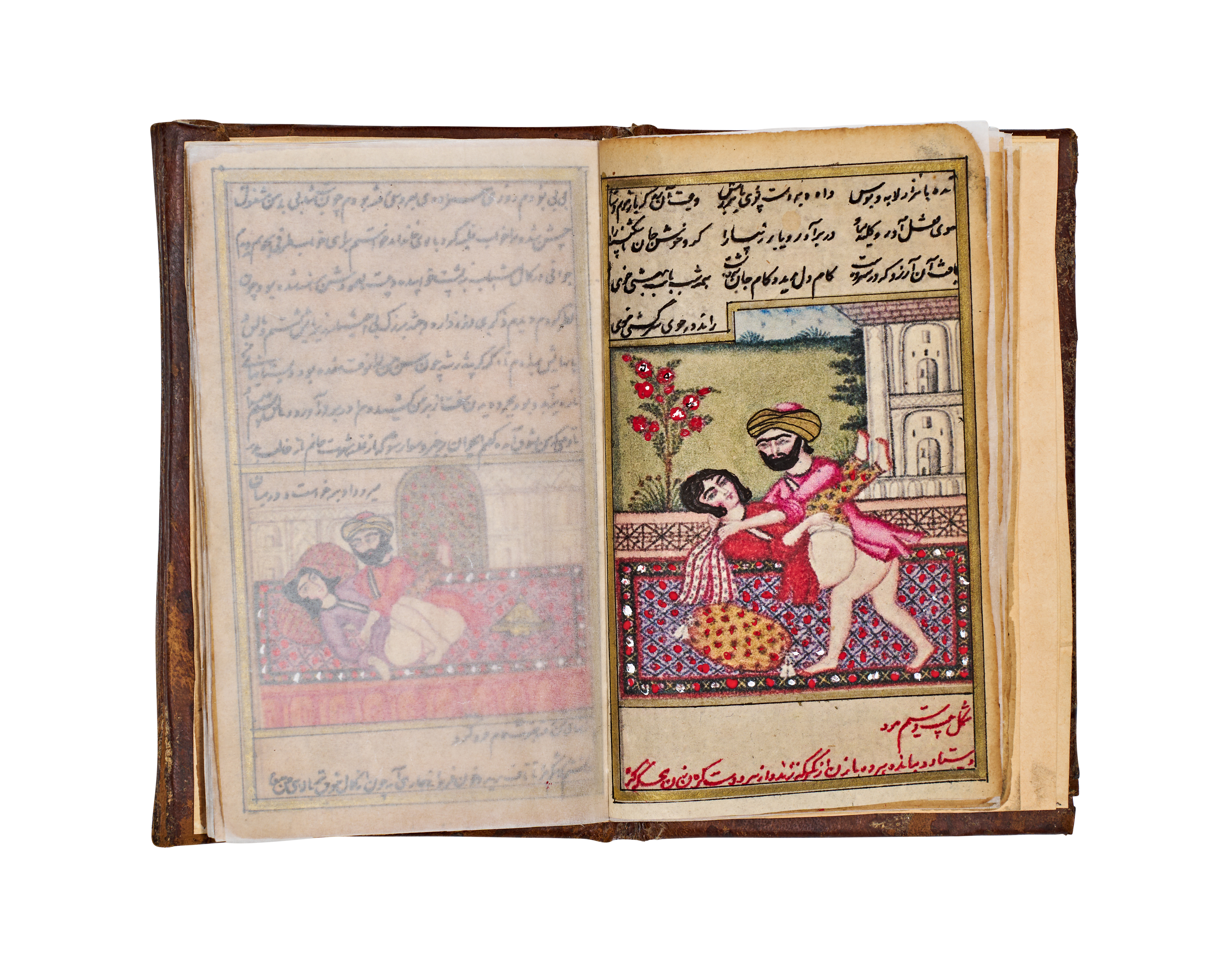 This 19th-century Persian manuscript from the Qajar period is an illuminated volume featuring numerous hand-painted miniatures. The illustrations are executed in opaque pigments and depict various courtly, romantic, and intimate scenes with fine detailing. The text consists of extensive sections of Persian calligraphy written in black and red ink. The work includes decorative unwan headpieces with floral motifs. The manuscript is housed in a brown leather binding featuring blind-stamped borders and a central foliate motif. Protective tissue inserts are present between several pages to shield the illustrations.