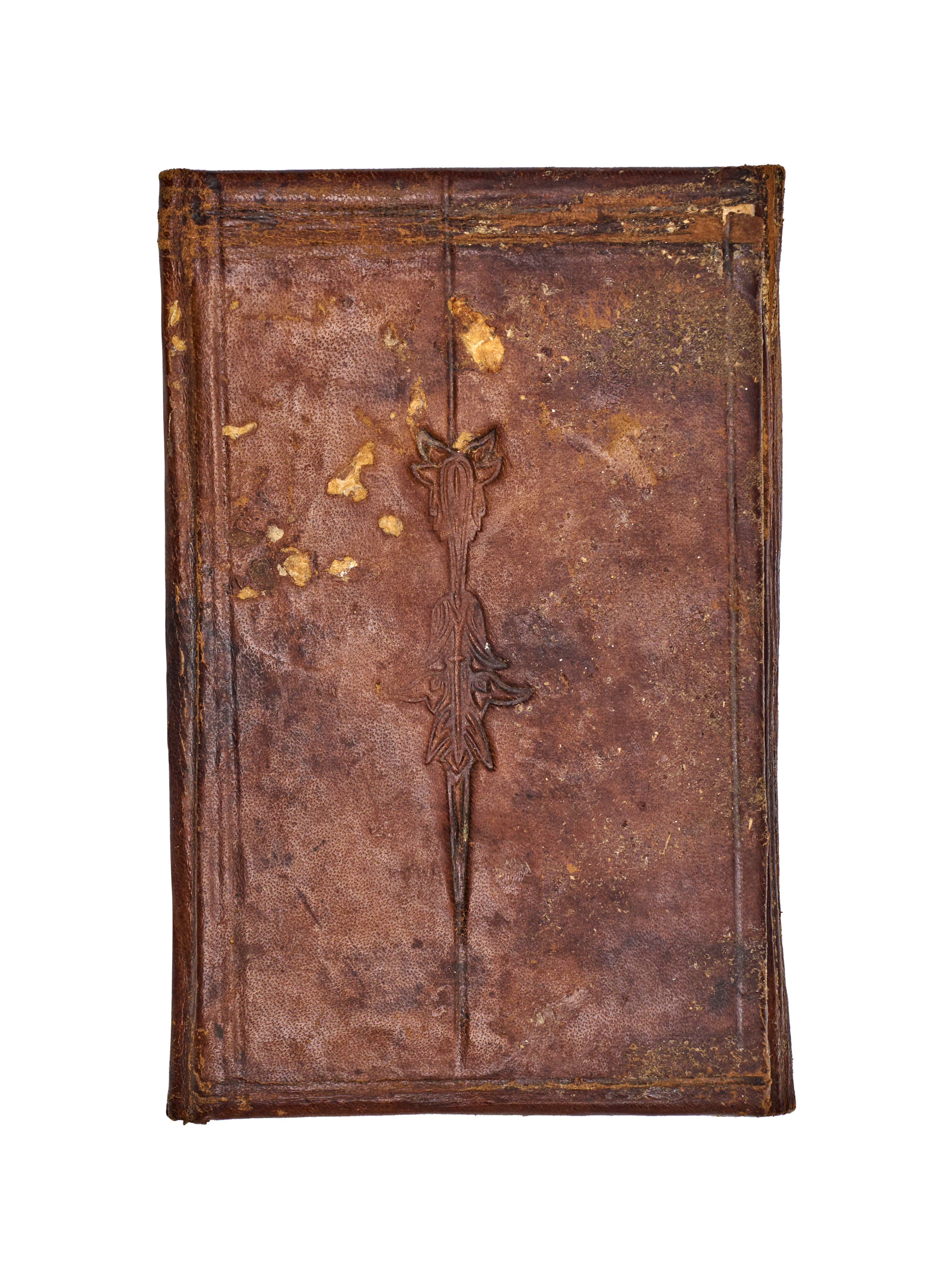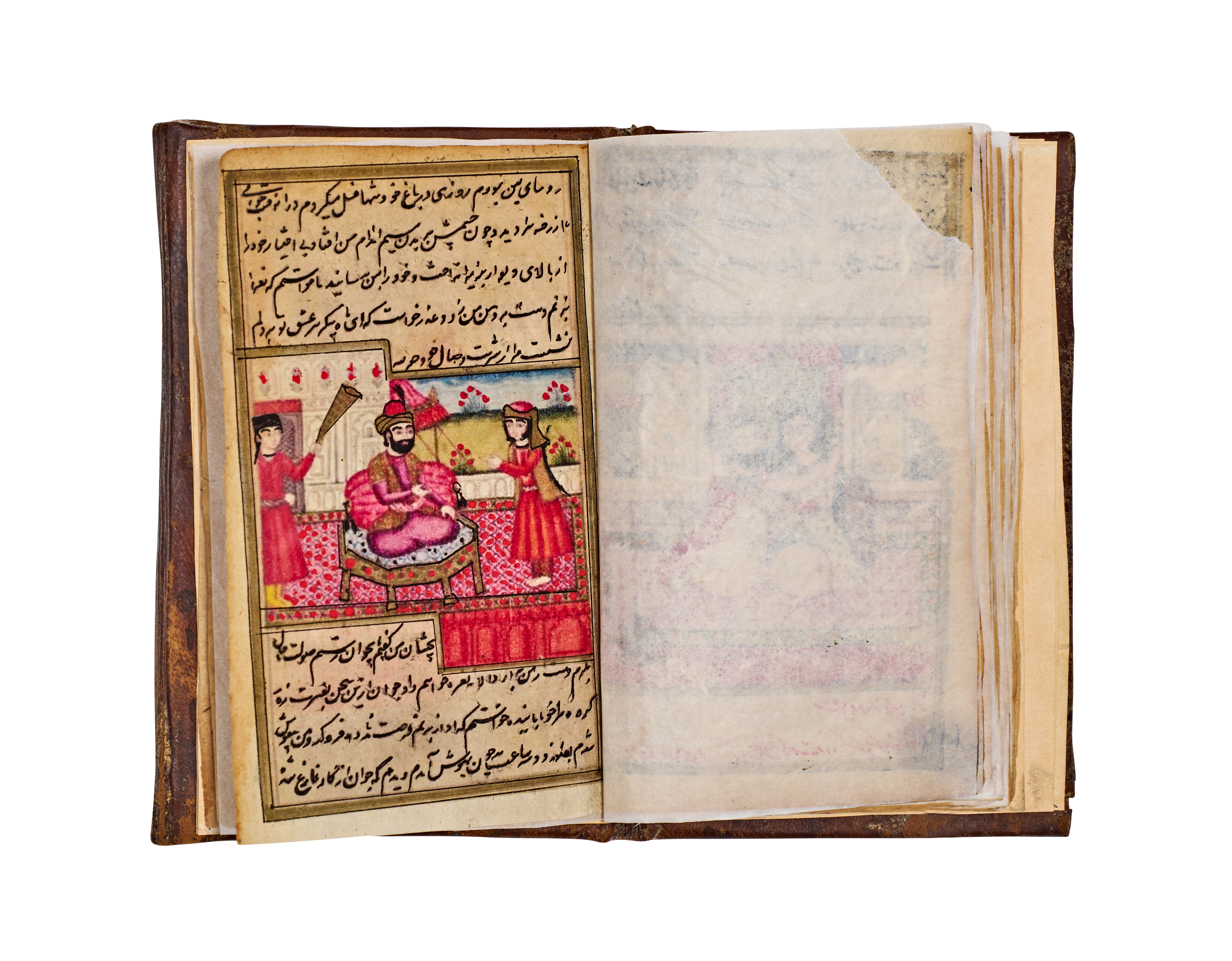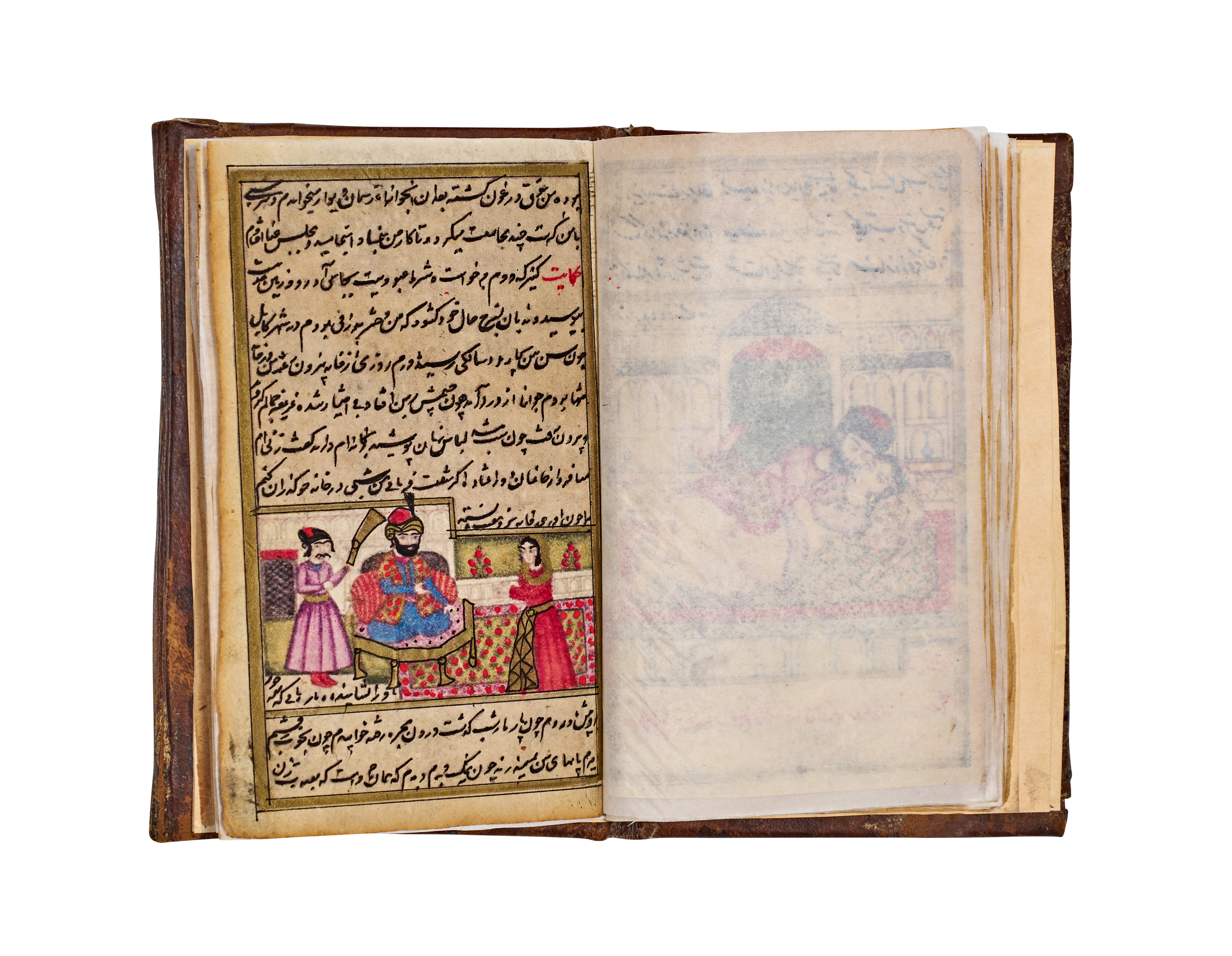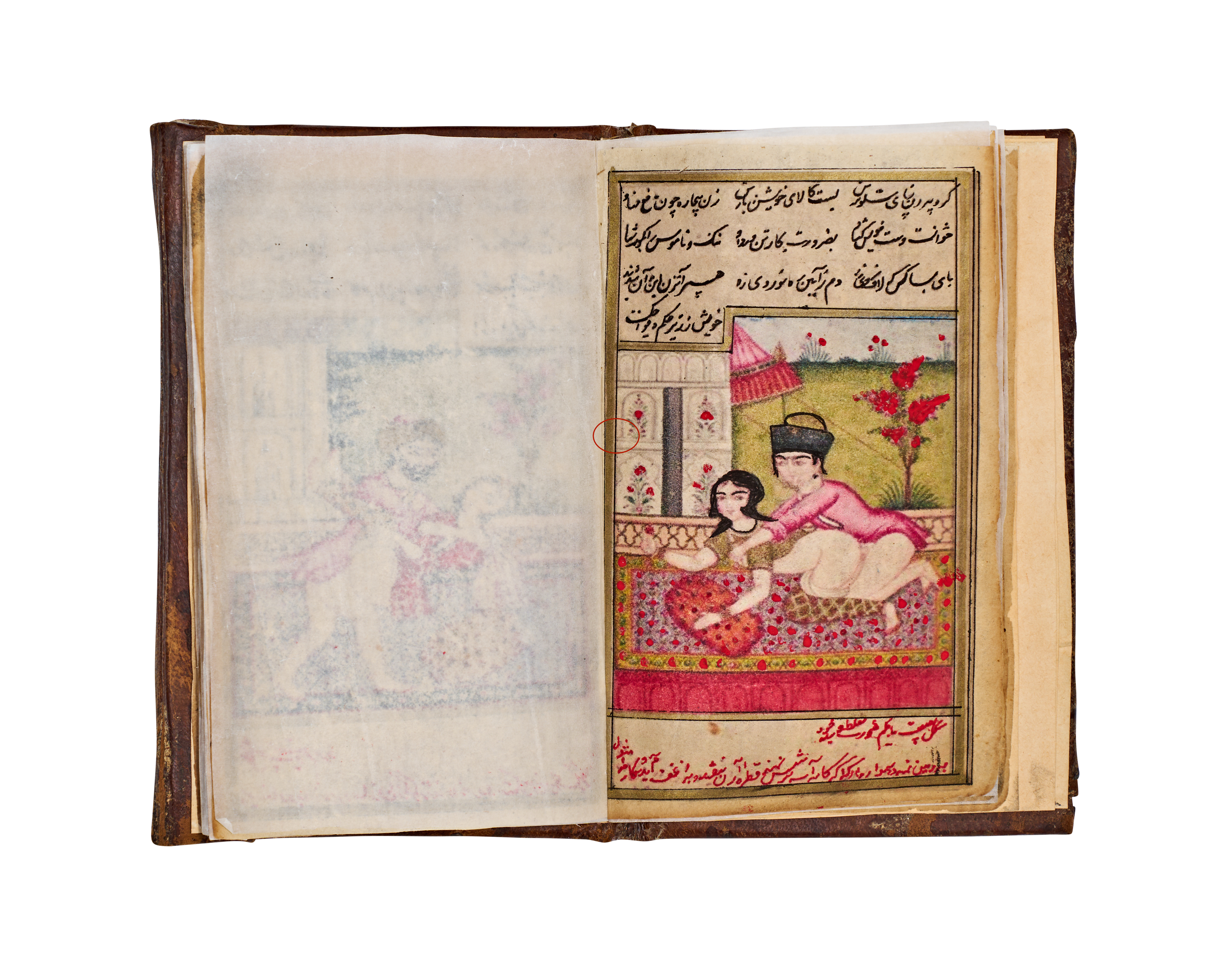 This 19th-century Persian manuscript from the Qajar period is an illuminated volume featuring numerous hand-painted miniatures. The illustrations are executed in opaque pigments and depict various courtly, romantic, and intimate scenes with fine detailing. The text consists of extensive sections of Persian calligraphy written in black and red ink. The work includes decorative unwan headpieces with floral motifs. The manuscript is housed in a brown leather binding featuring blind-stamped borders and a central foliate motif. Protective tissue inserts are present between several pages to shield the illustrations.
