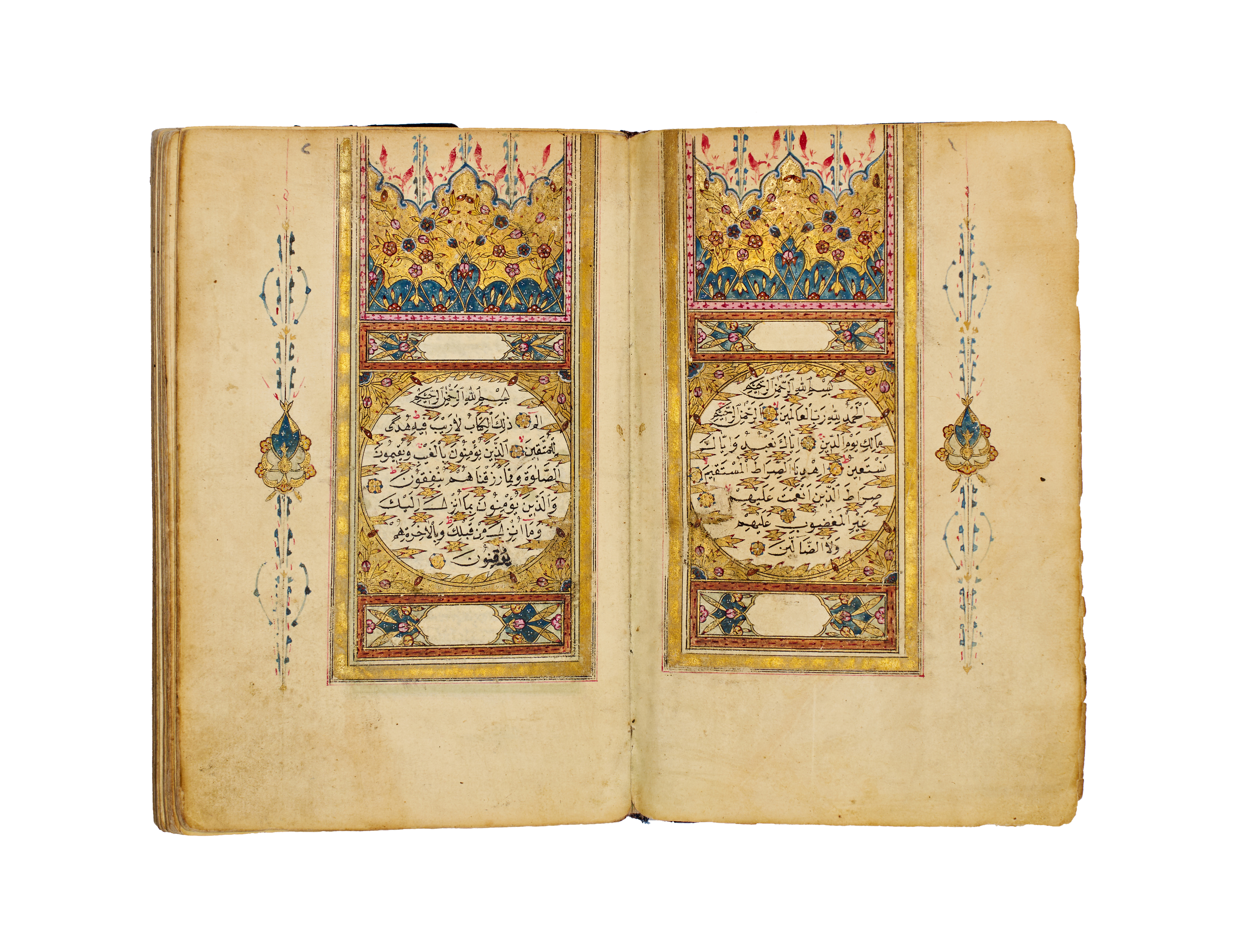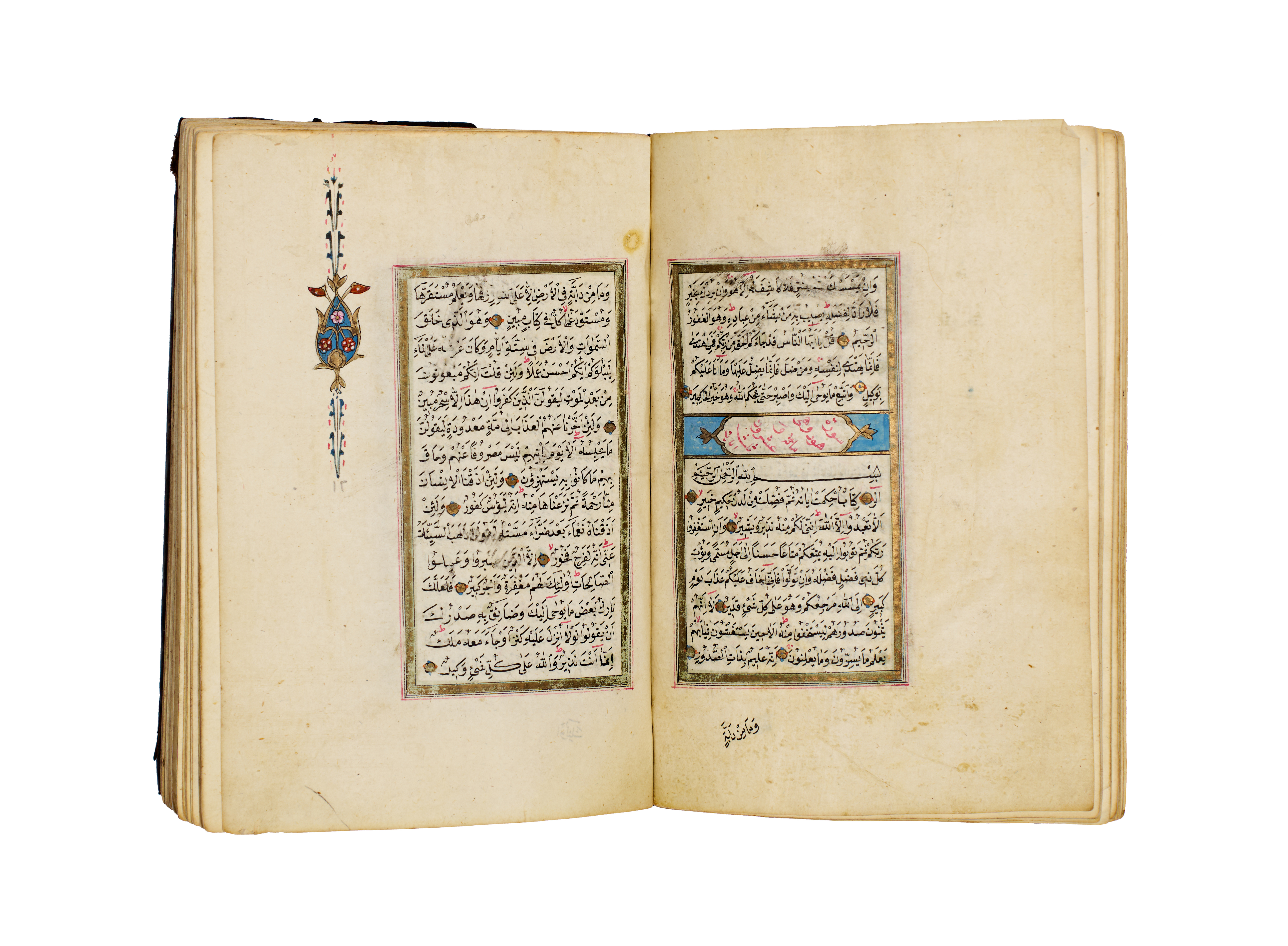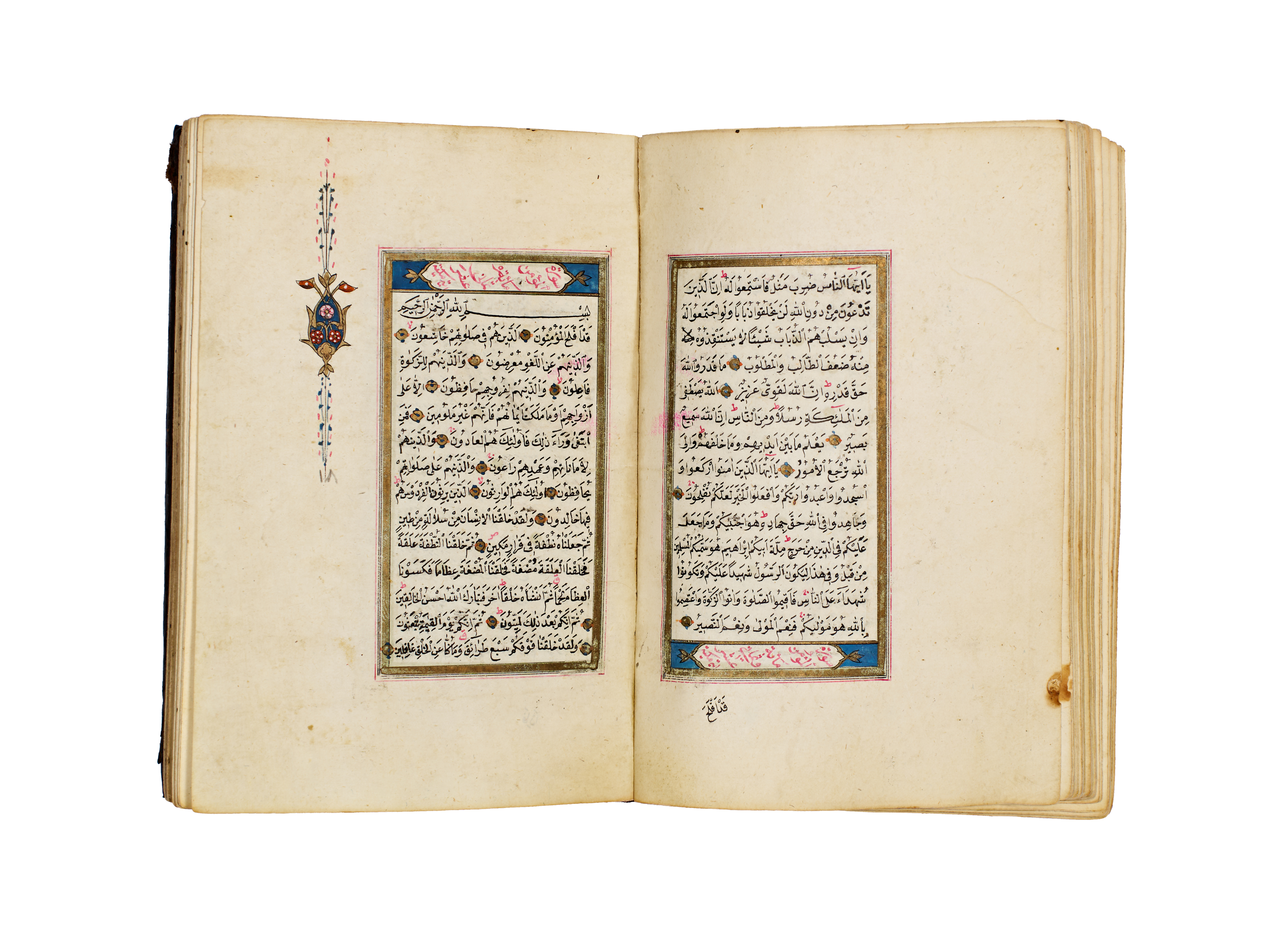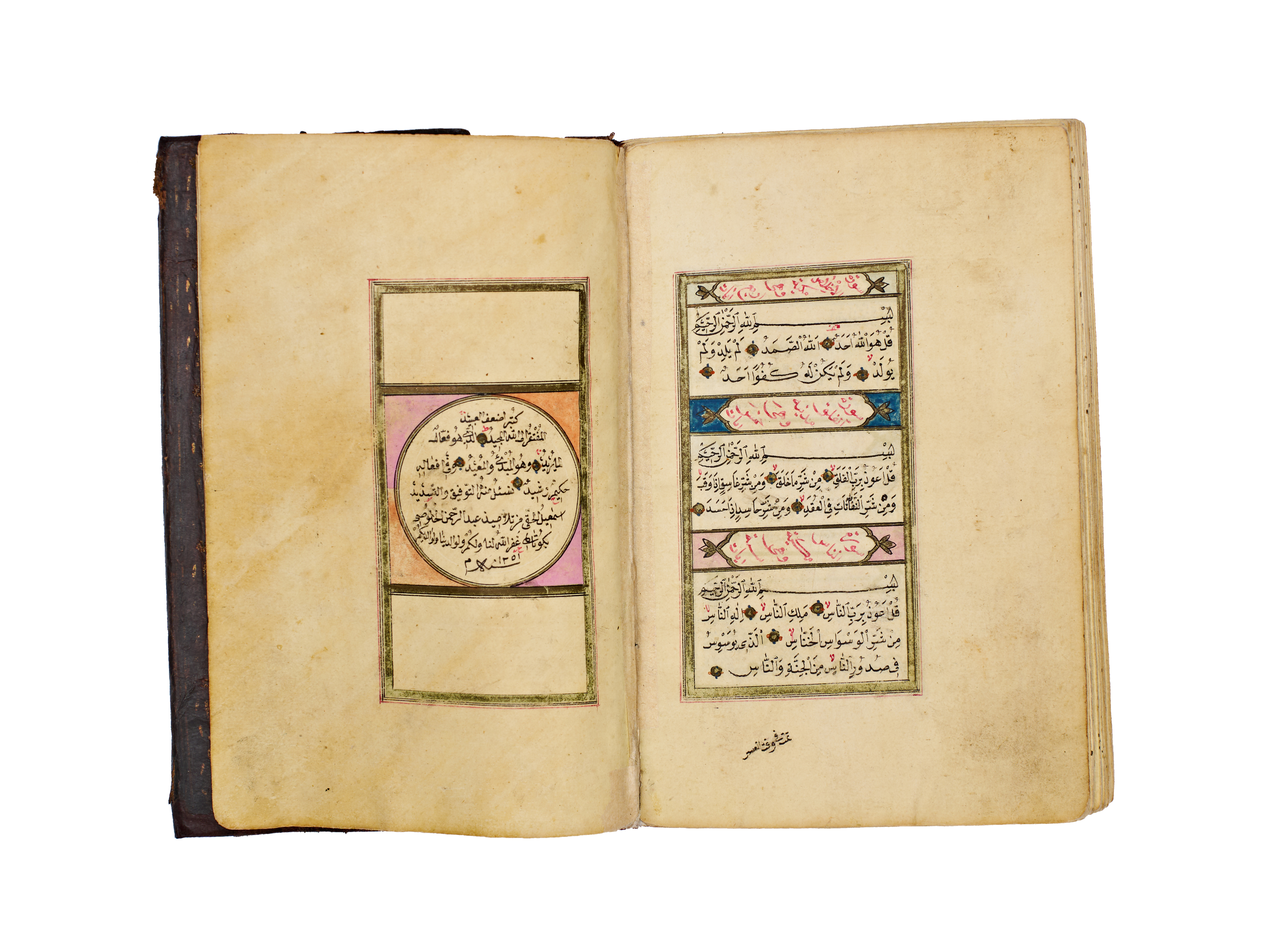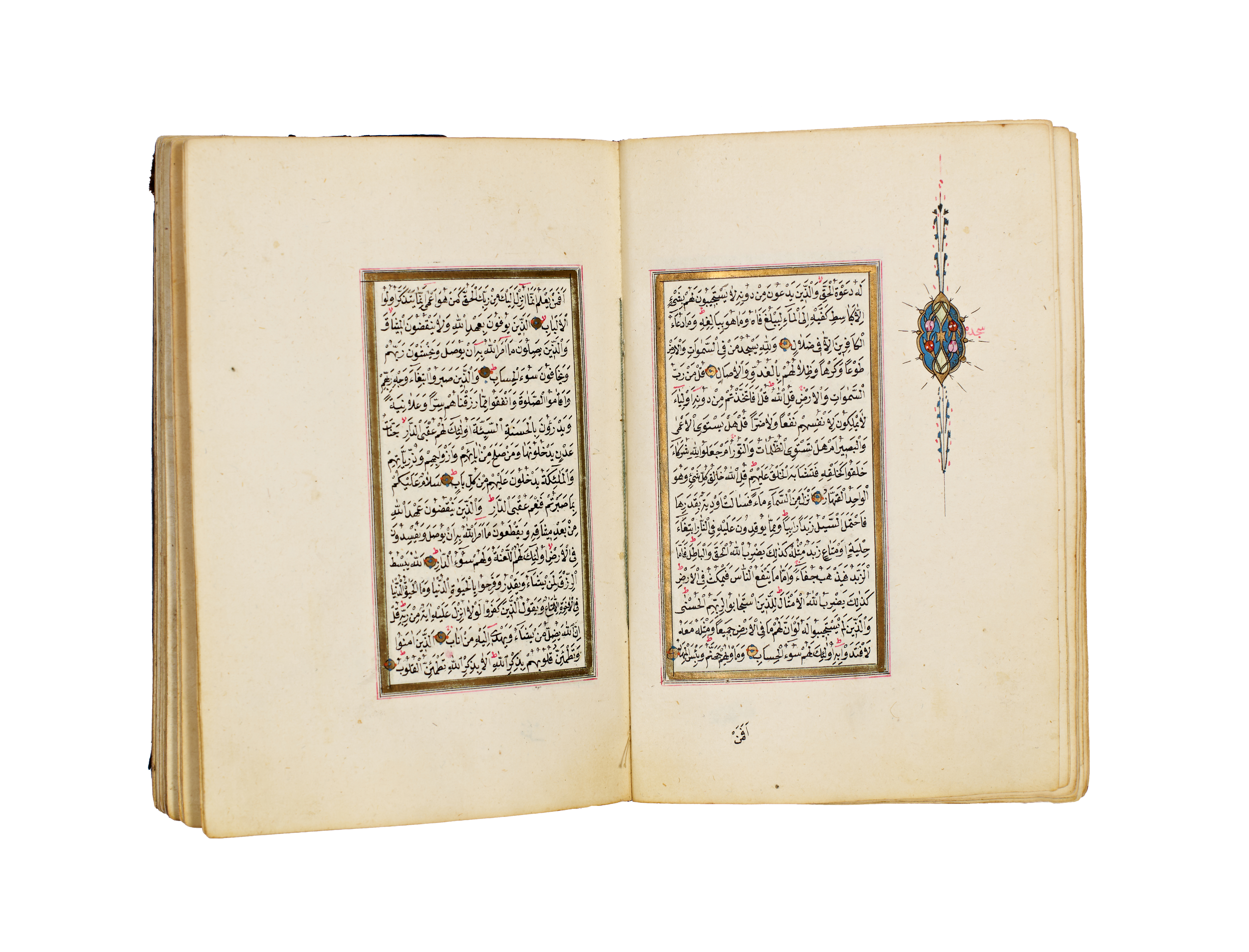 This illuminated Ottoman Quran is bound in dark brown leather featuring decorative gold-tooled medallions and corner ornaments. The text is written in Arabic Naskh script on cream-colored paper. The manuscript includes gold verse markers and red diacritics. Extensive illumination is present on the opening pages and throughout the headers, utilizing gold leaf and colorful pigments in intricate floral patterns. A colophon is visible on a final page within a circular frame, bearing a Hijri date corresponding to the mid-19th century.