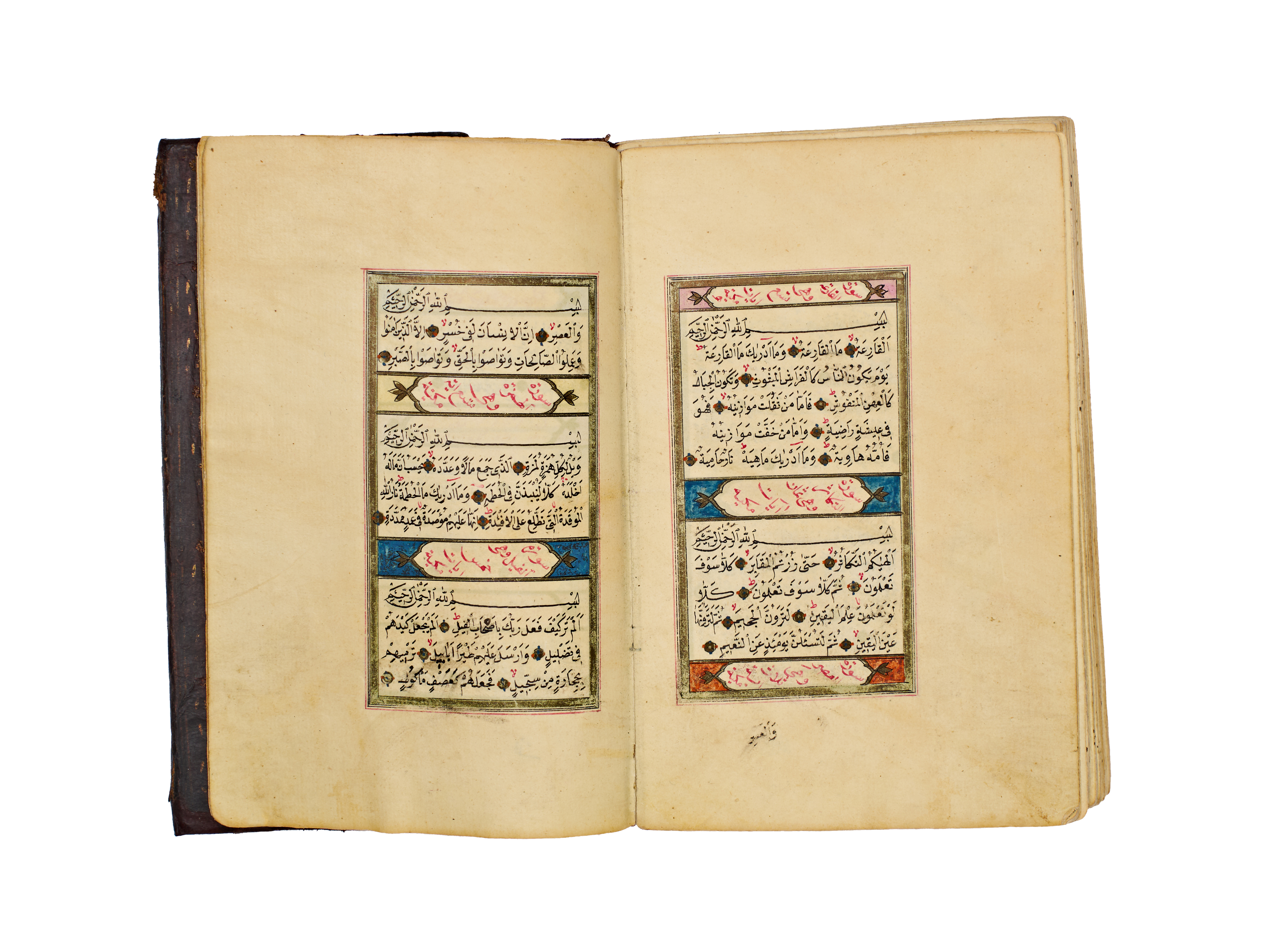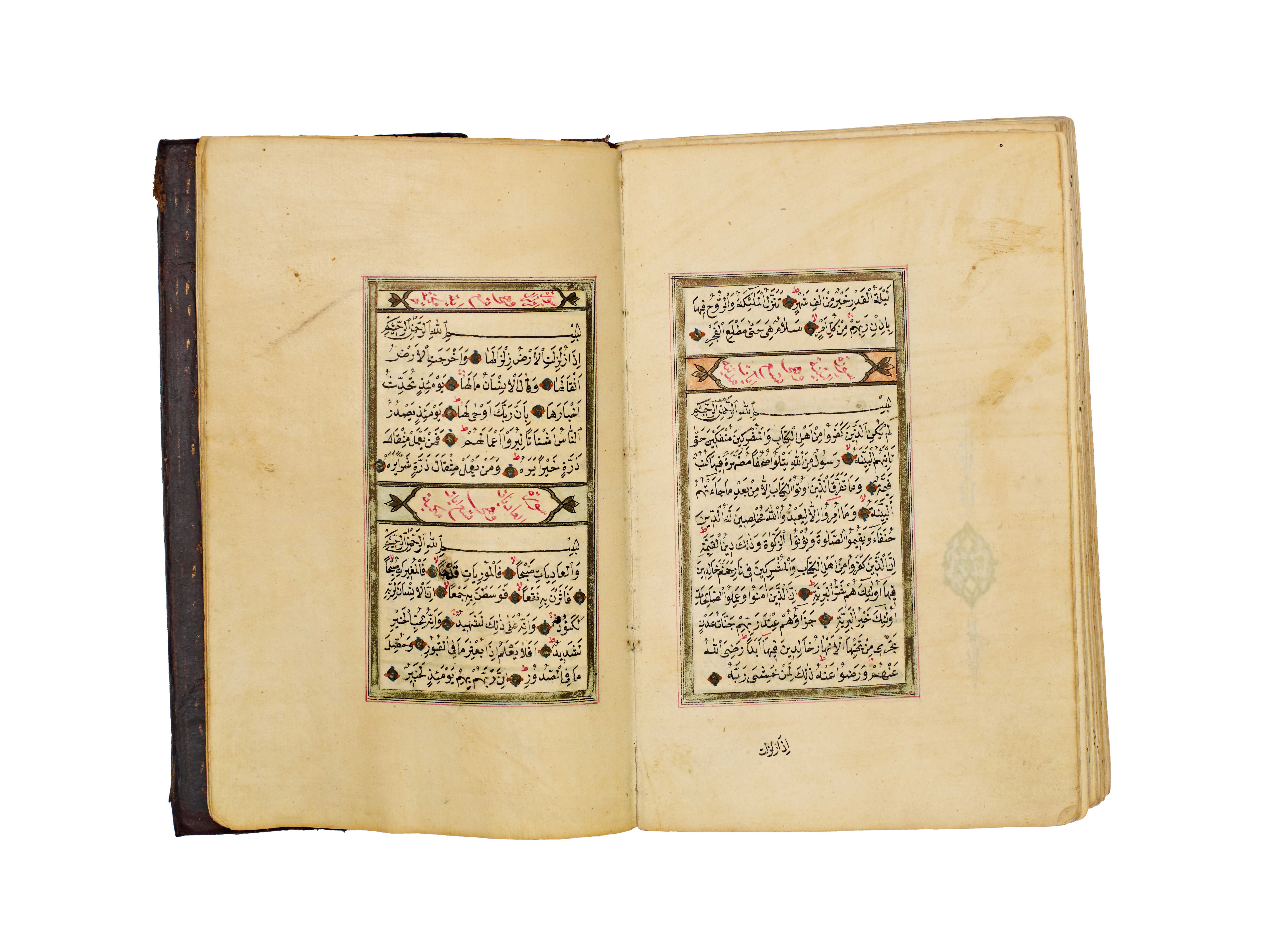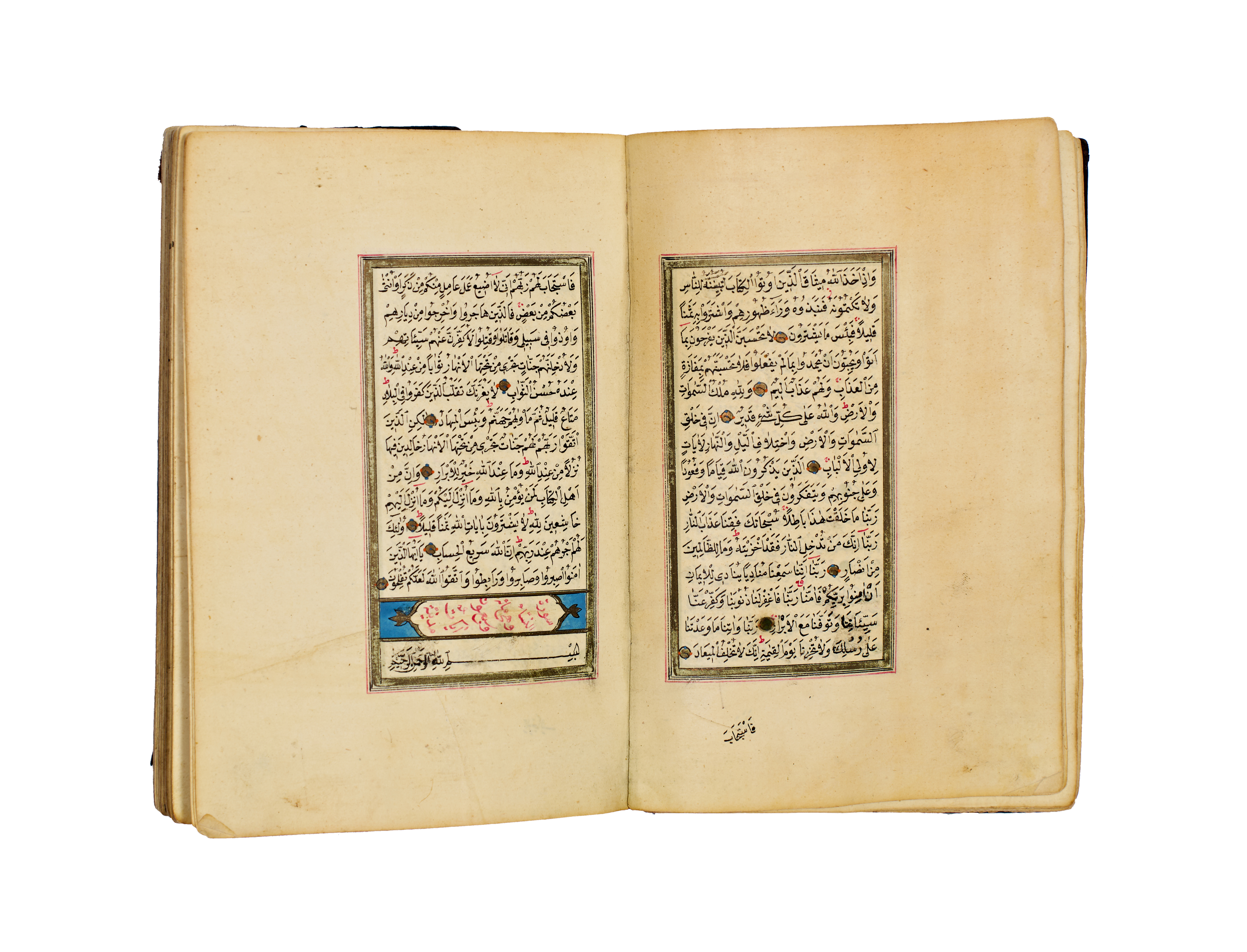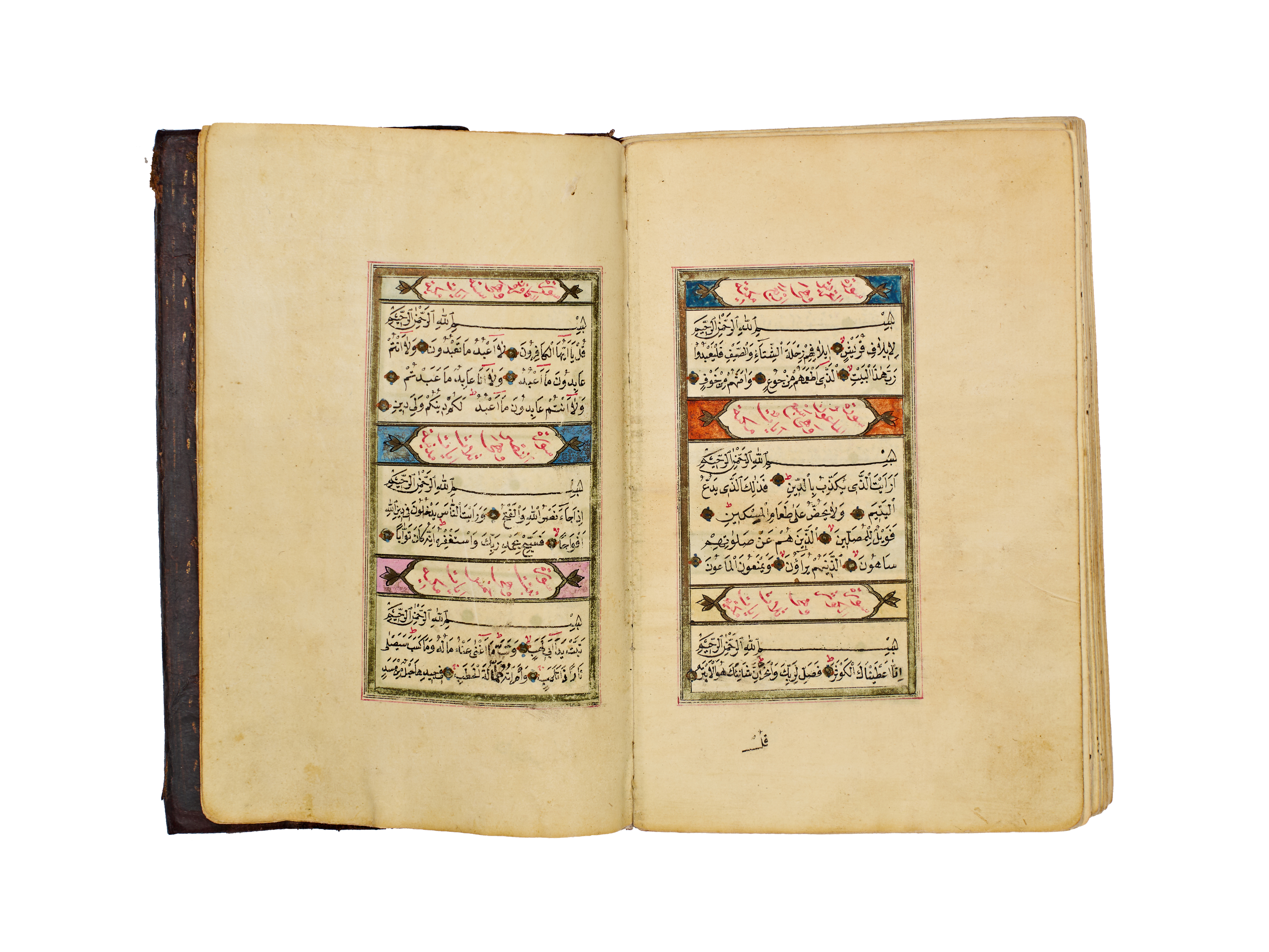 This illuminated Ottoman Quran is bound in dark brown leather featuring decorative gold-tooled medallions and corner ornaments. The text is written in Arabic Naskh script on cream-colored paper. The manuscript includes gold verse markers and red diacritics. Extensive illumination is present on the opening pages and throughout the headers, utilizing gold leaf and colorful pigments in intricate floral patterns. A colophon is visible on a final page within a circular frame, bearing a Hijri date corresponding to the mid-19th century.