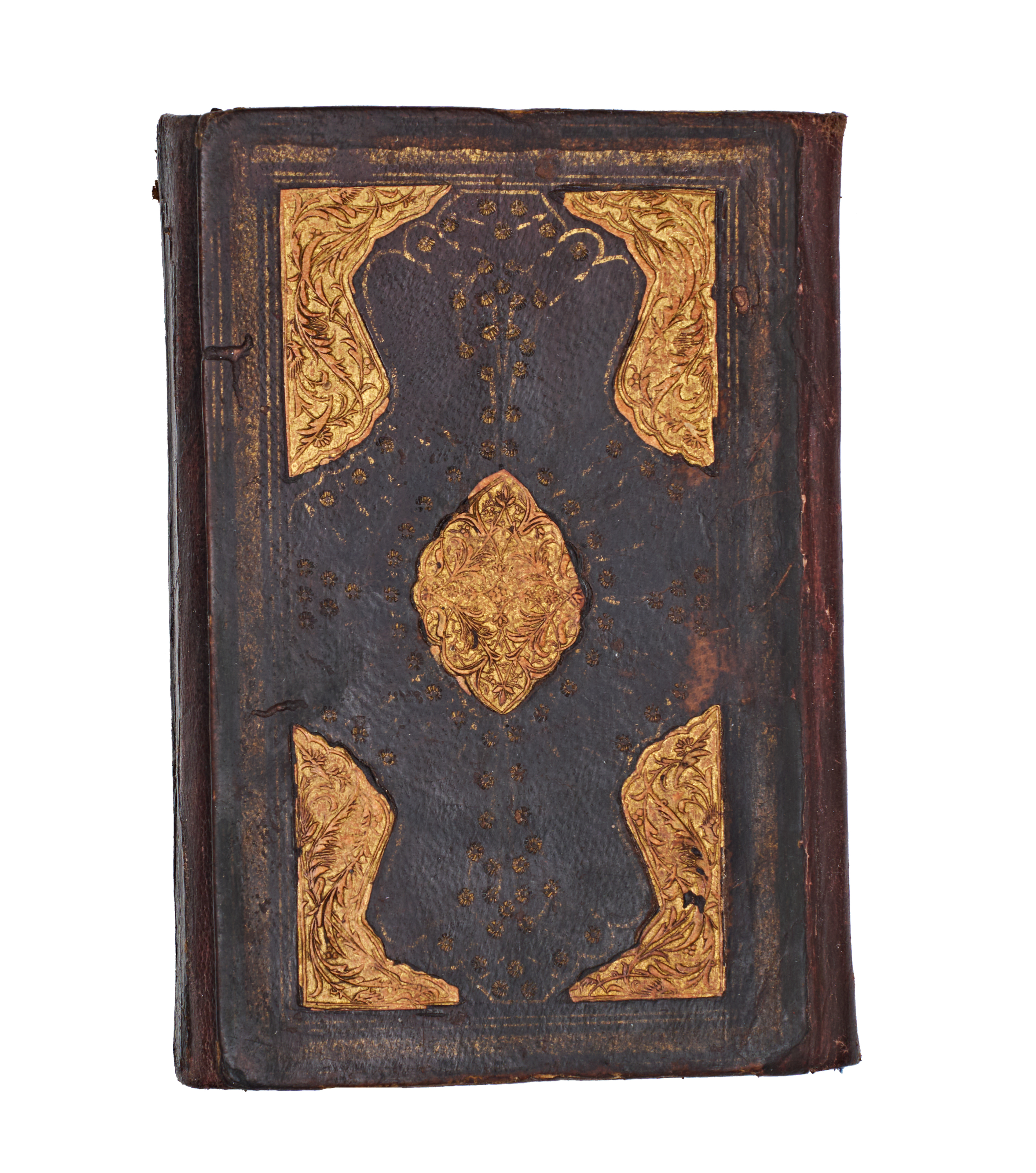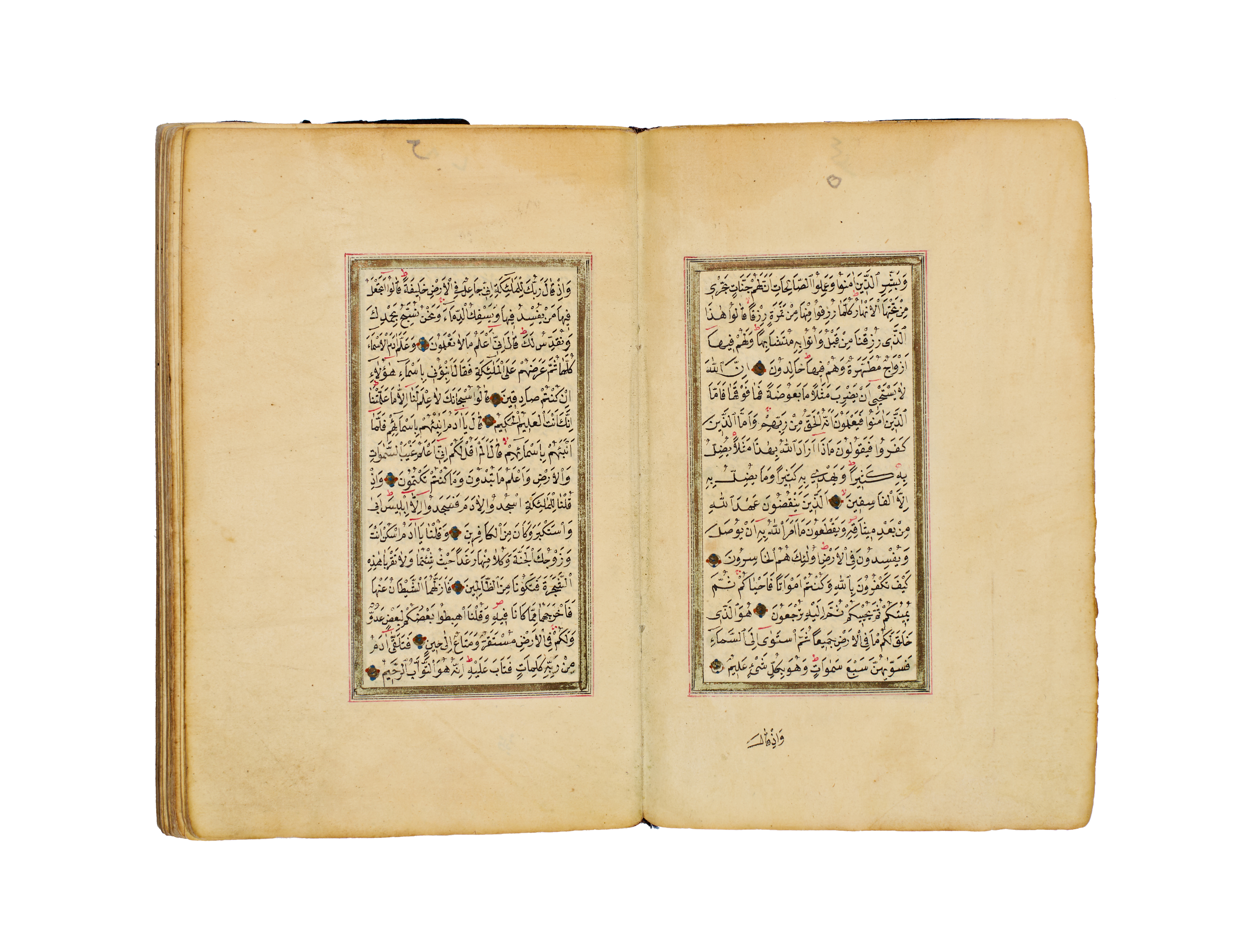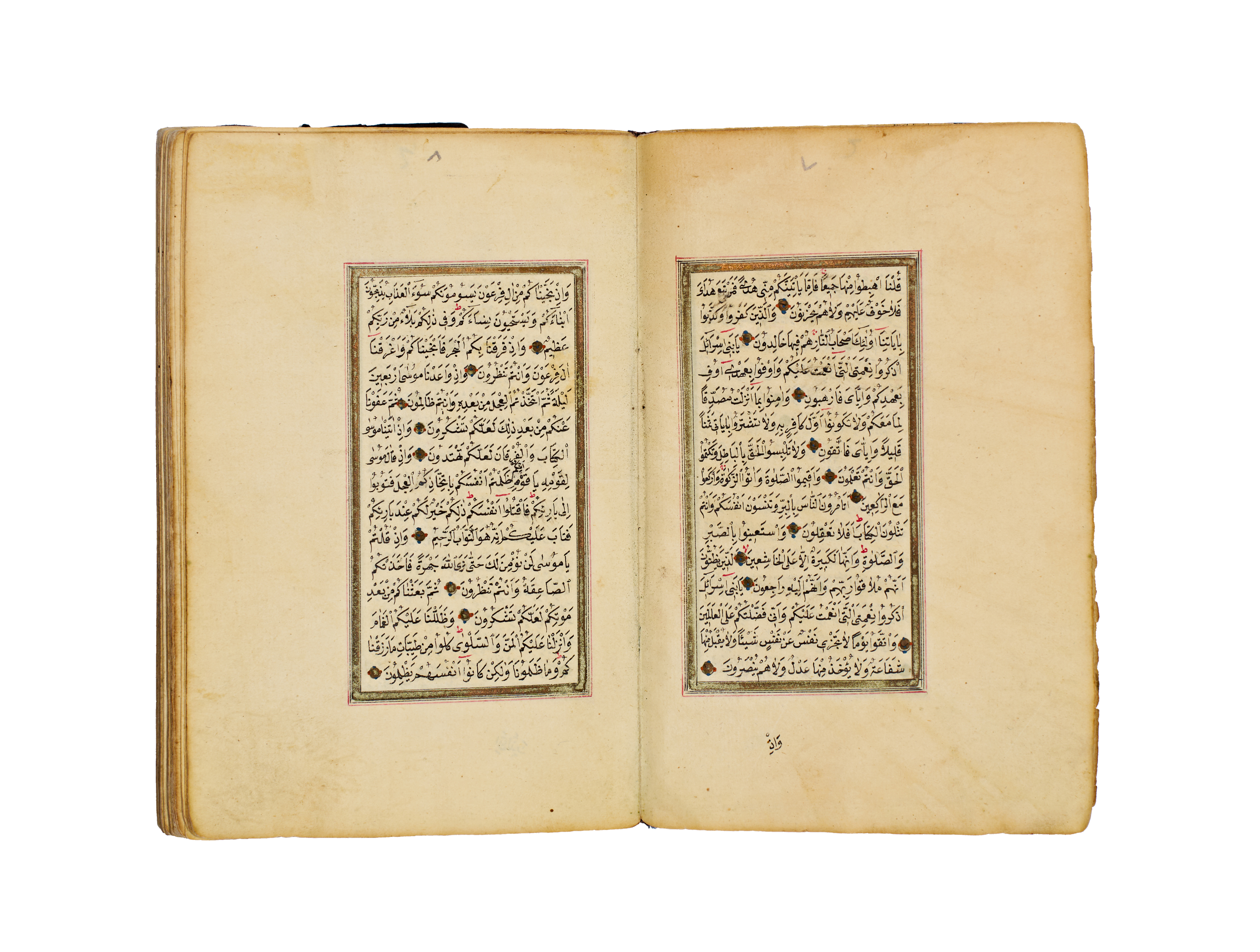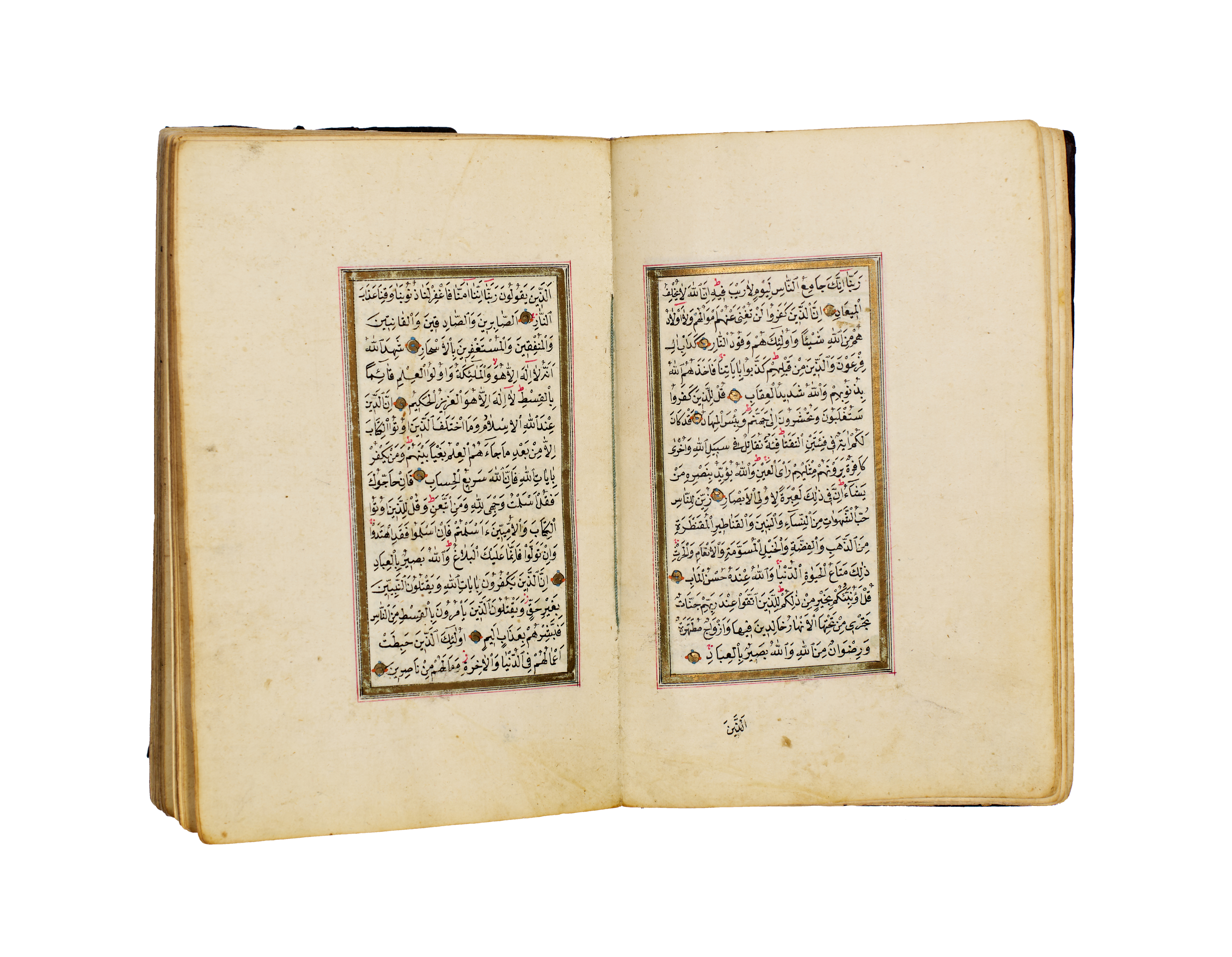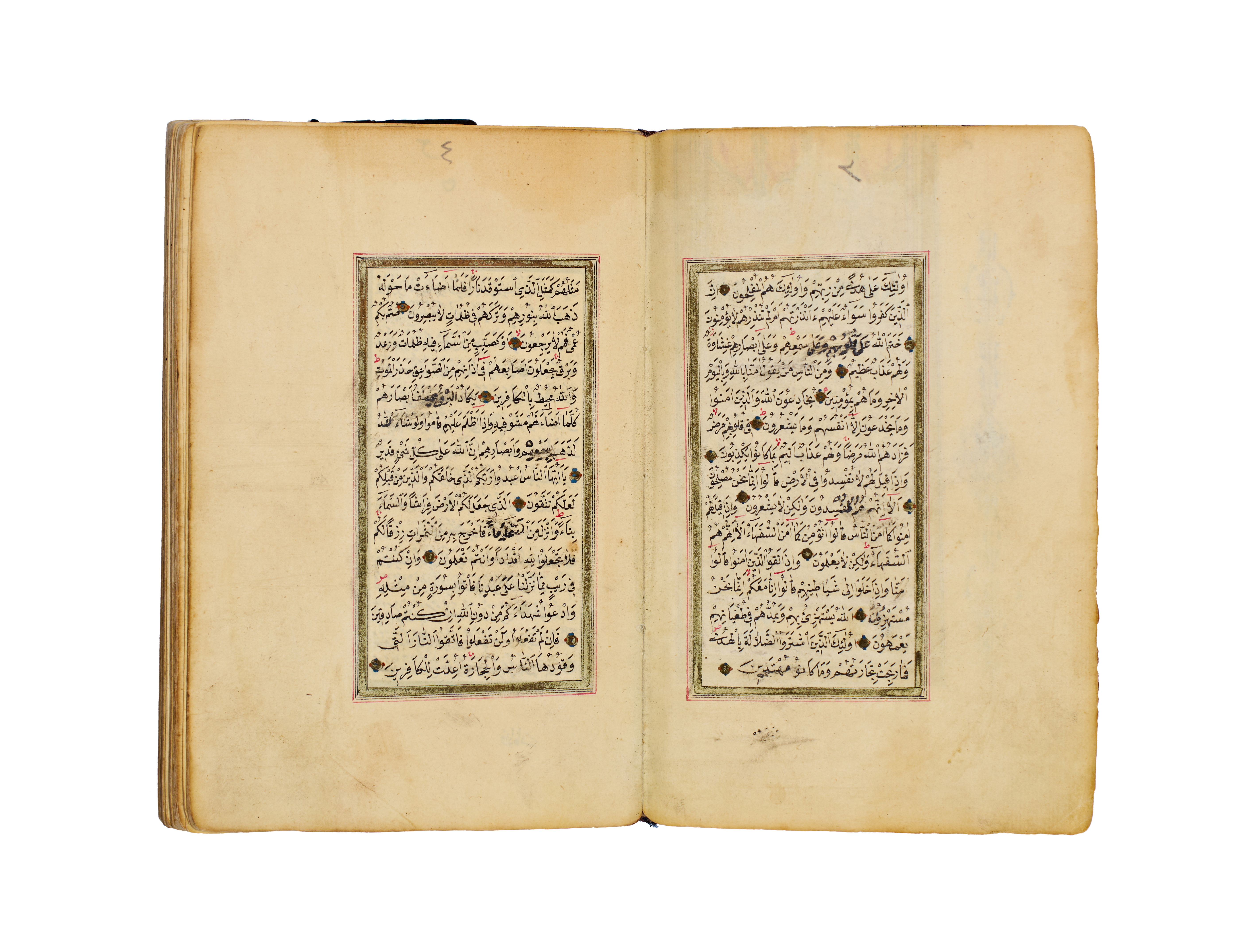 This illuminated Ottoman Quran is bound in dark brown leather featuring decorative gold-tooled medallions and corner ornaments. The text is written in Arabic Naskh script on cream-colored paper. The manuscript includes gold verse markers and red diacritics. Extensive illumination is present on the opening pages and throughout the headers, utilizing gold leaf and colorful pigments in intricate floral patterns. A colophon is visible on a final page within a circular frame, bearing a Hijri date corresponding to the mid-19th century.