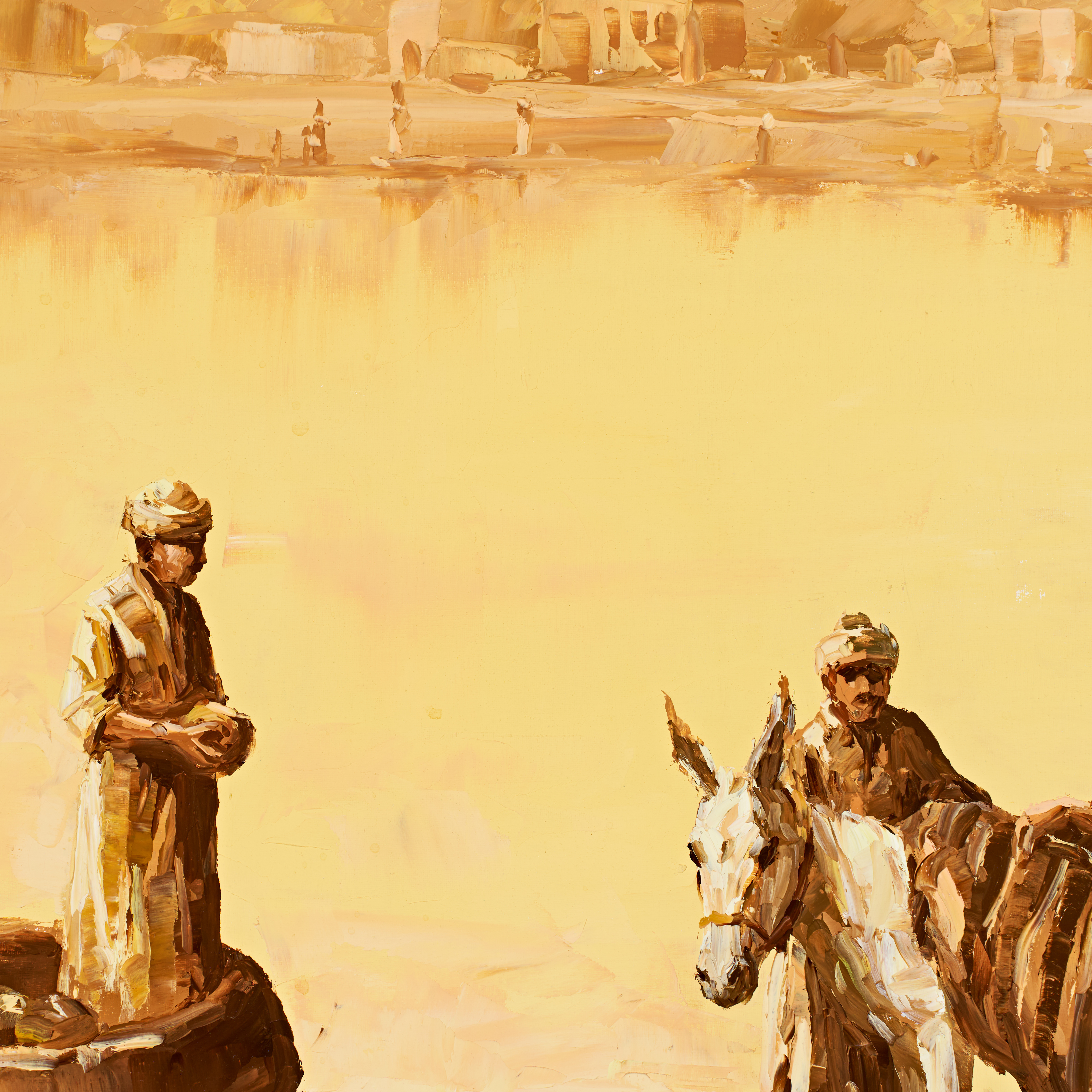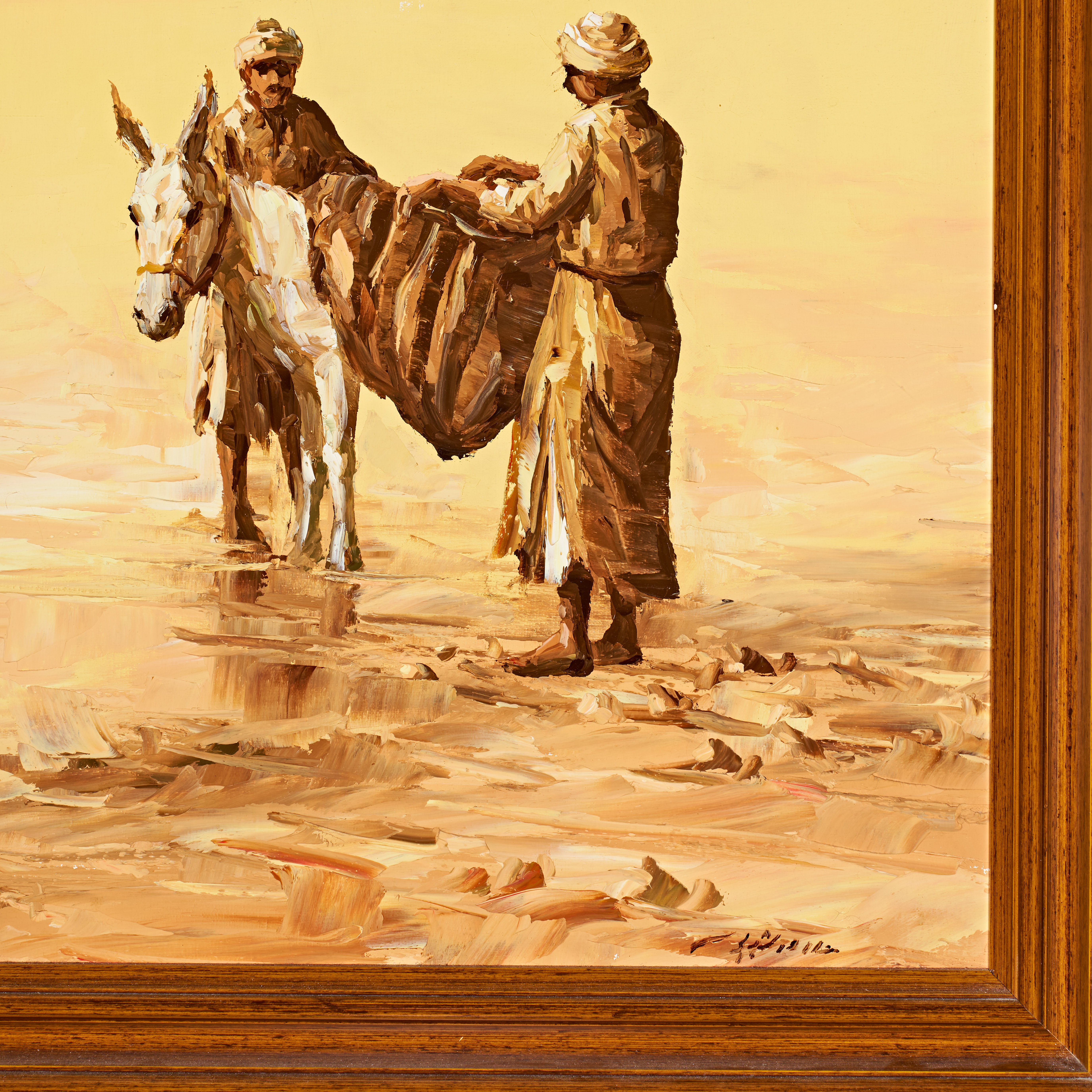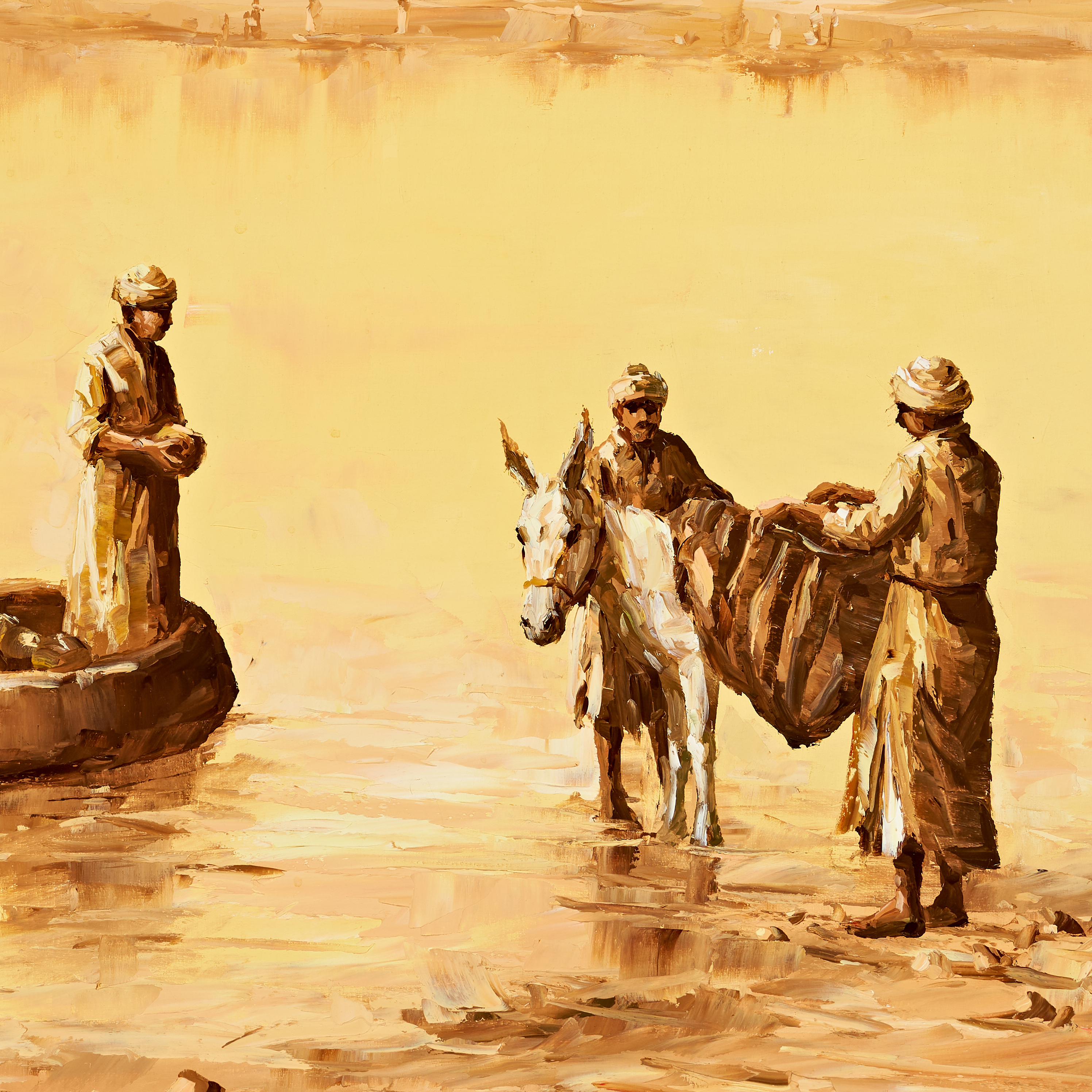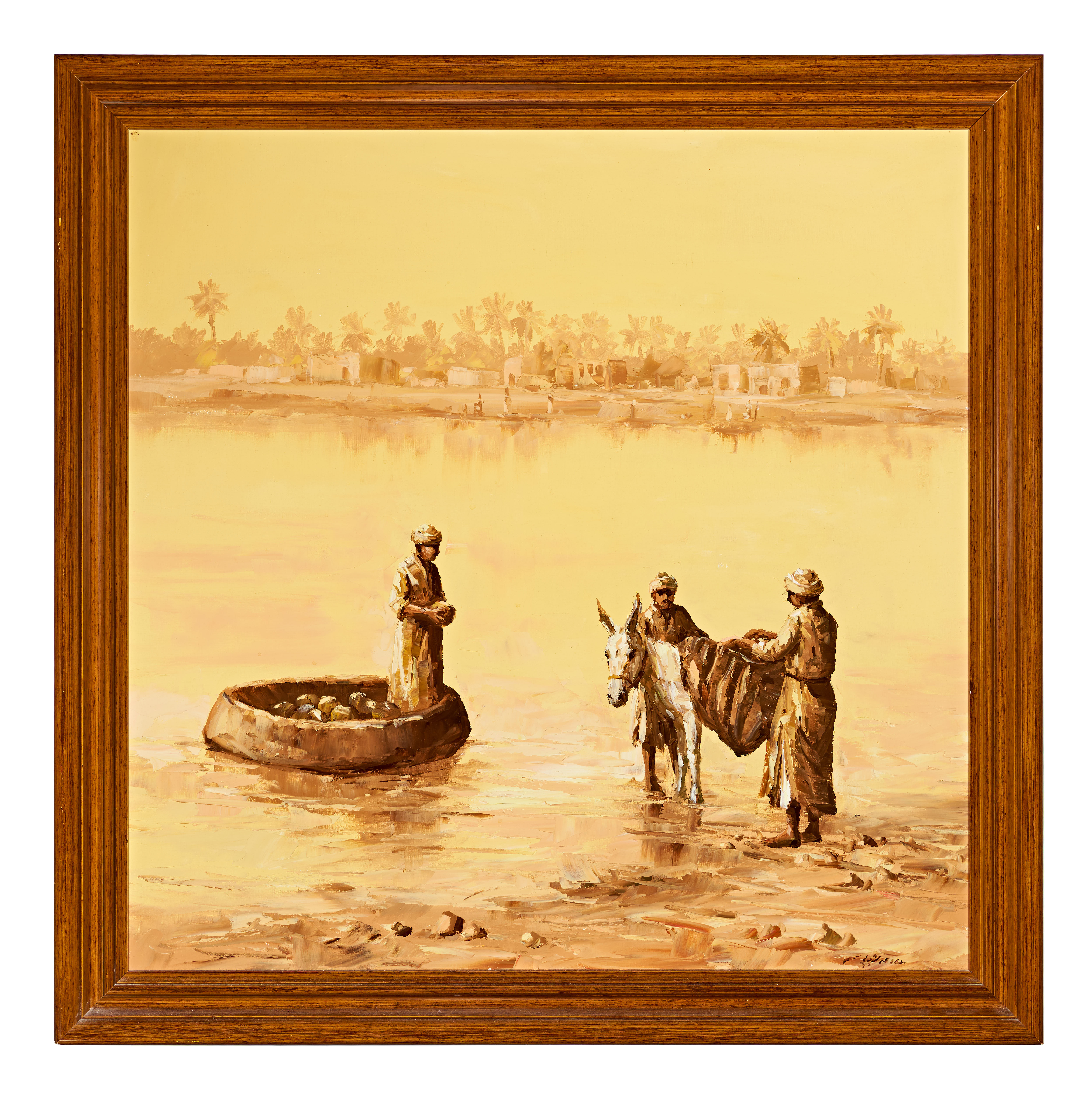 This oil on canvas by Iraqi artist Alaa Al Shbli depicts a Middle Eastern scene rendered in a warm palette of ochres, yellows, and browns. The impressionistic composition features three men in traditional robes and turbans: one figure stands within a circular quffa boat on the water, while another sits atop a white donkey on the shore as a third man assists with a large sack. A village with palm trees and low-profile buildings is visible along the distant horizon line. The work is characterized by heavy impasto and textured brushwork, particularly in the foreground figures. The artist signature in Arabic is located in the lower right corner. The painting is set in a multi-tiered wooden frame. The reverse shows the canvas stretched on a wooden frame with a small gallery label on the lower edge.