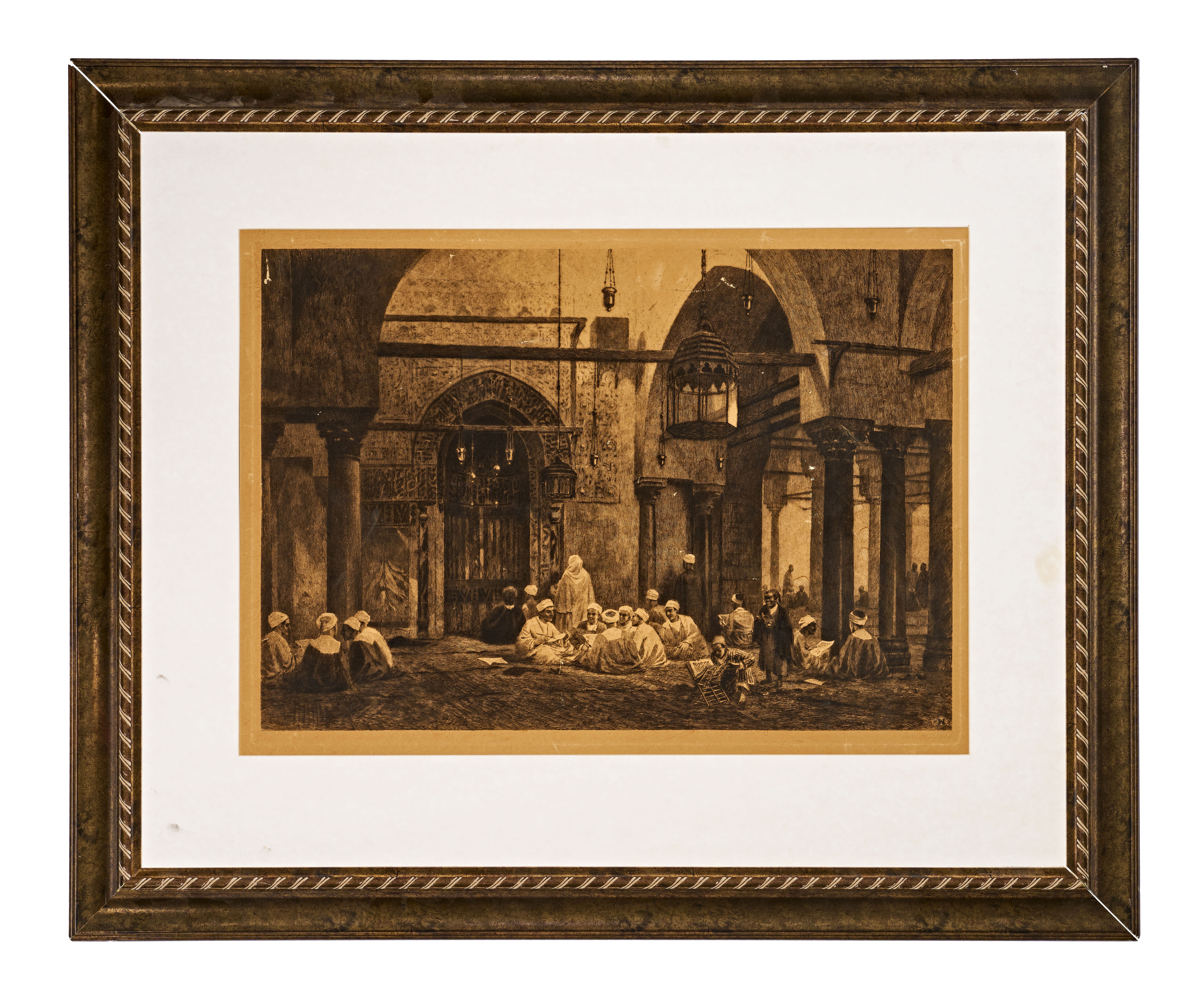 An etching on paper by Axel Herman Haig titled Arab Students, Cairo, Egypt. This Orientalist work depicts a group of figures in traditional robes and turbans seated on a carpeted floor within a mosque or madrasa interior. Several individuals are shown reading from large texts resting on ornate folding stands, while others engage in conversation. The architectural setting features columns, arches, and large hanging lamps. The plate is marked with the artist monogram and the date 90 in the lower right corner. A faint pencil signature is present in the lower margin. The piece is housed in a carved wooden frame with gilt accents and a wide white mat. The reverse features a wooden backing board with various handwritten inventory markings including MAR 273066 and a circled 371 above date sequences.