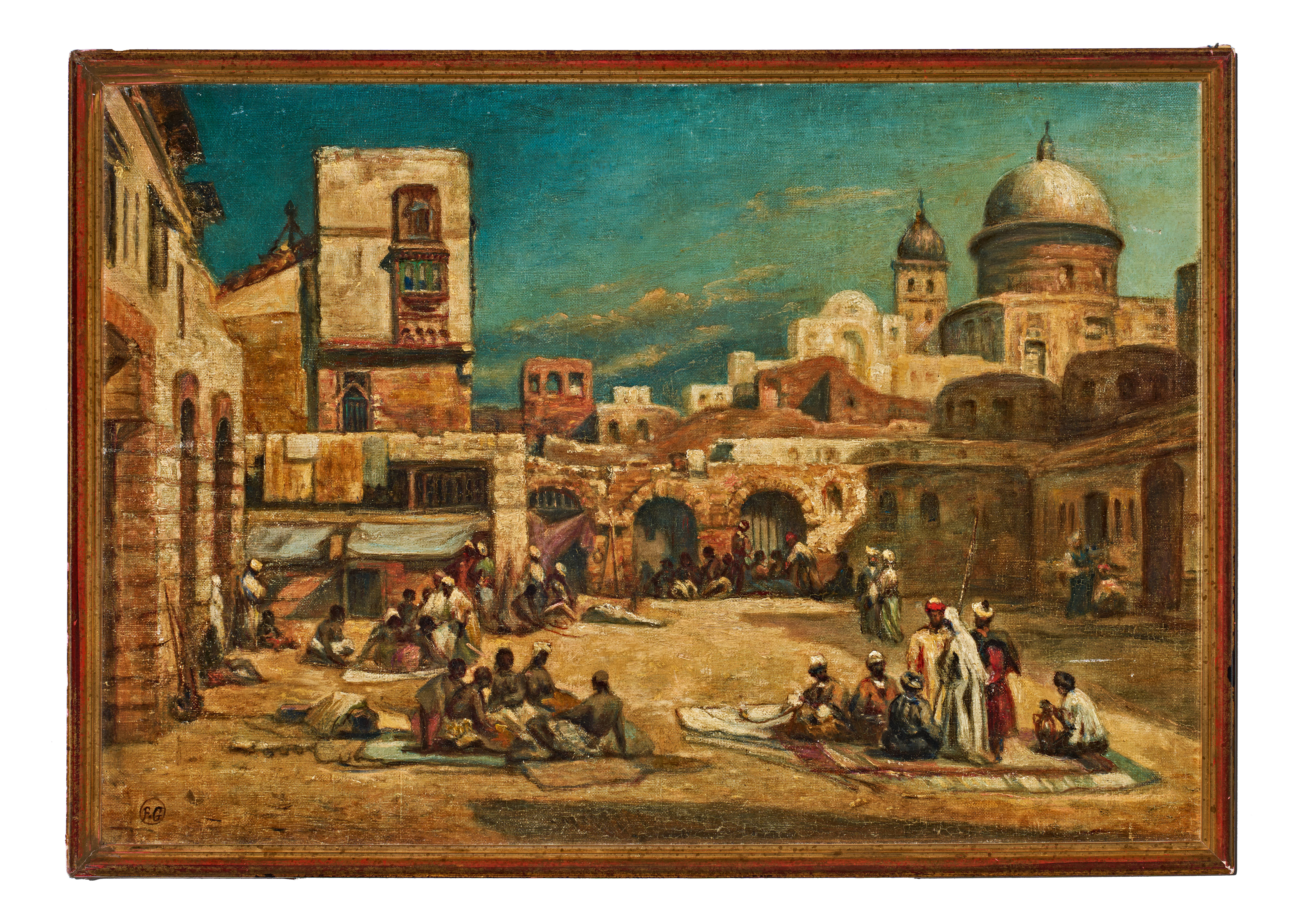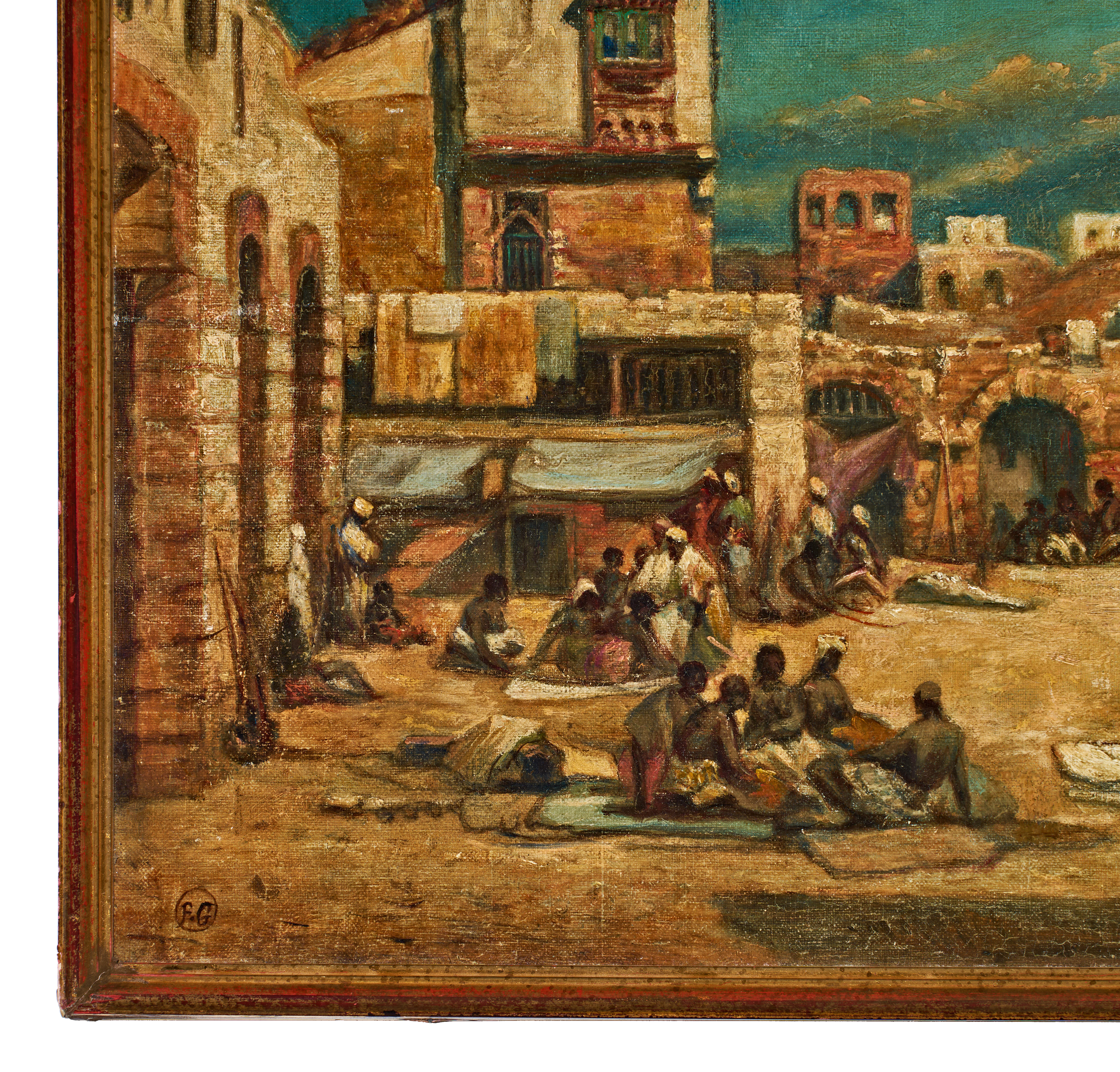 This Orientalist School oil on canvas painting depicts a bustling Middle Eastern or North African town square. The composition features historic masonry architecture with arched portals, a prominent domed building, and minarets set against a bright blue sky. Numerous figures in traditional attire are dispersed throughout the foreground and mid-ground, with some seated on rugs while others stand in groups. The work exhibits a painterly style with visible brushwork and is monogrammed F.G. within a circle in the lower-left corner. The canvas is mounted on a wooden stretcher and housed in a simple, red-stained wooden frame.