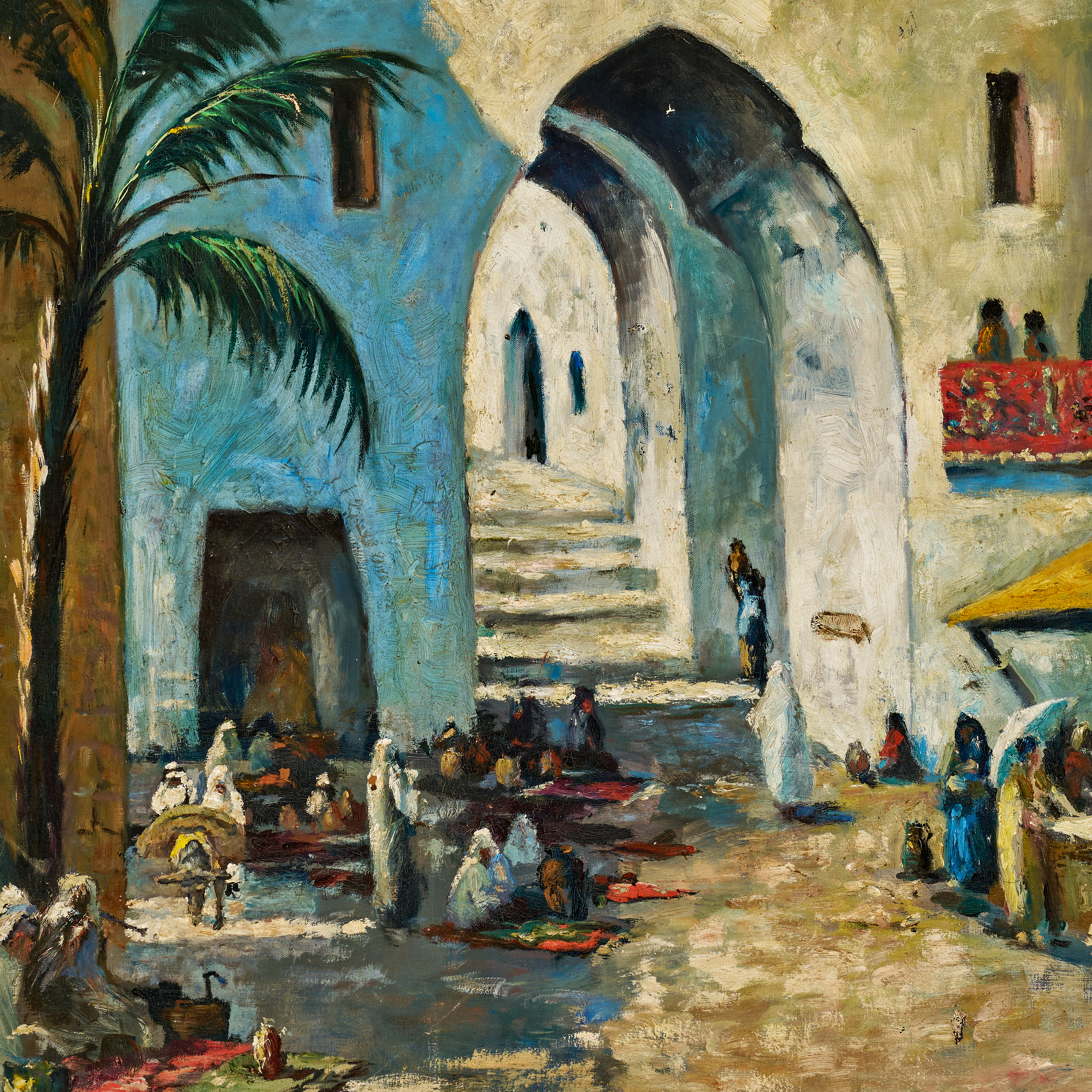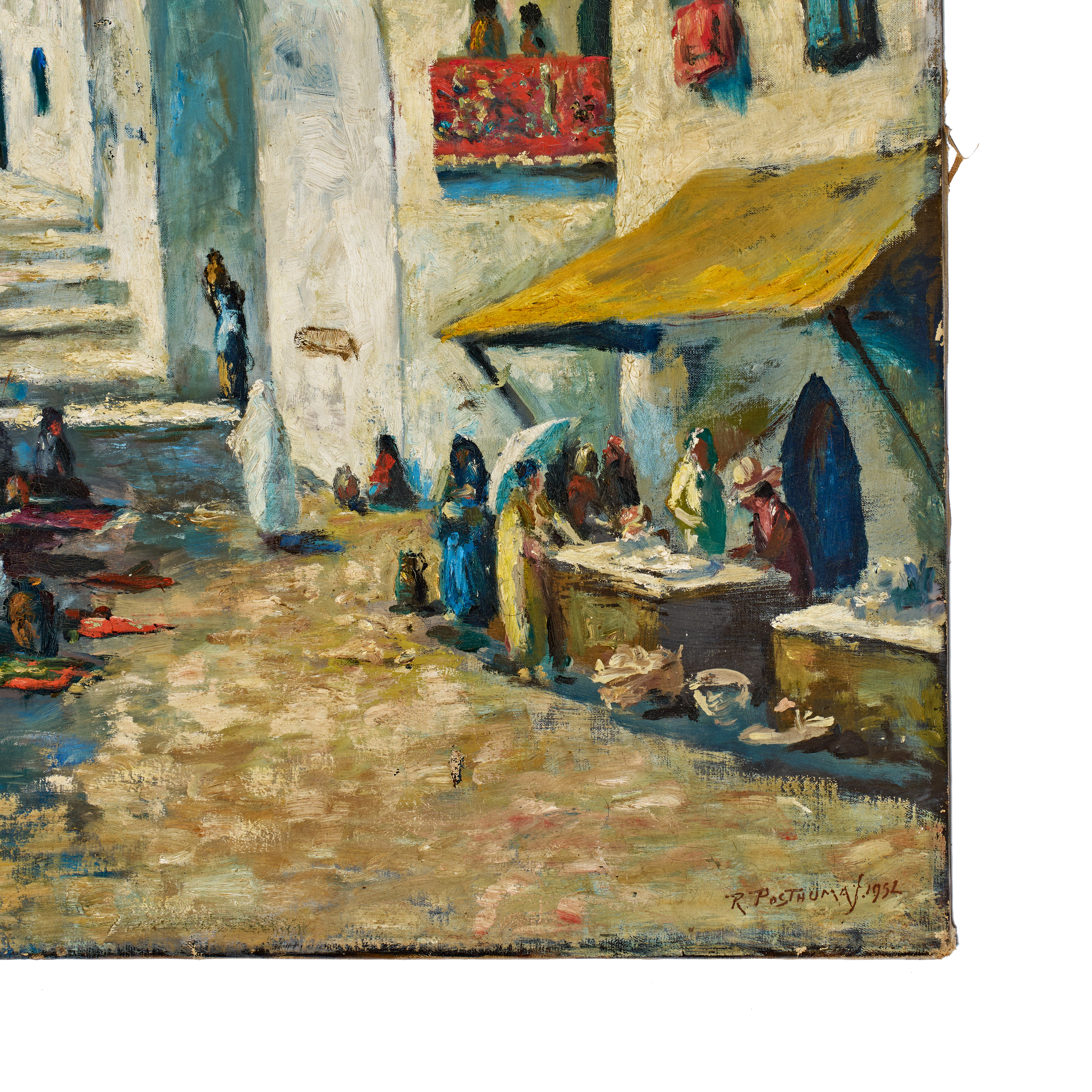 This oil on canvas painting depicts a vibrant Middle Eastern or North African street scene in an Orientalist style. The composition features several figures in traditional dress gathered in a sunny courtyard before a large arched gateway and buildings, one of which is topped with a decorative dome and a crescent moon finial. A prominent palm tree stands to the left, and market stalls are visible to the right. The work is executed with visible, impressionistic brushwork and a palette of bright blues, whites, and earthy tones. It is signed and dated R. POSTHUMA 1952 in the lower right corner. The canvas is mounted on a wooden stretcher.