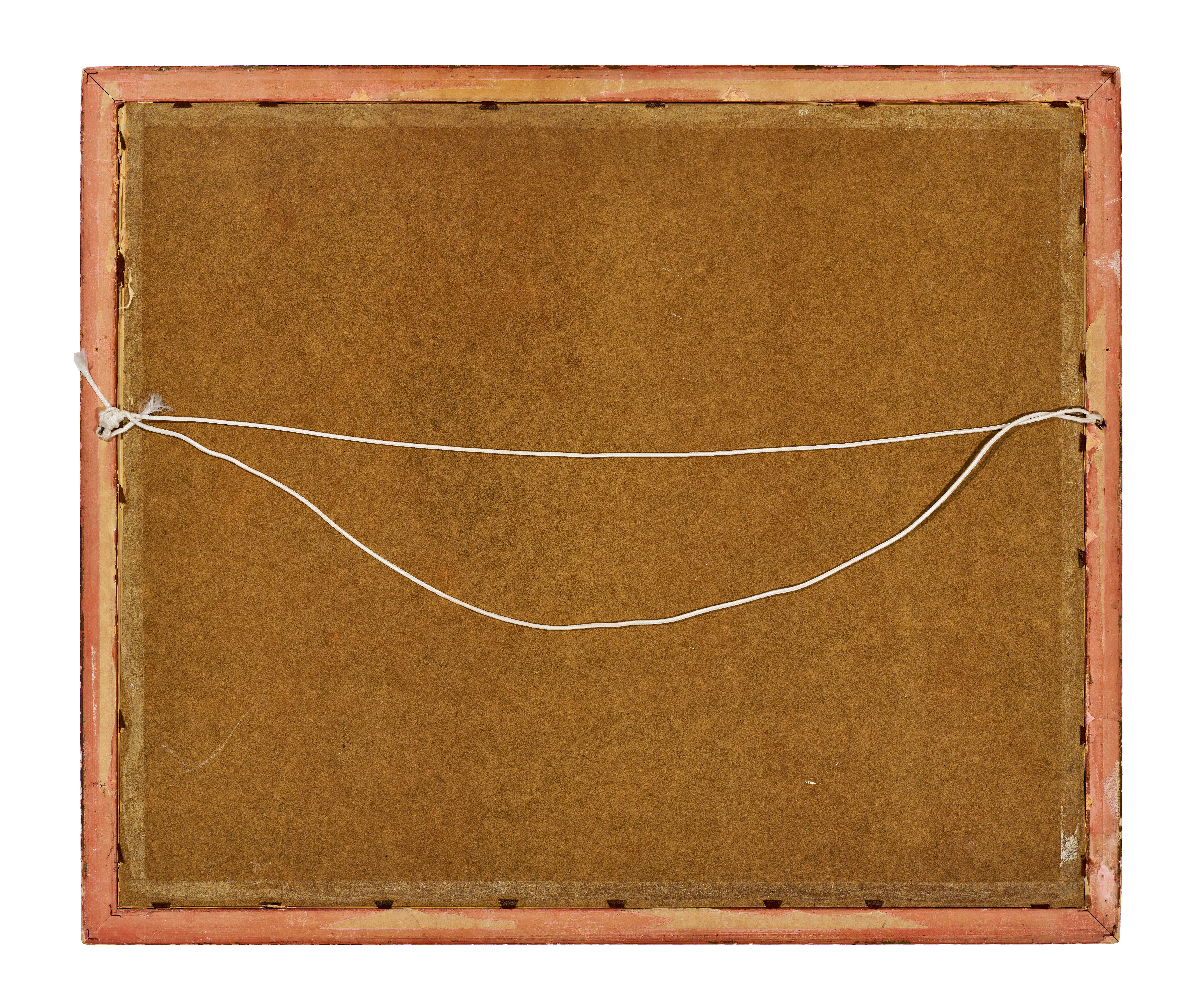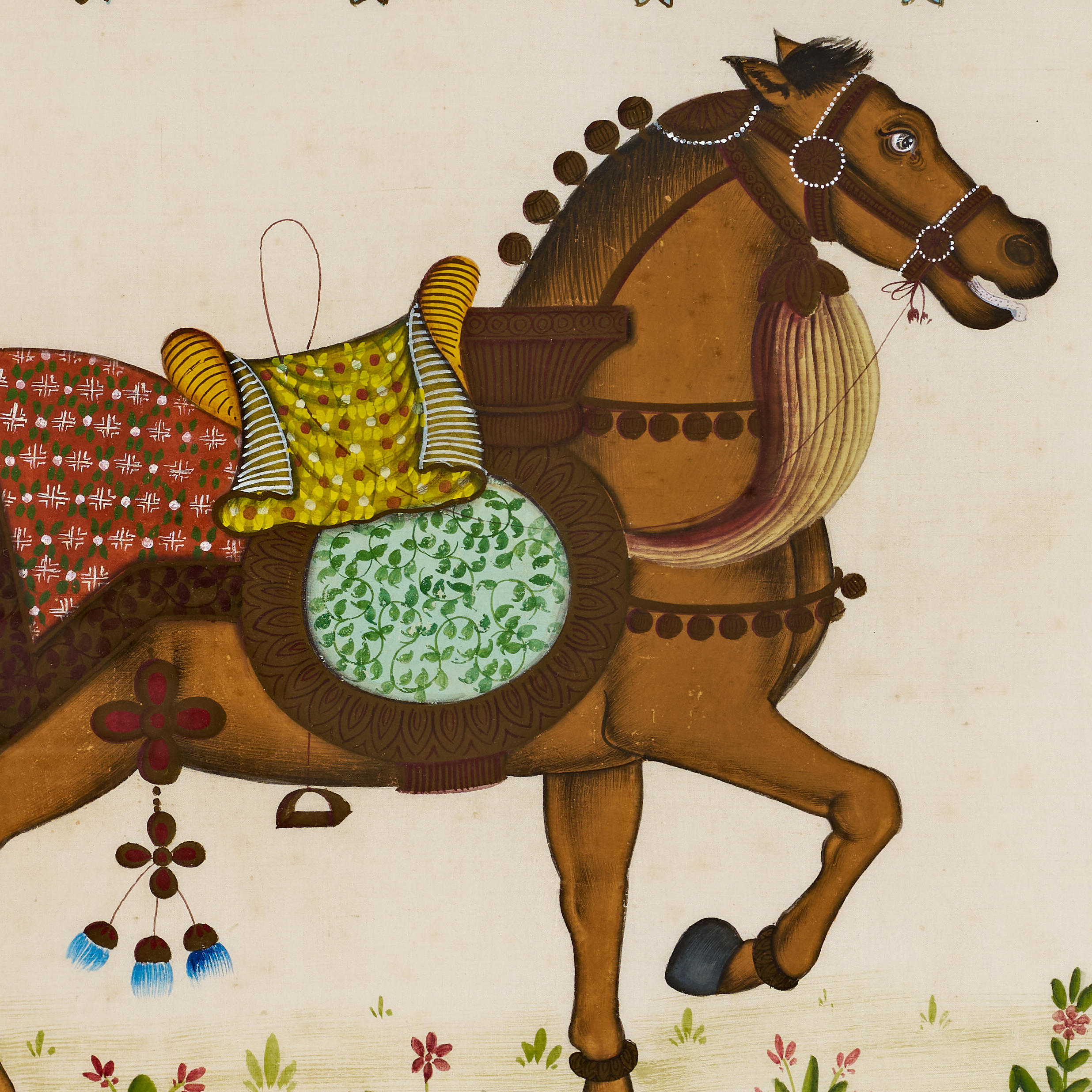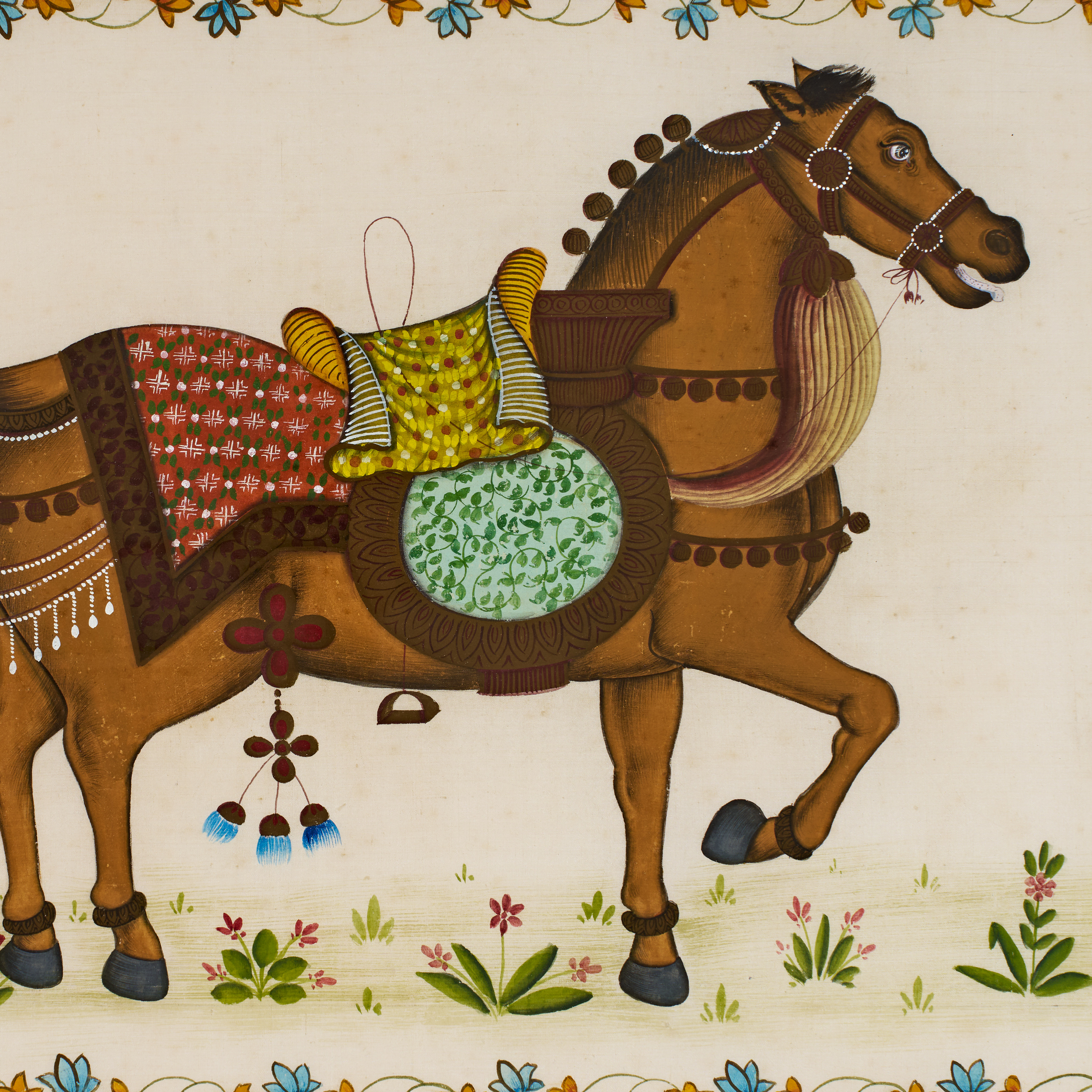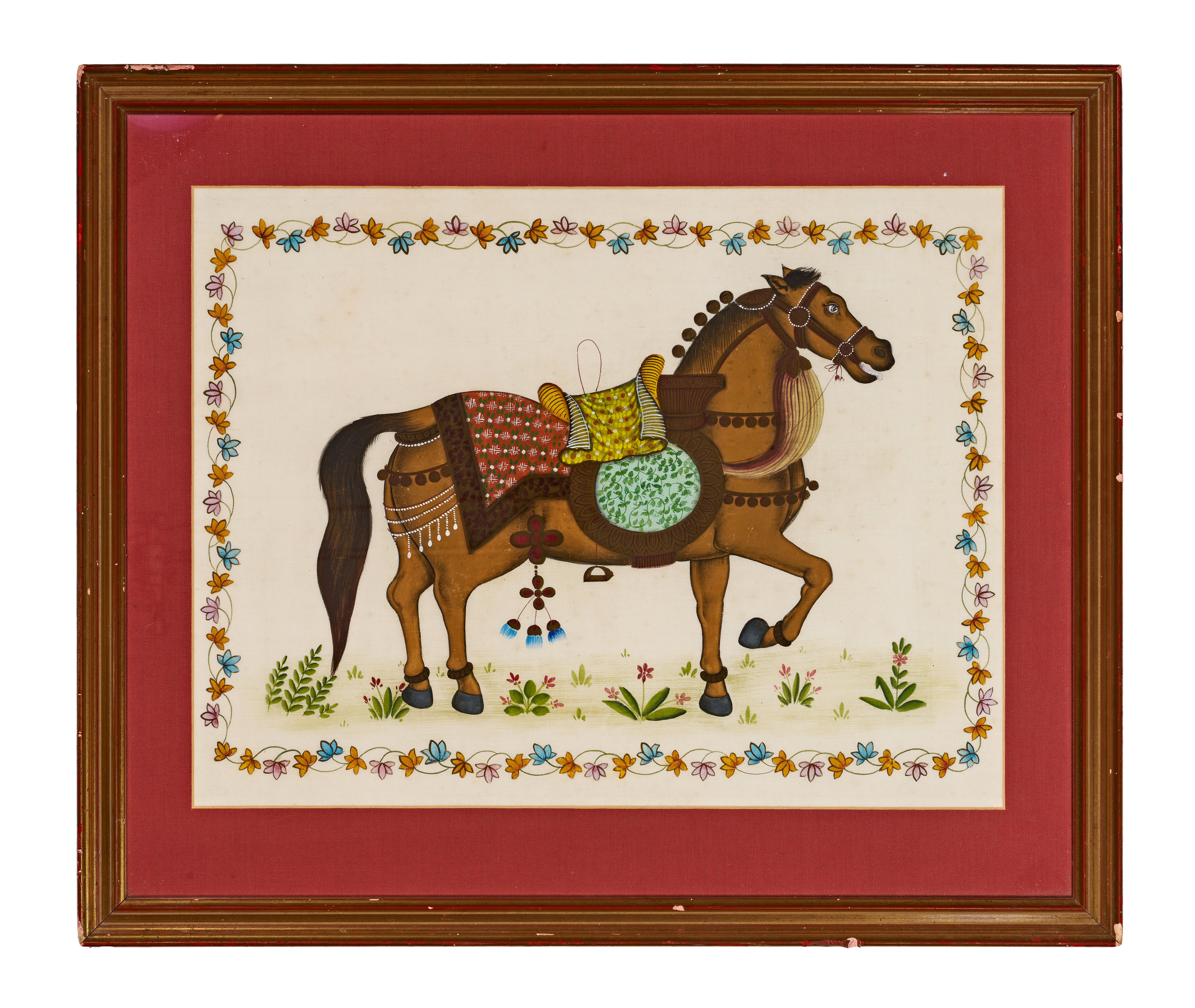 This Indian miniature painting depicts a caparisoned brown horse in profile, rendered in the Rajput or Company school tradition. The horse is decorated with tack including a saddle with a red and green patterned cloth, a central circular green floral medallion, and multiple hanging blue and brown tassels. The figure is set against a light ground with stylized floral sprigs. The central image is framed by a repeating border of multicolored flower blossoms. The artwork is mounted behind glass with a red mat and housed in a gold-toned wooden frame. The reverse is finished with a brown backing board and a white hanging string.