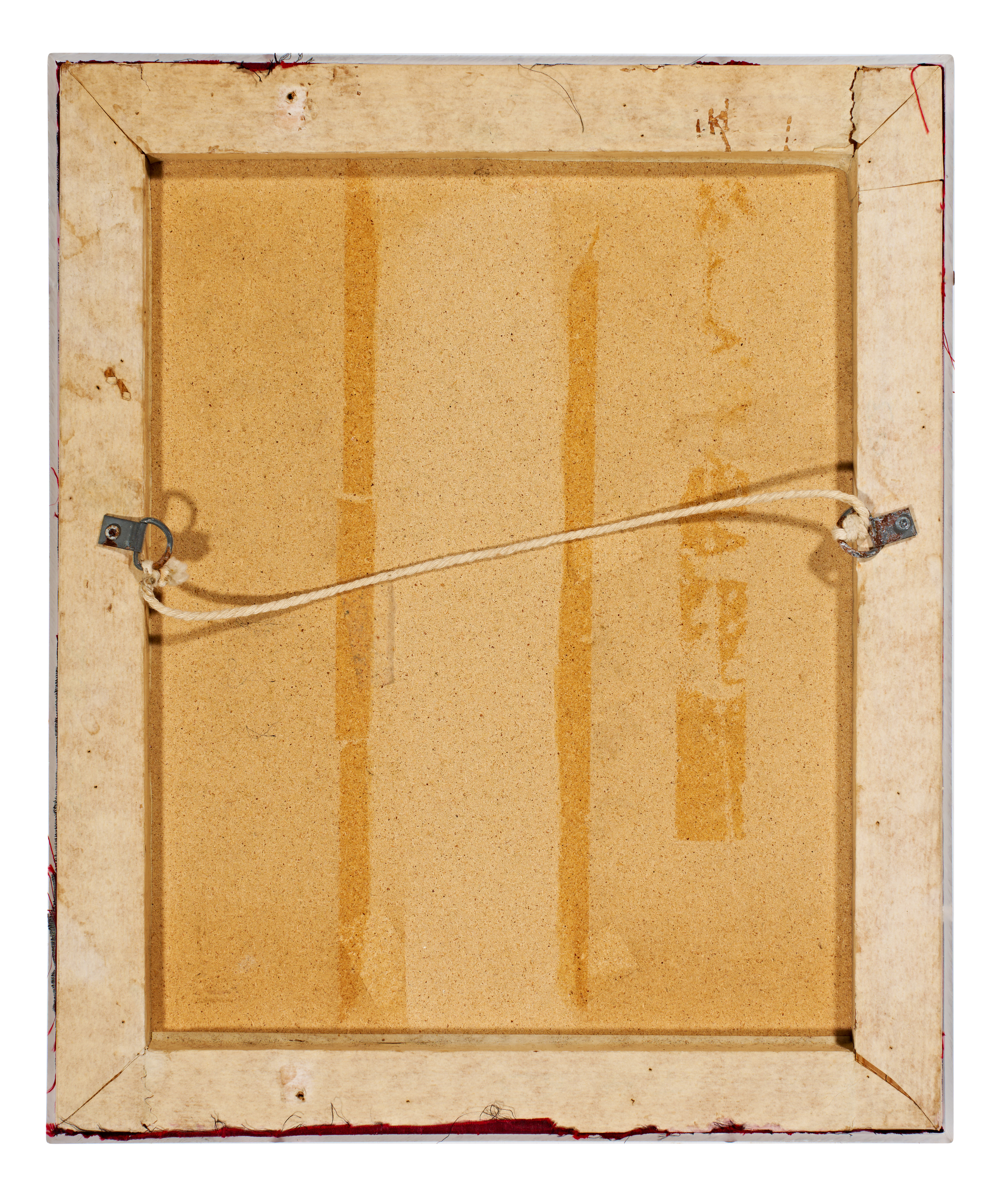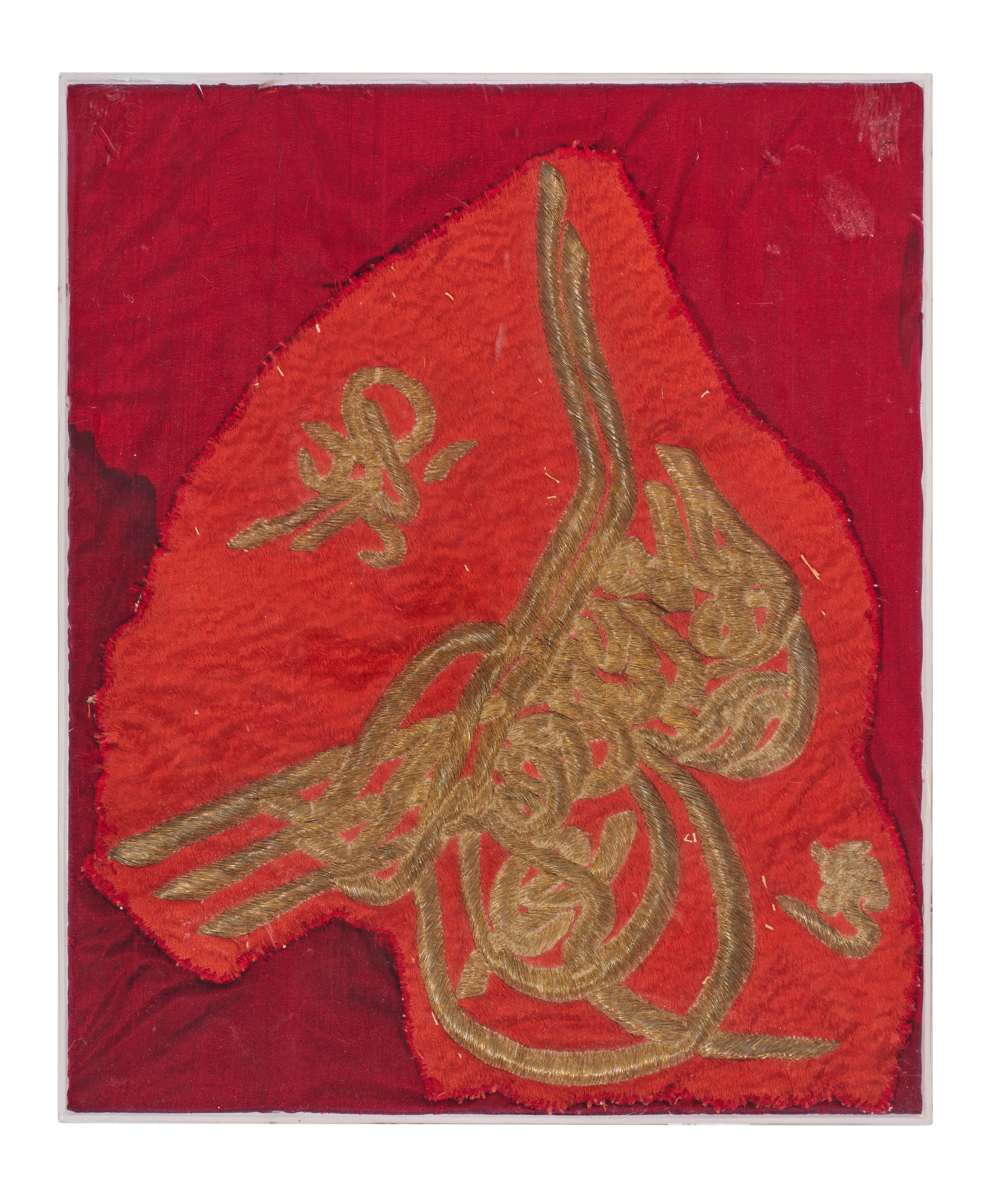 This framed textile fragment from the Ottoman Empire features an imperial calligraphic monogram, or tughra, executed in raised metallic gold-toned embroidery. The monogram is worked onto an irregularly shaped piece of red silk or satin, which is mounted upon a larger, rectangular ground of dark red fabric. The embroidery utilizes high-relief metallic threads to create the complex calligraphic forms characteristic of 19th-century Ottoman textile production. The piece is housed in a simple white frame with a hardboard backing and cord hanging hardware.