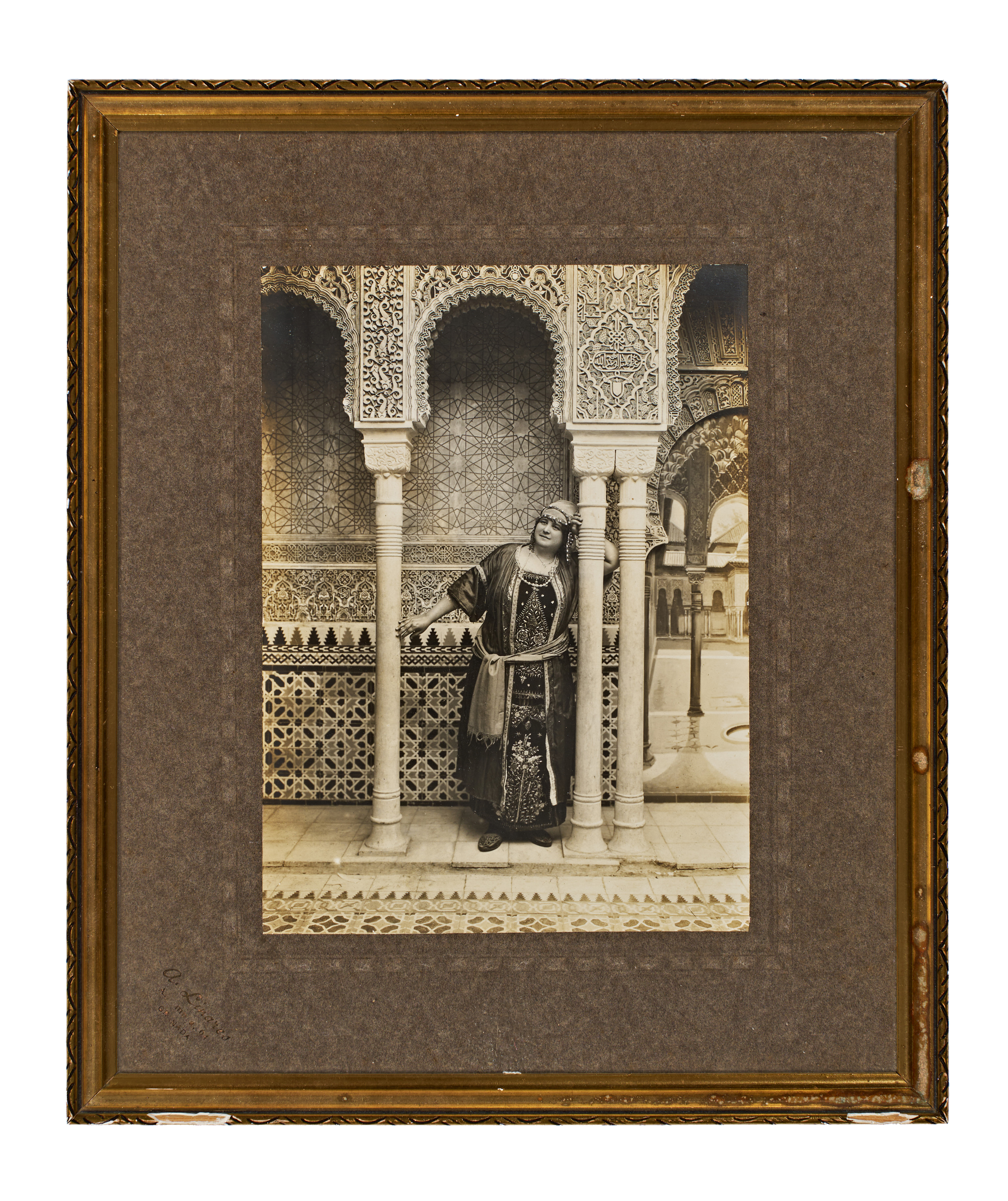 This sepia-toned photograph, produced by the studio of A. Linares in Granada, depicts a woman in ornate traditional Algerian attire and jewelry. The subject is posed between slender marble columns against a backdrop of intricate Moorish tilework and carvings, characteristic of the Alhambra. The lower-left corner of the dark brown matting features a blind stamp for the studio of A. Linares, Granada. The photograph is housed in a simple gilded wood frame. The reverse of the frame includes a business label from Aquitaine-Cadre located in Pauillac, France, along with several adhesive inventory tags and handwritten auction notations.
