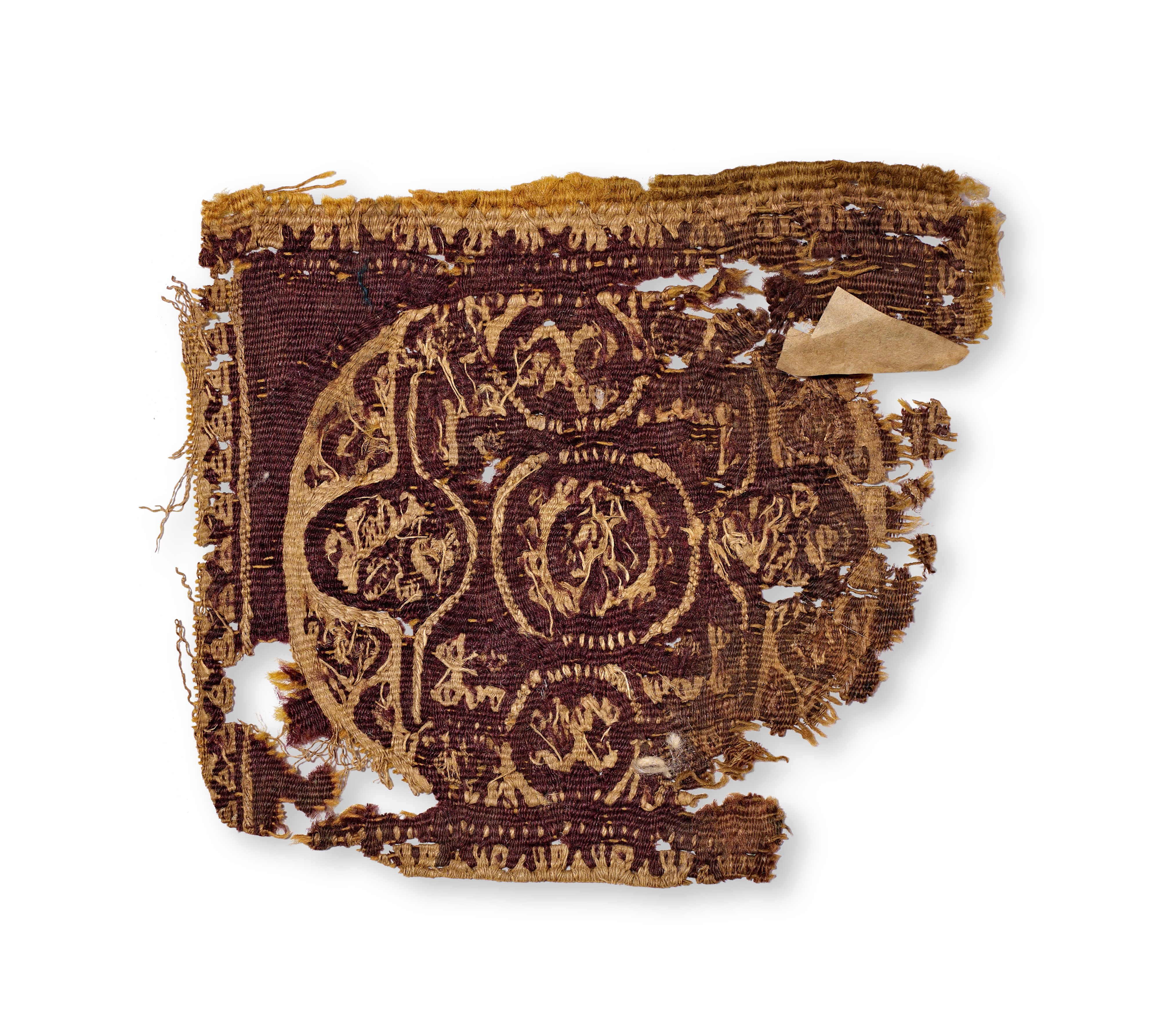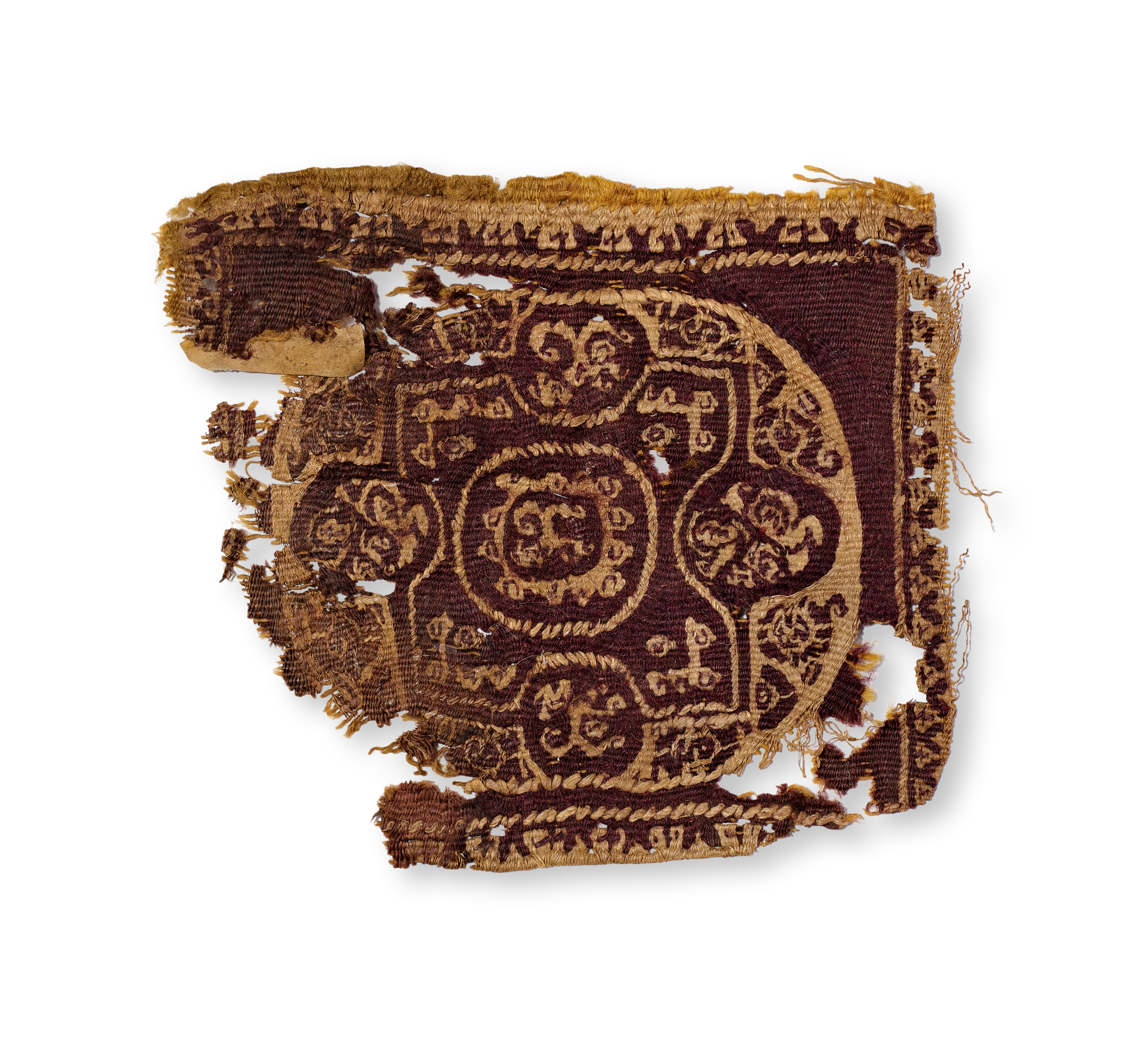 A tapestry-woven textile fragment of wool and linen, dating from approximately the 4th to 8th century A.D. The design features a large central medallion containing a smaller inner circle, surrounded by four lobed compartments. Each compartment encloses stylized anthropomorphic or zoomorphic figures. The motifs are executed in a pale tan or undyed yarn against a deep purple-brown ground. Horizontal bands of repeating geometric patterns border the central design at the top and bottom. The construction and iconography are characteristic of Late Antique Egyptian production. A small, blank paper label is adhered to one corner.