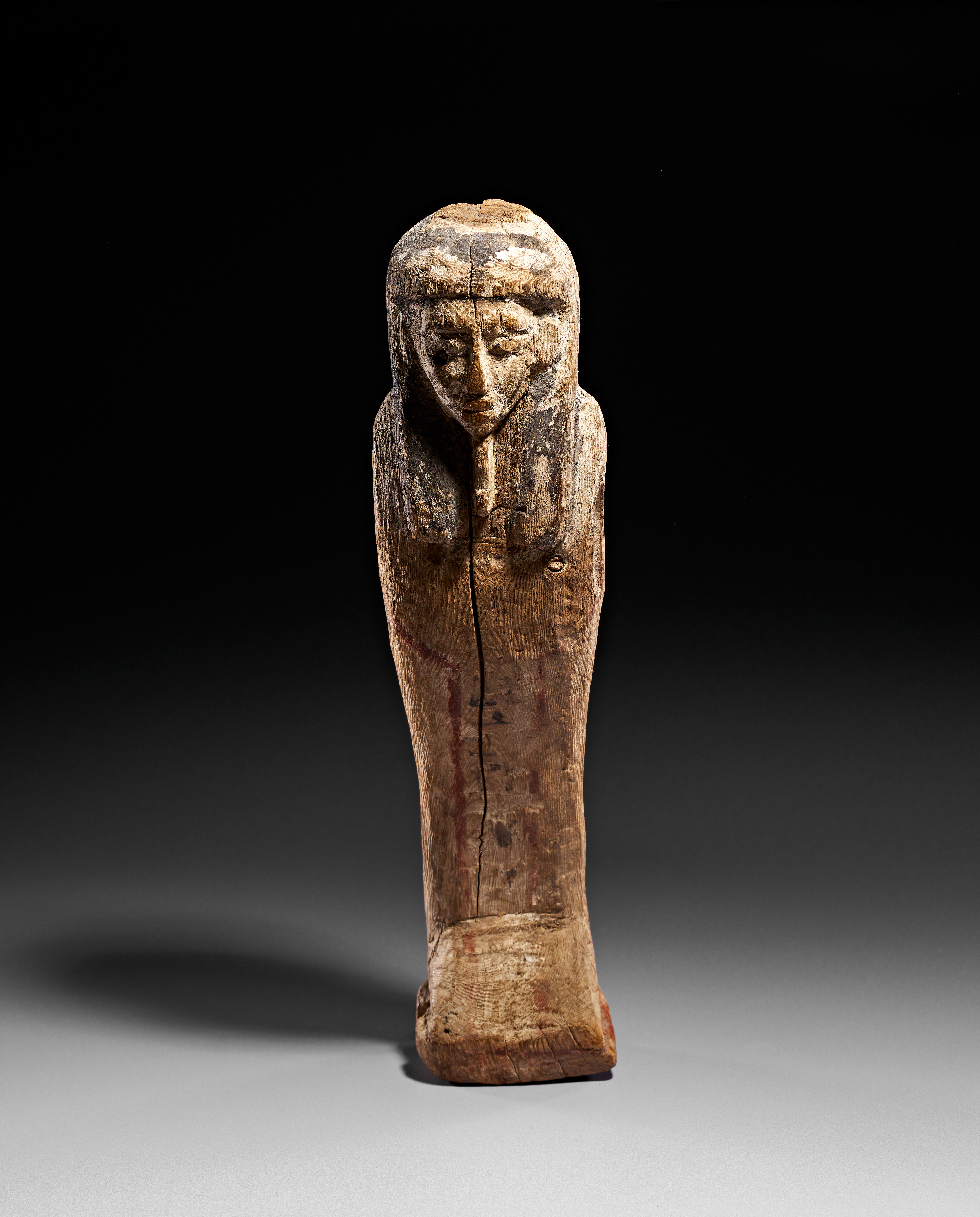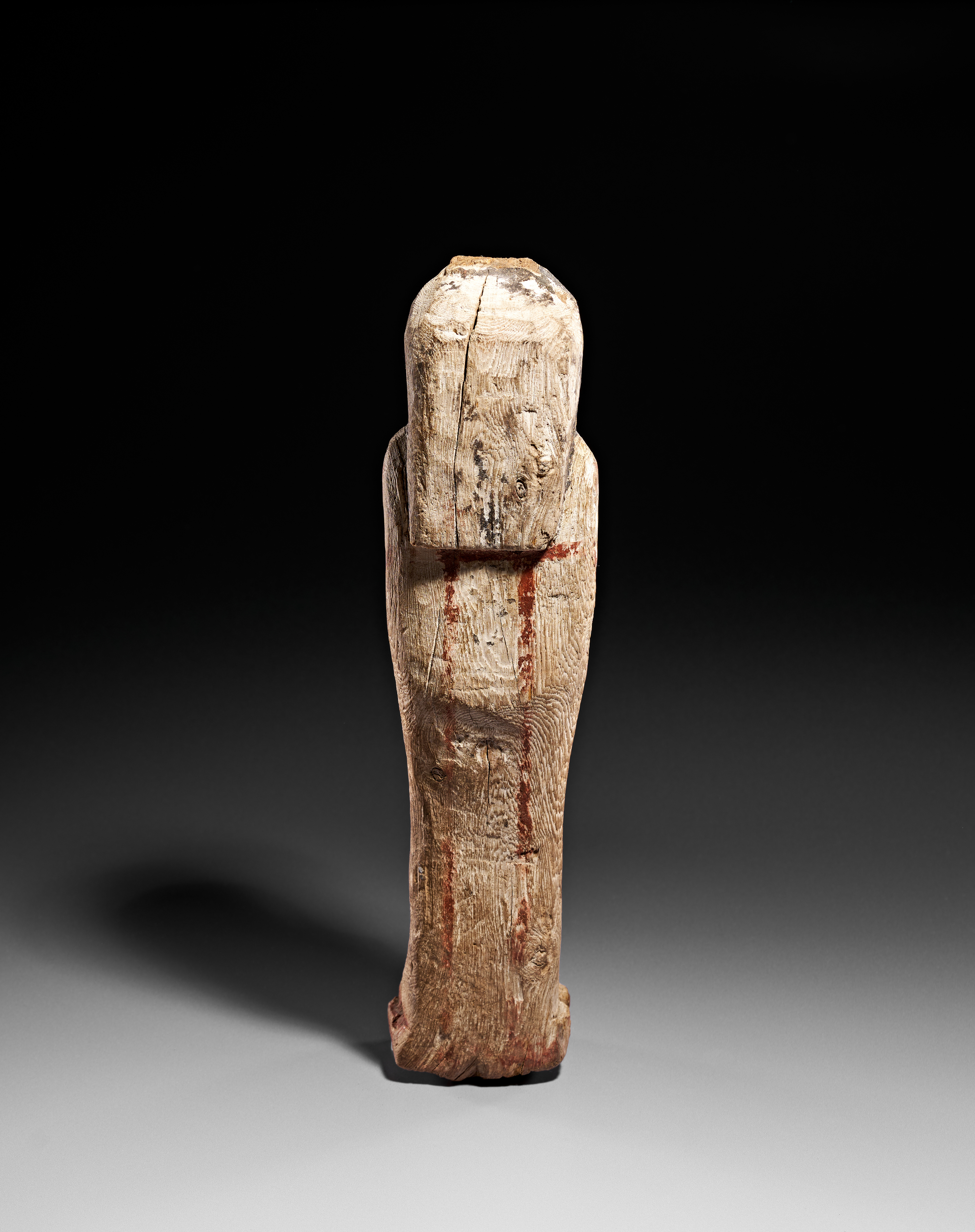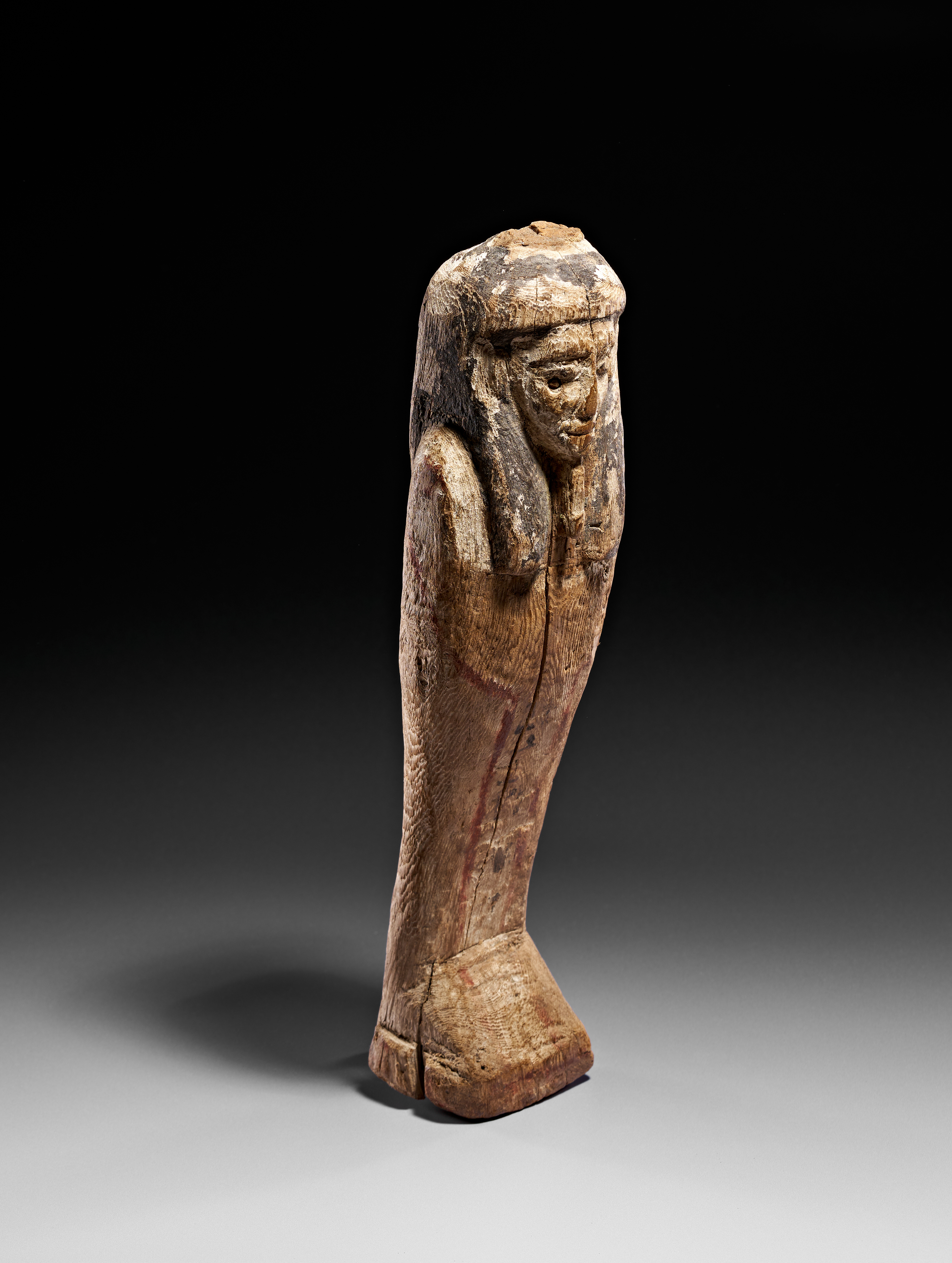 An Egyptian wooden figure of Ptah-Sokar-Osiris carved from a single block of wood. The mummiform figure is depicted wearing a tripartite wig and an Osiride beard. The surface retains traces of original polychrome decoration, with black pigment visible on the wig and red-painted outlines defining the torso and back. The figure is modeled with simplified facial features and tapers toward an integrated rectangular plinth.