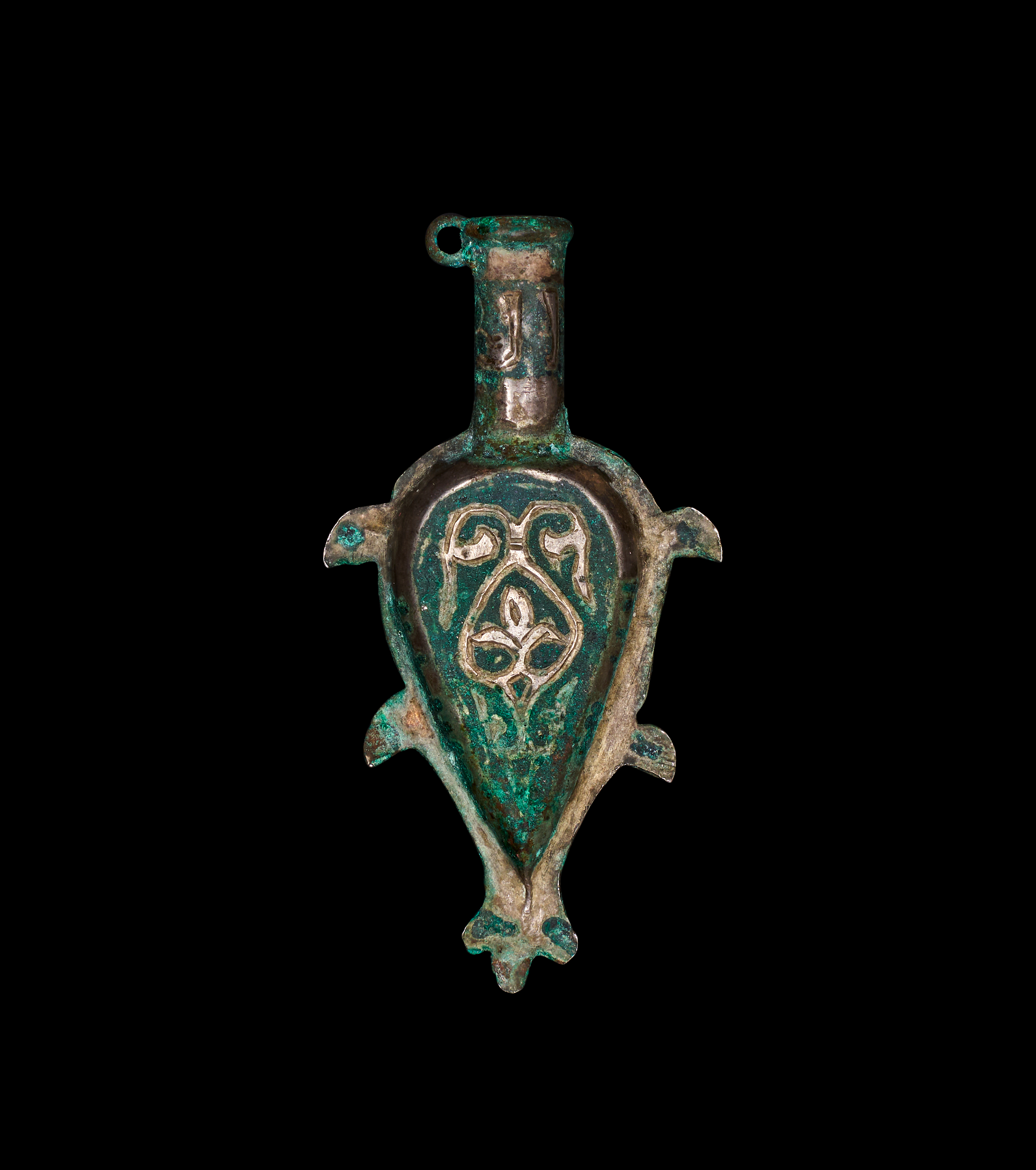 A medieval Islamic copper alloy pilgrim flask or ampulla. The vessel features a flattened shield-shaped body characterized by five small fin-like projections and a cylindrical neck fitted with a single suspension loop. Both faces are decorated with recessed panels containing silver-inlaid foliated and interlaced geometric motifs, including stylized arabesque patterns. The neck is encircled by additional silver-inlaid decorative bands featuring calligraphic script. The piece is constructed from a cast copper alloy base with recessed areas for the application of silver wire or sheet inlay.