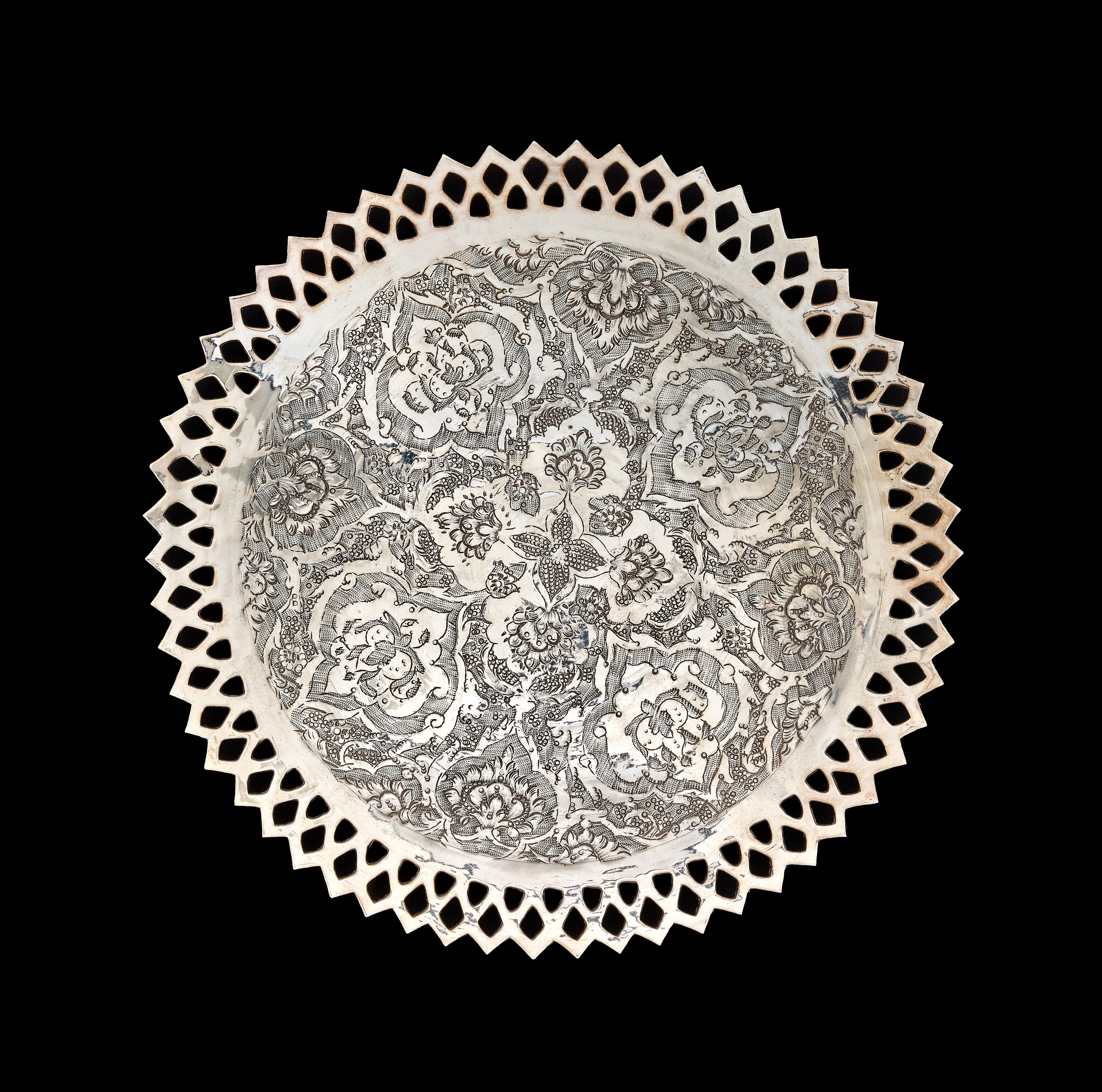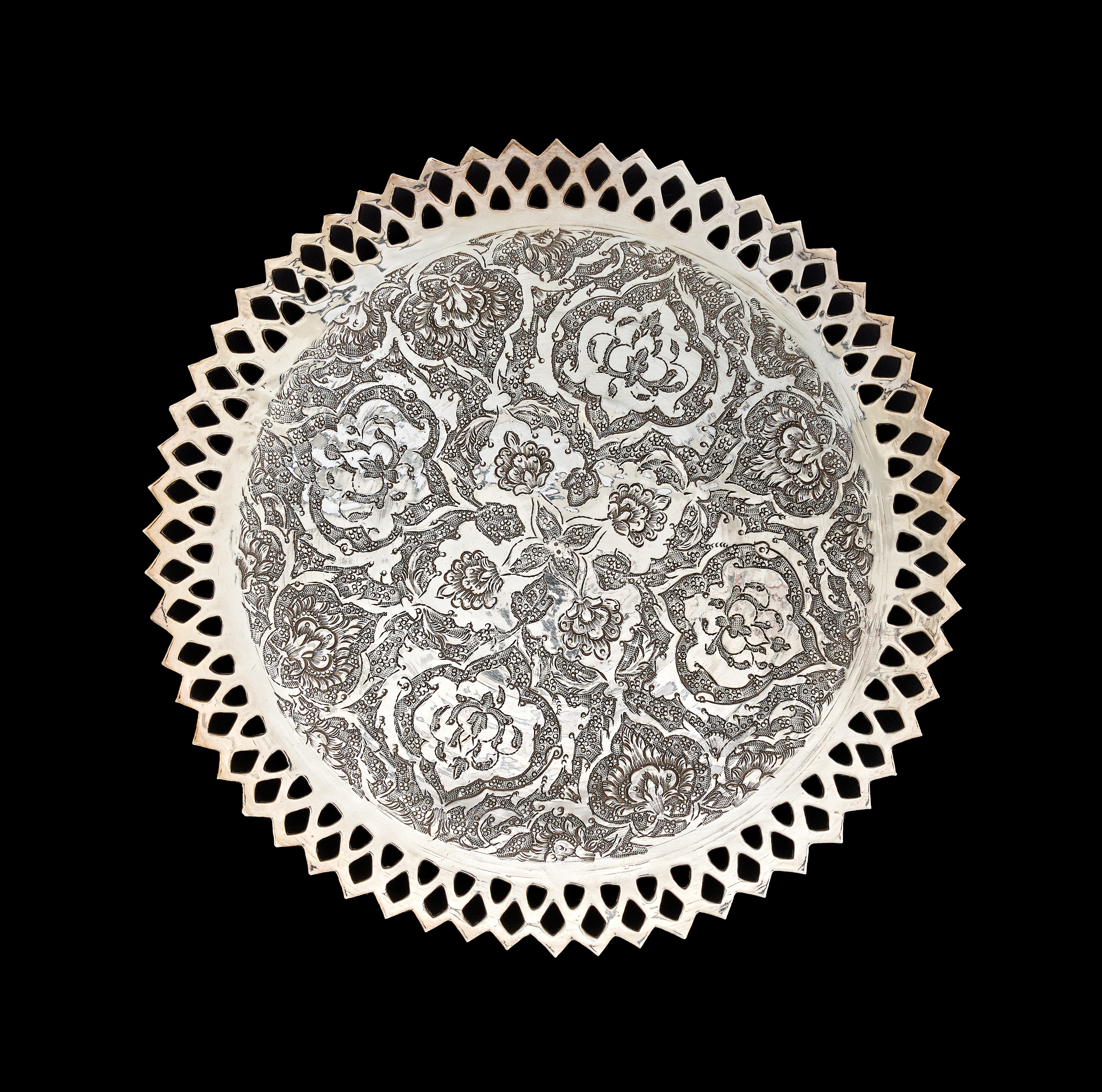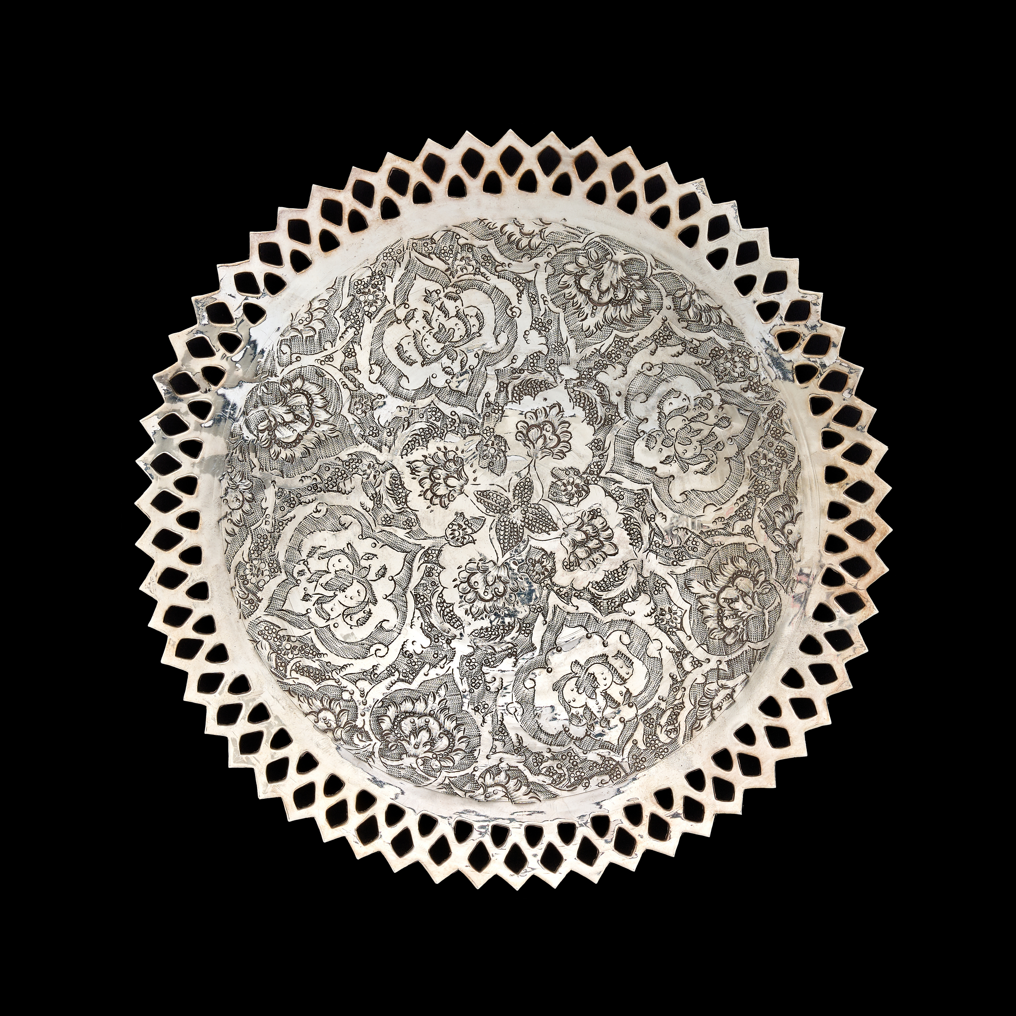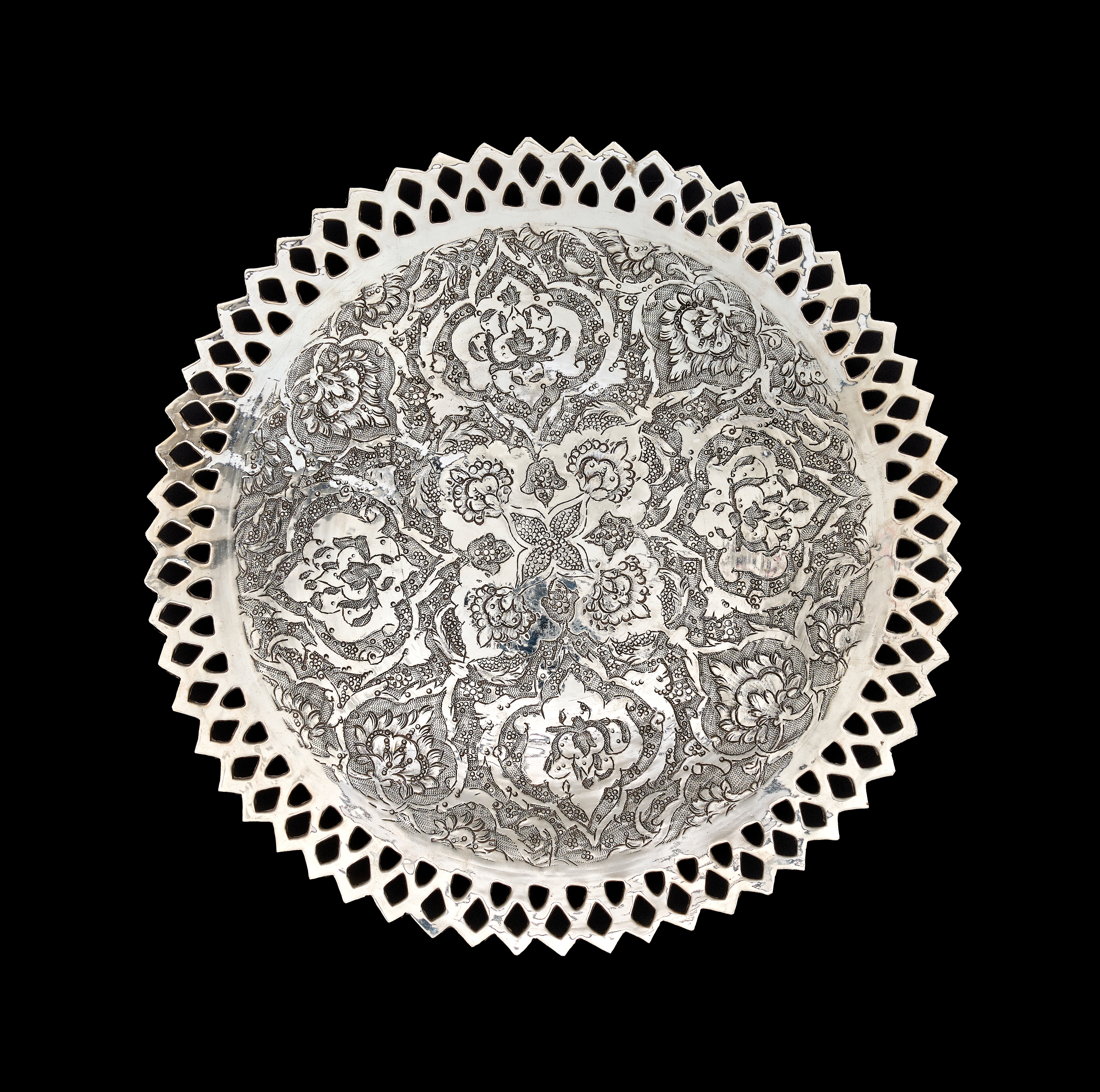 A set of Middle Eastern style silver or silver-plated tableware comprising a large, shallow bowl and several matching plates. Each piece features dense, finely engraved floral and foliate decoration, including stylized tulip motifs, arranged within a central circular field. The items are finished with a wide ajoure or pierced diamond-patterned rim. The undersides are plain and polished. No visible hallmarks or maker’s marks are present.