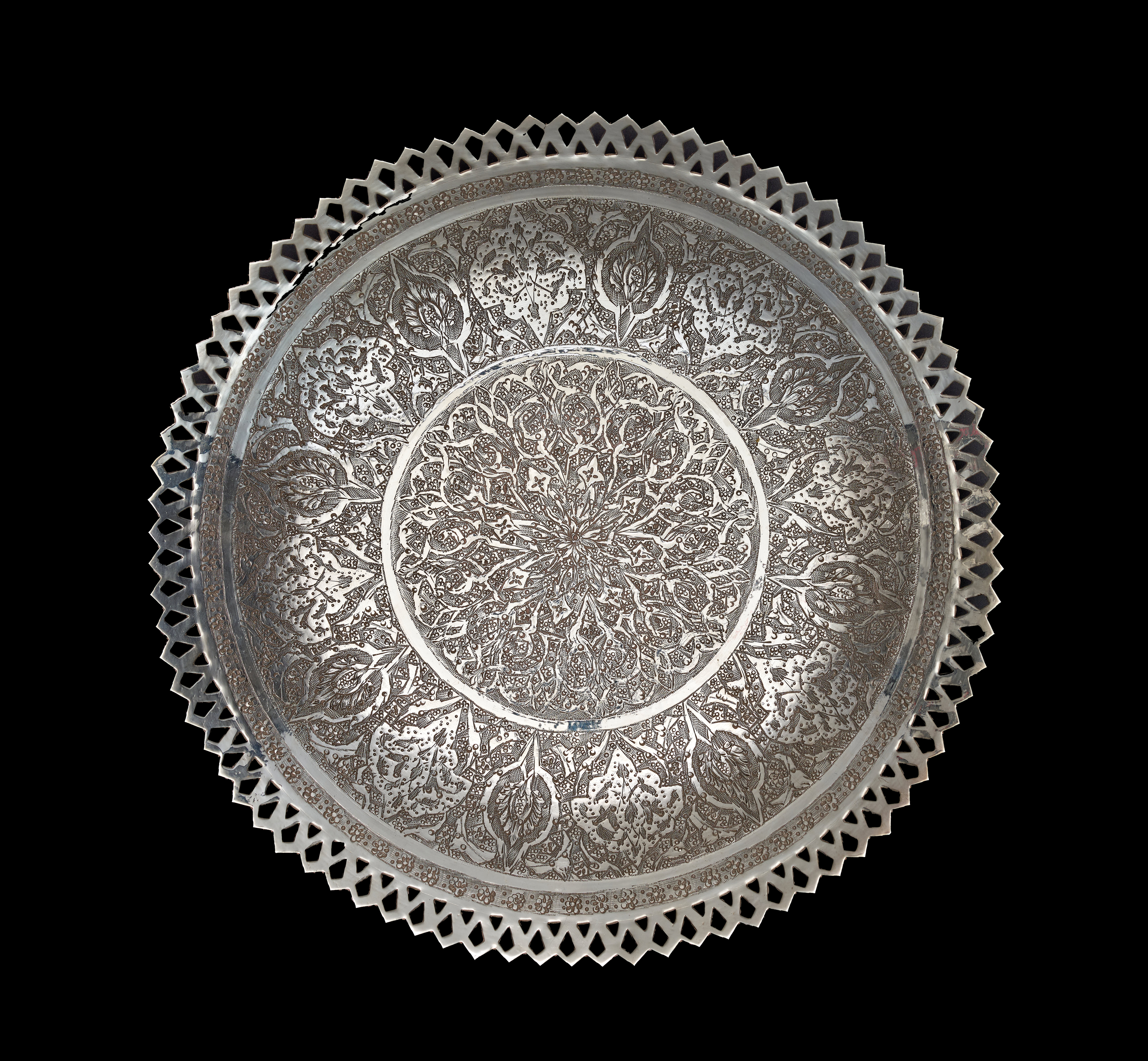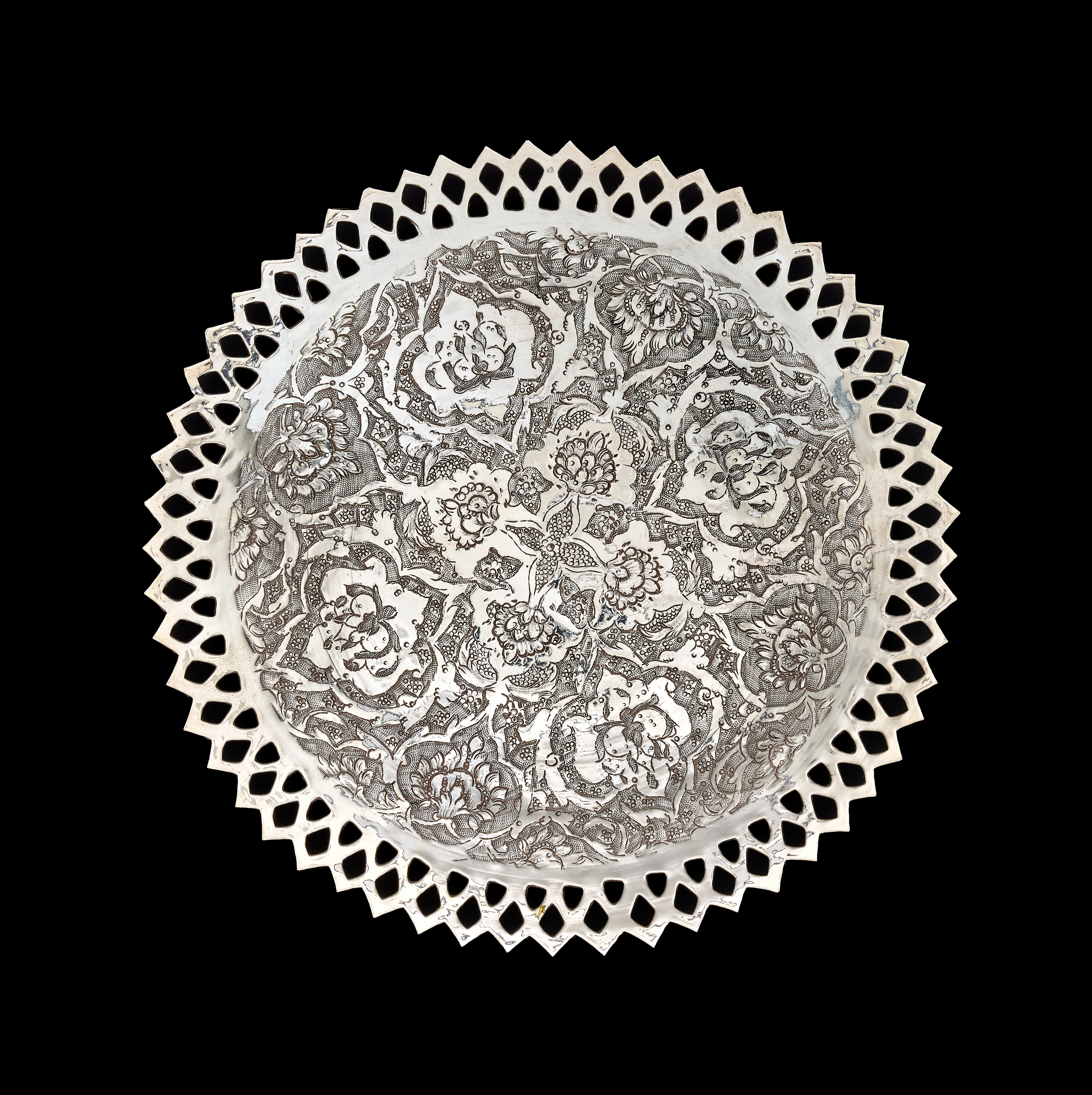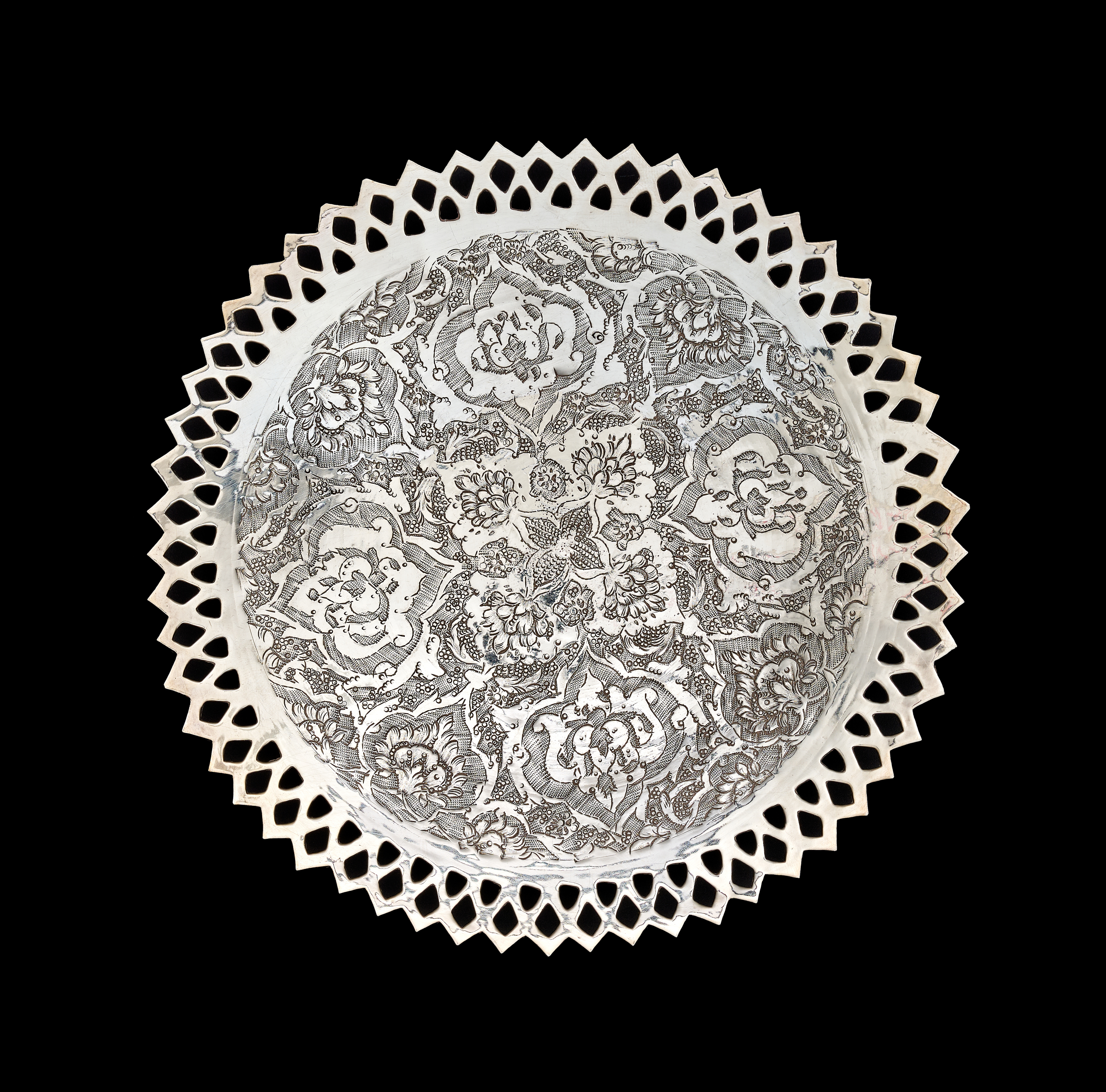 A set of Middle Eastern style silver or silver-plated tableware comprising a large, shallow bowl and several matching plates. Each piece features dense, finely engraved floral and foliate decoration, including stylized tulip motifs, arranged within a central circular field. The items are finished with a wide ajoure or pierced diamond-patterned rim. The undersides are plain and polished. No visible hallmarks or maker’s marks are present.